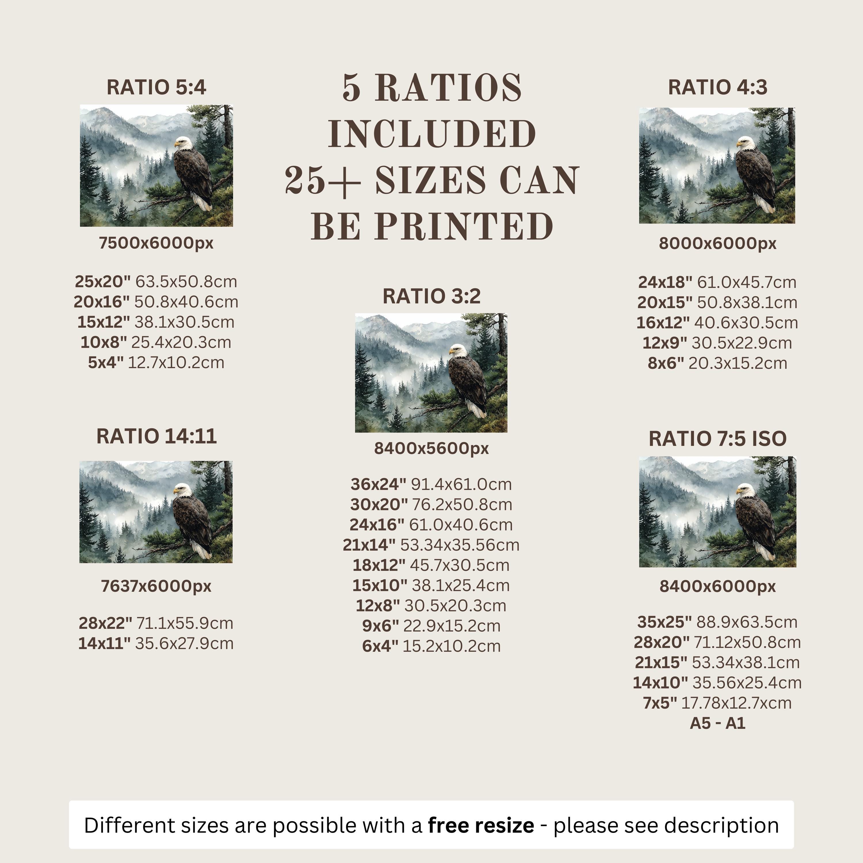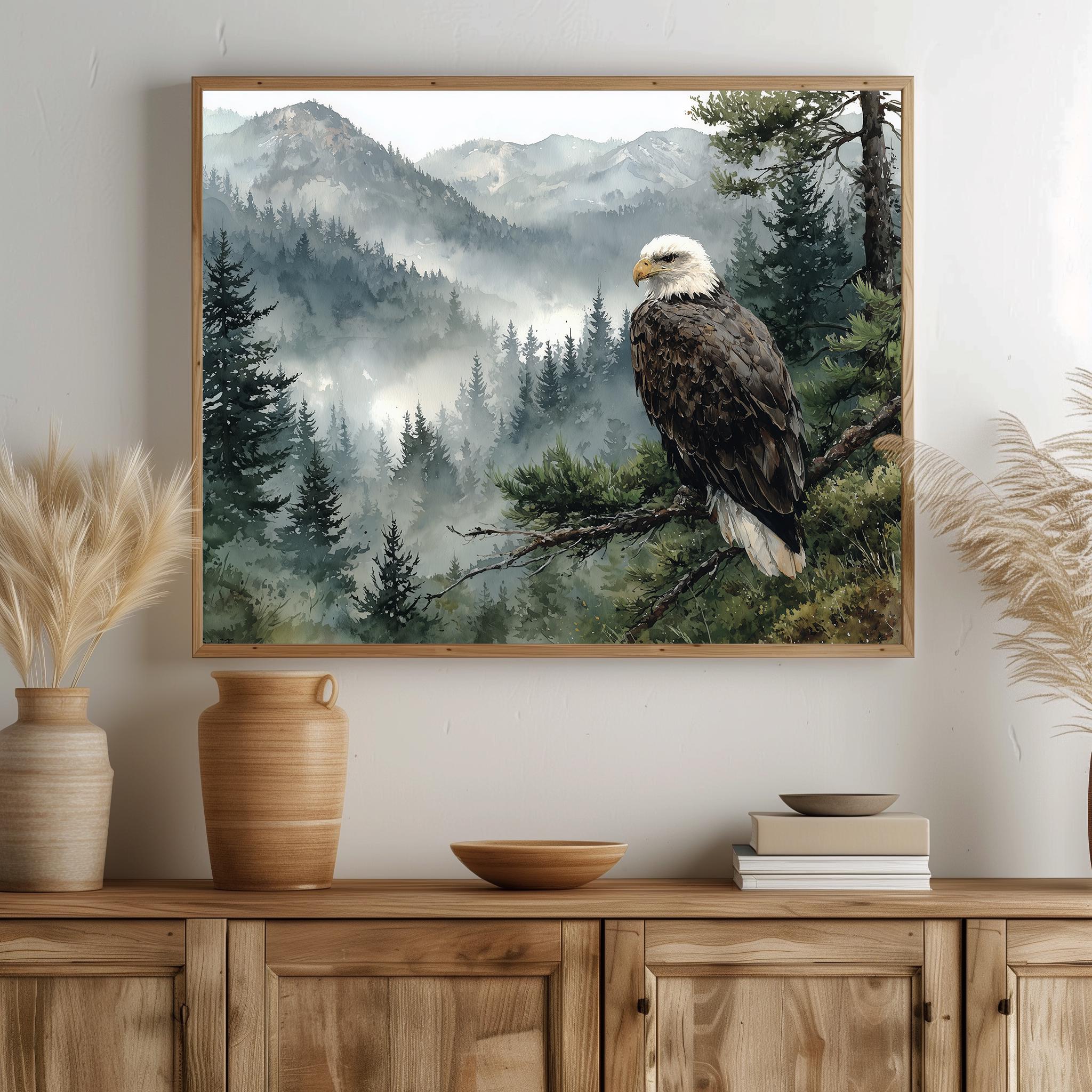 Immerse yourself in the charm with this rustic painting of a majestic bald eagle soaring over a misty landscape. An instantly downloadable print, it's perfect for elevating your decor with budget-friendly charm. This gives you the flexibility to customize the size, frame, and material according to your personal taste and space, ensuring a perfect fit for your walls.