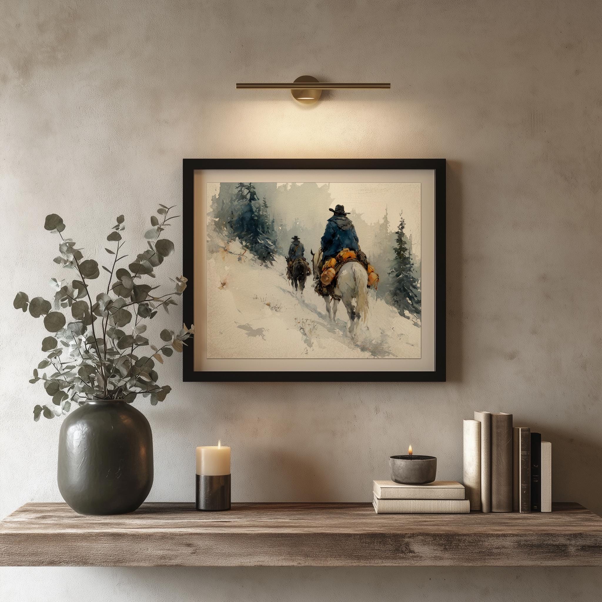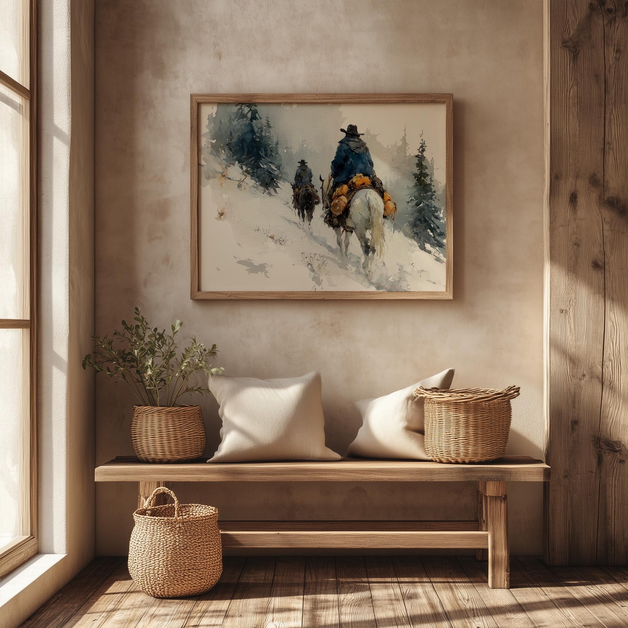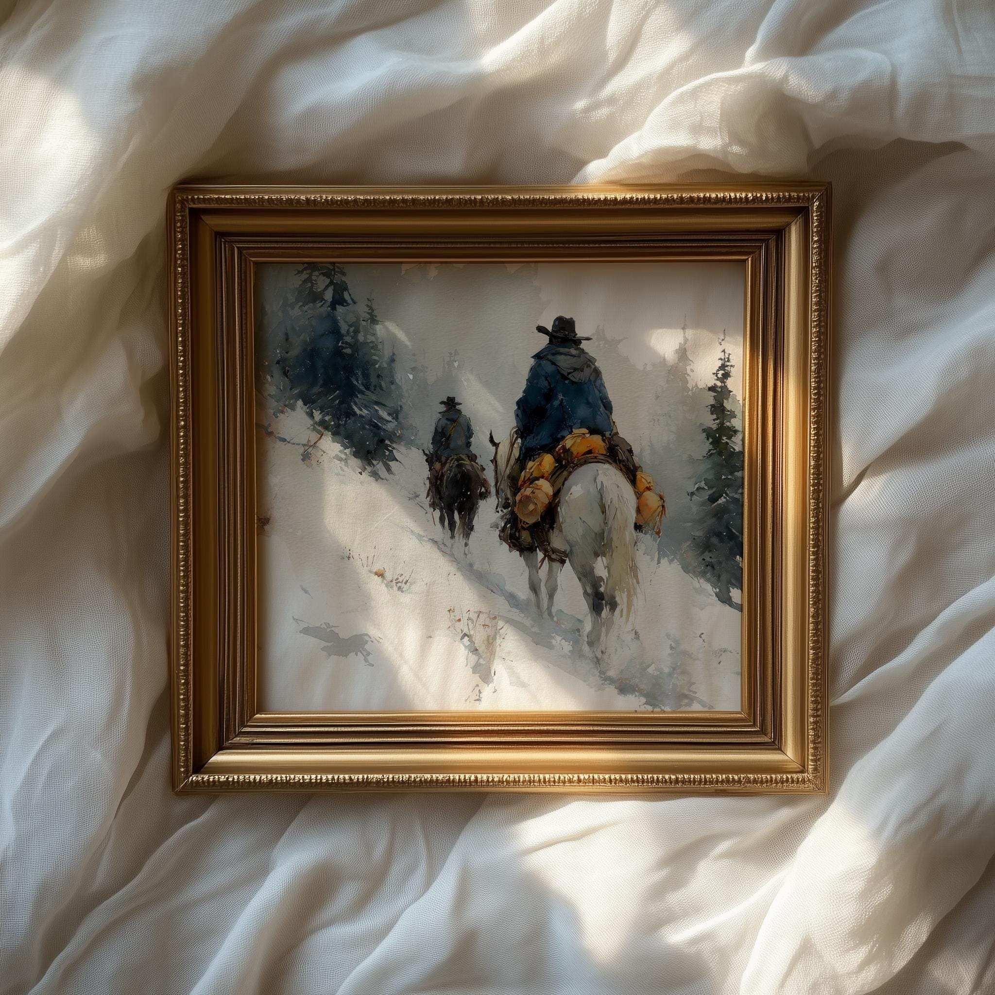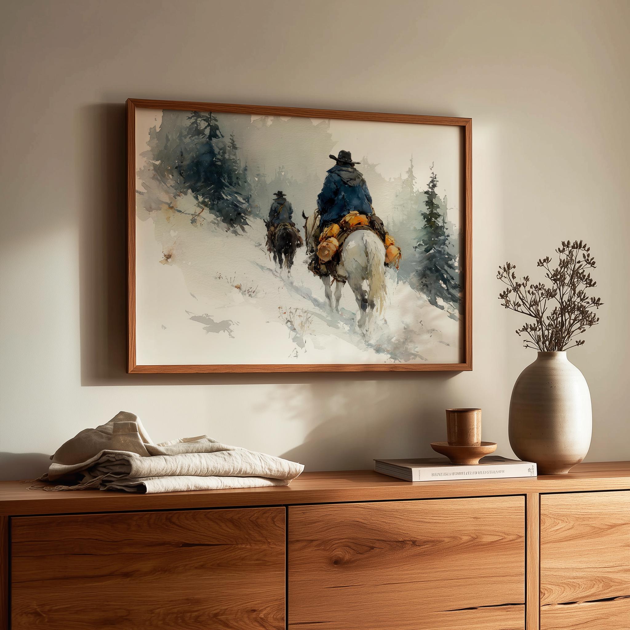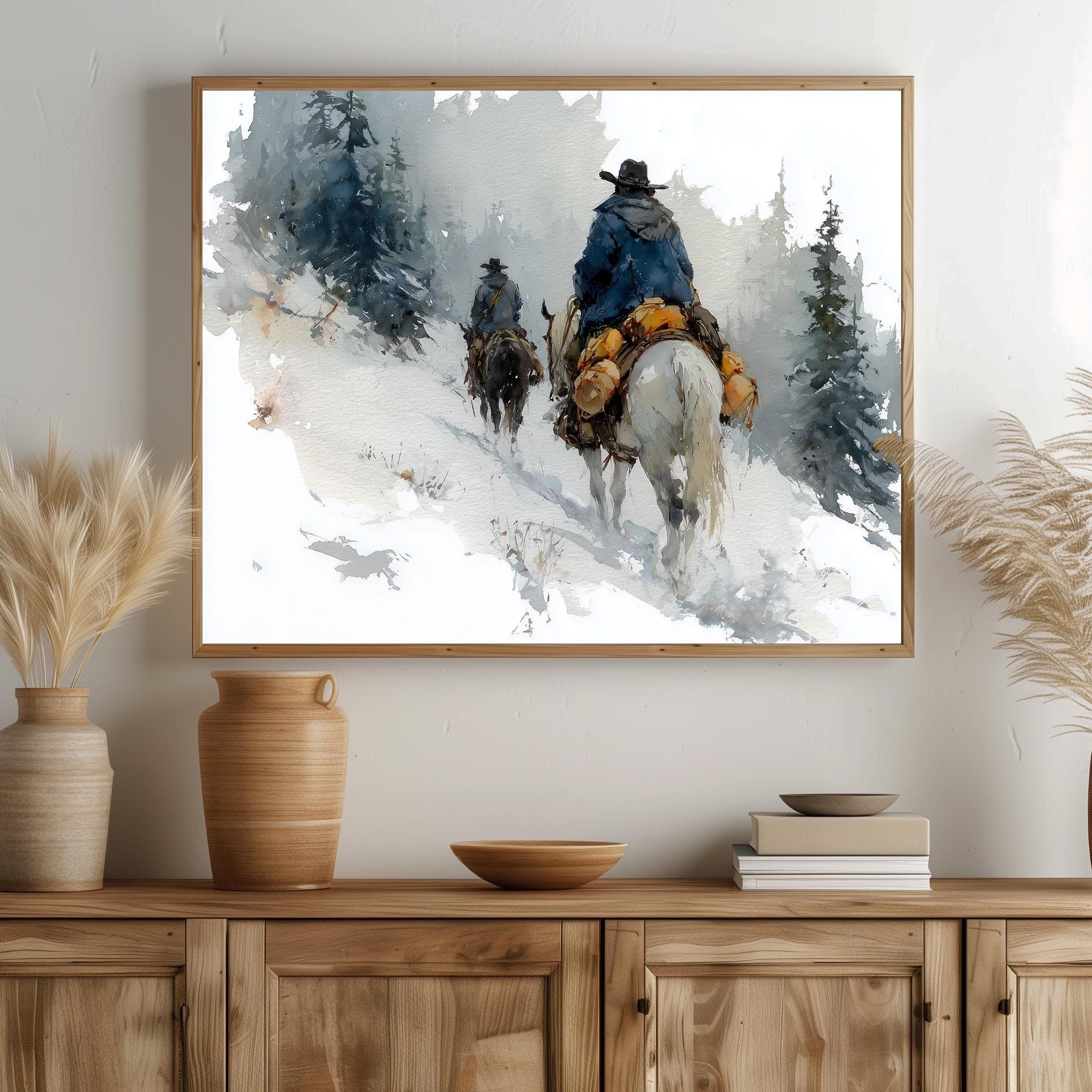 Immerse yourself in the charm with this rustic painting of a cowgirl and her packhorse traversing a serene, snow-covered landscape. An instantly downloadable print, it's perfect for elevating your decor with budget-friendly charm. This gives you the flexibility to customize the size, frame, and material according to your personal taste and space, ensuring a perfect fit for your walls.