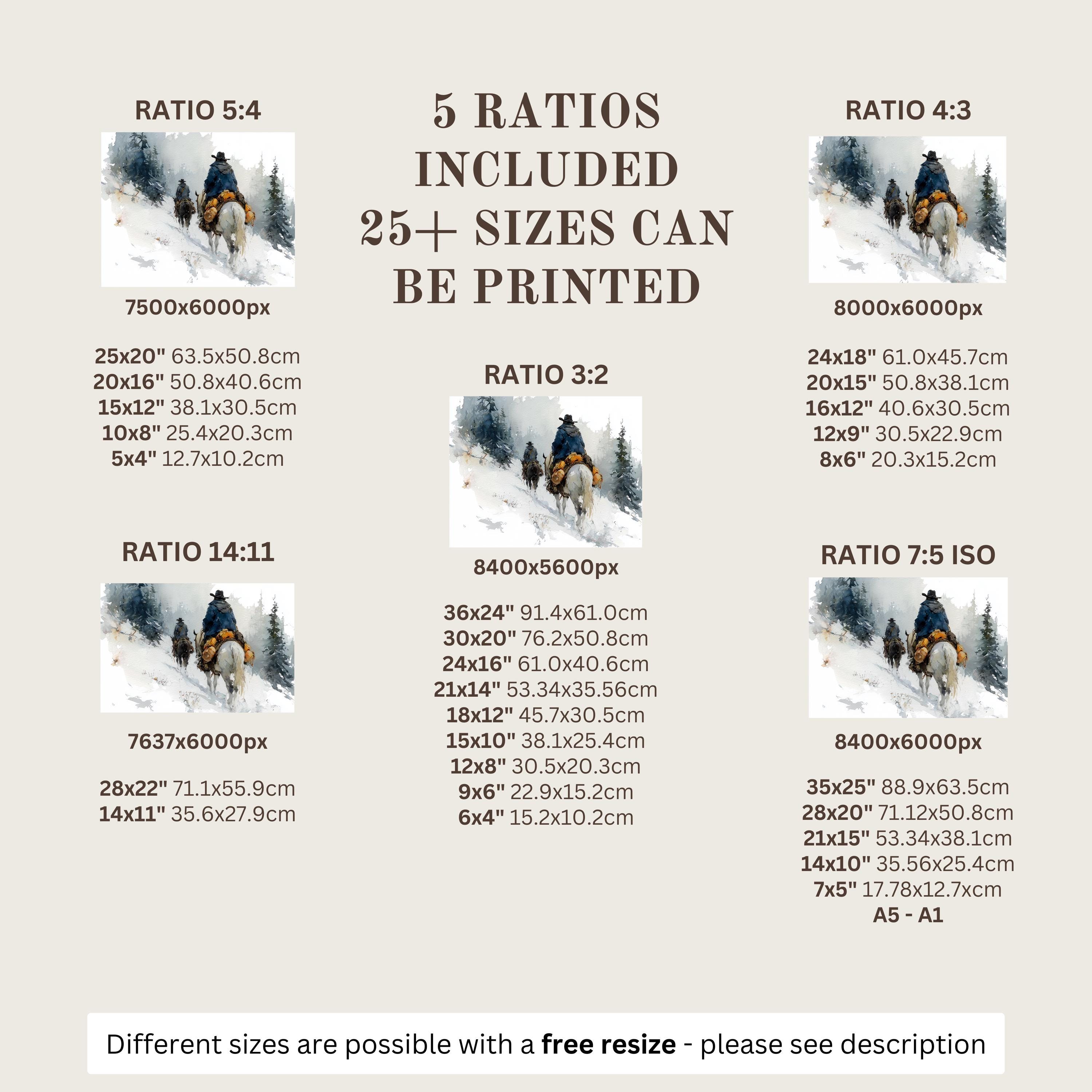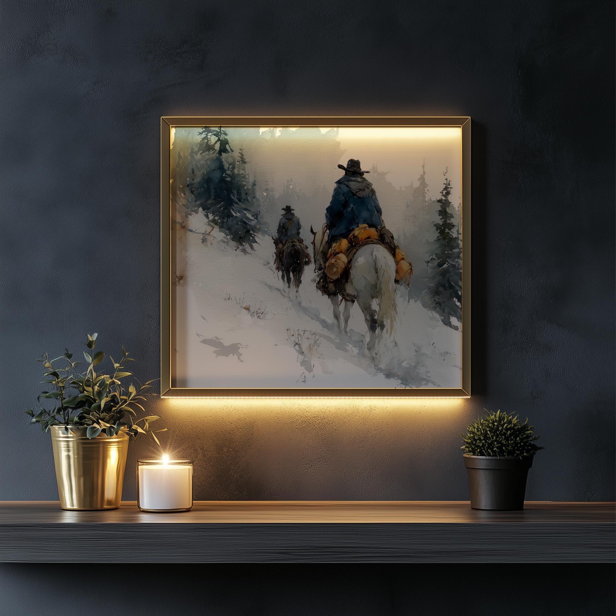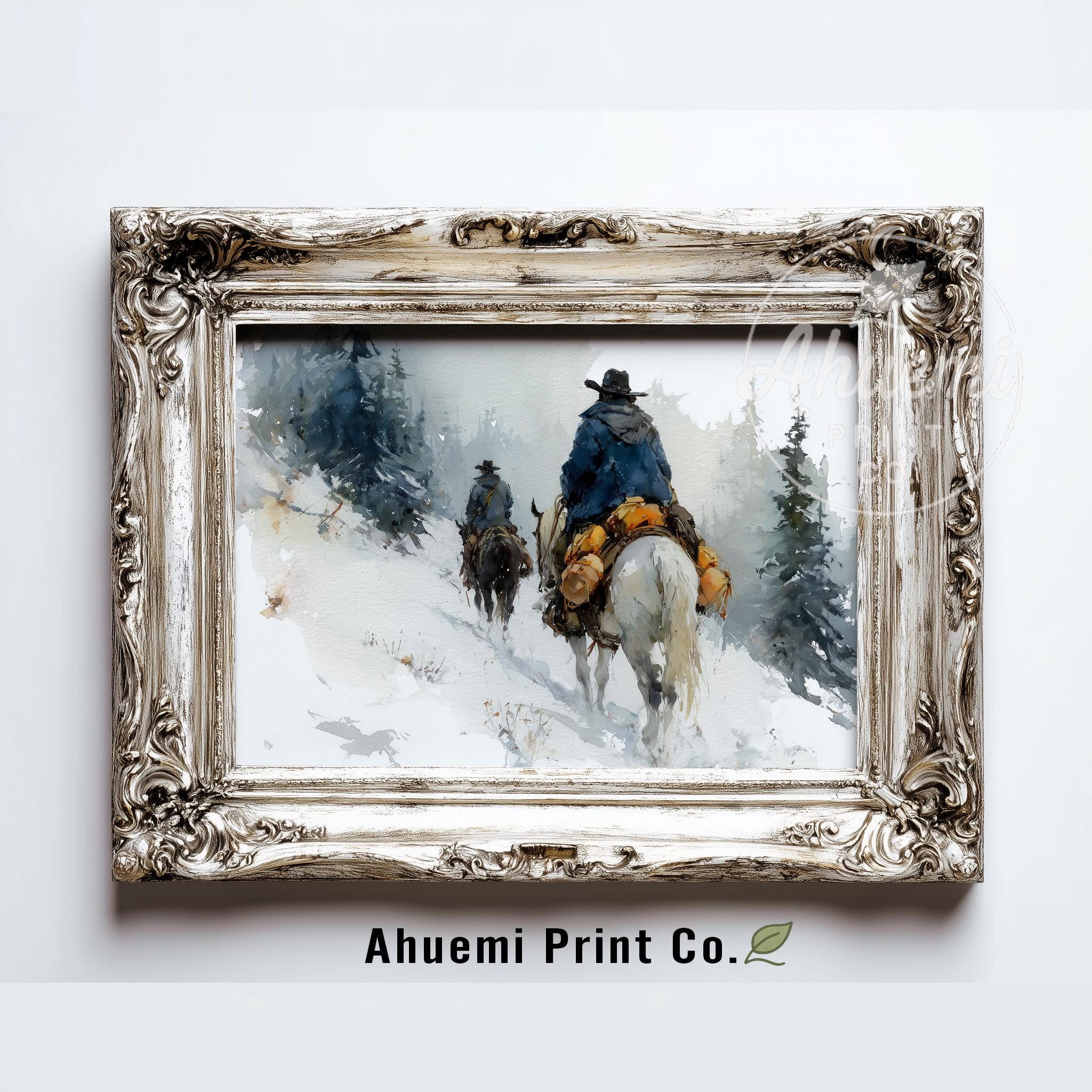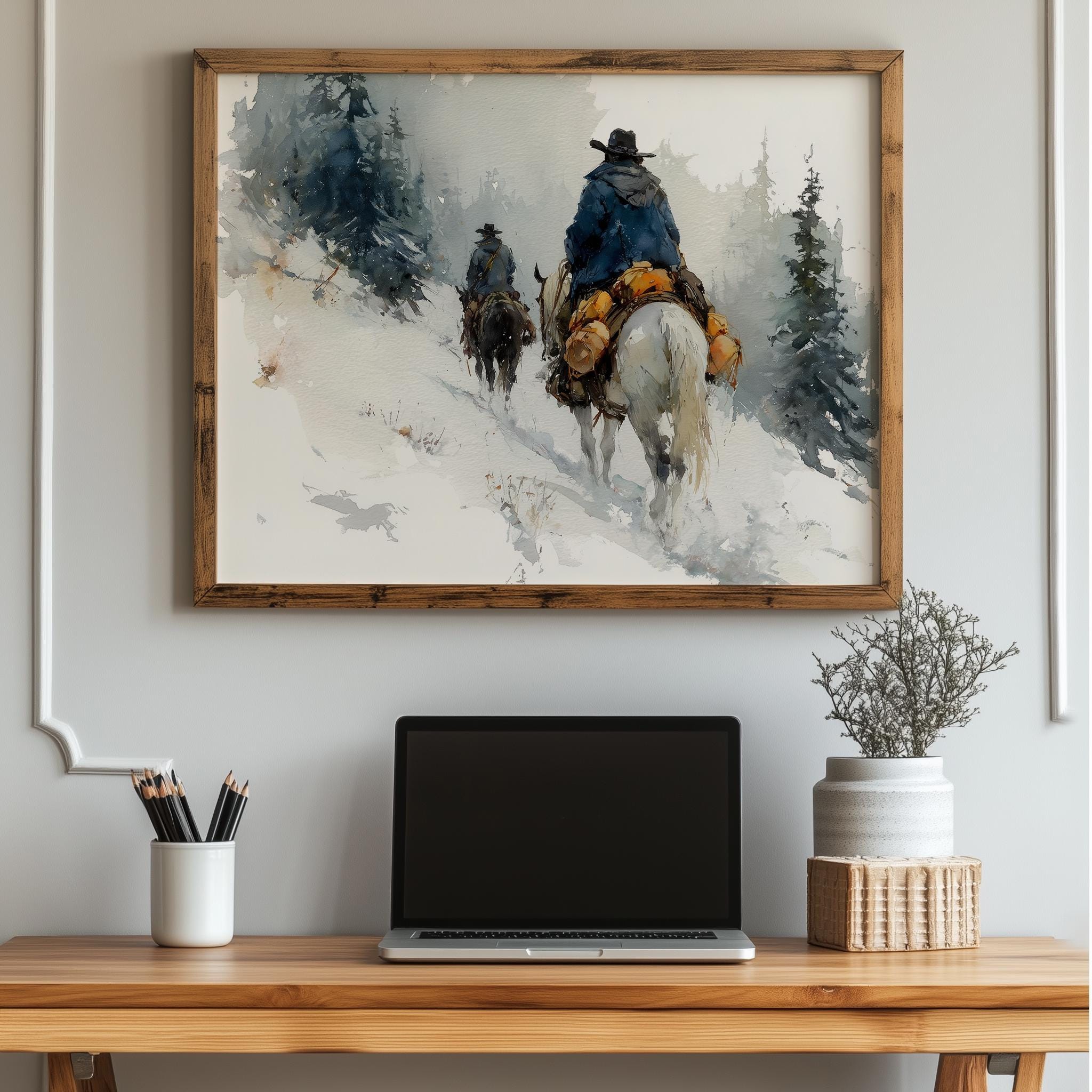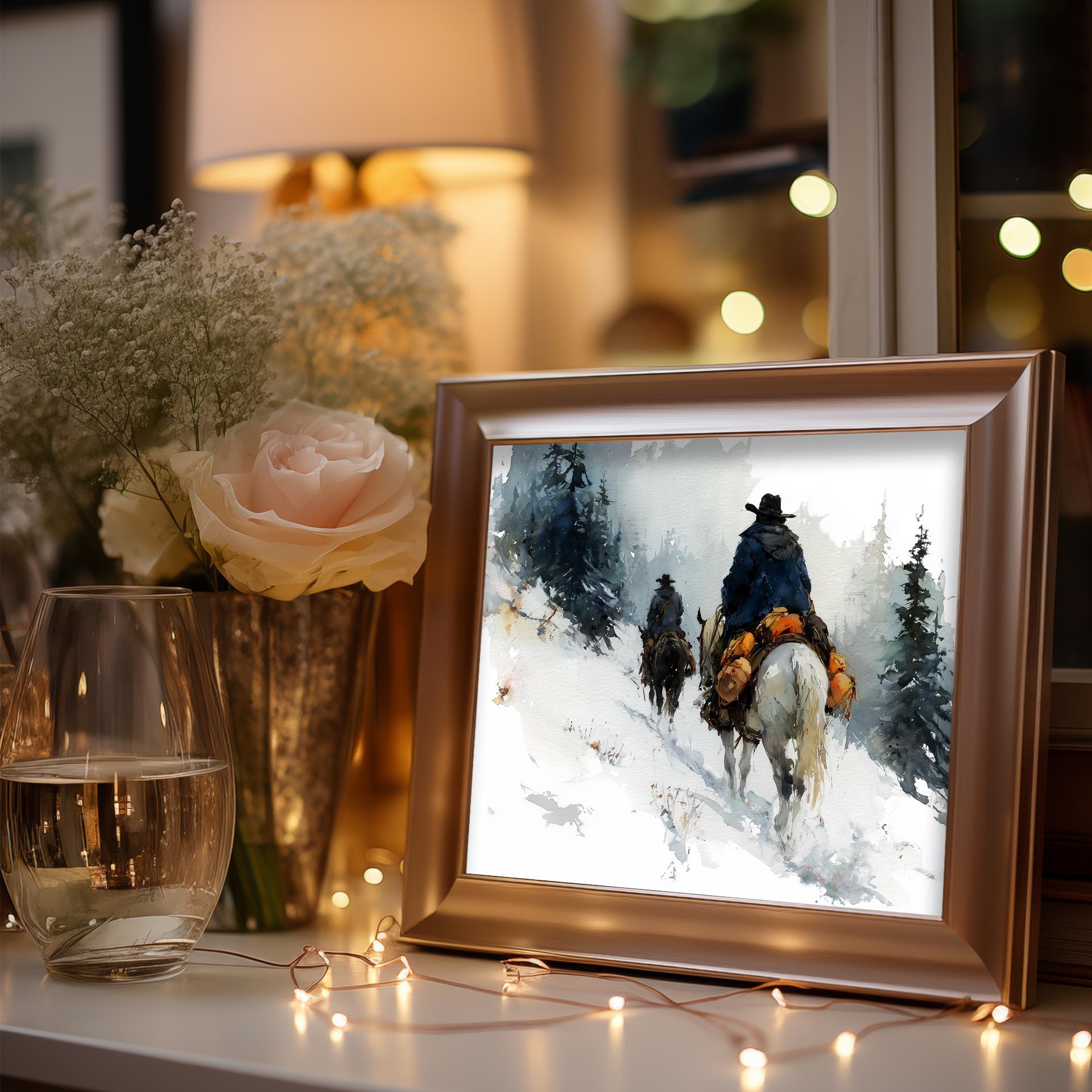 Immerse yourself in the charm with this rustic painting of a cowgirl and her packhorse traversing a serene, snow-covered landscape. An instantly downloadable print, it's perfect for elevating your decor with budget-friendly charm. This gives you the flexibility to customize the size, frame, and material according to your personal taste and space, ensuring a perfect fit for your walls.