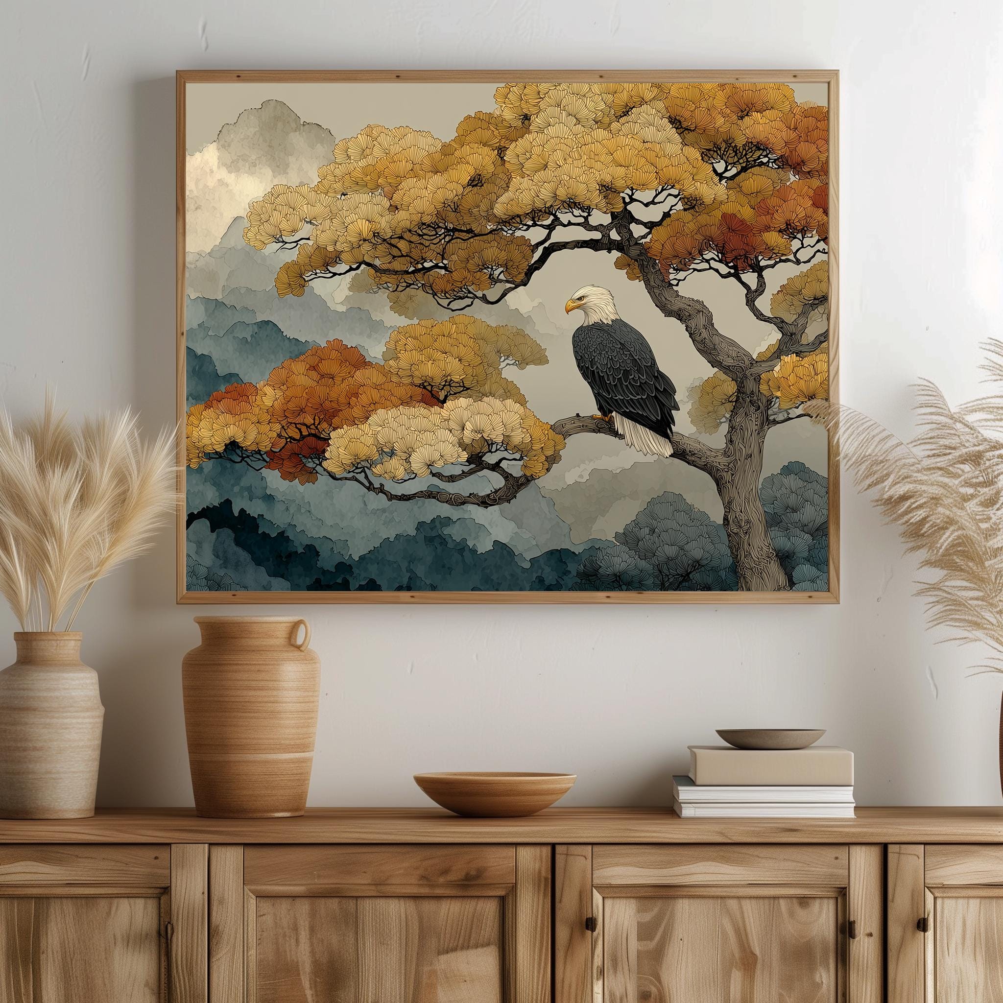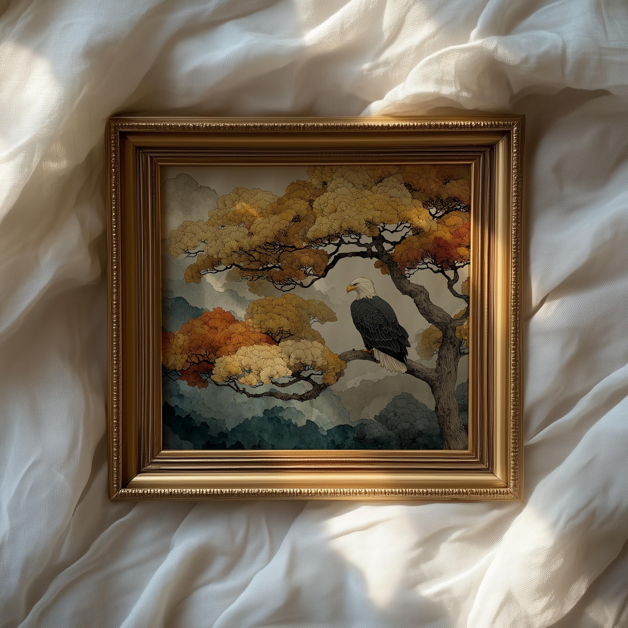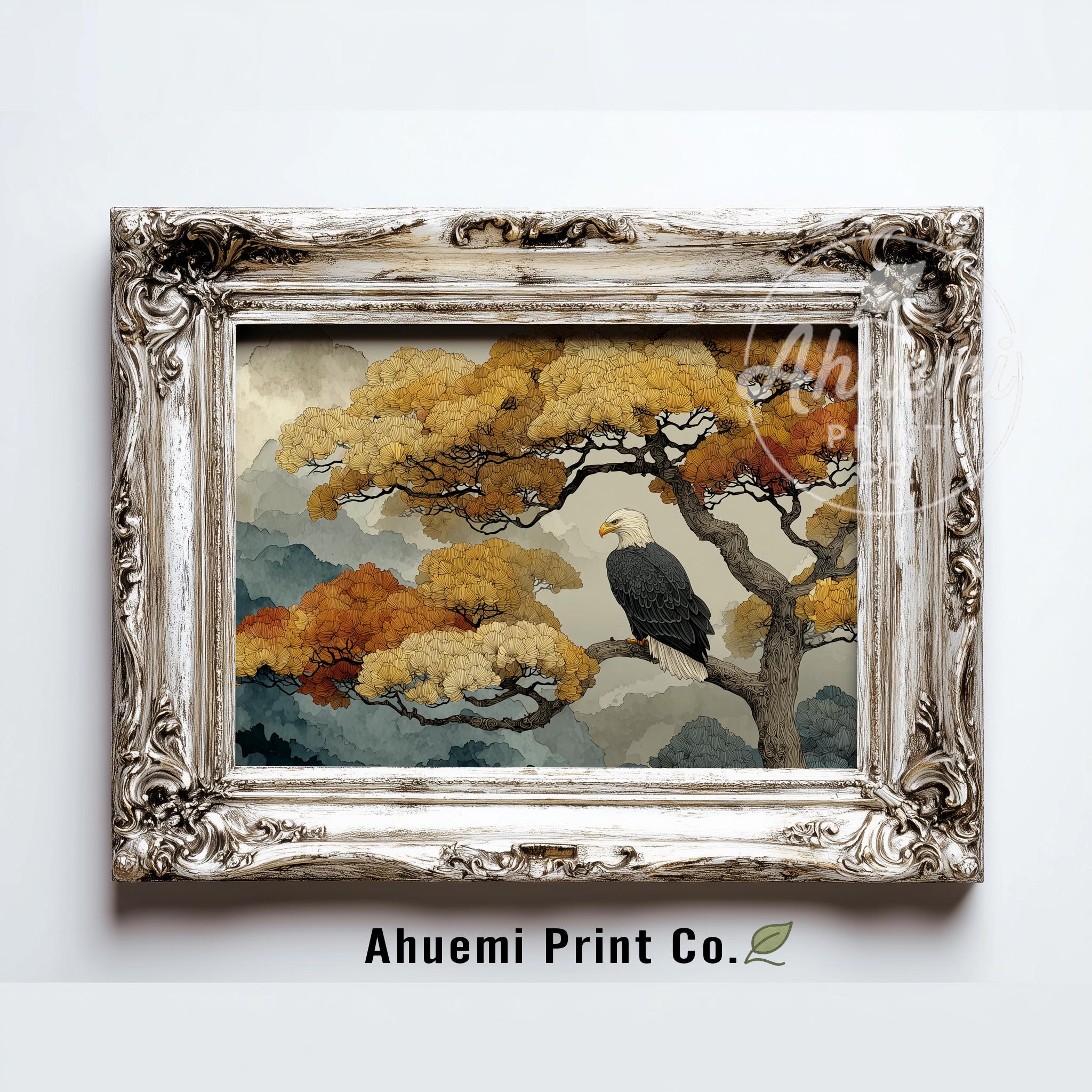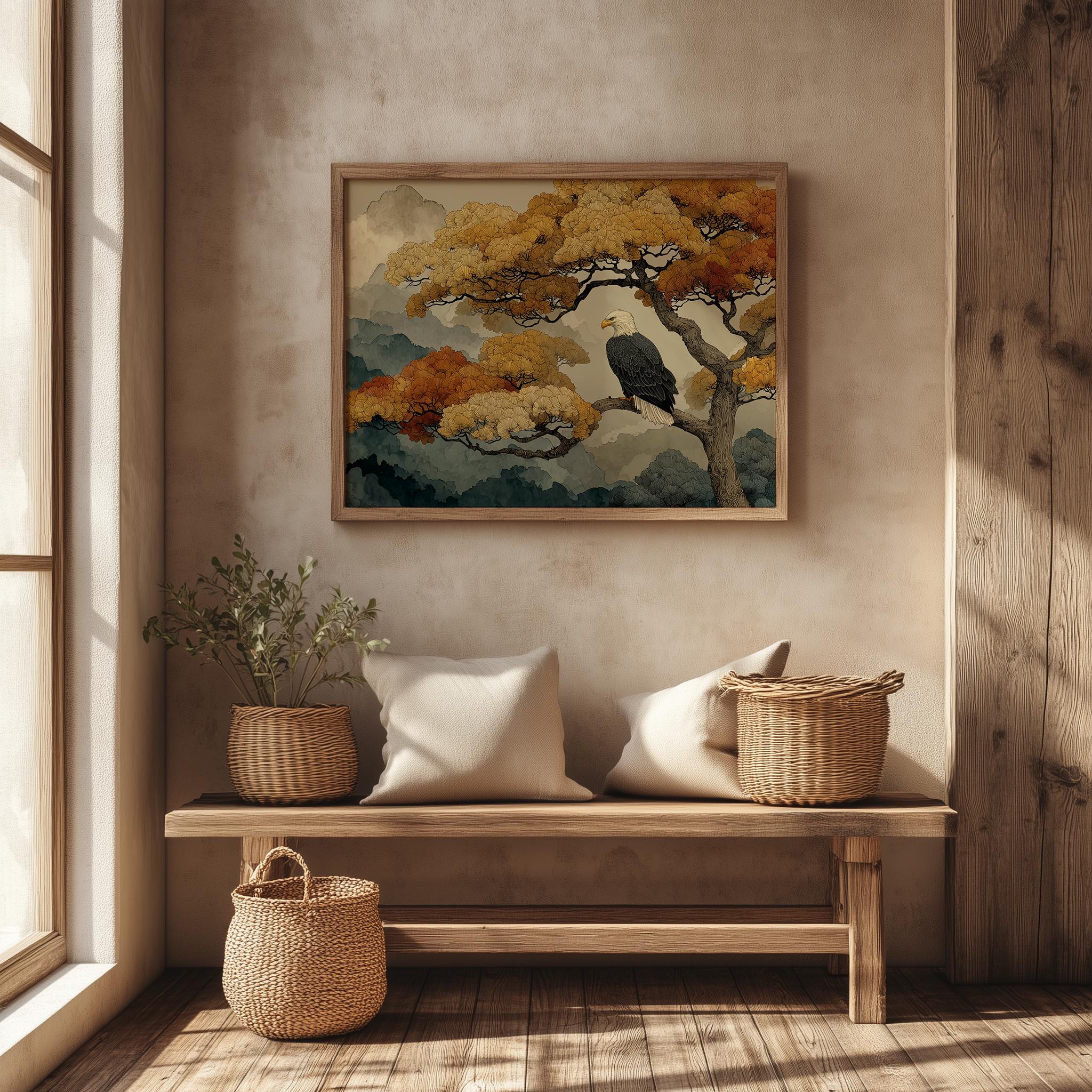 Immerse yourself in the charm with this rustic painting of a bald eagle perched gracefully on a pine branch. An instantly downloadable print, it's perfect for elevating your decor with budget-friendly charm. This gives you the flexibility to customize the size, frame, and material according to your personal taste and space, ensuring a perfect fit for your walls.