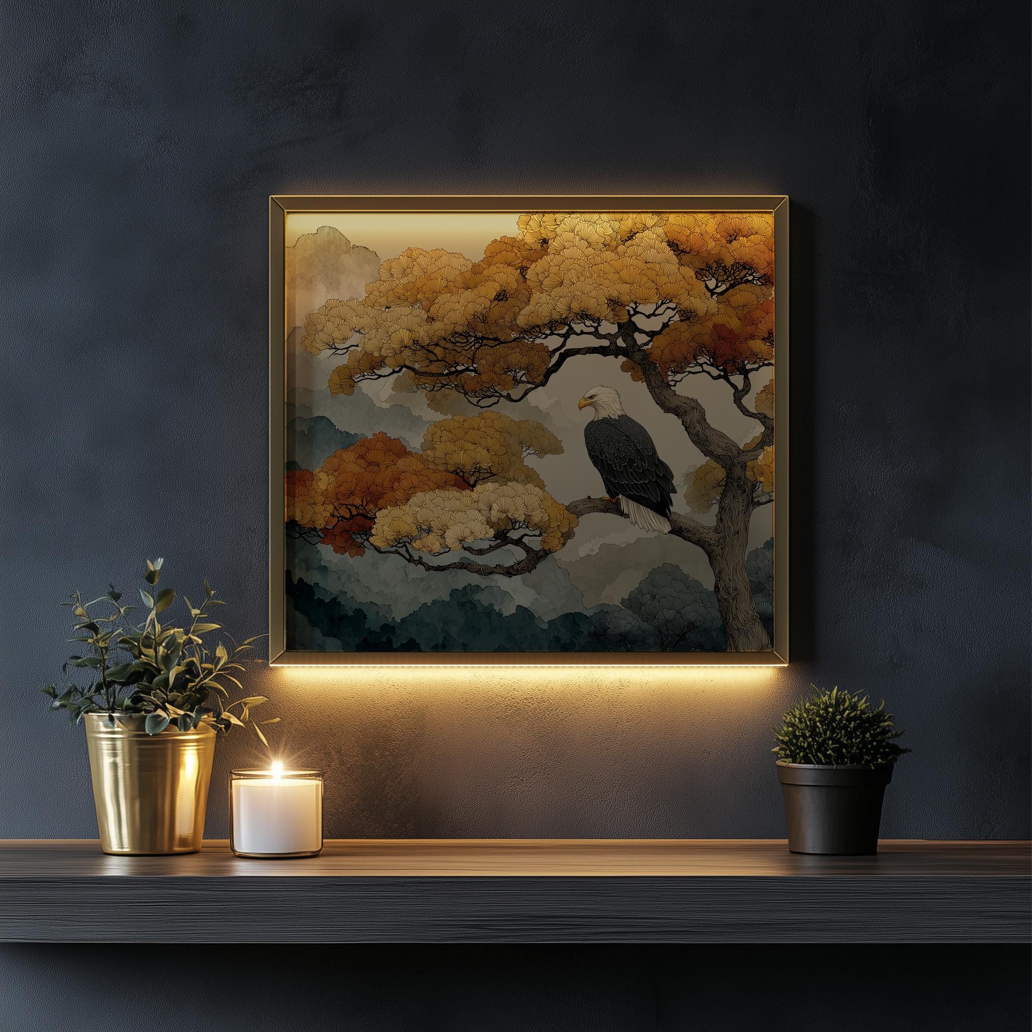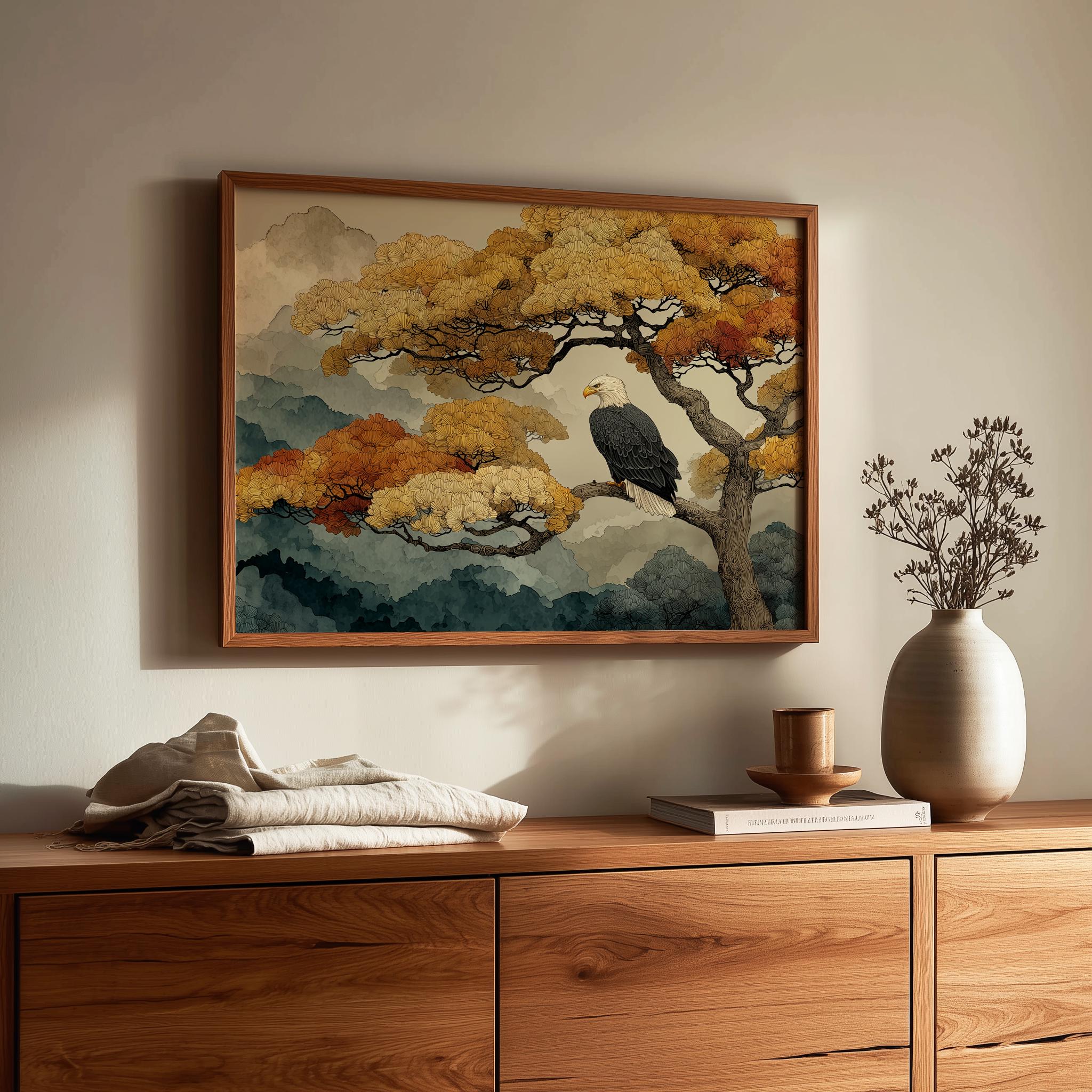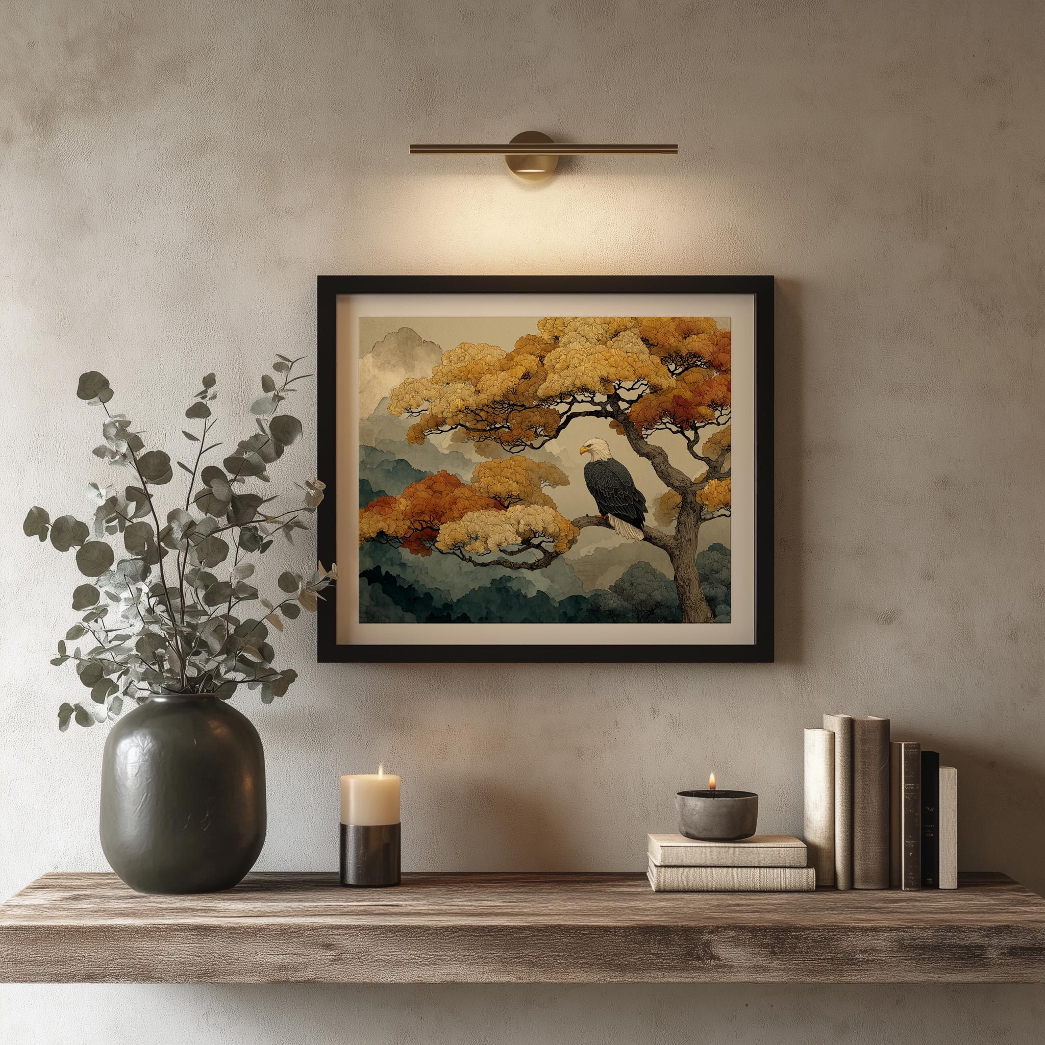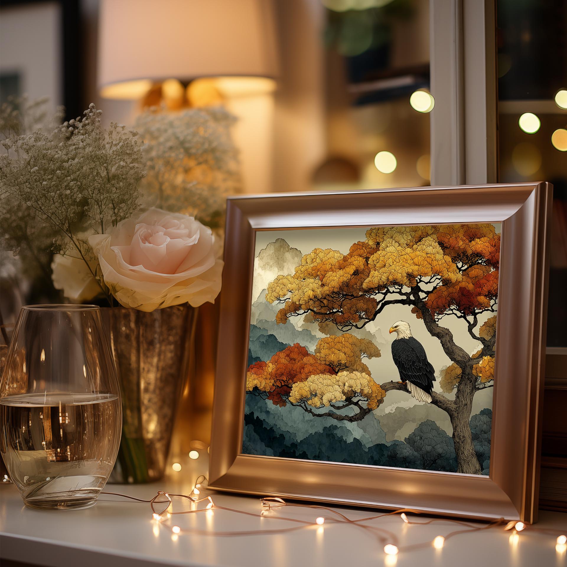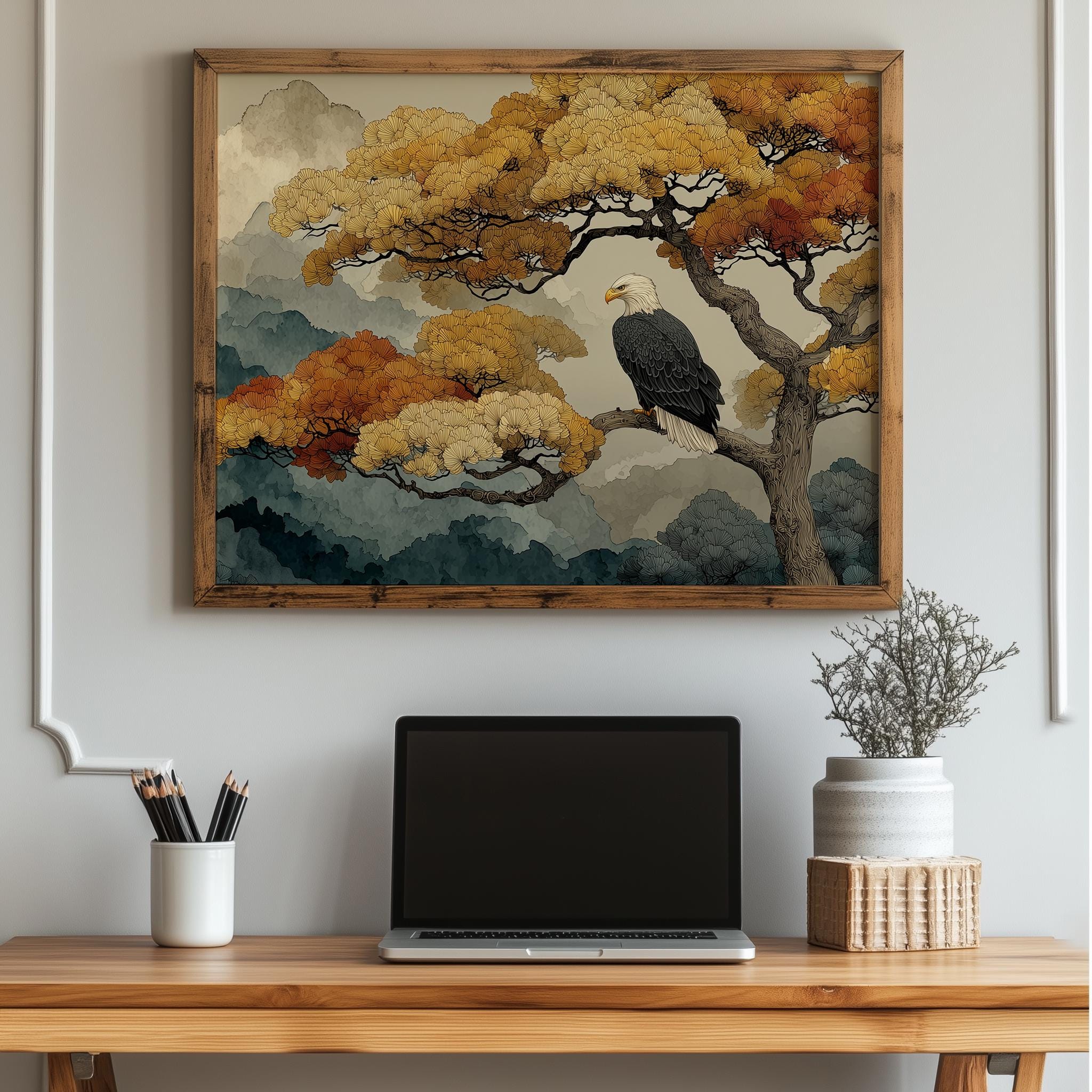 Immerse yourself in the charm with this rustic painting of a bald eagle perched gracefully on a pine branch. An instantly downloadable print, it's perfect for elevating your decor with budget-friendly charm. This gives you the flexibility to customize the size, frame, and material according to your personal taste and space, ensuring a perfect fit for your walls.
