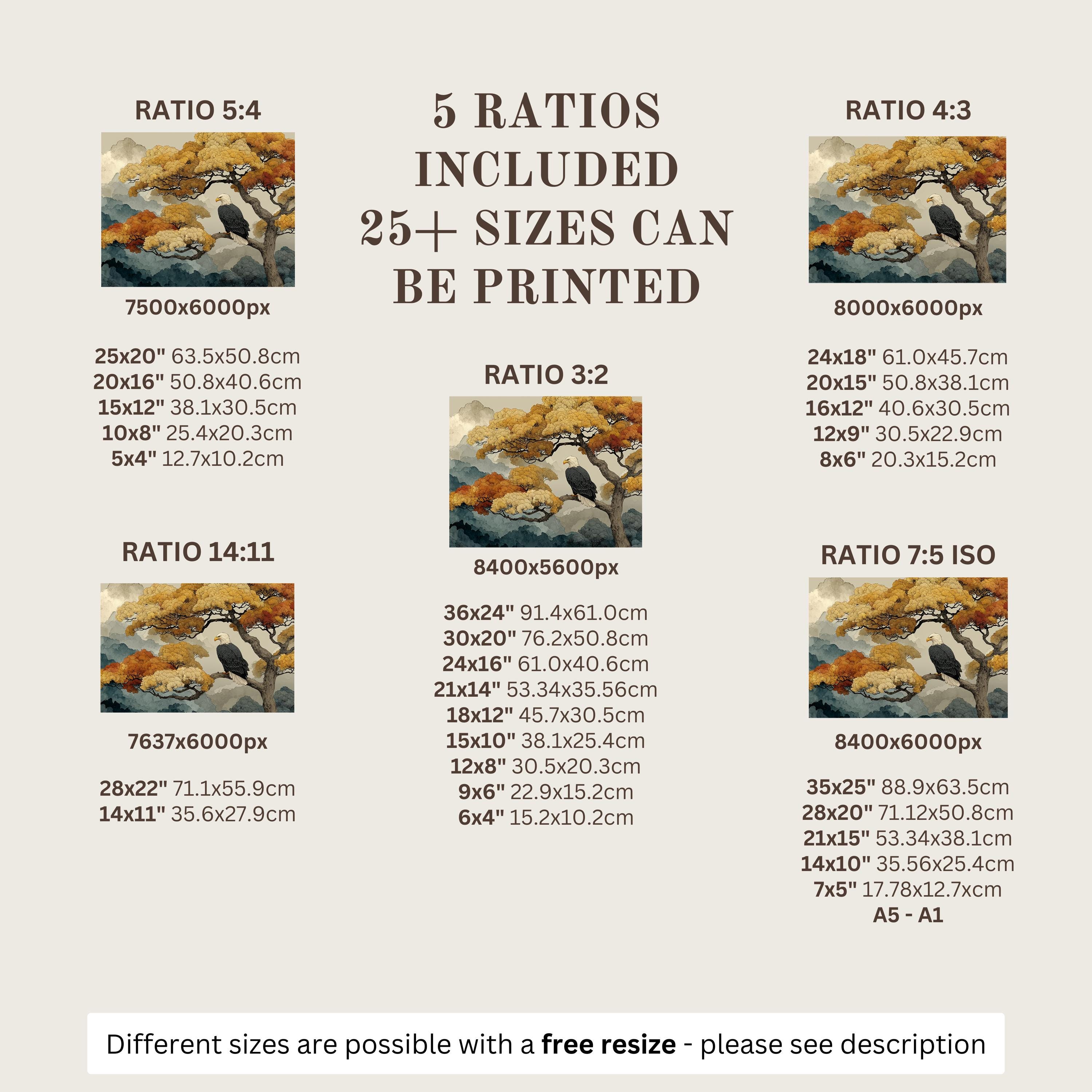 Each artwork includes 5 aspect ratios with 25+ print sizes. Most standard frames are covered. One custom resize per purchase available—message before ordering.