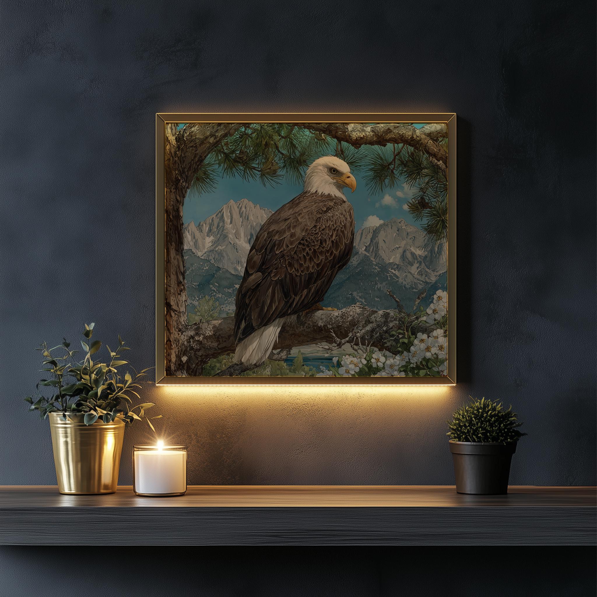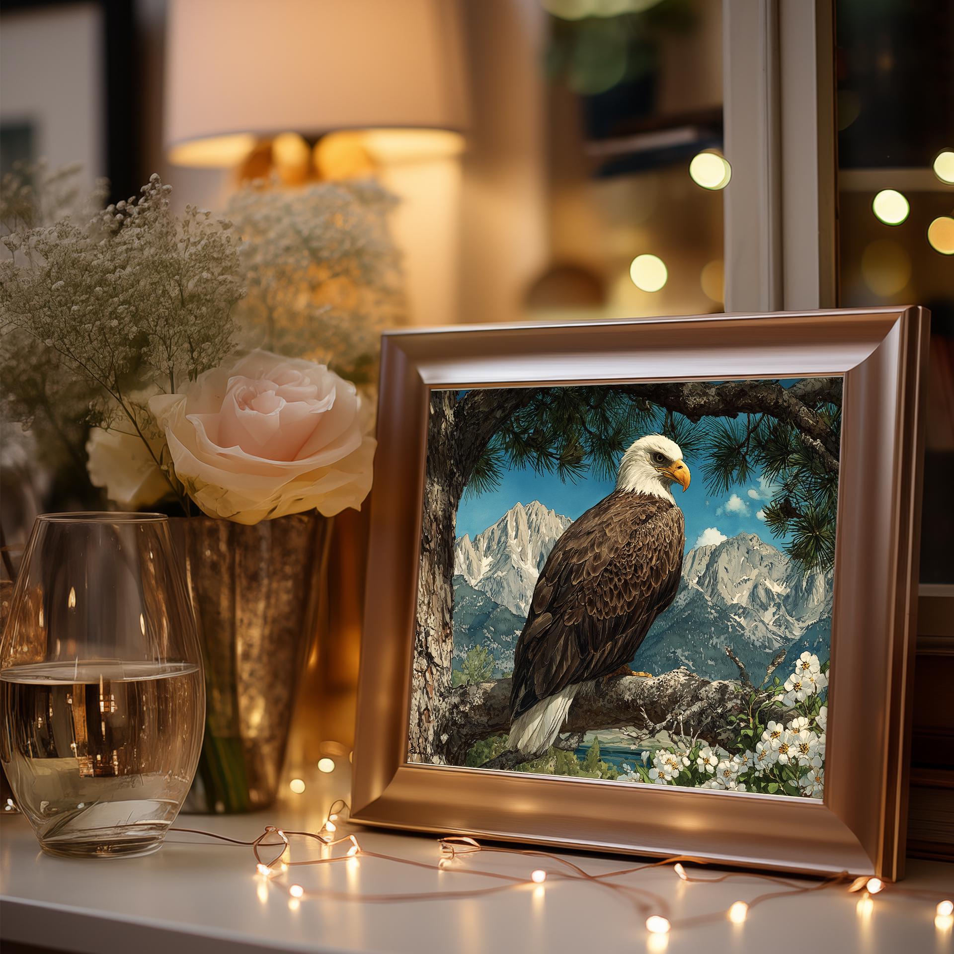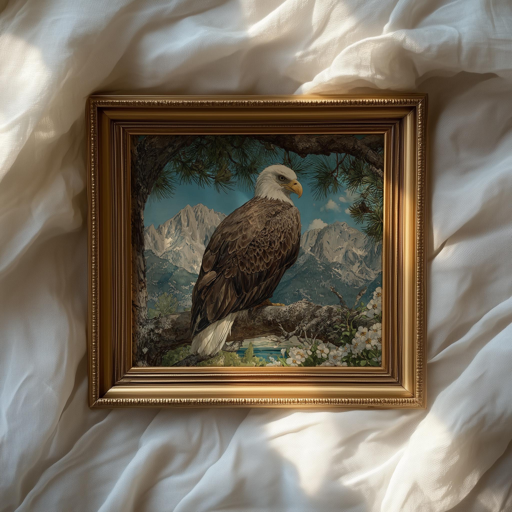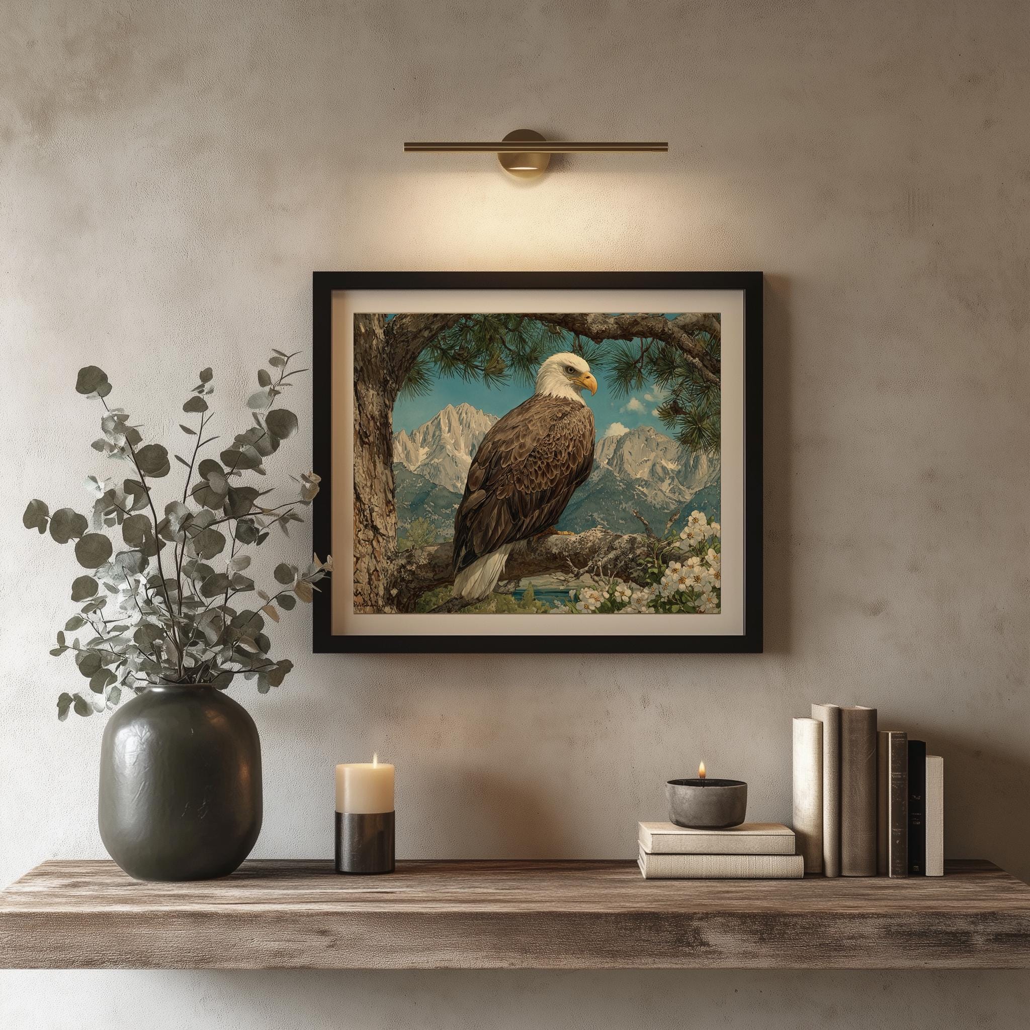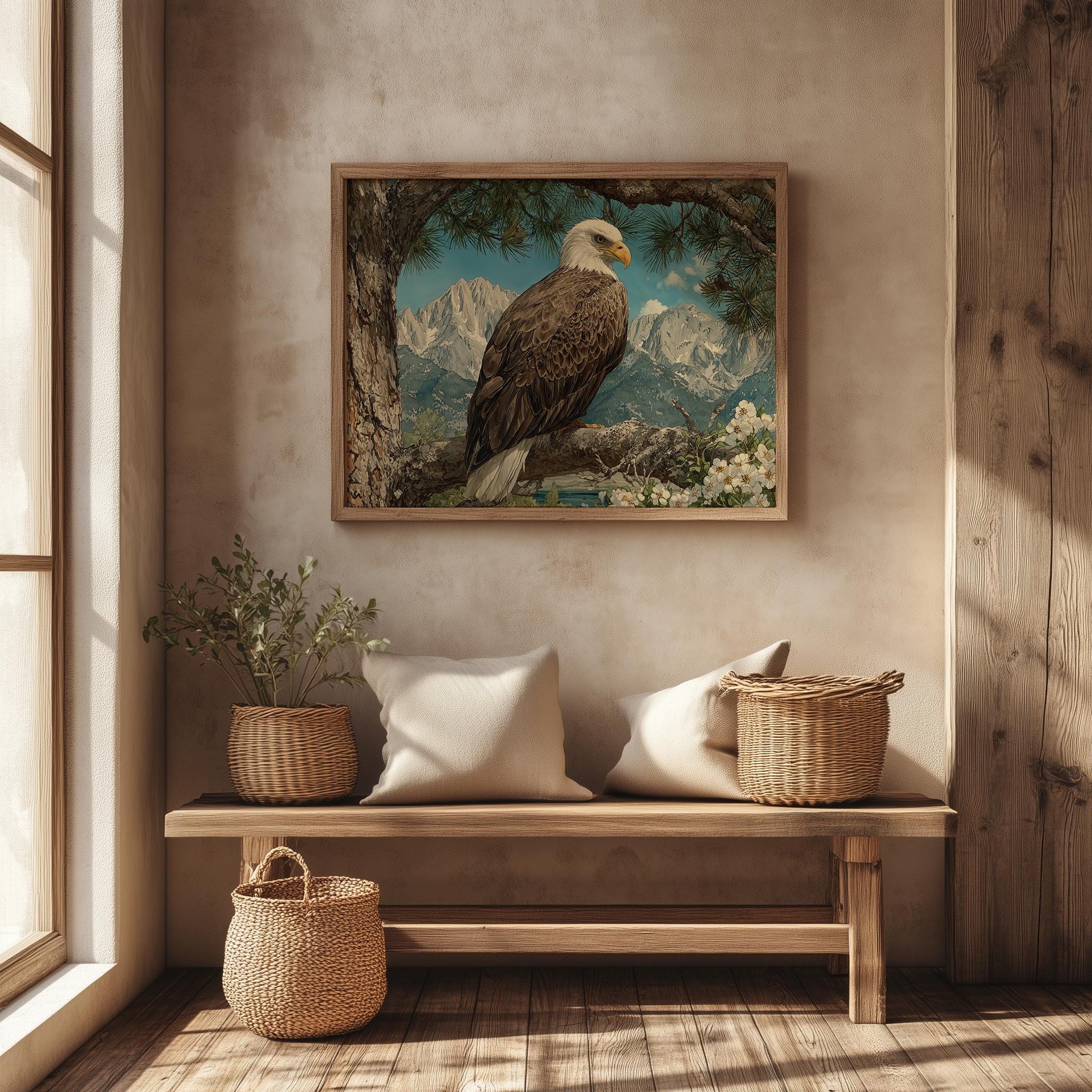 Immerse yourself in the charm with this rustic painting of a majestic bald eagle perched gracefully on a sunlit pine branch. An instantly downloadable print, it's perfect for elevating your decor with budget-friendly charm. This gives you the flexibility to customize the size, frame, and material according to your personal taste and space, ensuring a perfect fit for your walls.