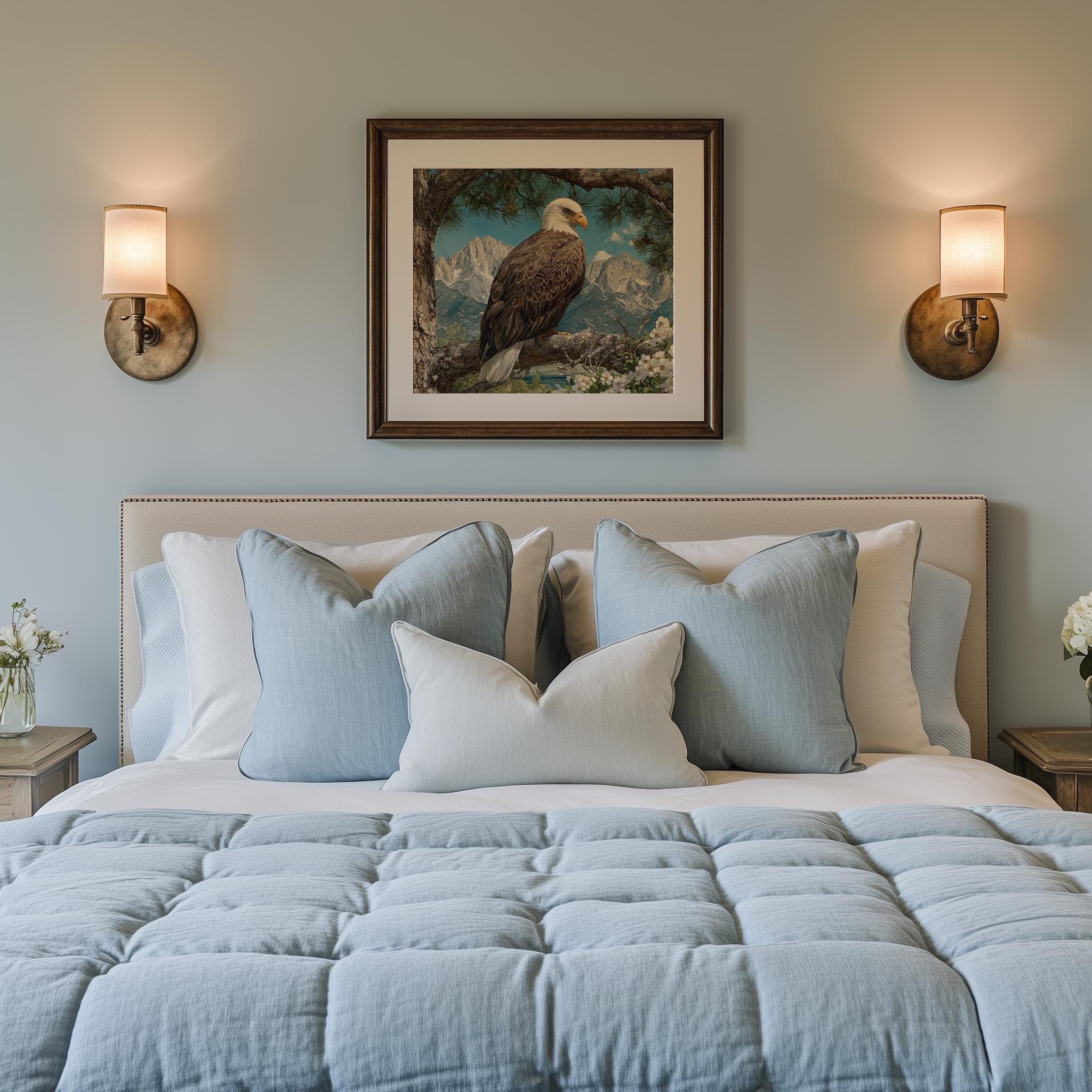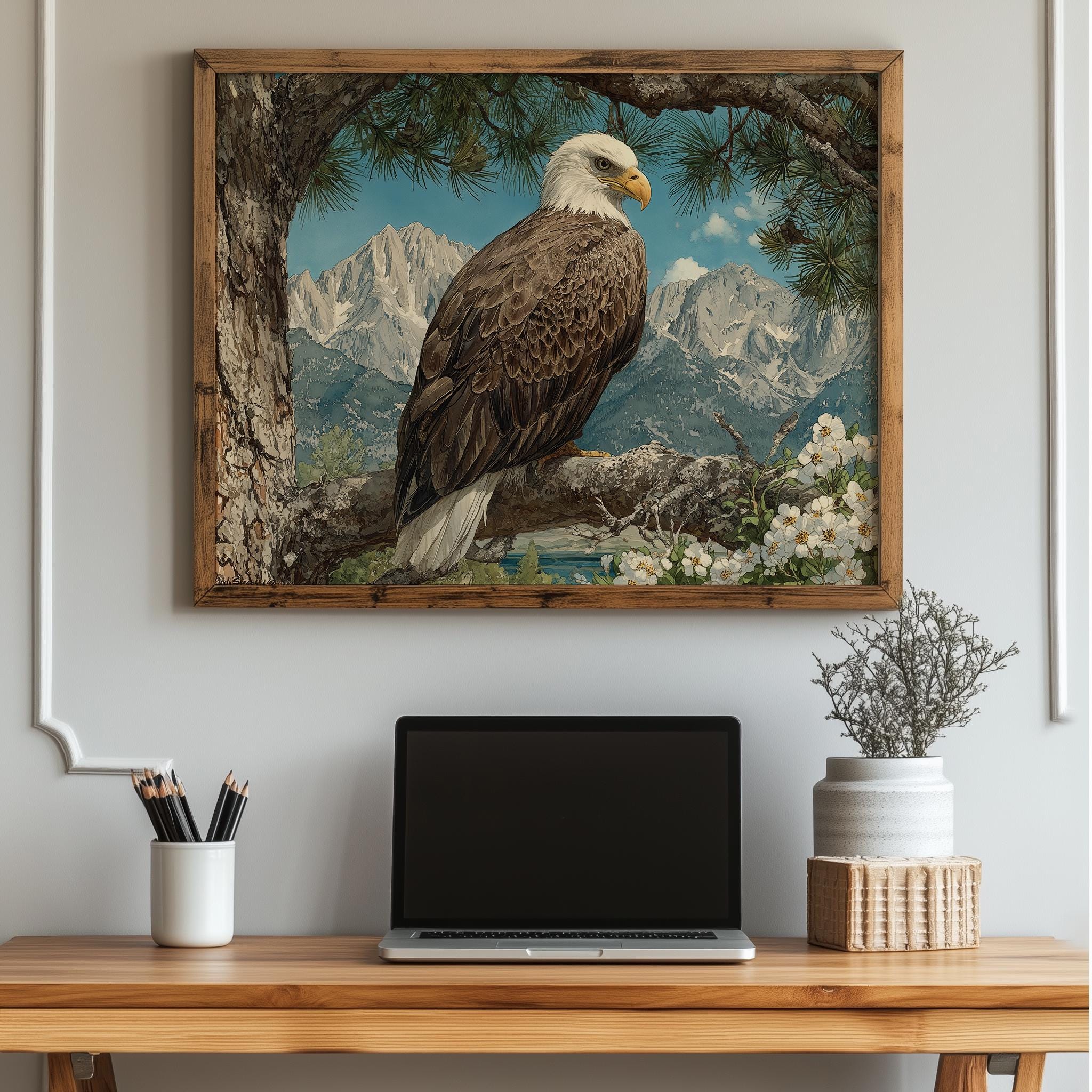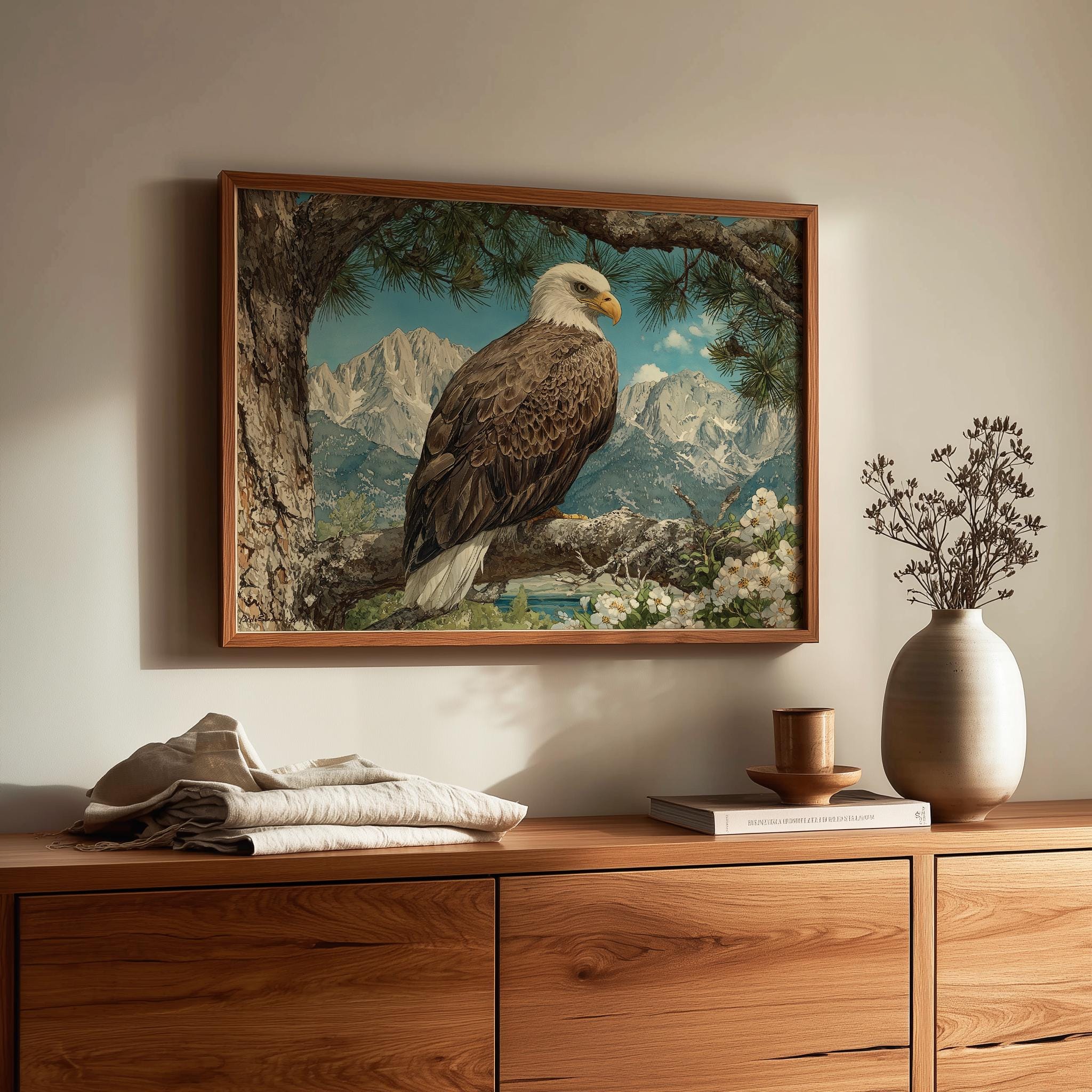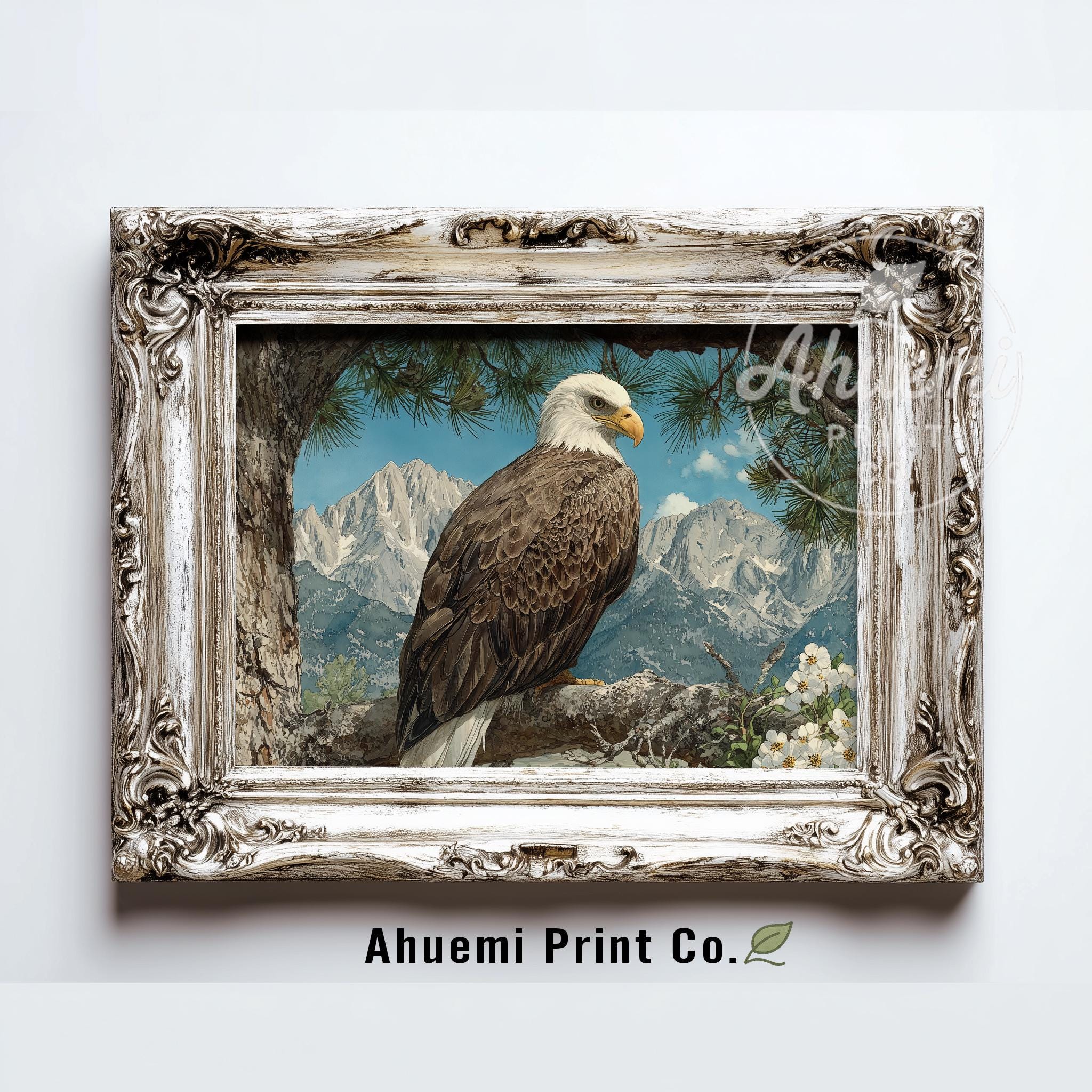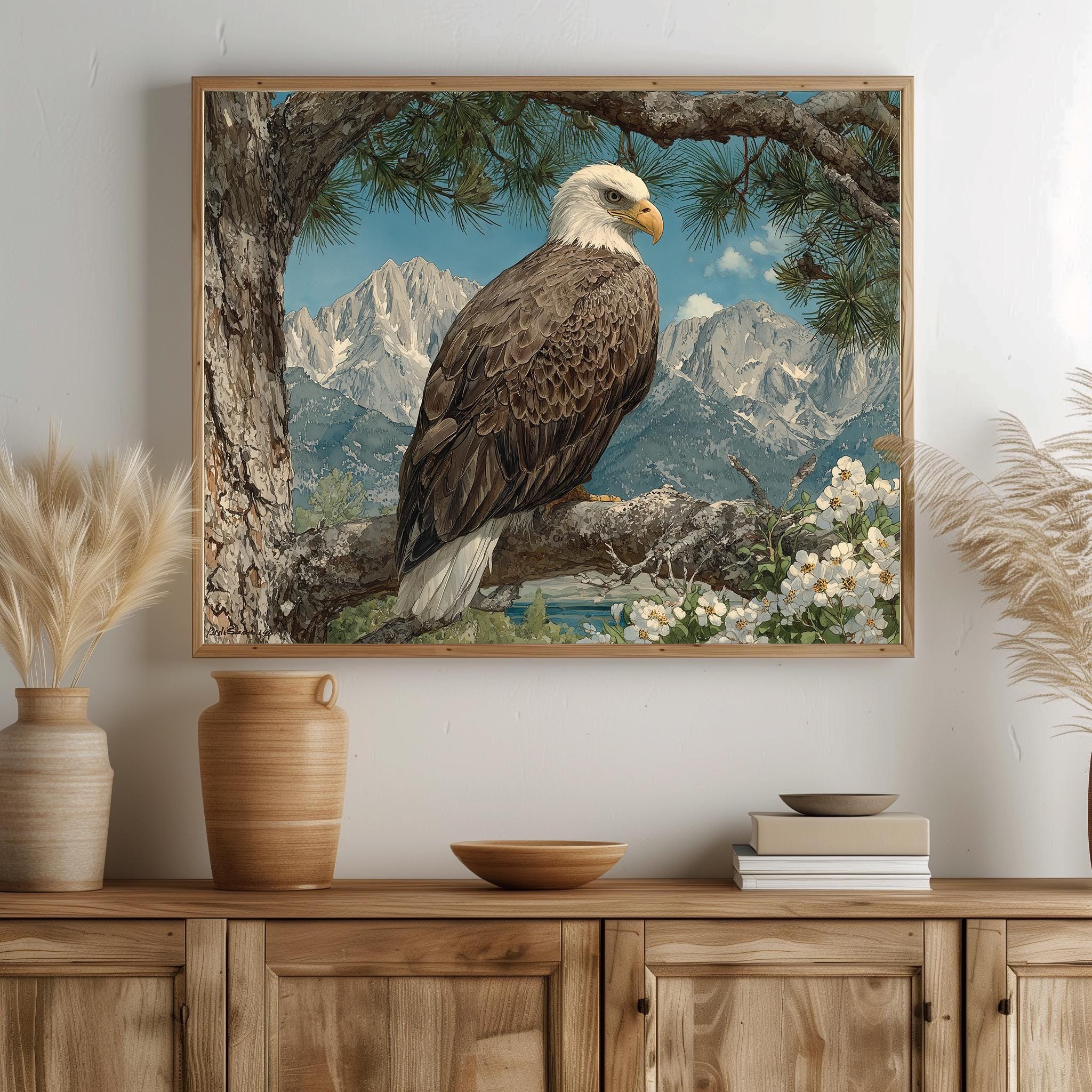 Immerse yourself in the charm with this rustic painting of a majestic bald eagle perched gracefully on a sunlit pine branch. An instantly downloadable print, it's perfect for elevating your decor with budget-friendly charm. This gives you the flexibility to customize the size, frame, and material according to your personal taste and space, ensuring a perfect fit for your walls.