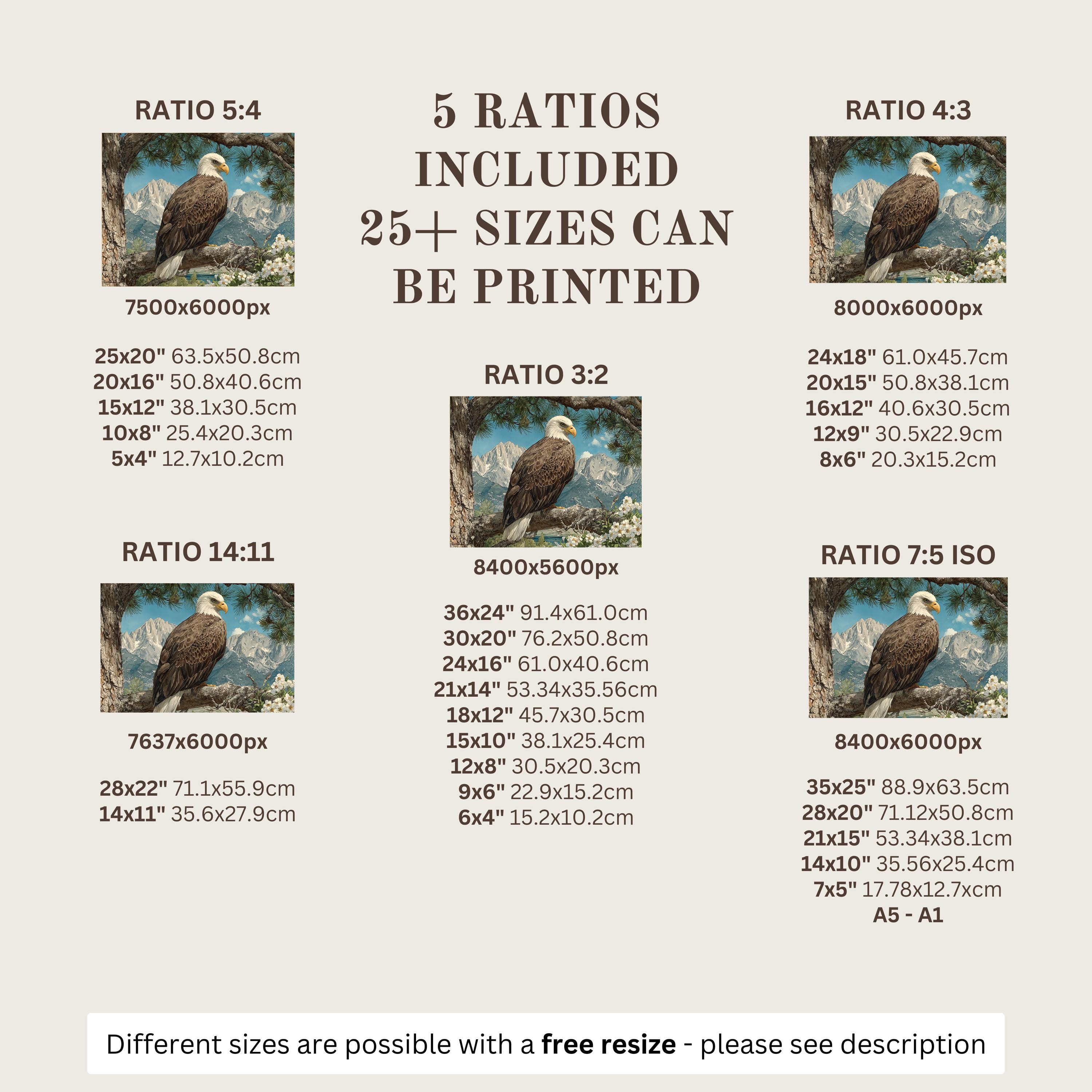 Each artwork includes 5 aspect ratios with 25+ print sizes. Most standard frames are covered. One custom resize per purchase available—message before ordering.