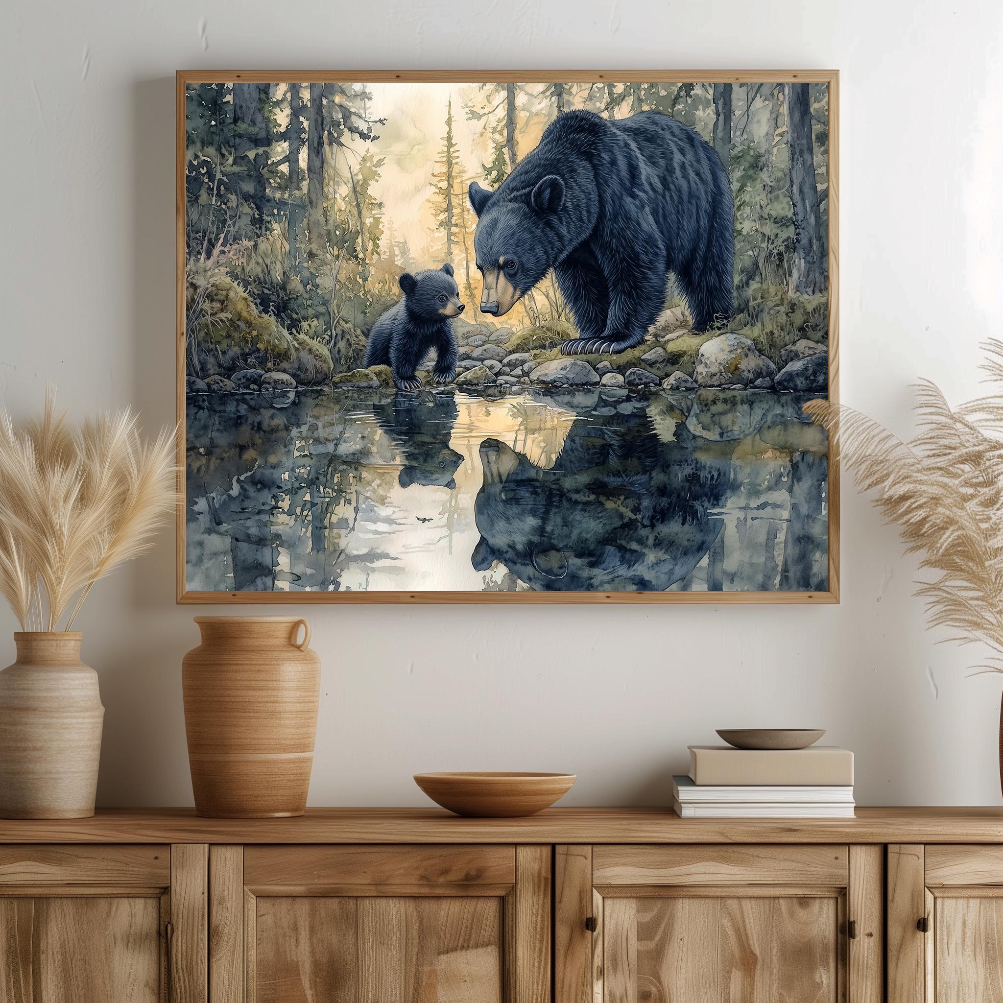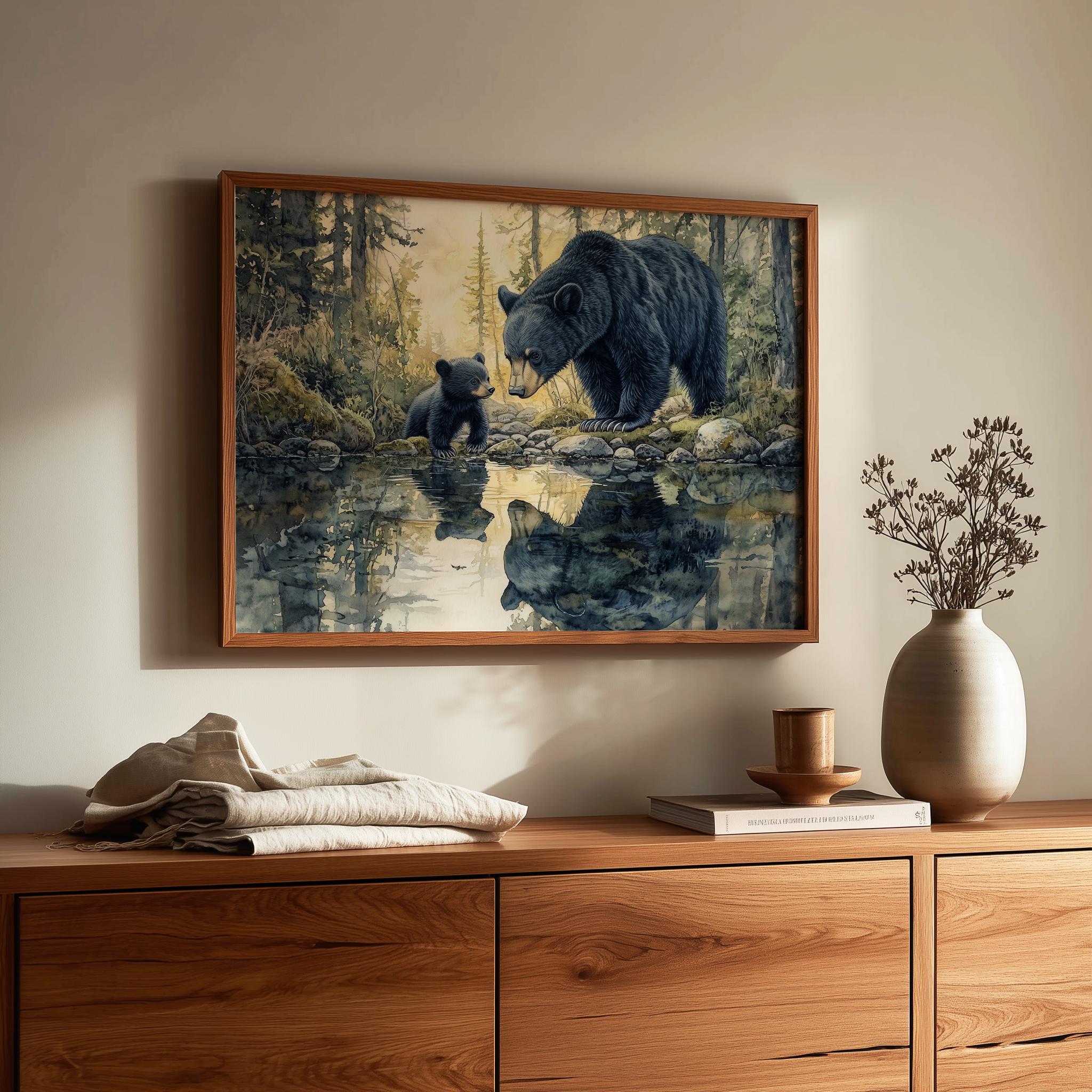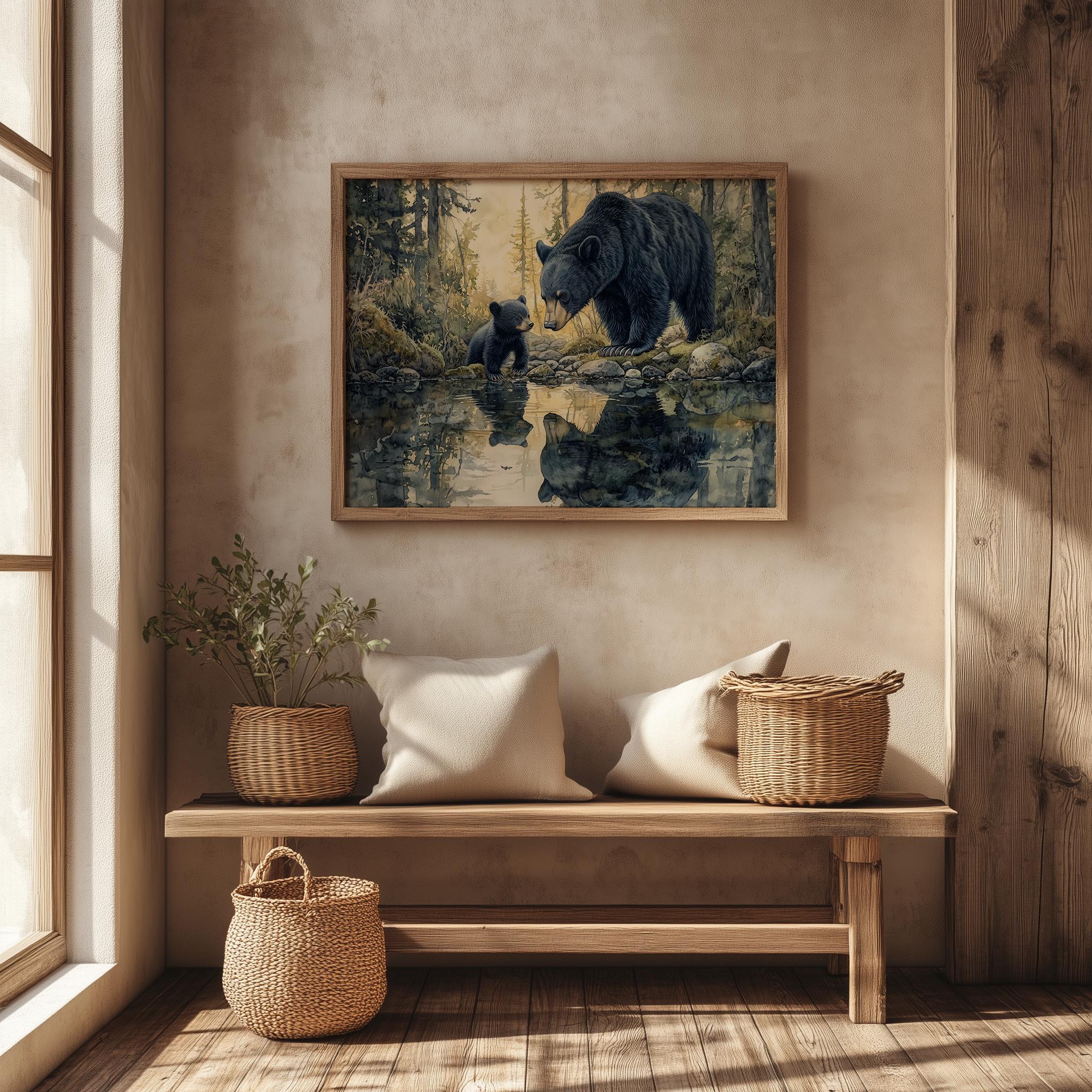 Immerse yourself in the charm with this rustic painting of a bear family by a serene creek in a tranquil forest setting. An instantly downloadable print, it's perfect for elevating your decor with budget-friendly charm. This gives you the flexibility to customize the size, frame, and material according to your personal taste and space, ensuring a perfect fit for your walls.