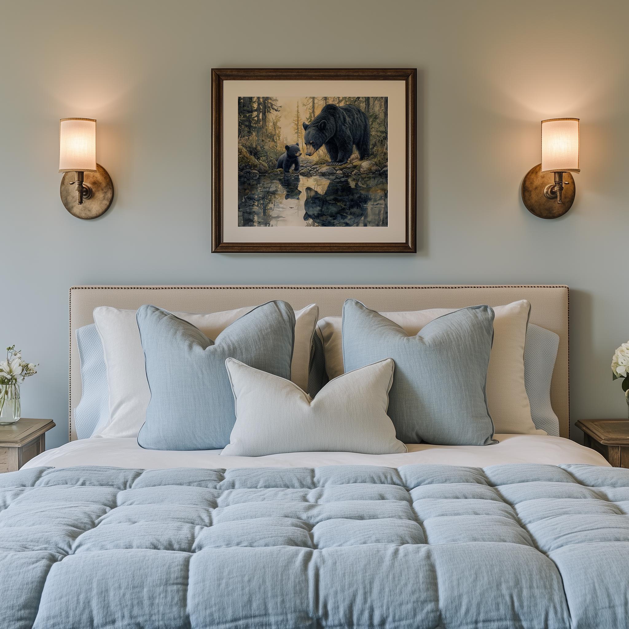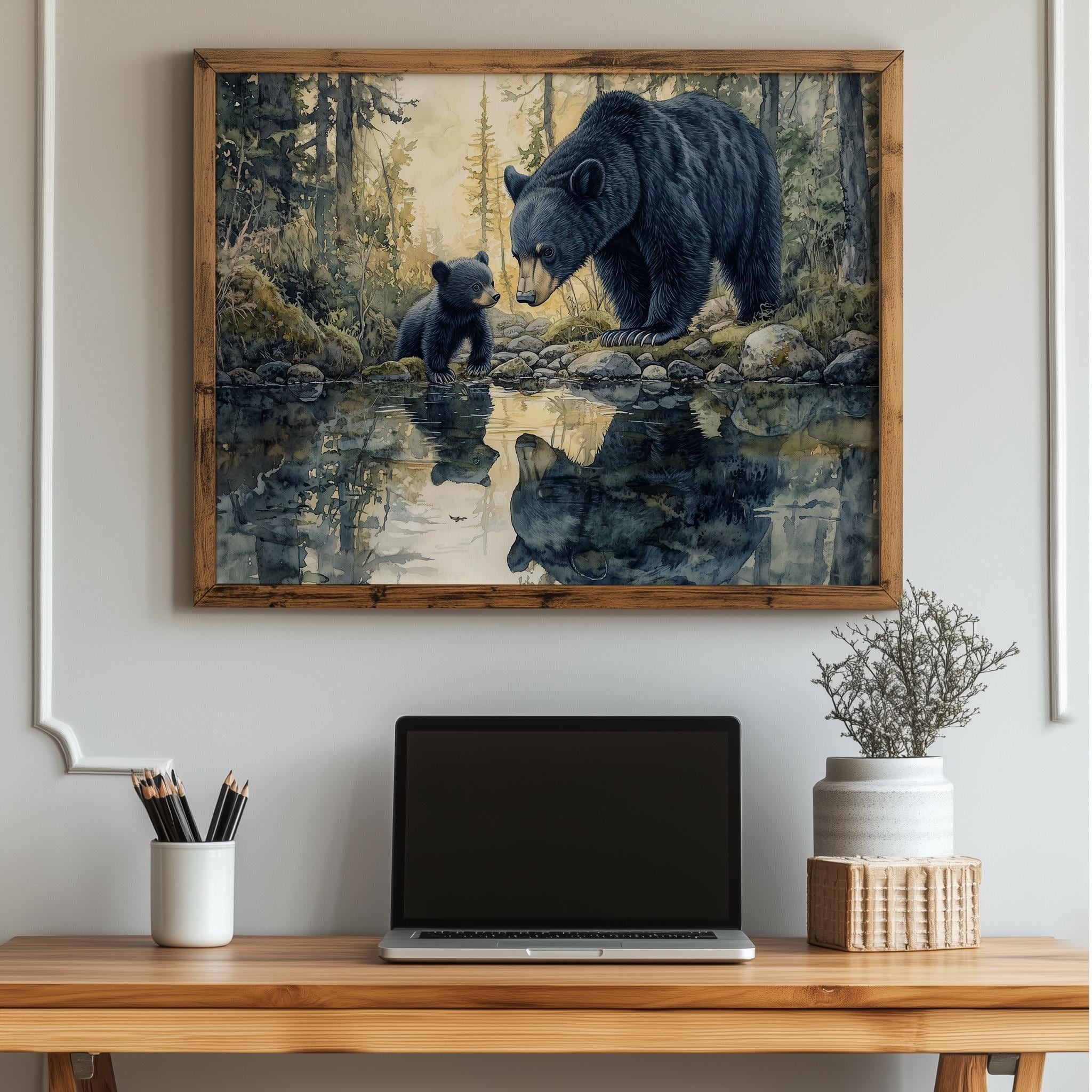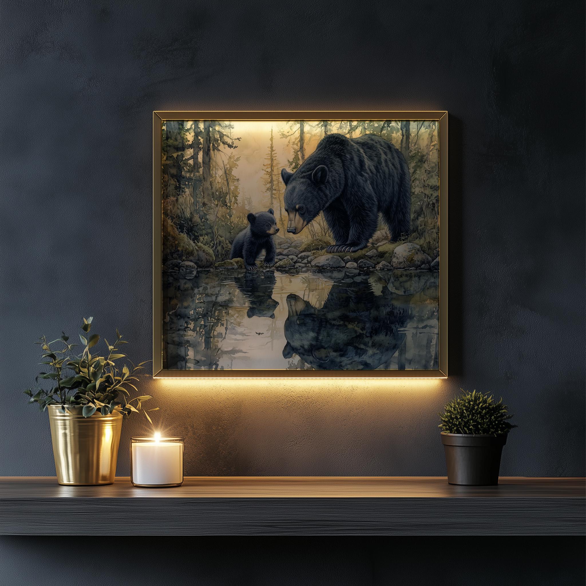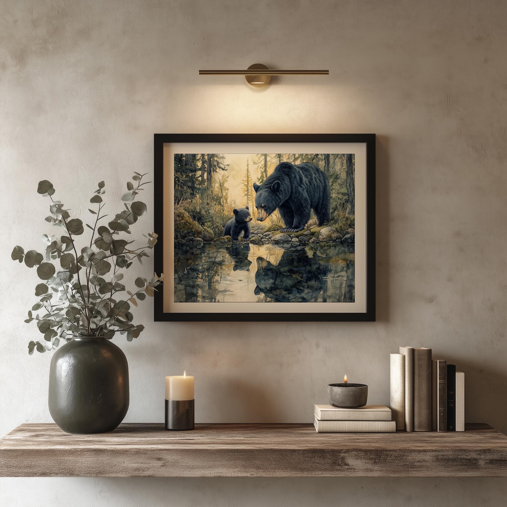 Immerse yourself in the charm with this rustic painting of a bear family by a serene creek in a tranquil forest setting. An instantly downloadable print, it's perfect for elevating your decor with budget-friendly charm. This gives you the flexibility to customize the size, frame, and material according to your personal taste and space, ensuring a perfect fit for your walls.