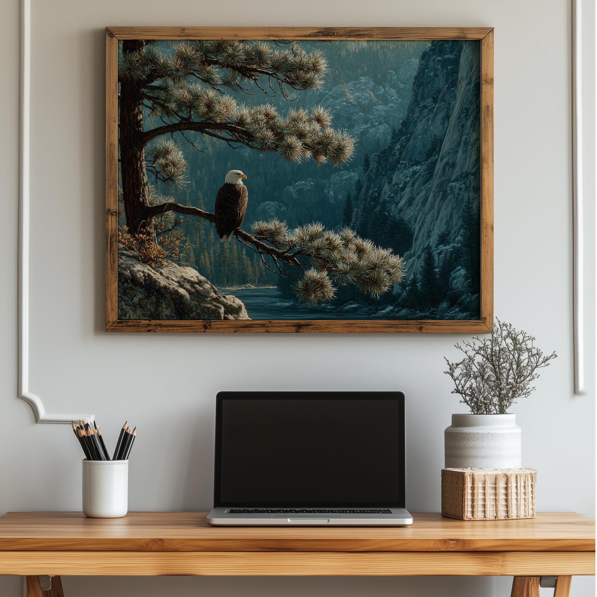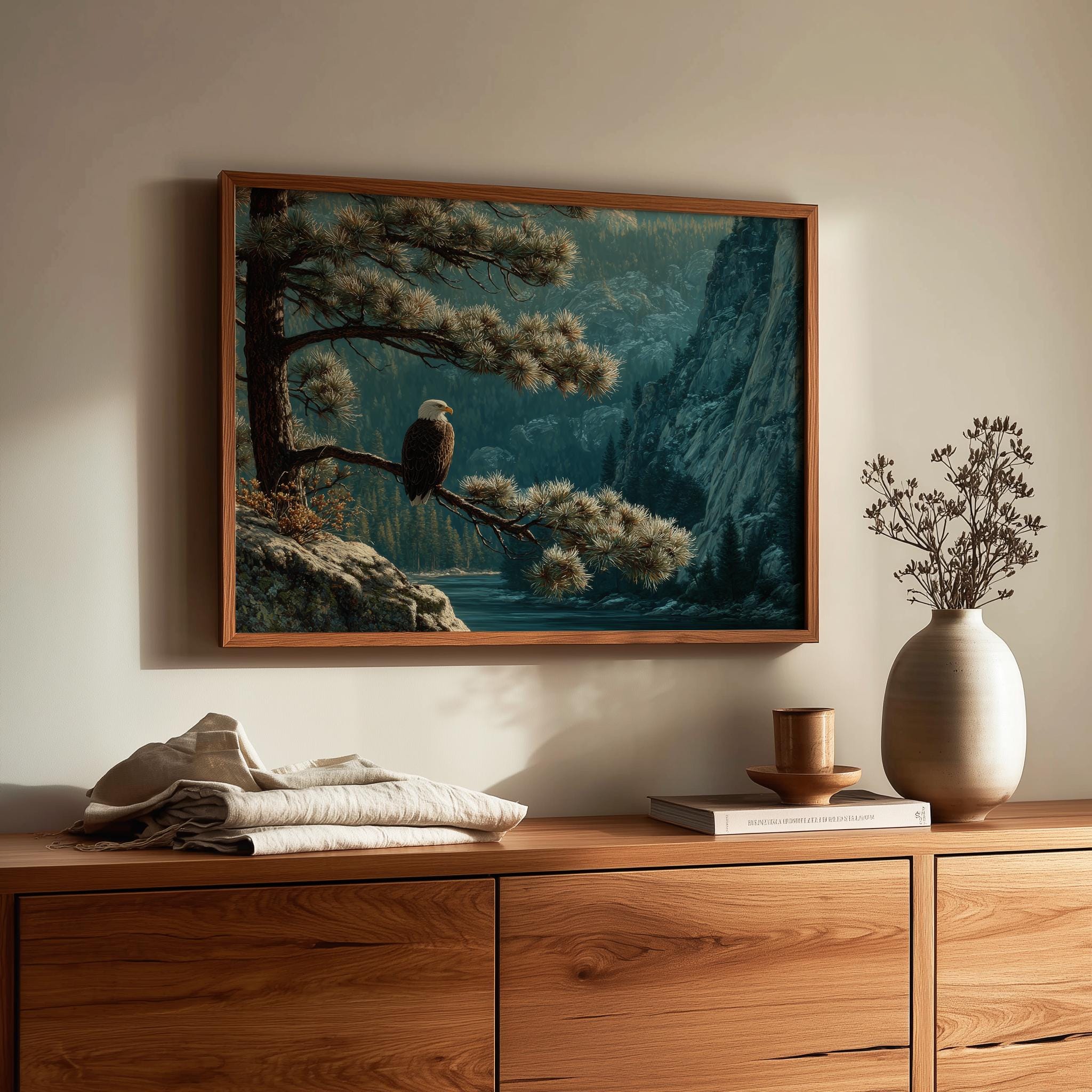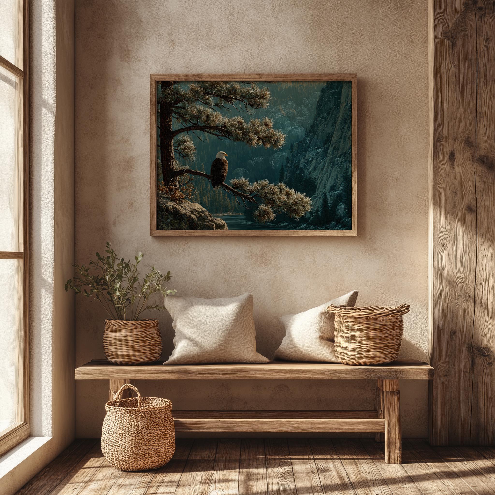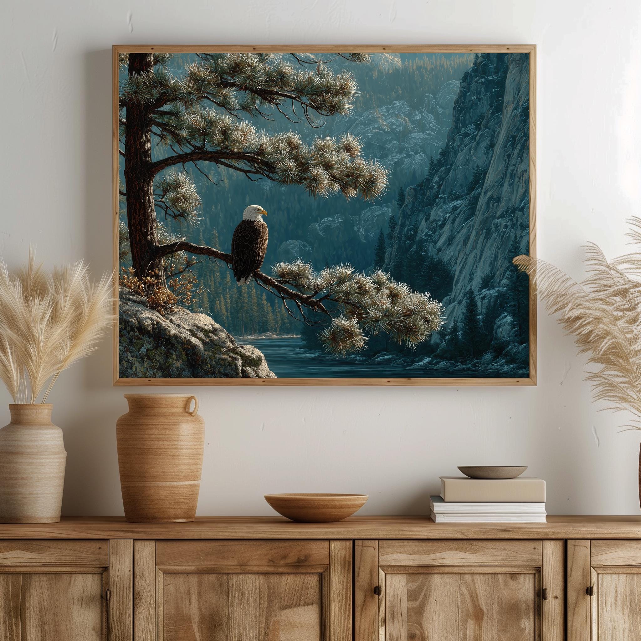 Immerse yourself in the charm with this rustic painting of a majestic bald eagle perched on a pine tree. An instantly downloadable print, it's perfect for elevating your decor with budget-friendly charm. This gives you the flexibility to customize the size, frame, and material according to your personal taste and space, ensuring a perfect fit for your walls.