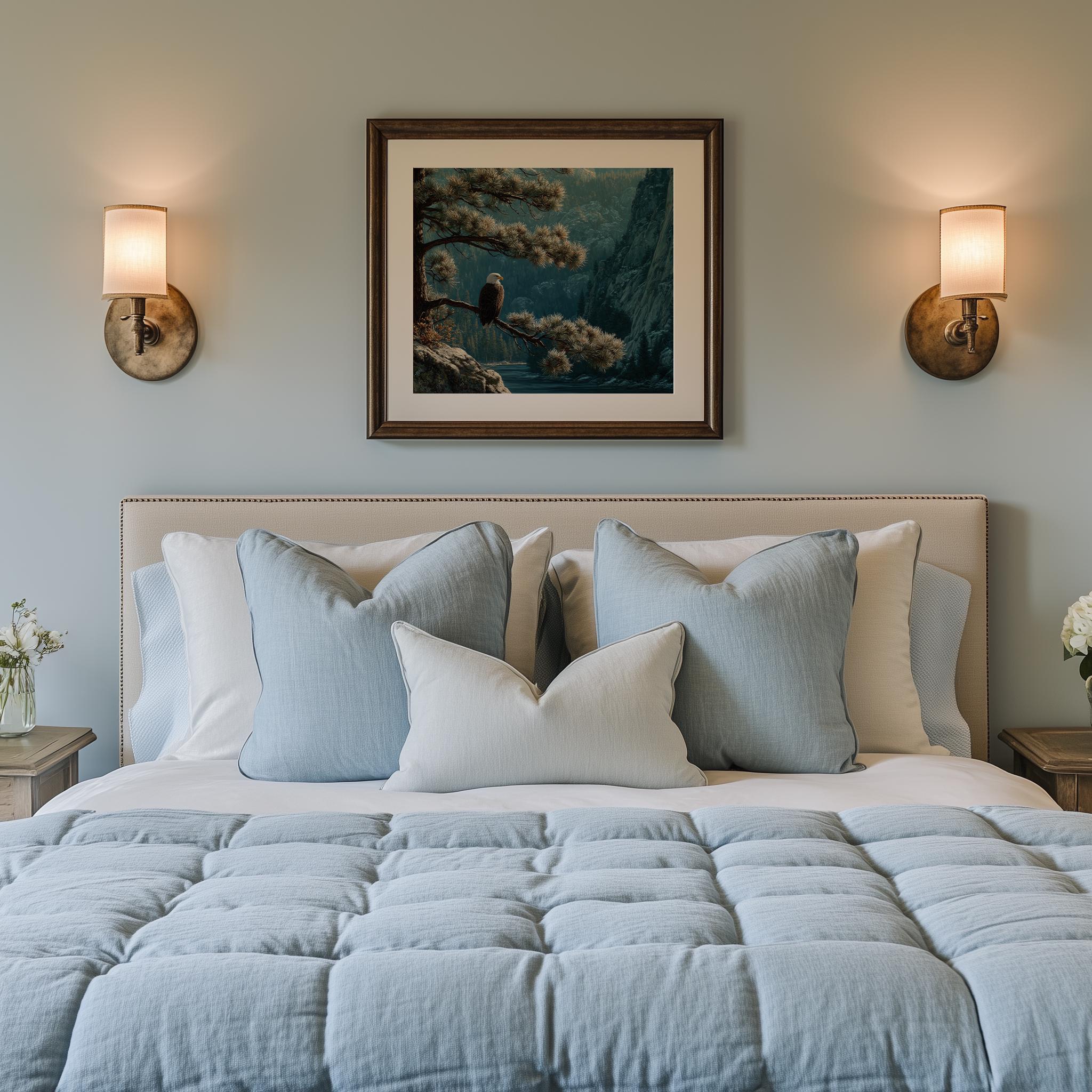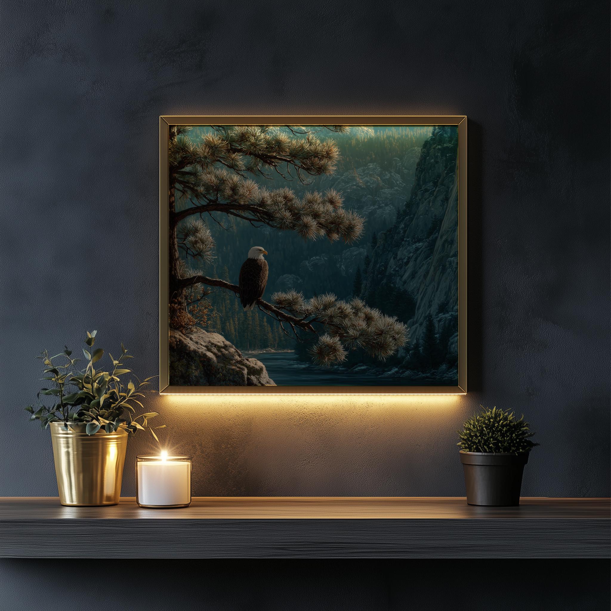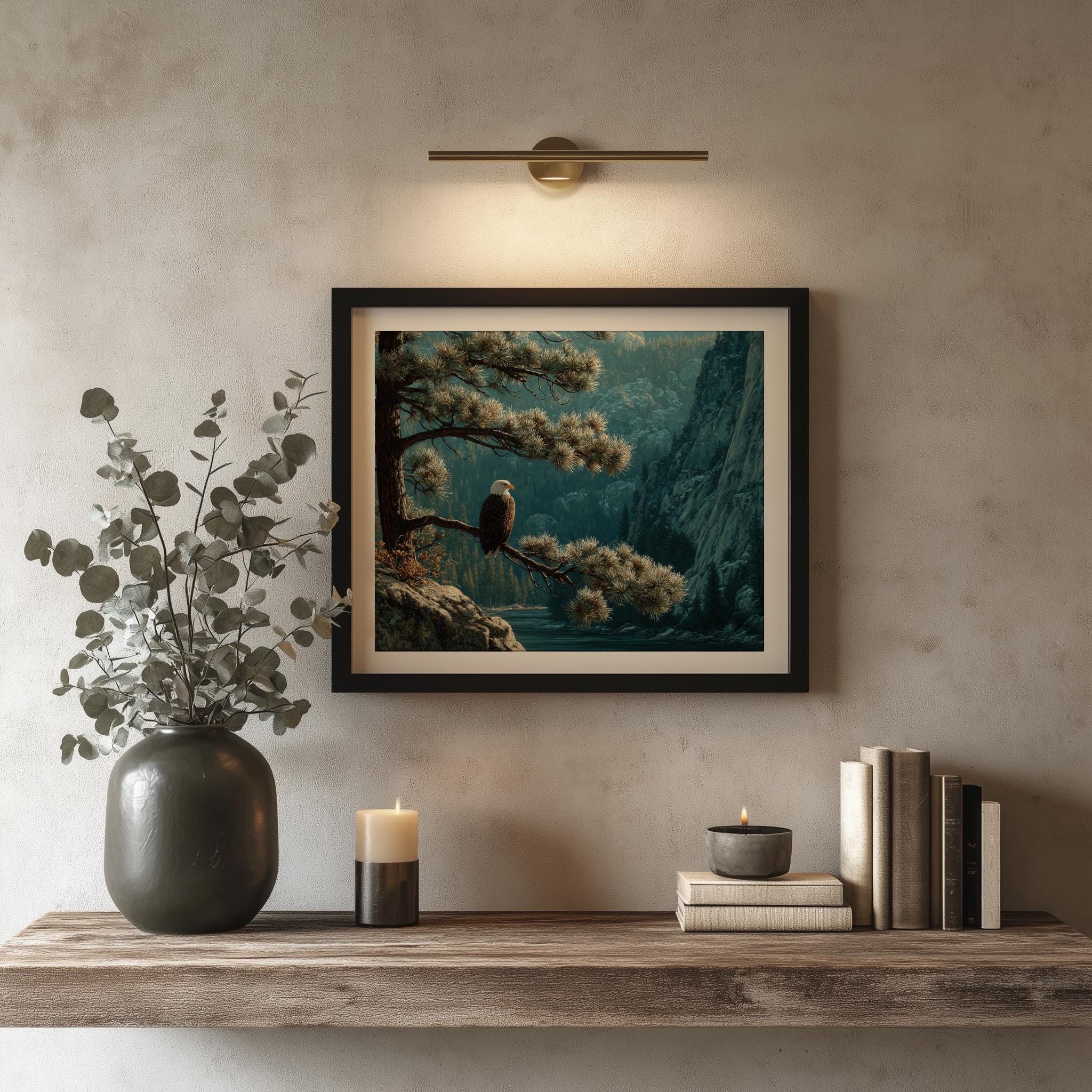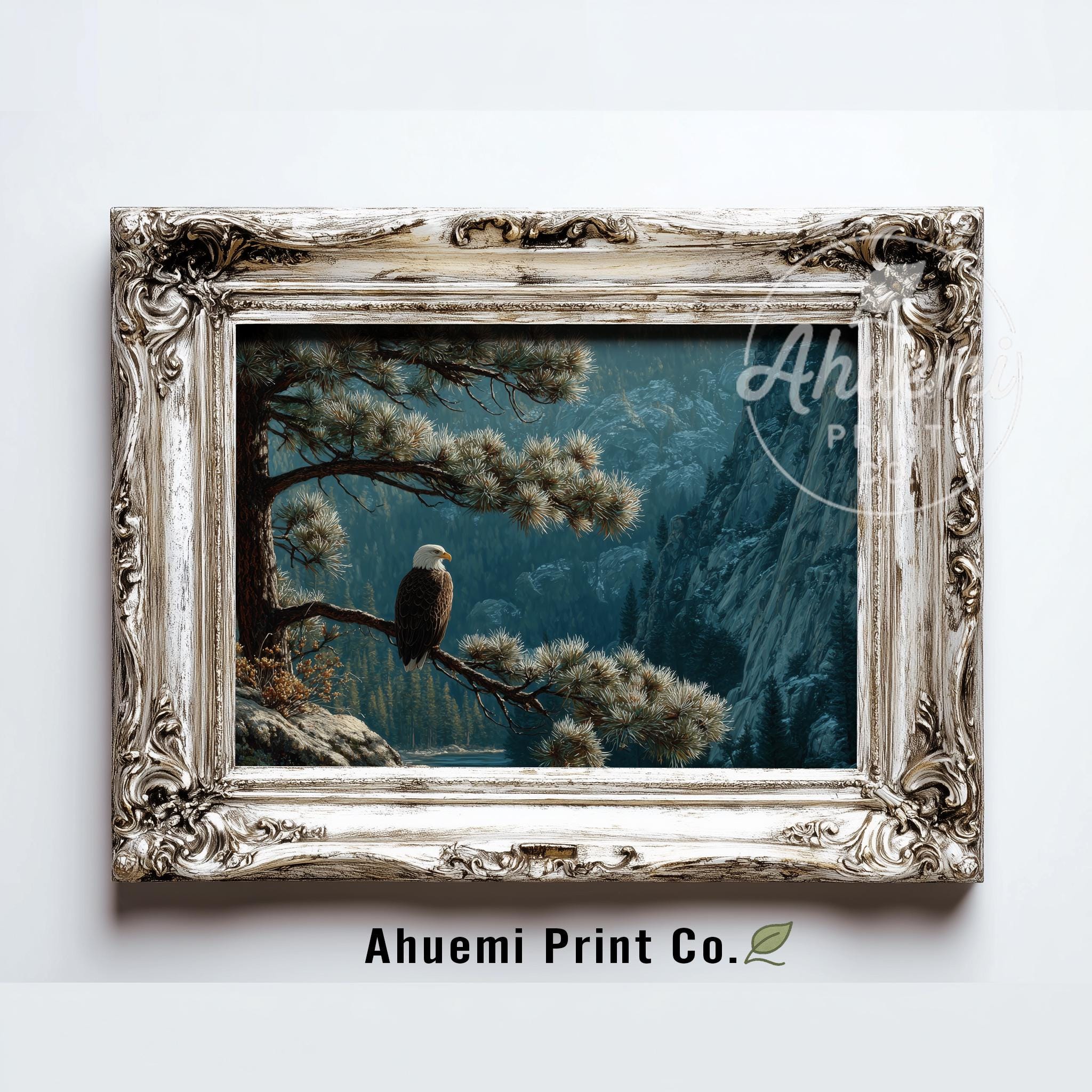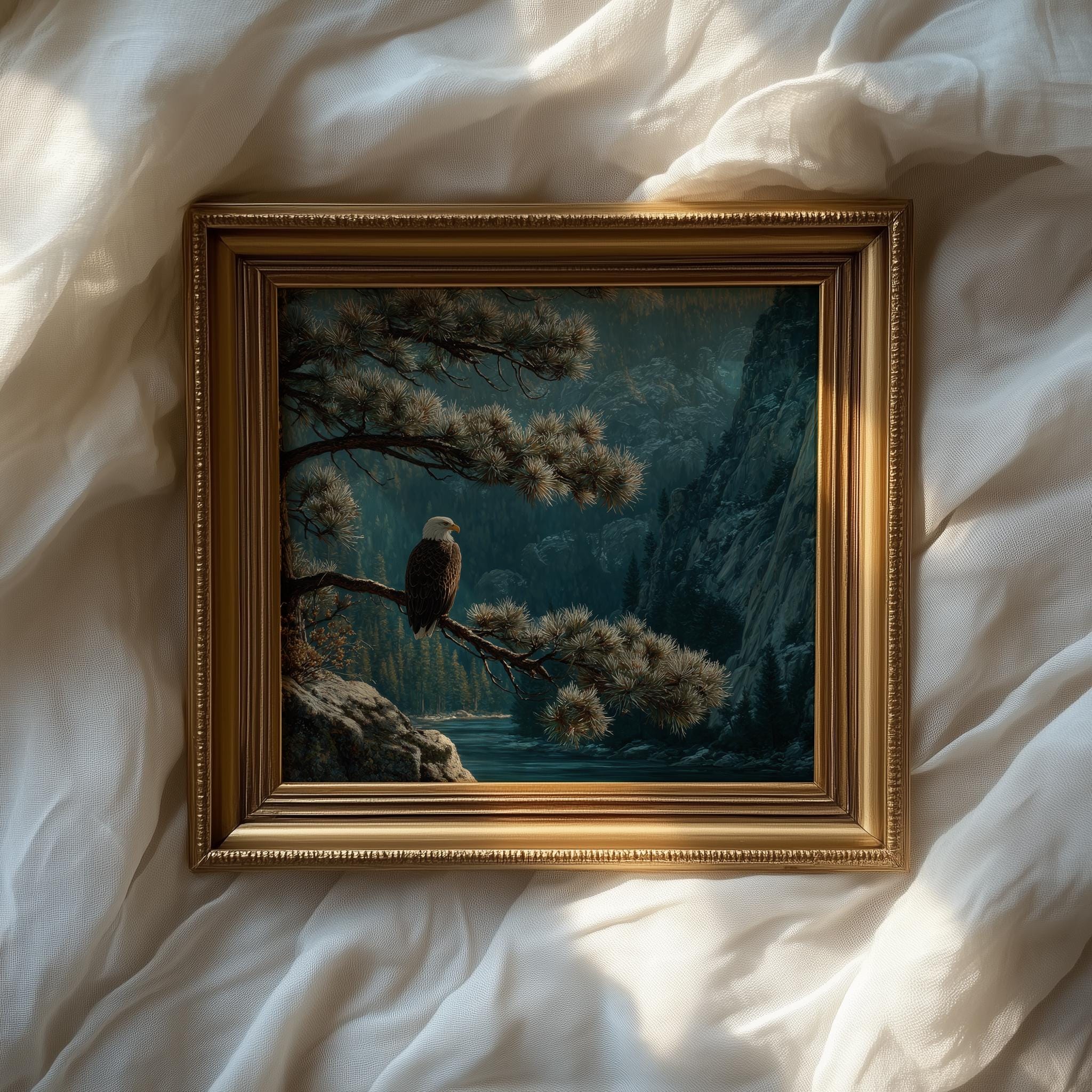 Immerse yourself in the charm with this rustic painting of a majestic bald eagle perched on a pine tree. An instantly downloadable print, it's perfect for elevating your decor with budget-friendly charm. This gives you the flexibility to customize the size, frame, and material according to your personal taste and space, ensuring a perfect fit for your walls.