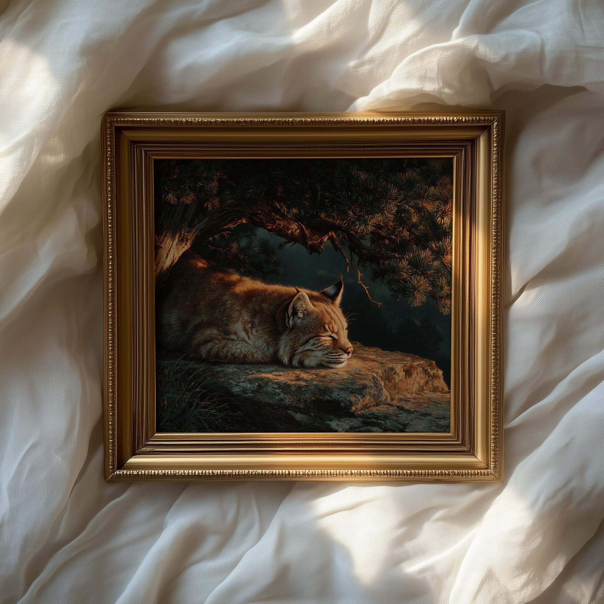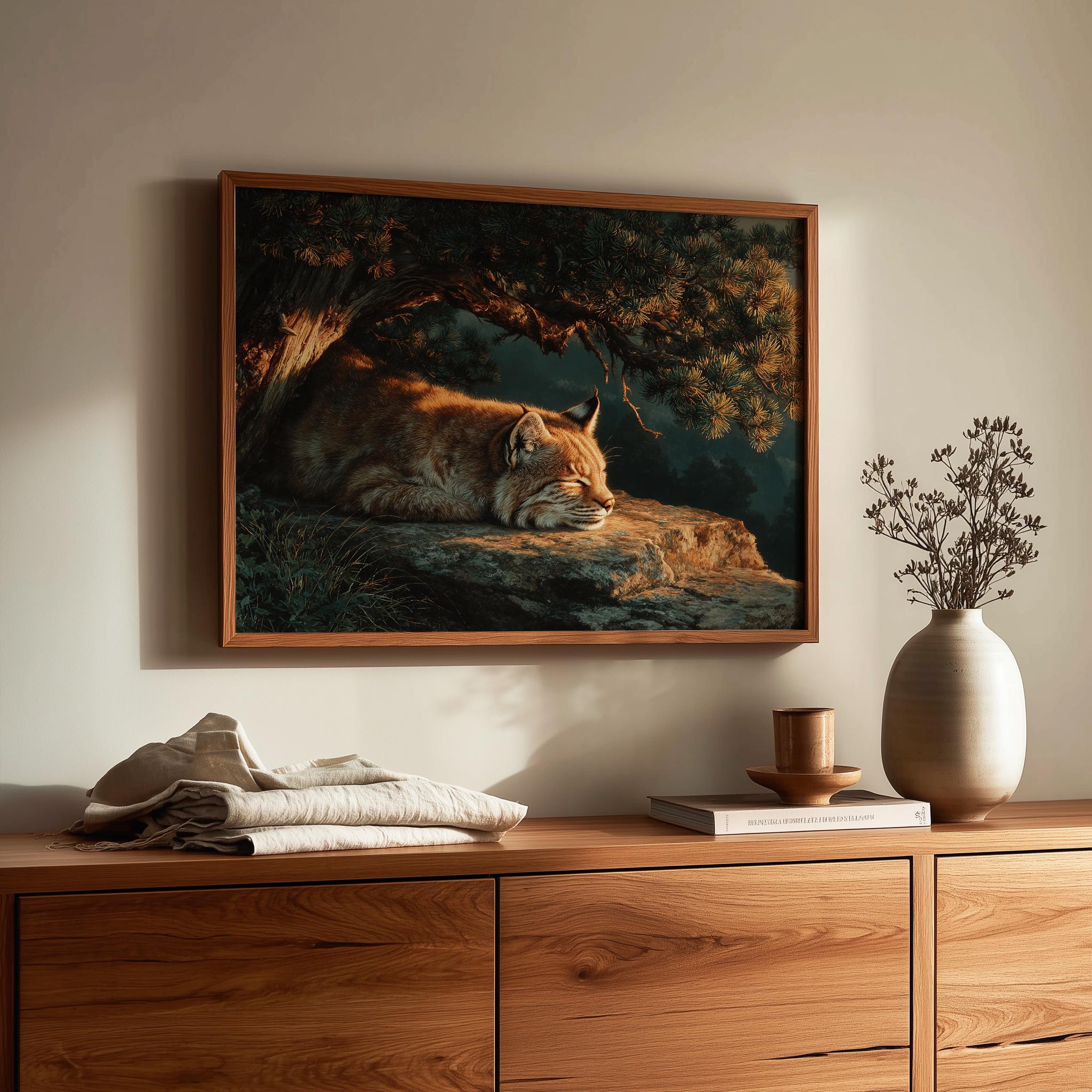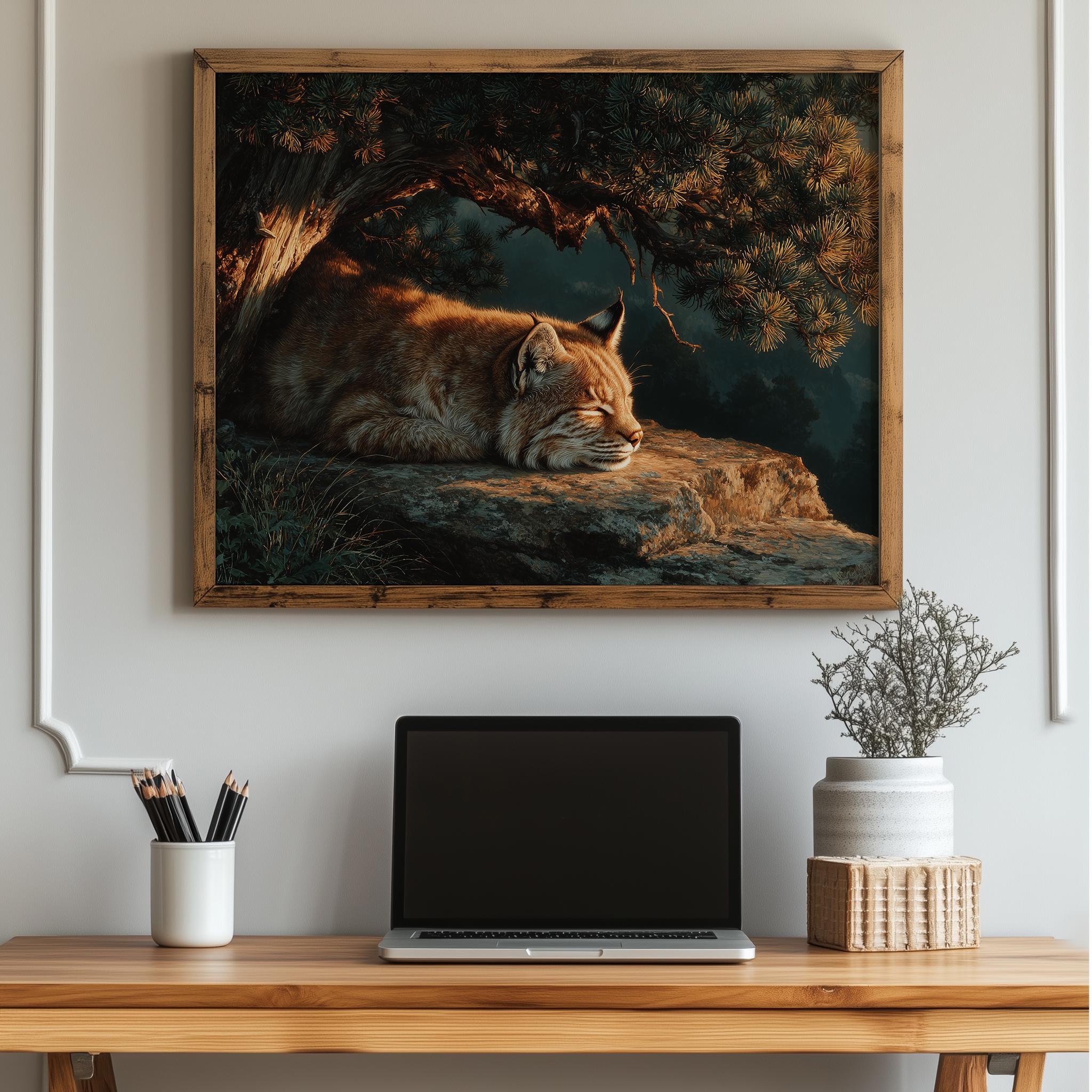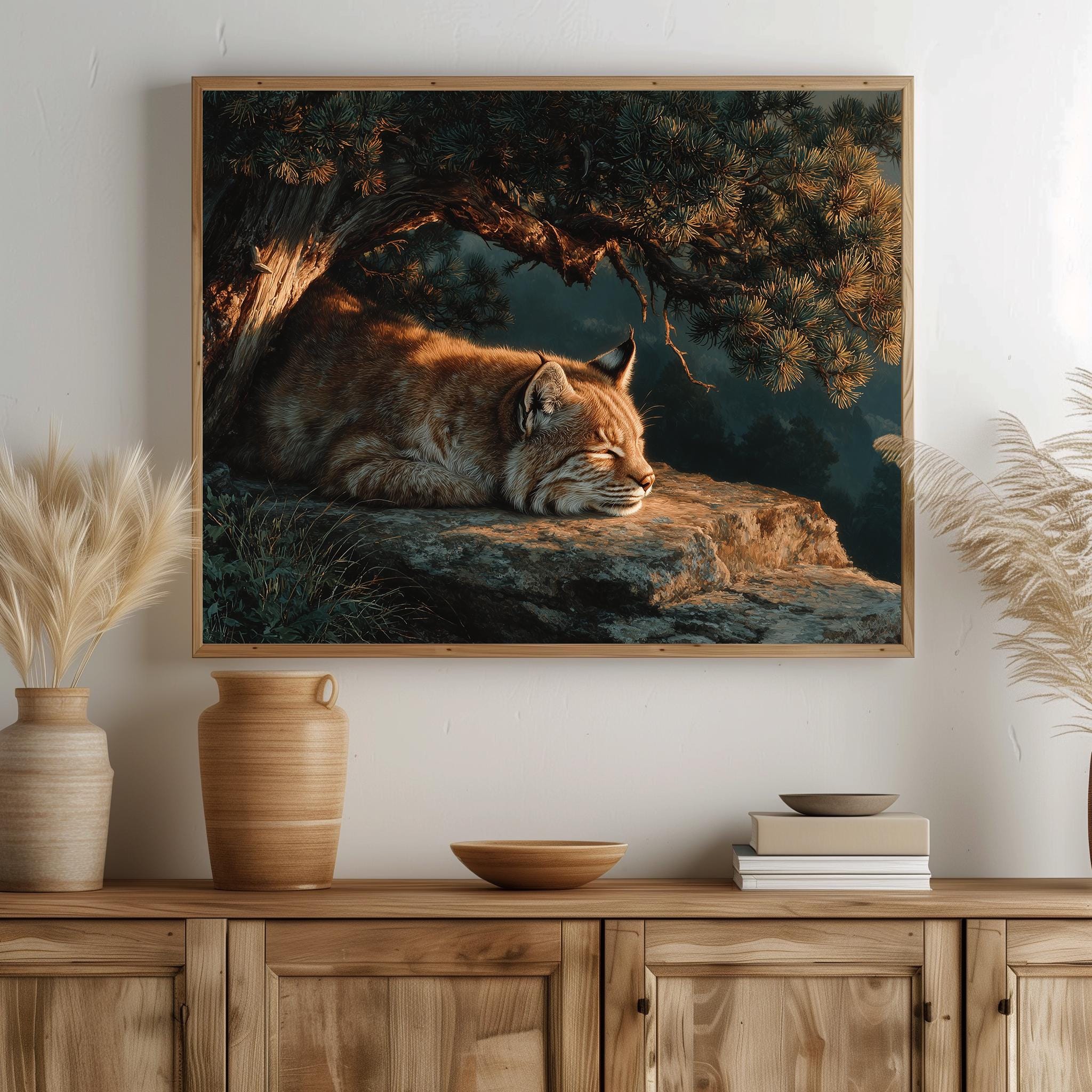 Immerse yourself in the charm with this rustic painting of a moody bobcat resting peacefully amidst the tranquil forest scenery. An instantly downloadable print, it's perfect for elevating your decor with budget-friendly charm. This gives you the flexibility to customize the size, frame, and material according to your personal taste and space, ensuring a perfect fit for your walls.