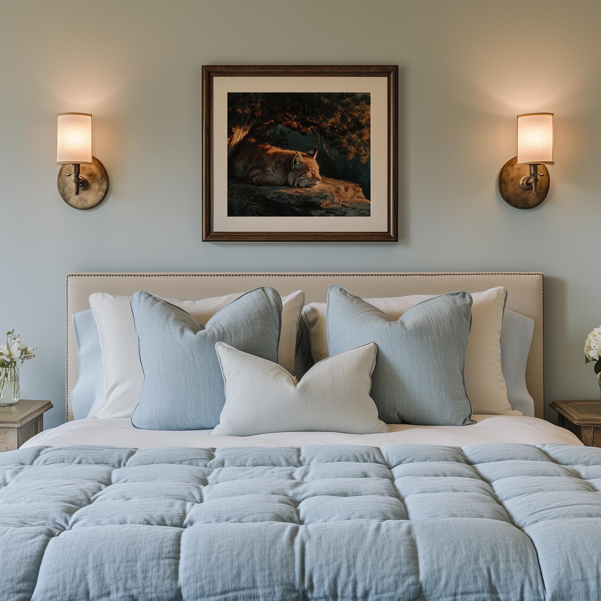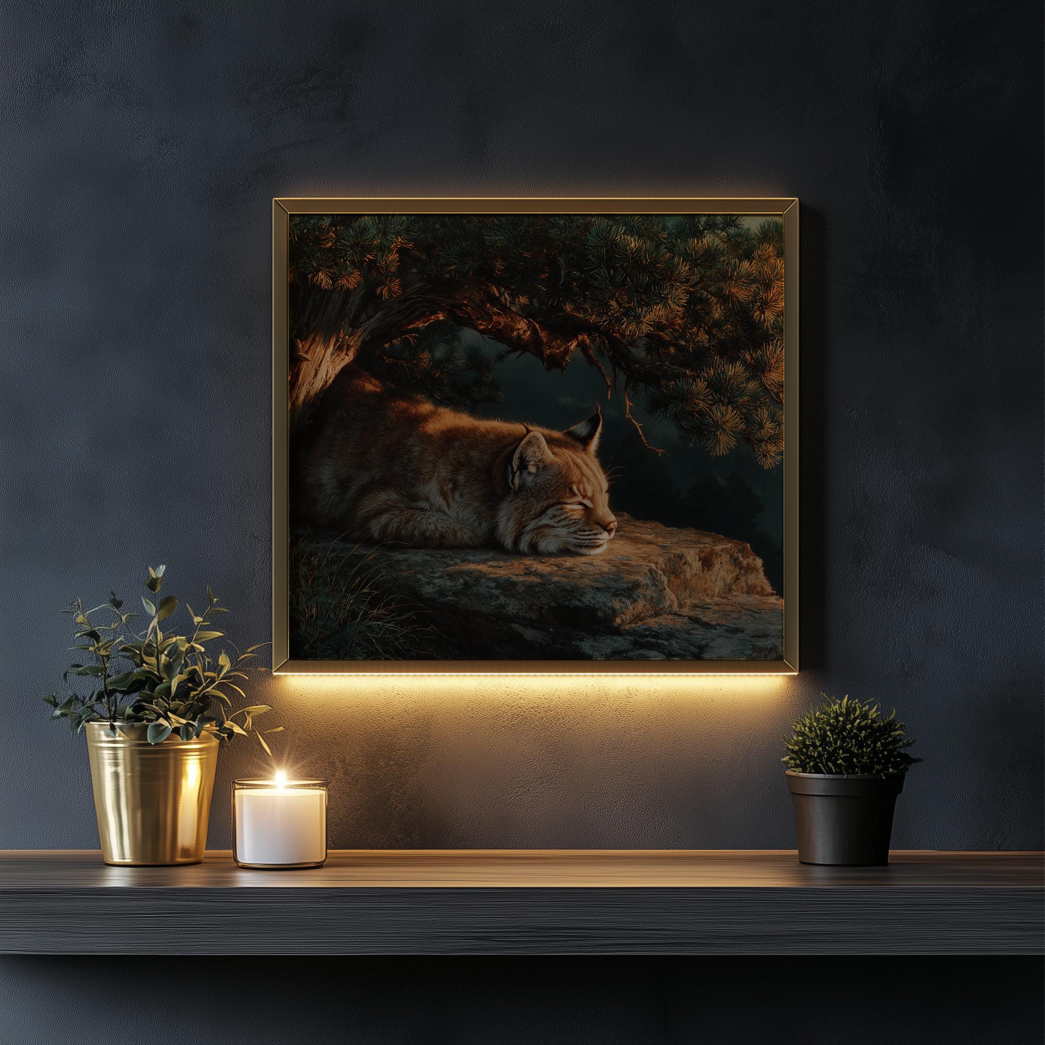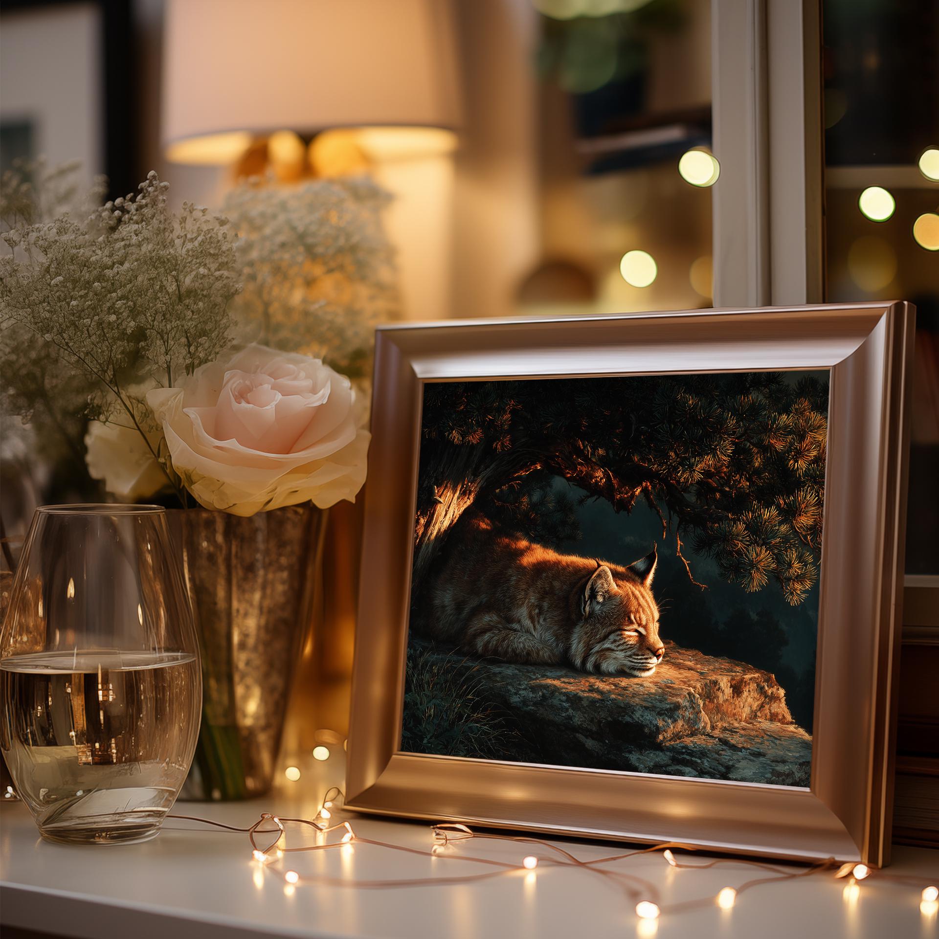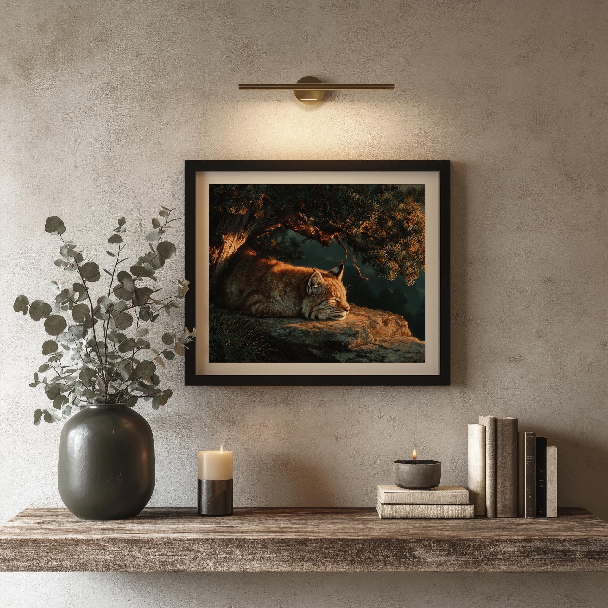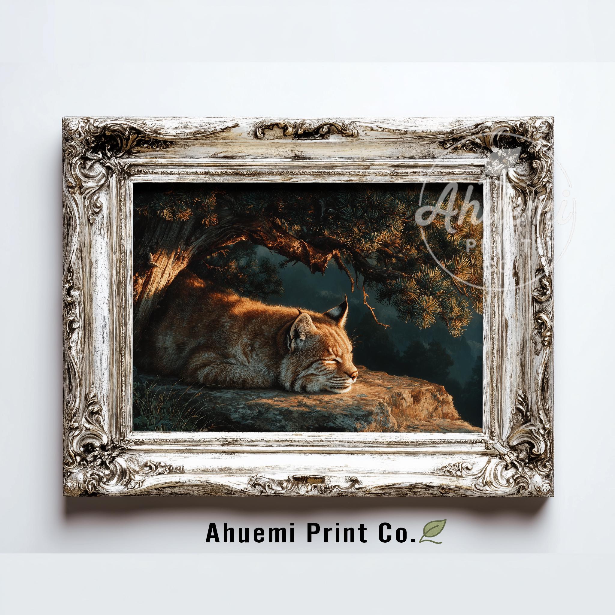 Immerse yourself in the charm with this rustic painting of a moody bobcat resting peacefully amidst the tranquil forest scenery. An instantly downloadable print, it's perfect for elevating your decor with budget-friendly charm. This gives you the flexibility to customize the size, frame, and material according to your personal taste and space, ensuring a perfect fit for your walls.