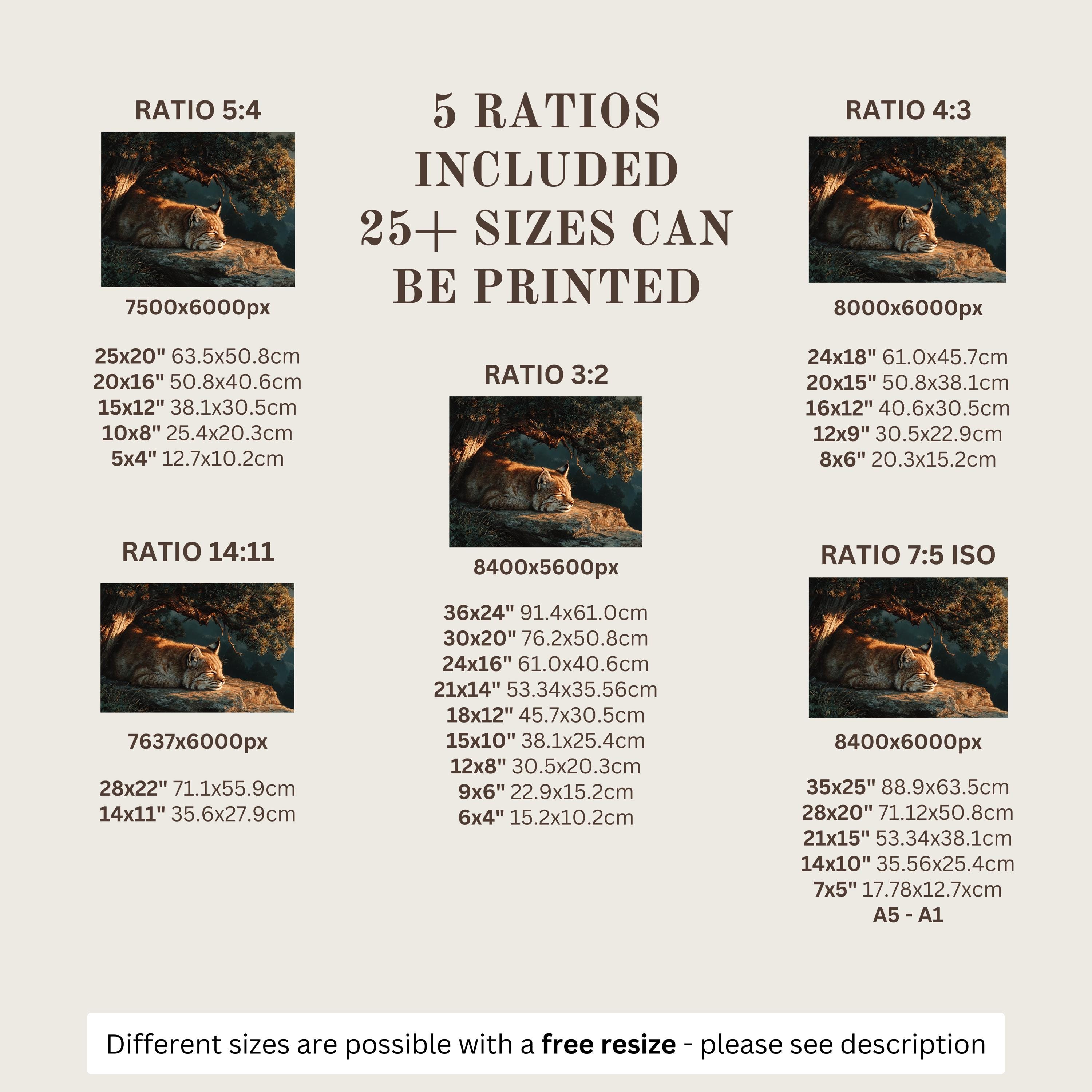 Each artwork includes 5 aspect ratios with 25+ print sizes. Most standard frames are covered. One custom resize per purchase available—message before ordering.