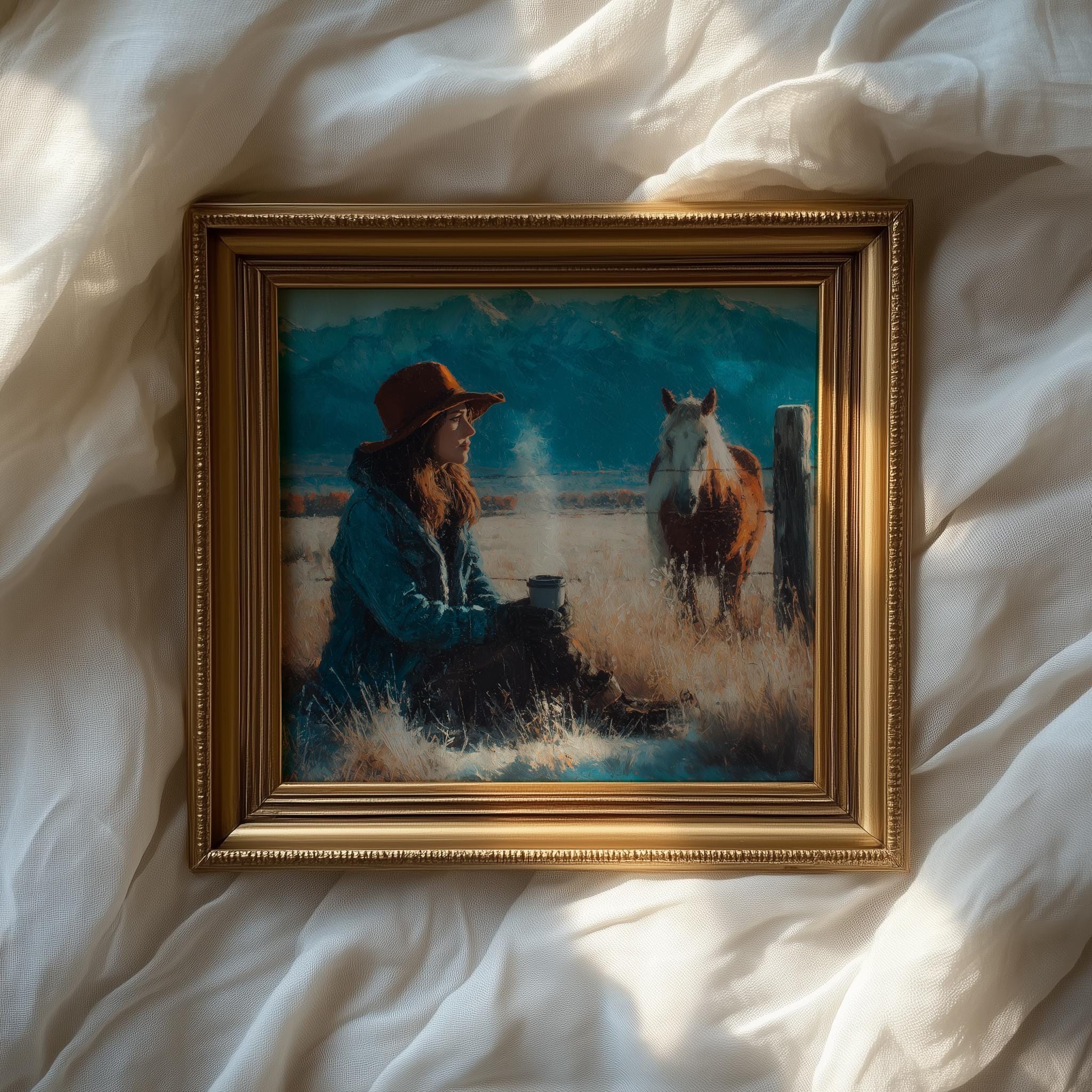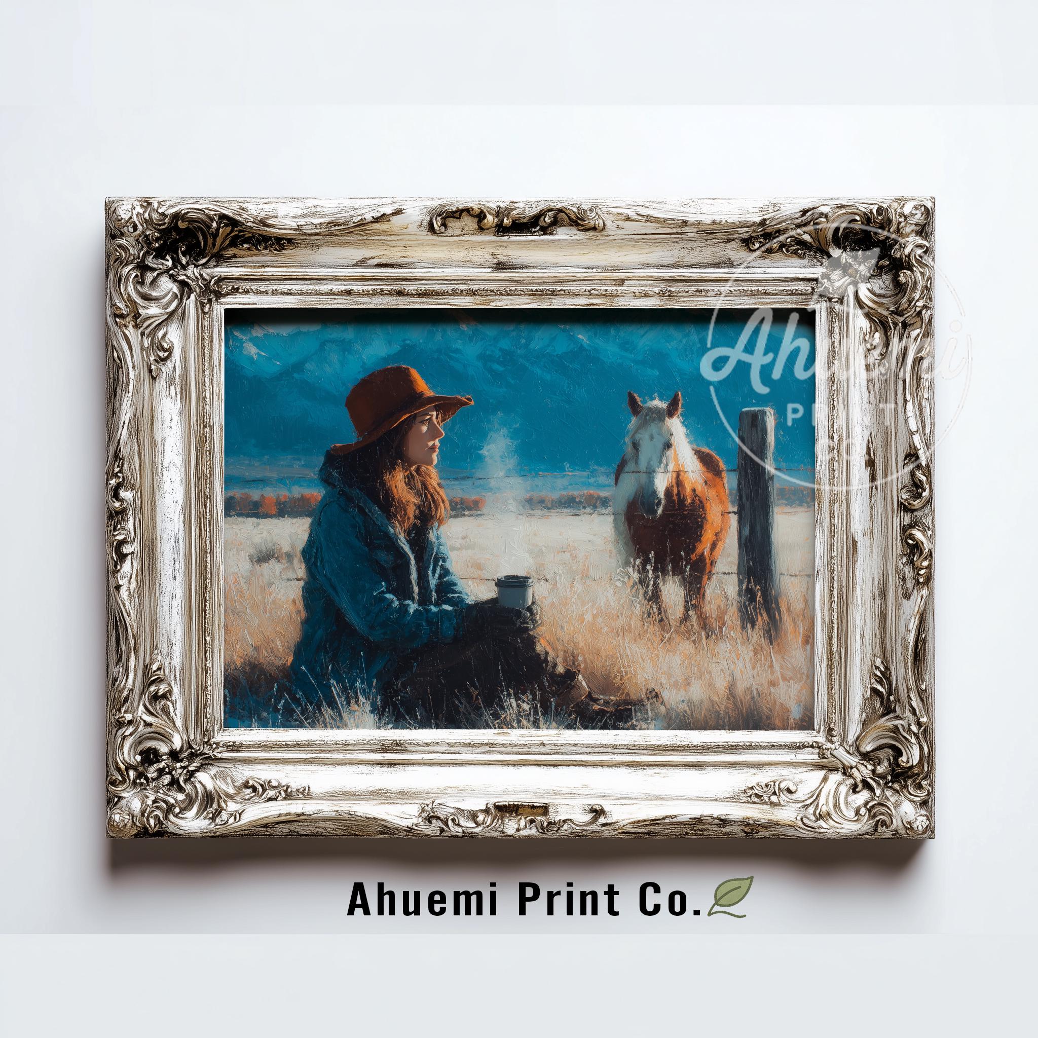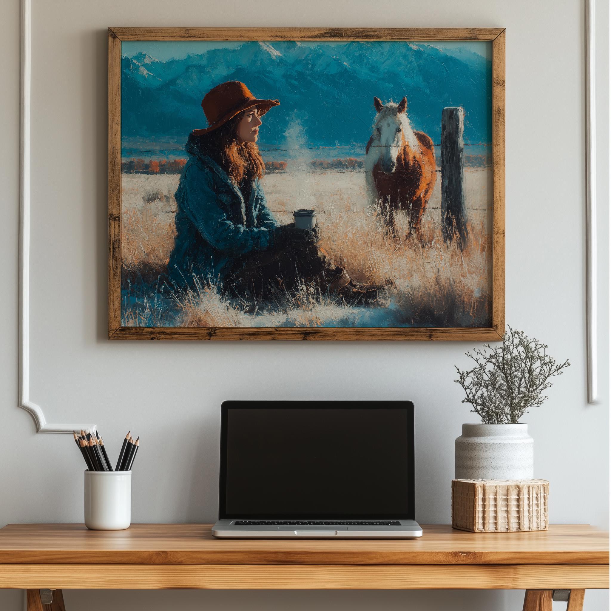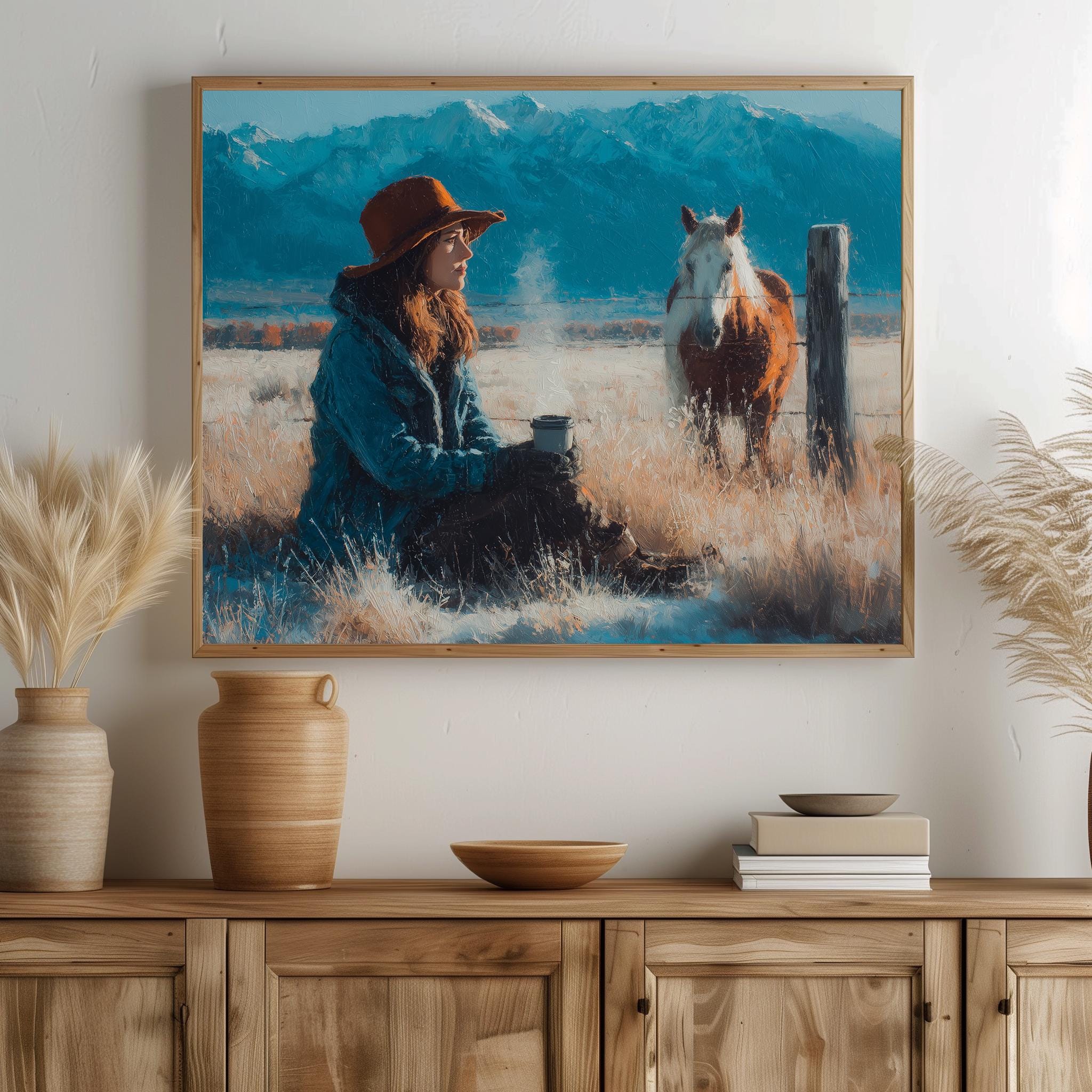 Immerse yourself in the charm with this rustic painting of a cowgirl tending to her horse in a frosty field. An instantly downloadable print, it's perfect for elevating your decor with budget-friendly charm. This gives you the flexibility to customize the size, frame, and material according to your personal taste and space, ensuring a perfect fit for your walls.