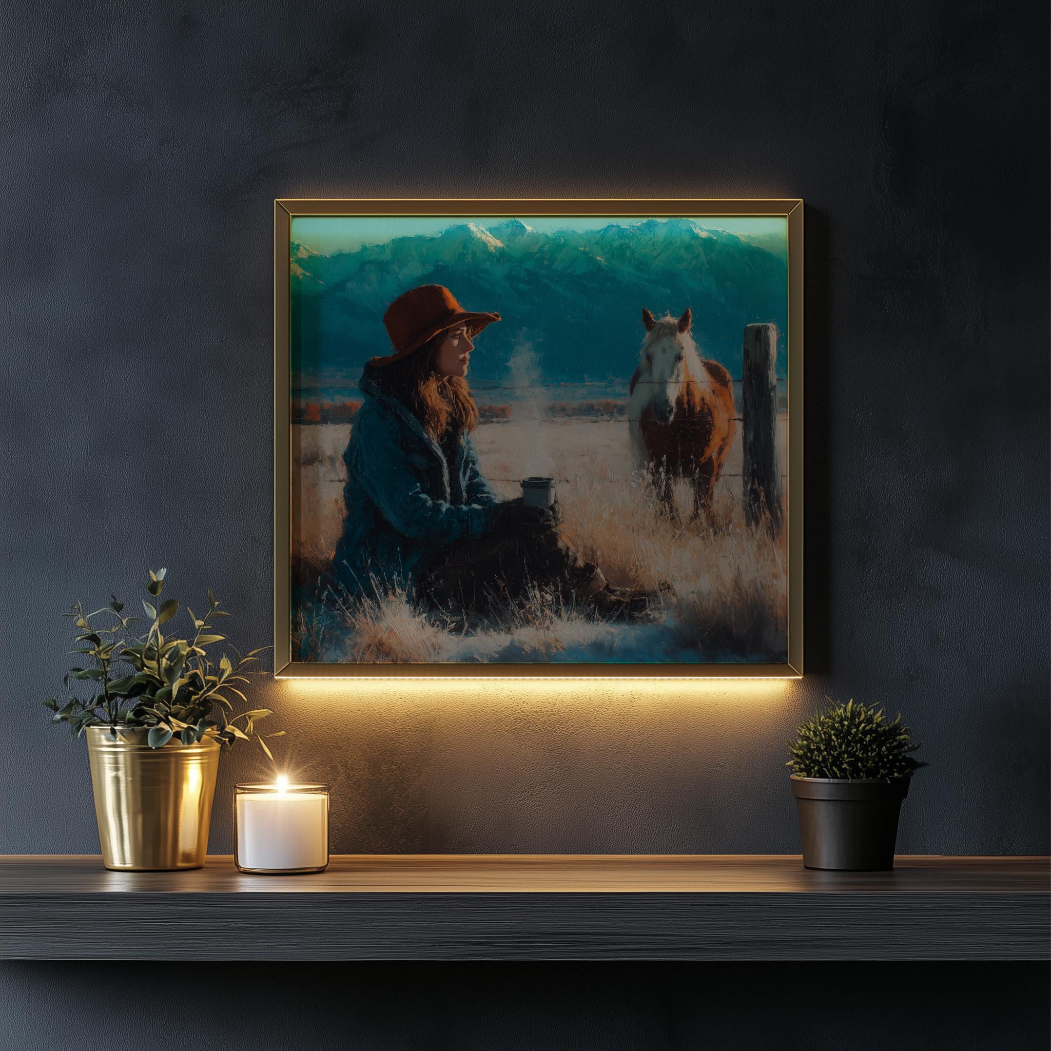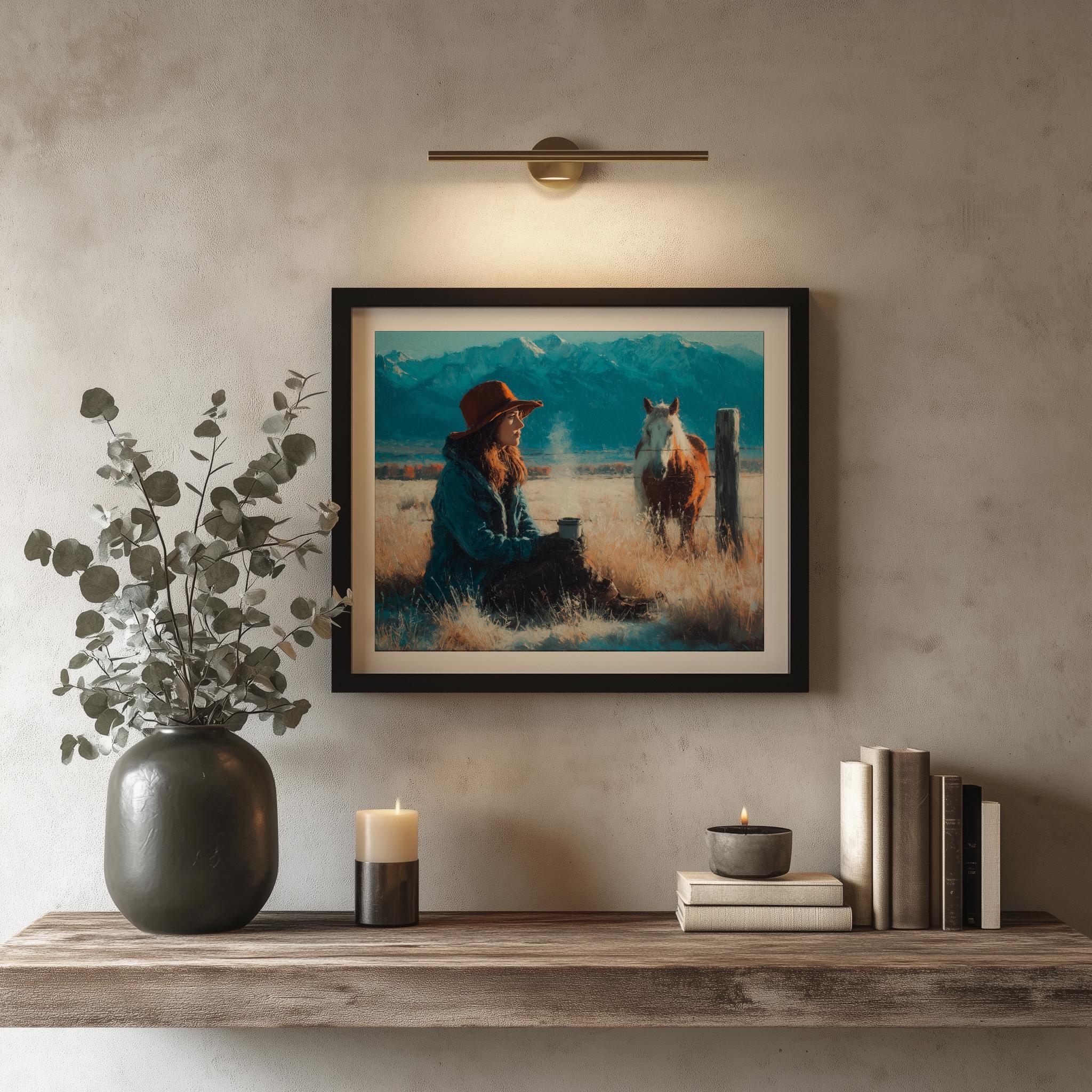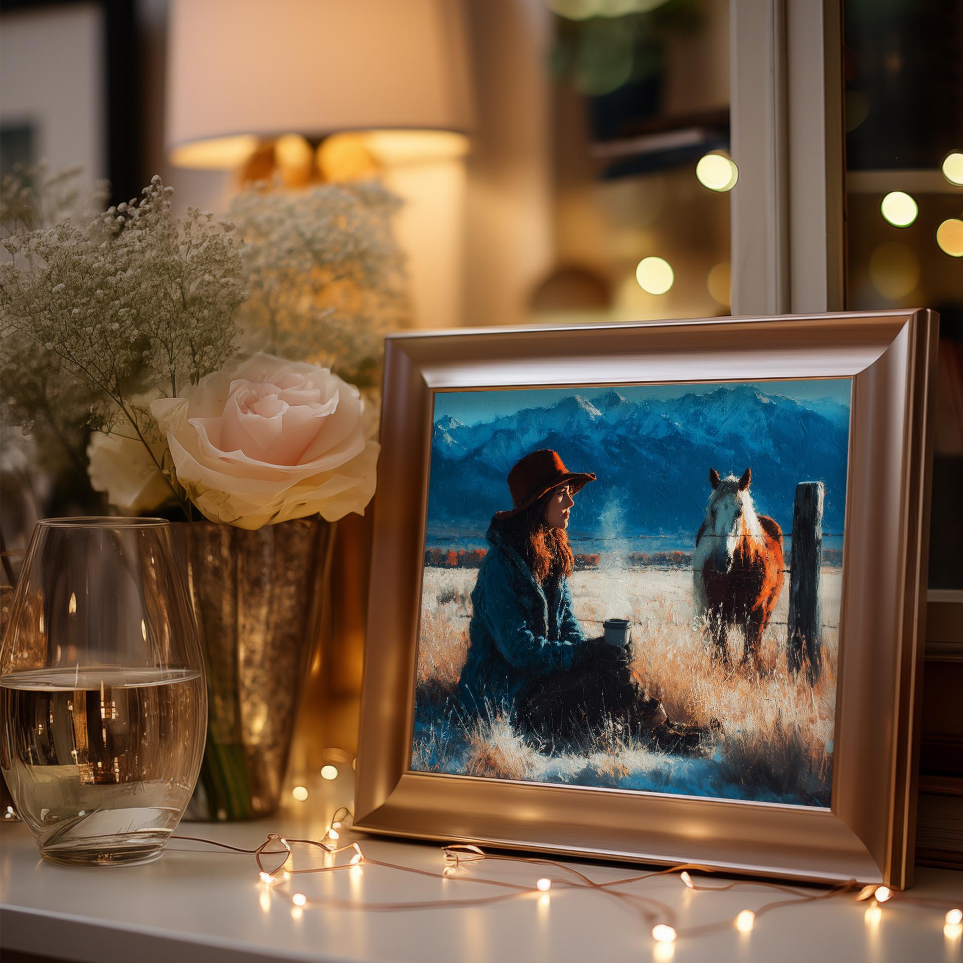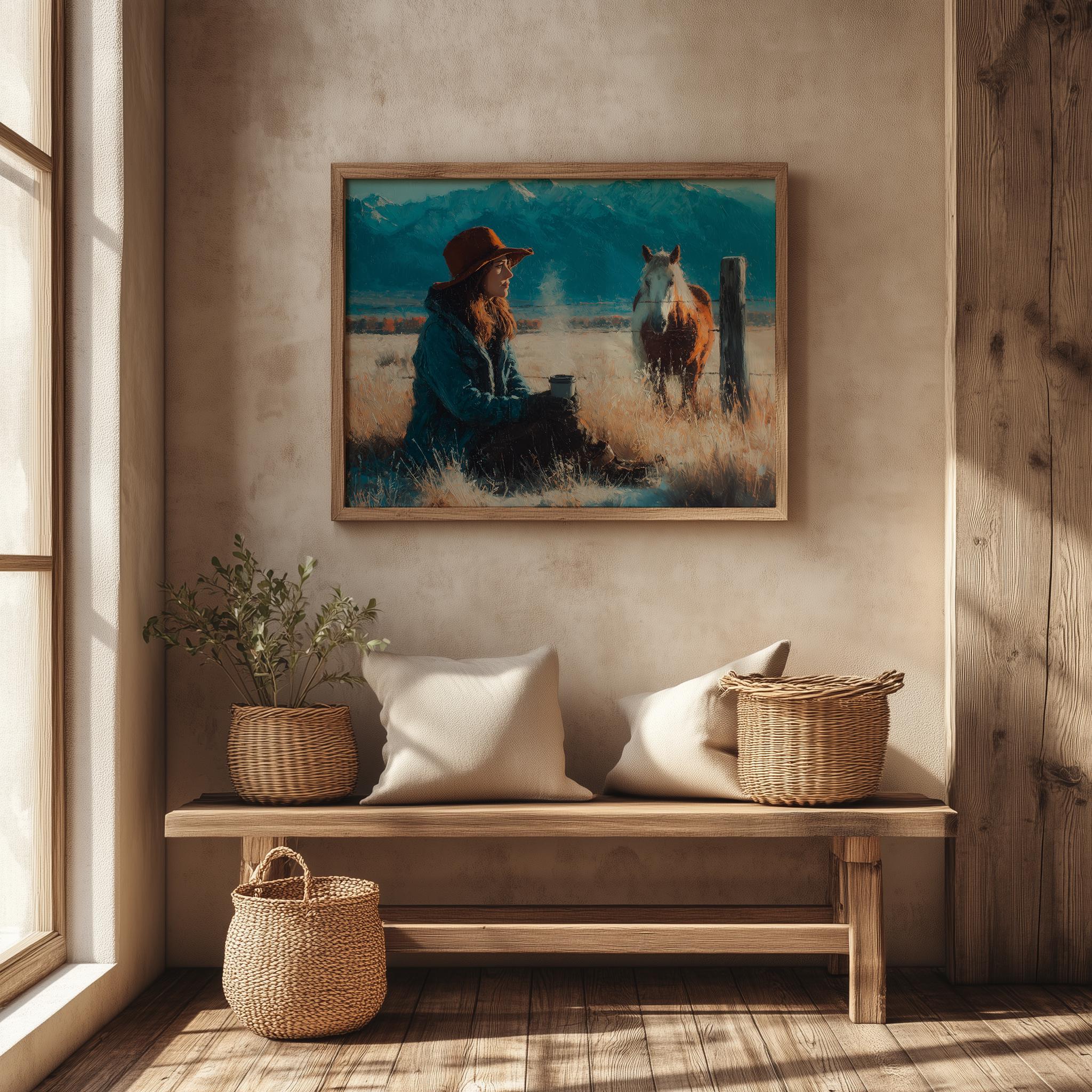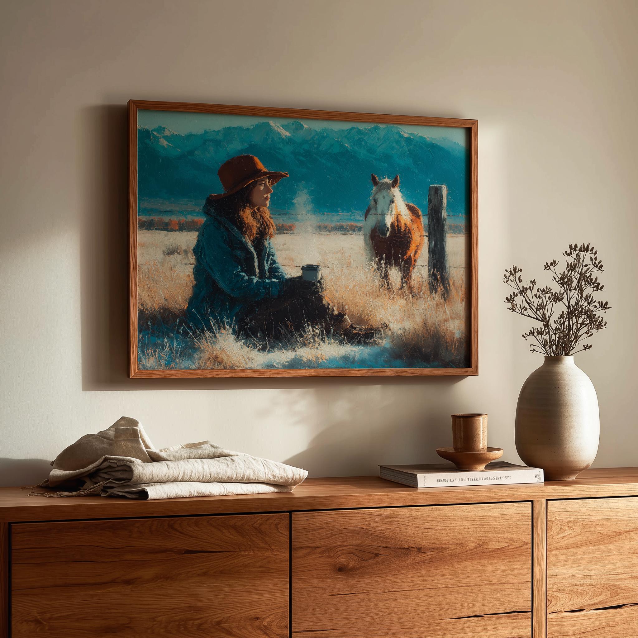 Immerse yourself in the charm with this rustic painting of a cowgirl tending to her horse in a frosty field. An instantly downloadable print, it's perfect for elevating your decor with budget-friendly charm. This gives you the flexibility to customize the size, frame, and material according to your personal taste and space, ensuring a perfect fit for your walls.
