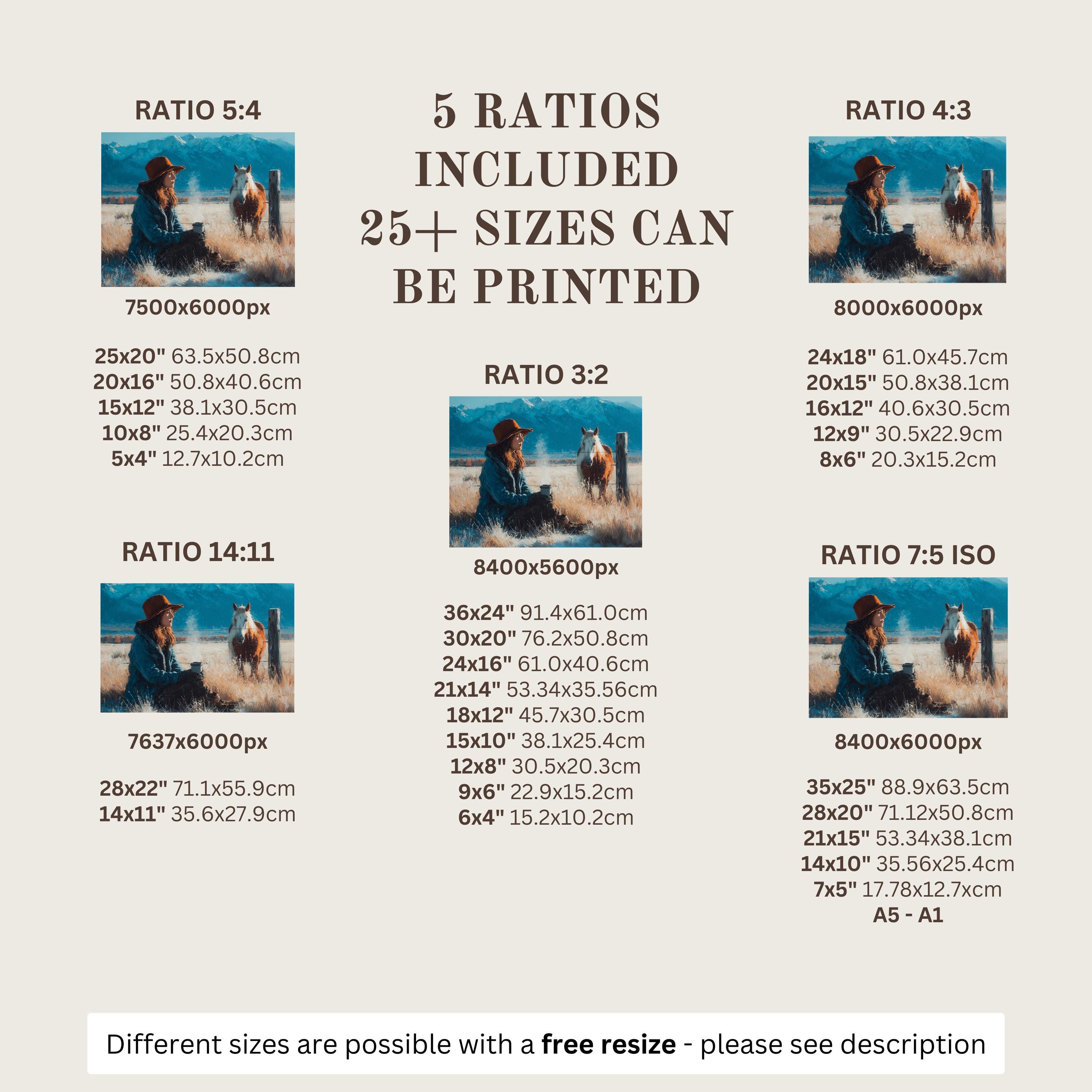 Each artwork includes 5 aspect ratios with 25+ print sizes. Most standard frames are covered. One custom resize per purchase available—message before ordering.