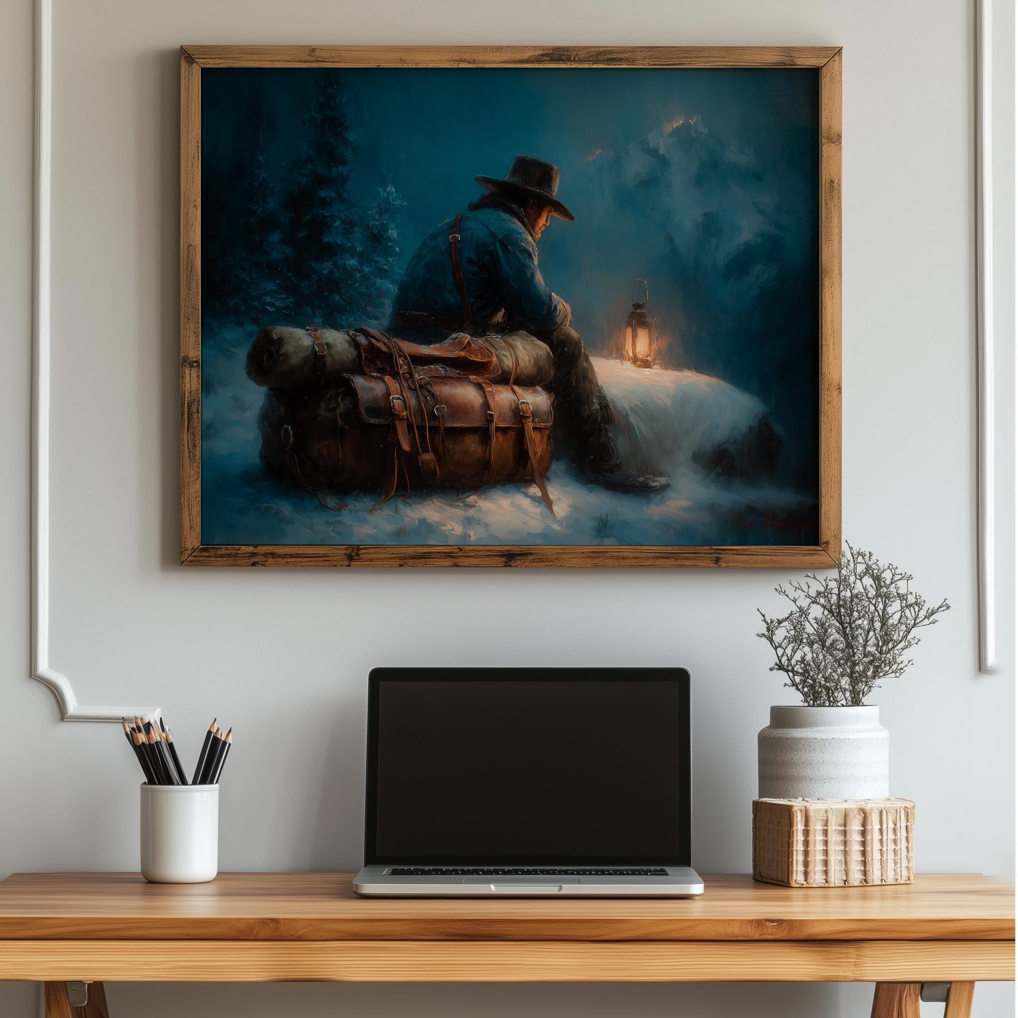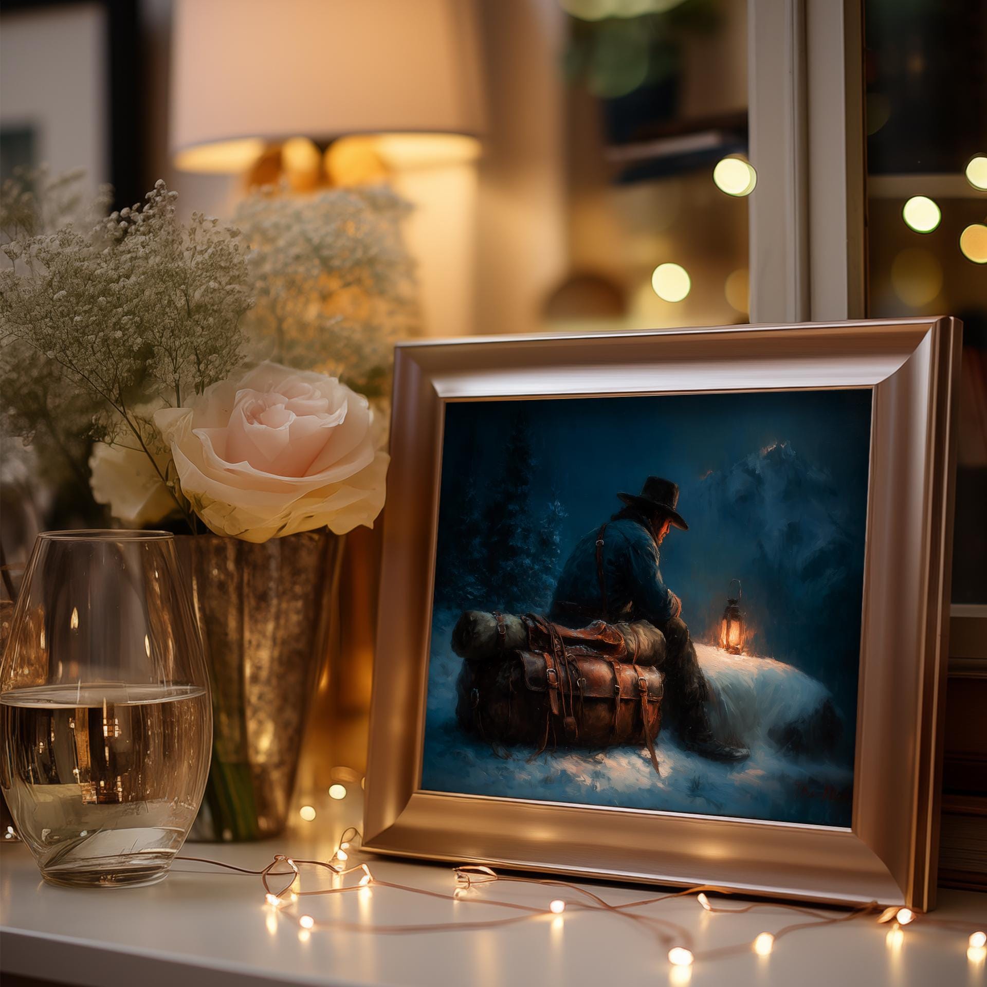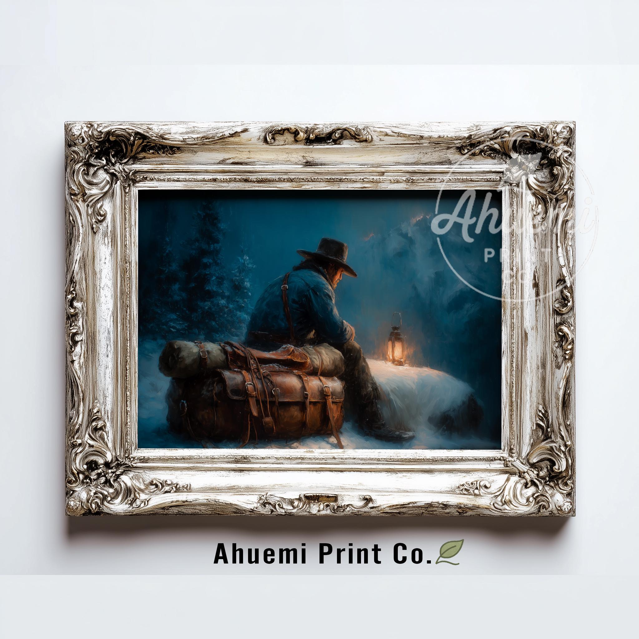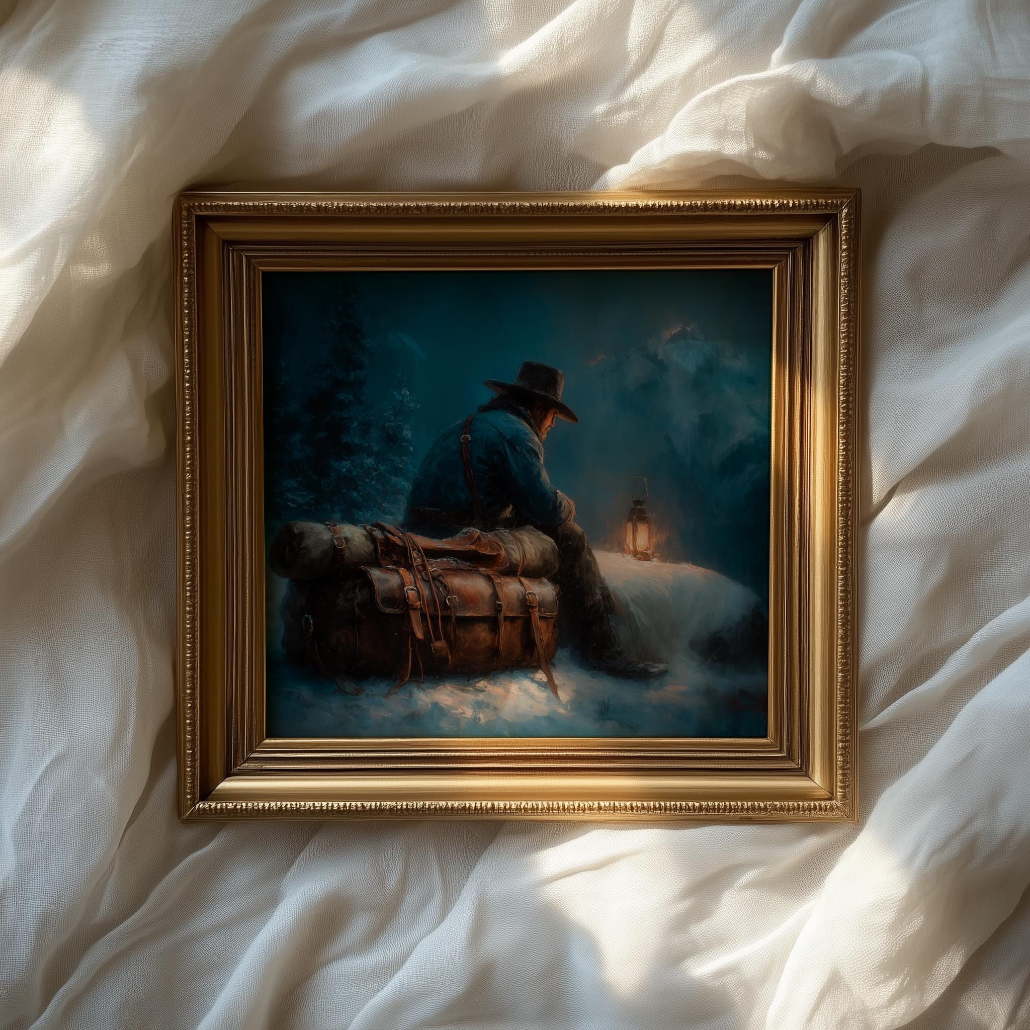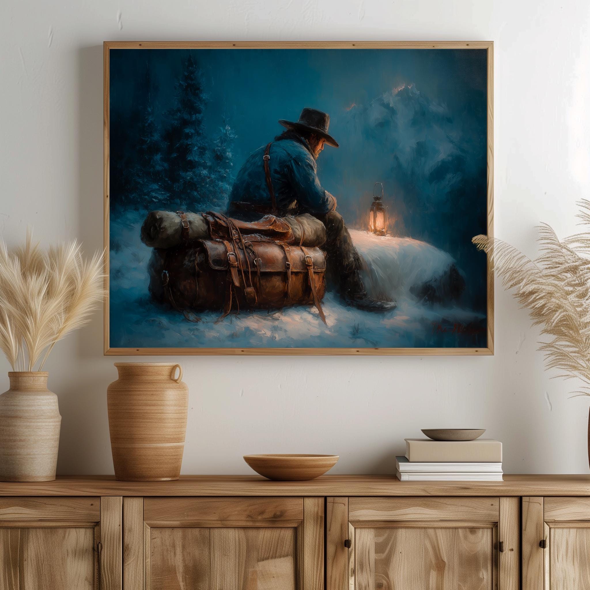 Immerse yourself in the charm with this rustic painting of a solitary cowboy basking in the warm glow of a lantern amidst a serene winter landscape. An instantly downloadable print, it's perfect for elevating your decor with budget-friendly charm. This gives you the flexibility to customize the size, frame, and material according to your personal taste and space, ensuring a perfect fit for your walls.