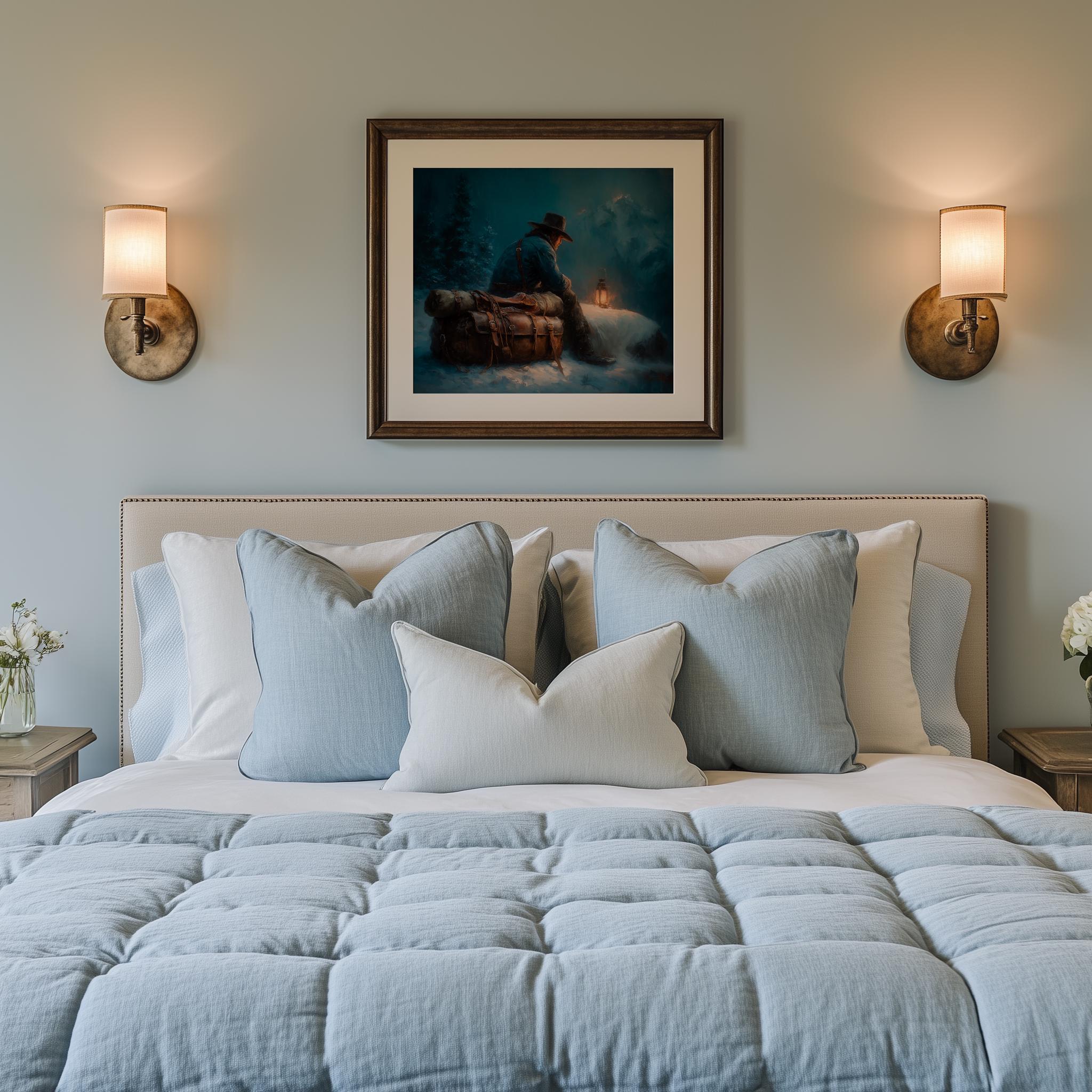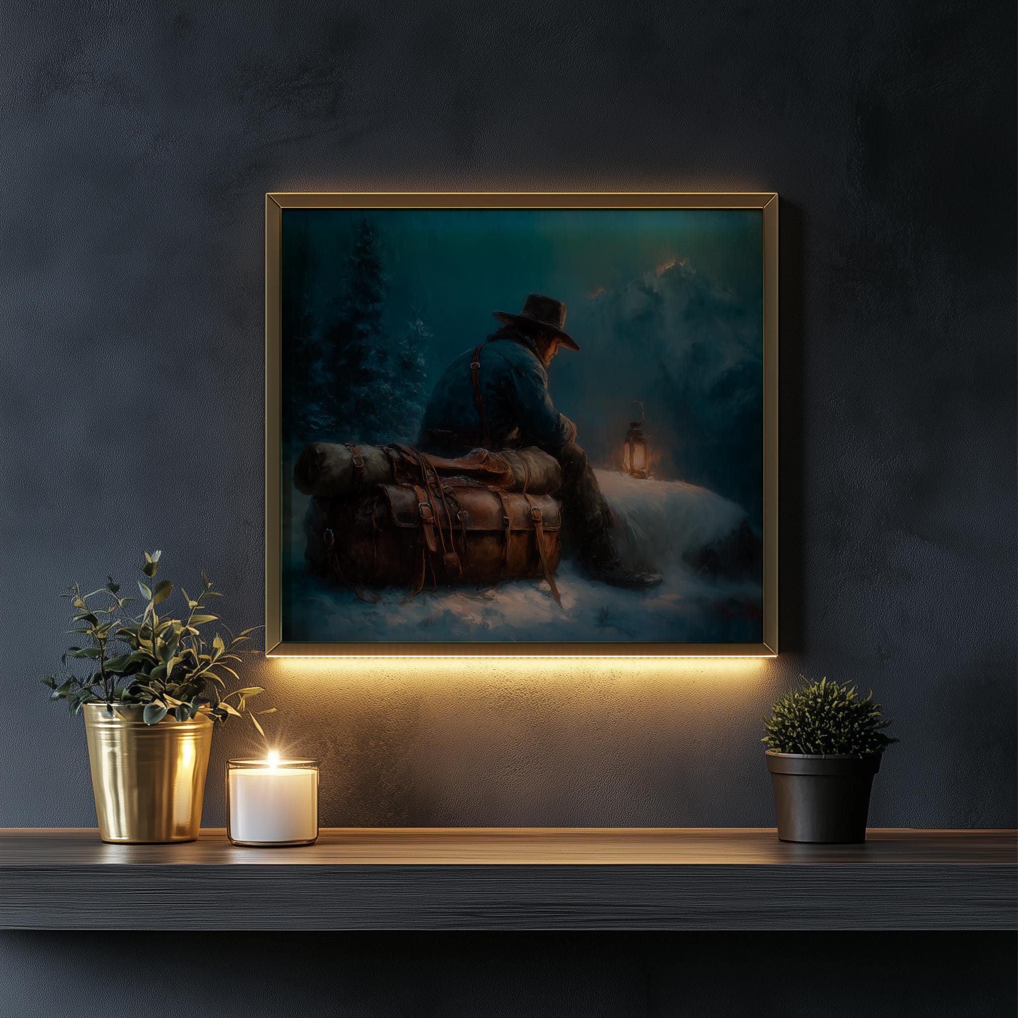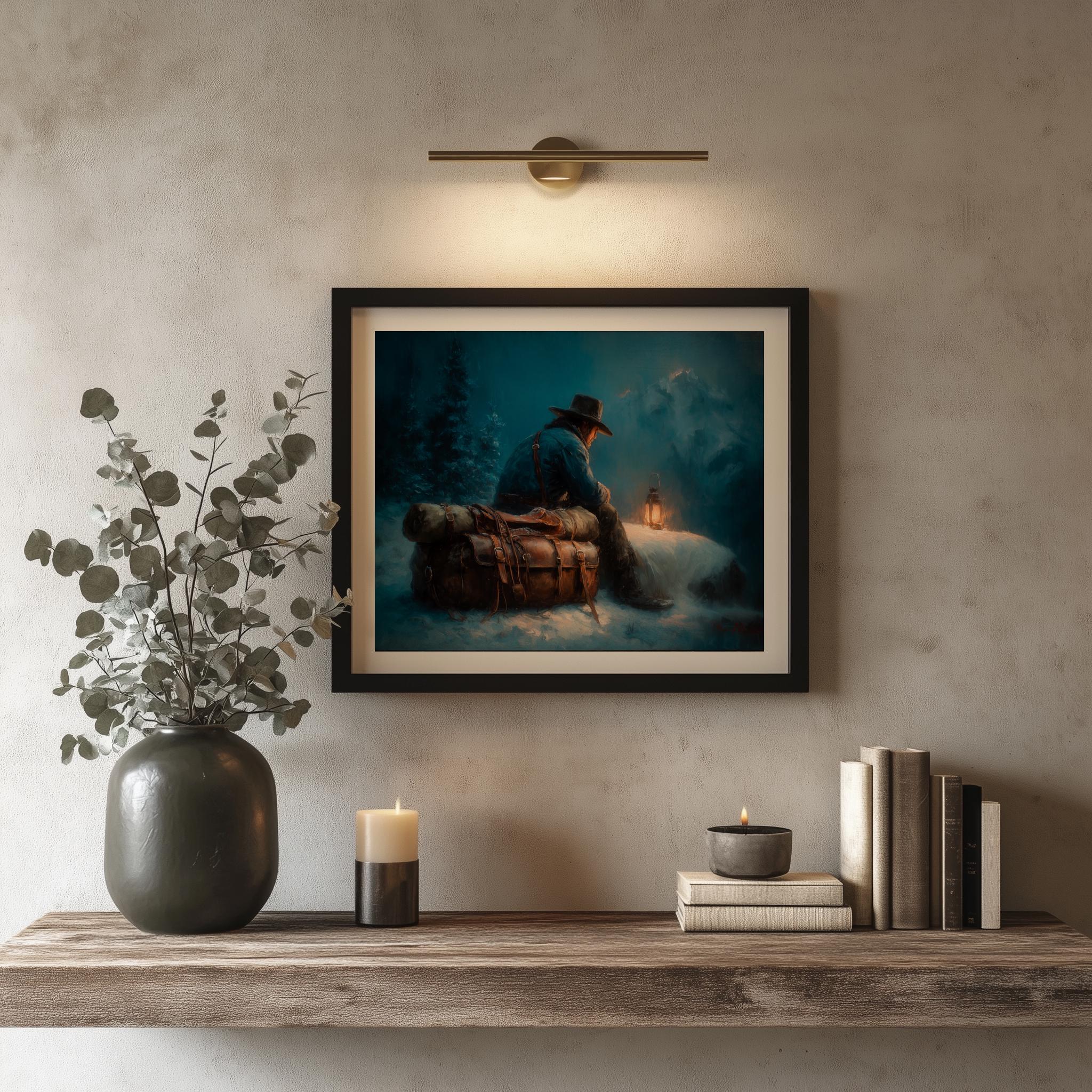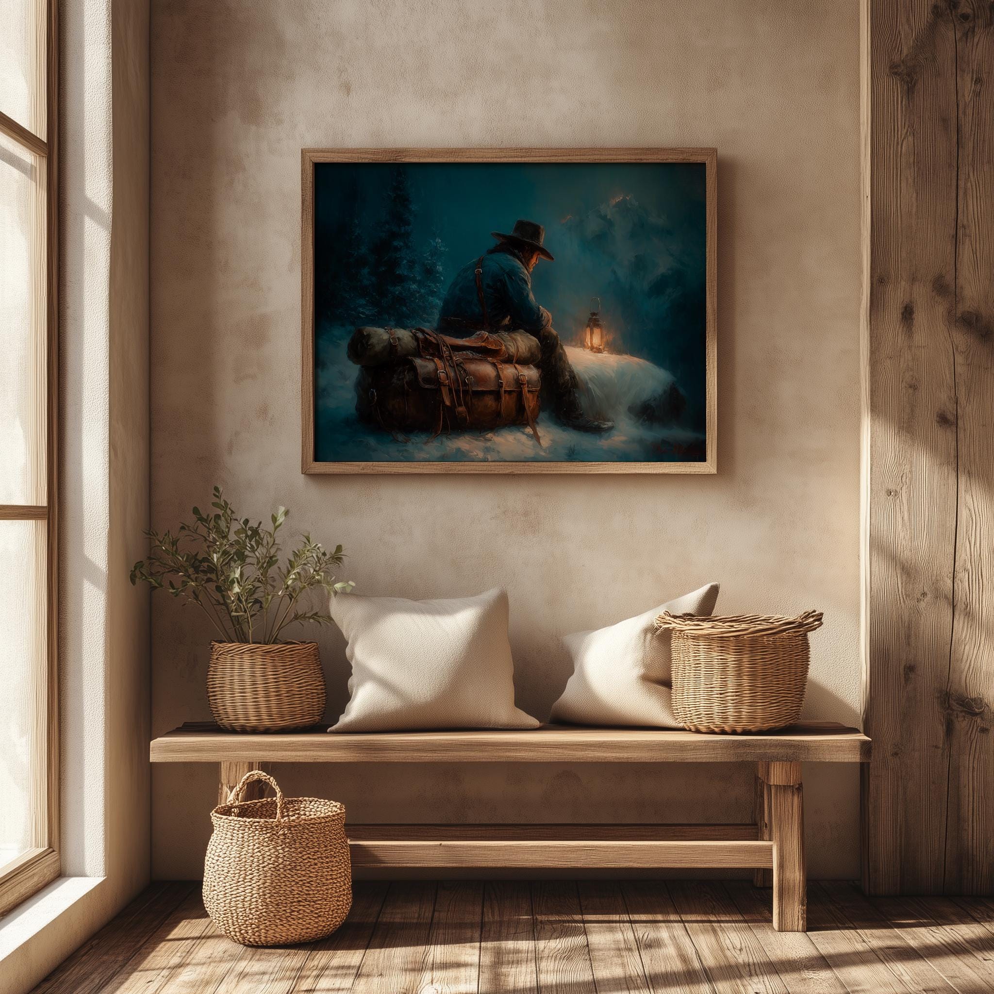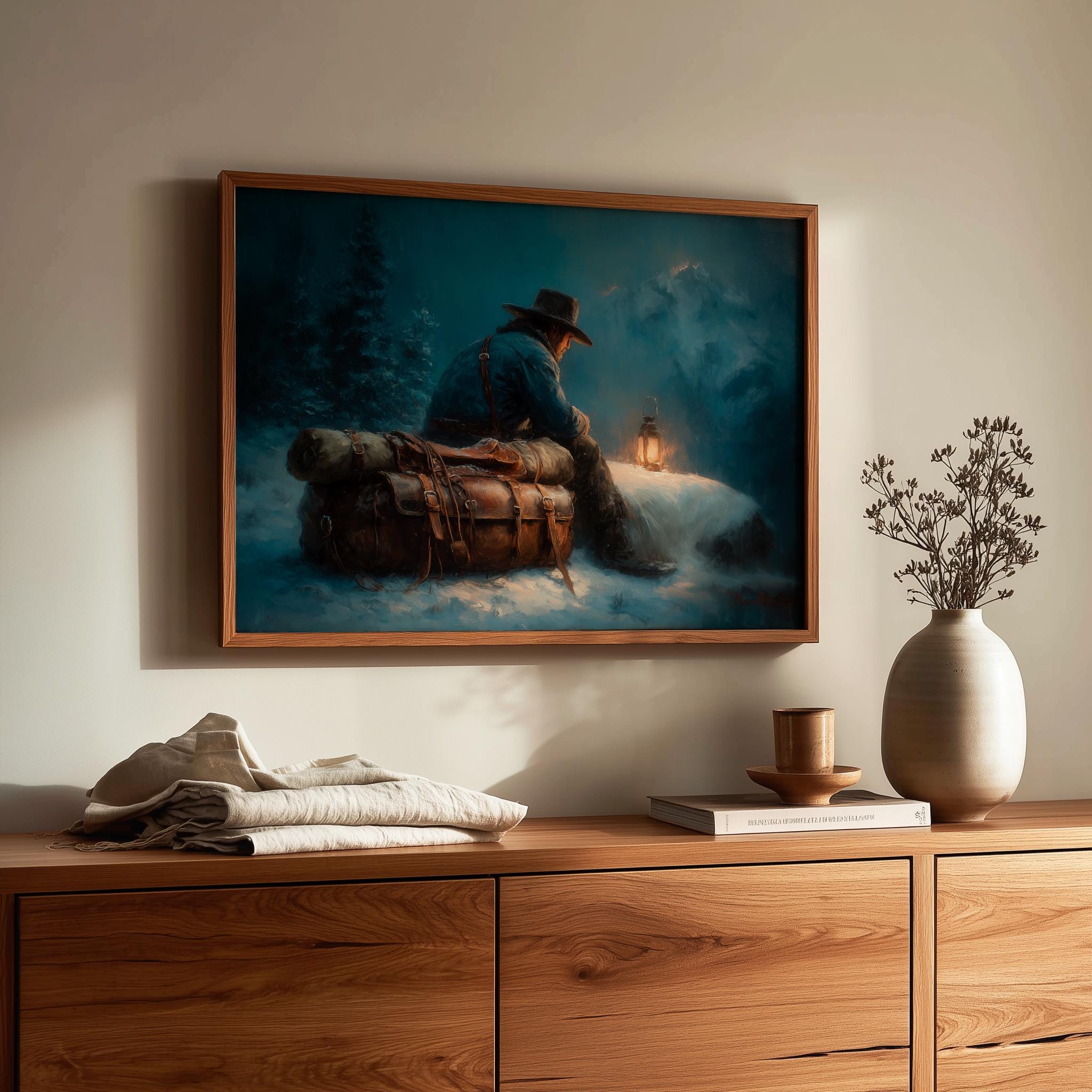 Immerse yourself in the charm with this rustic painting of a solitary cowboy basking in the warm glow of a lantern amidst a serene winter landscape. An instantly downloadable print, it's perfect for elevating your decor with budget-friendly charm. This gives you the flexibility to customize the size, frame, and material according to your personal taste and space, ensuring a perfect fit for your walls.