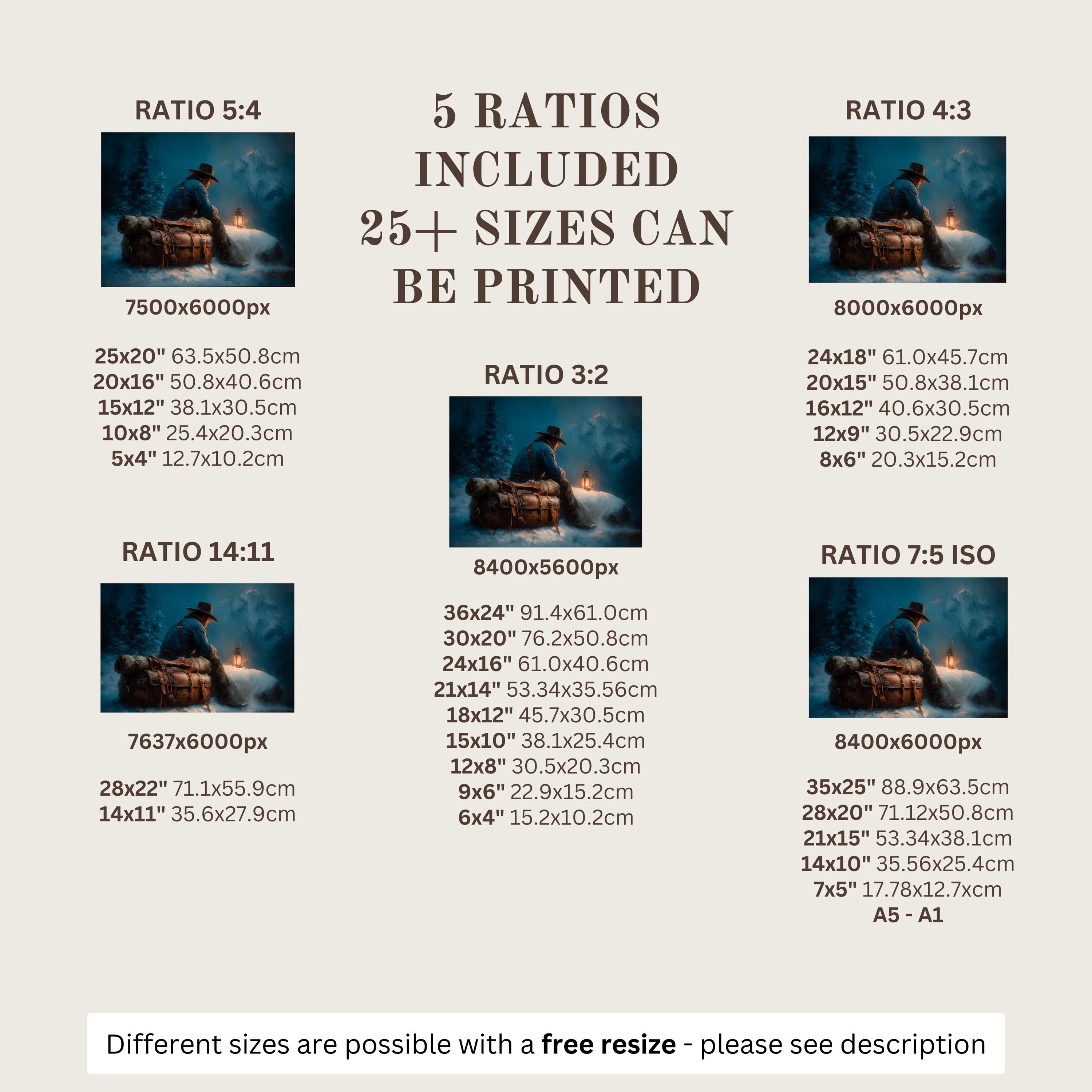 Each artwork includes 5 aspect ratios with 25+ print sizes. Most standard frames are covered. One custom resize per purchase available—message before ordering.