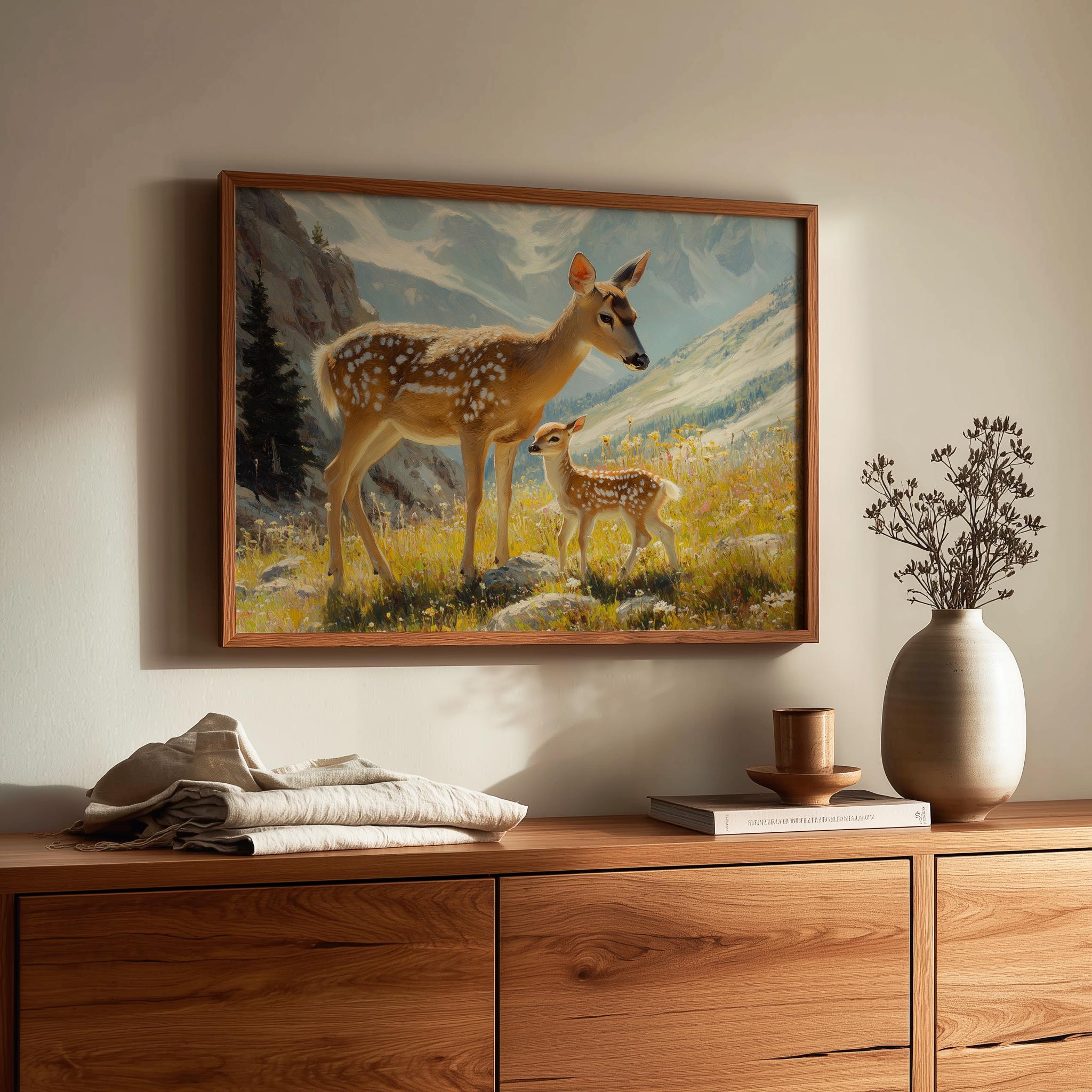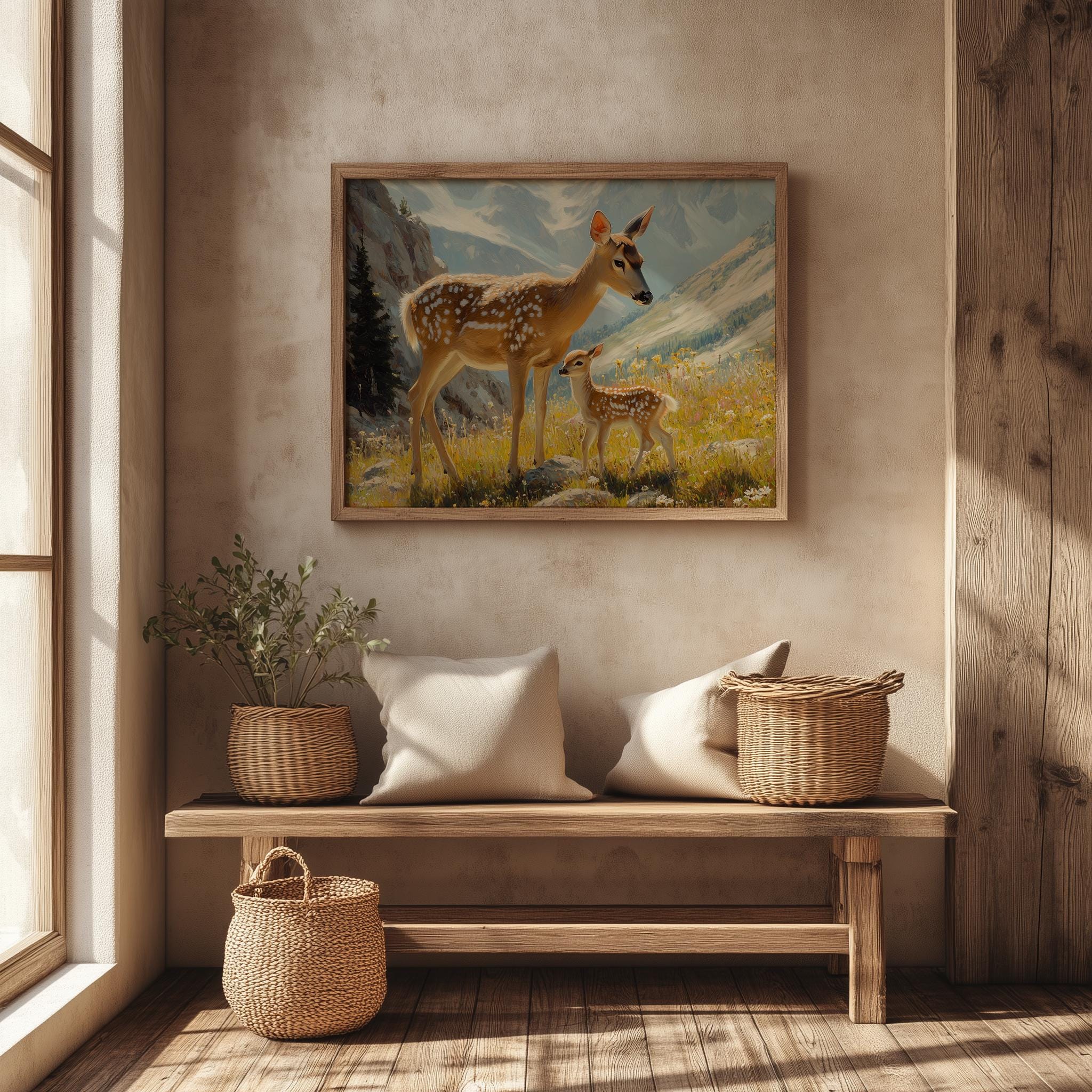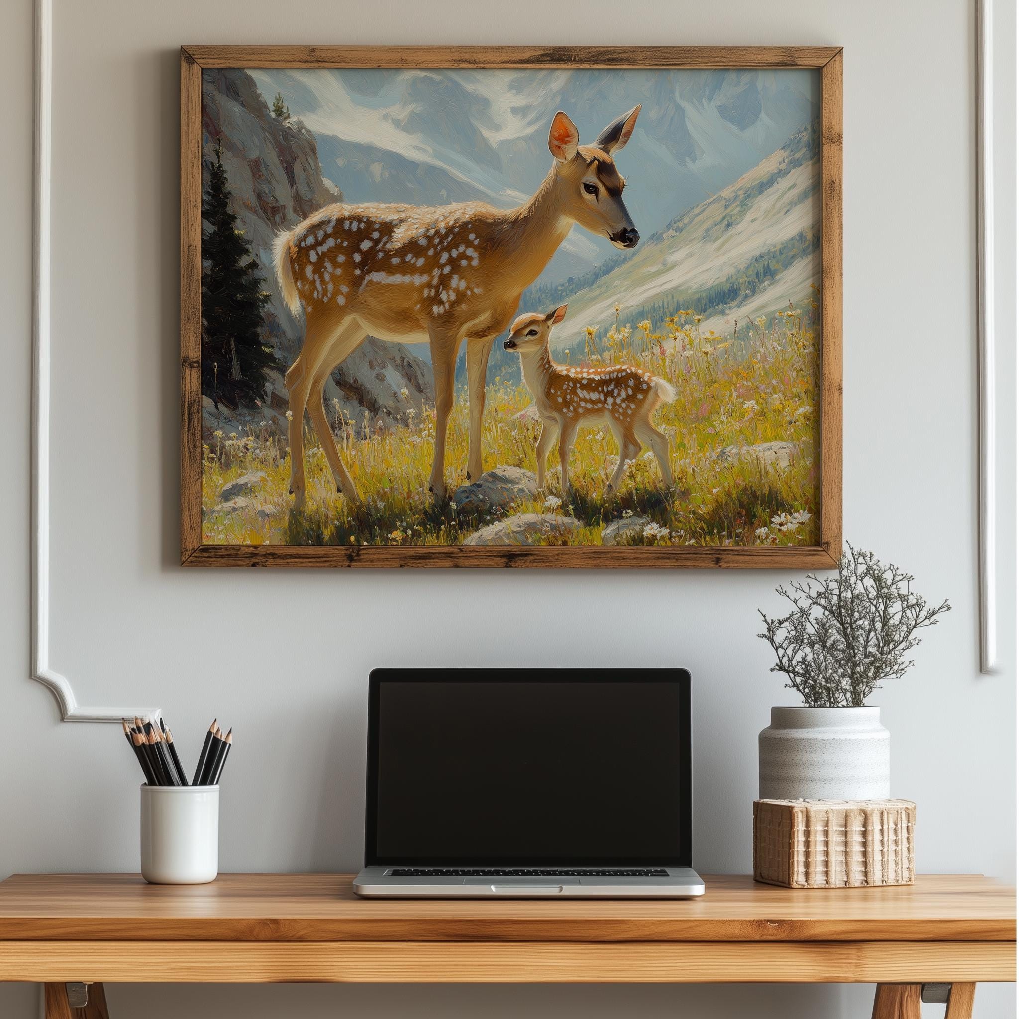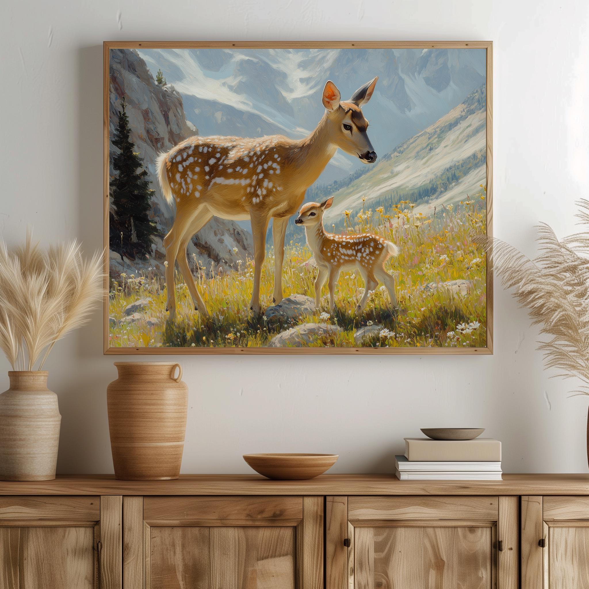 Immerse yourself in the charm with this rustic painting of a gentle mule deer doe and her playful fawn. An instantly downloadable print, it's perfect for elevating your decor with budget-friendly charm. This gives you the flexibility to customize the size, frame, and material according to your personal taste and space, ensuring a perfect fit for your walls.