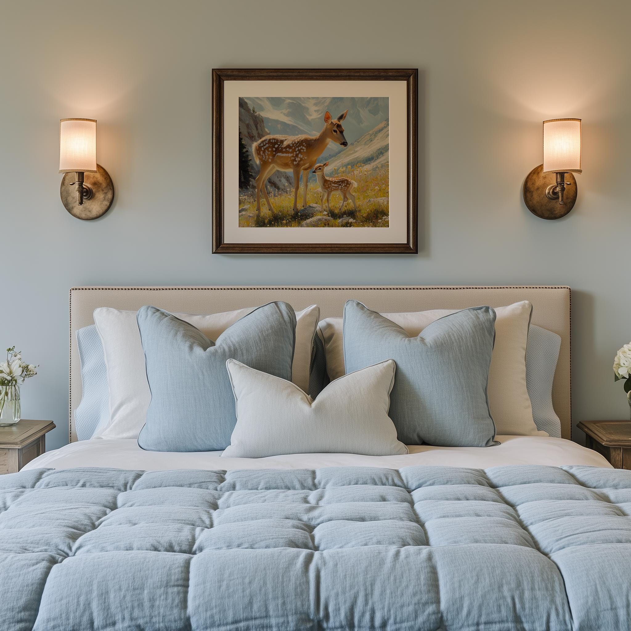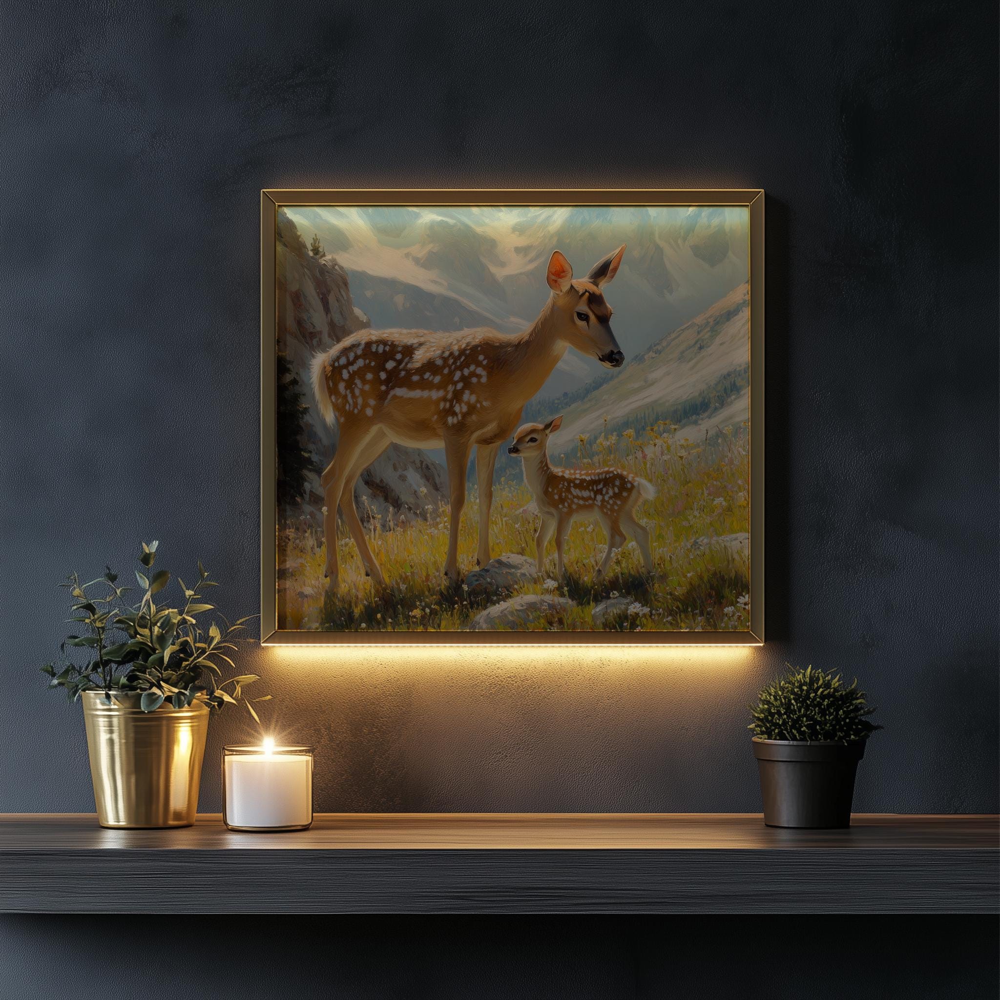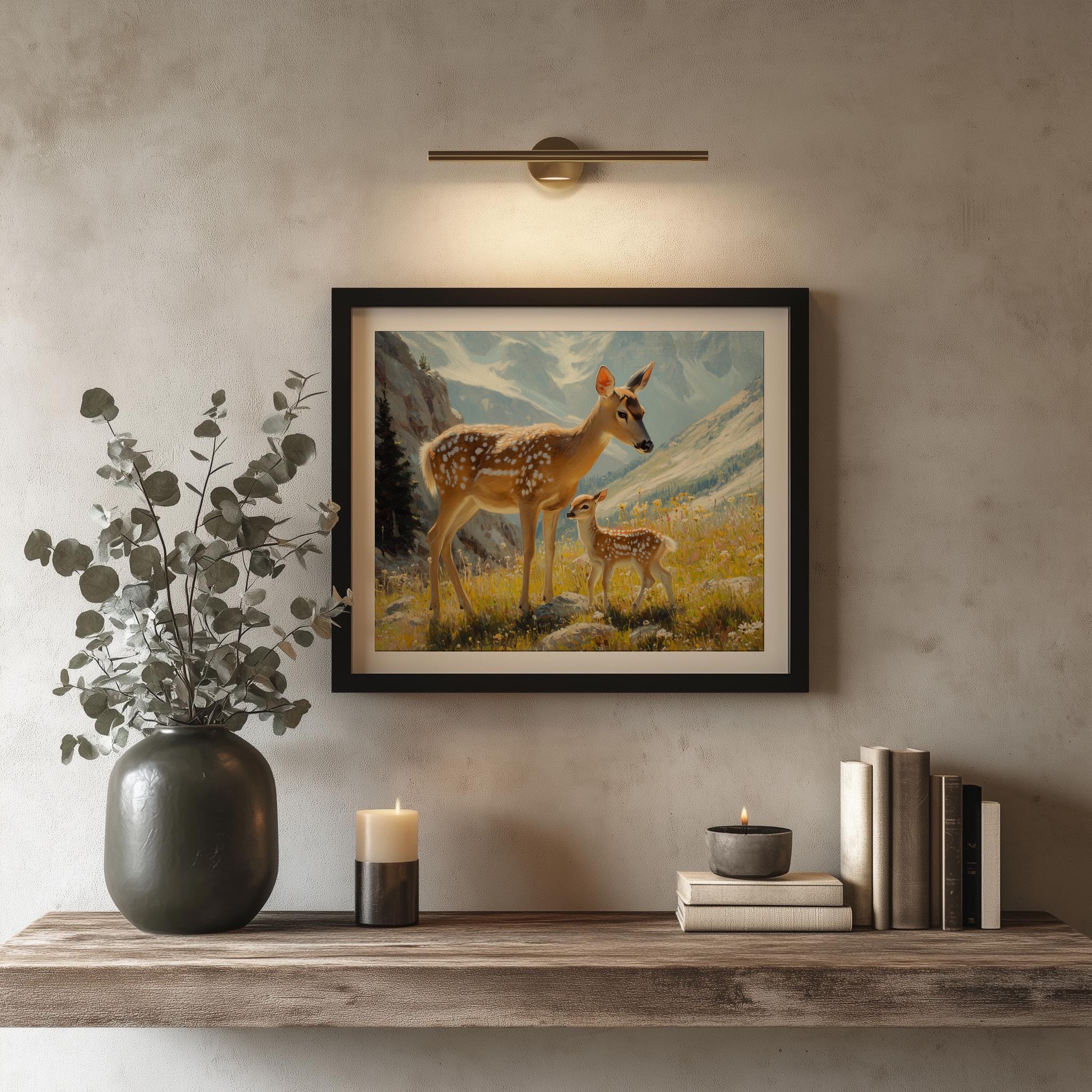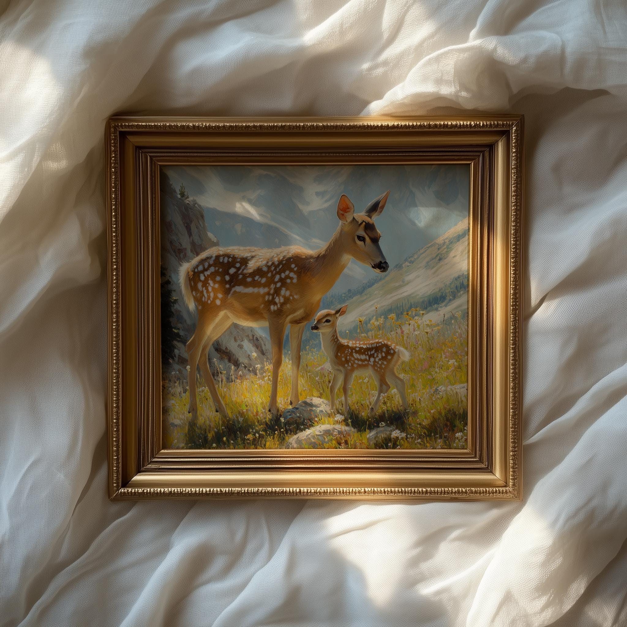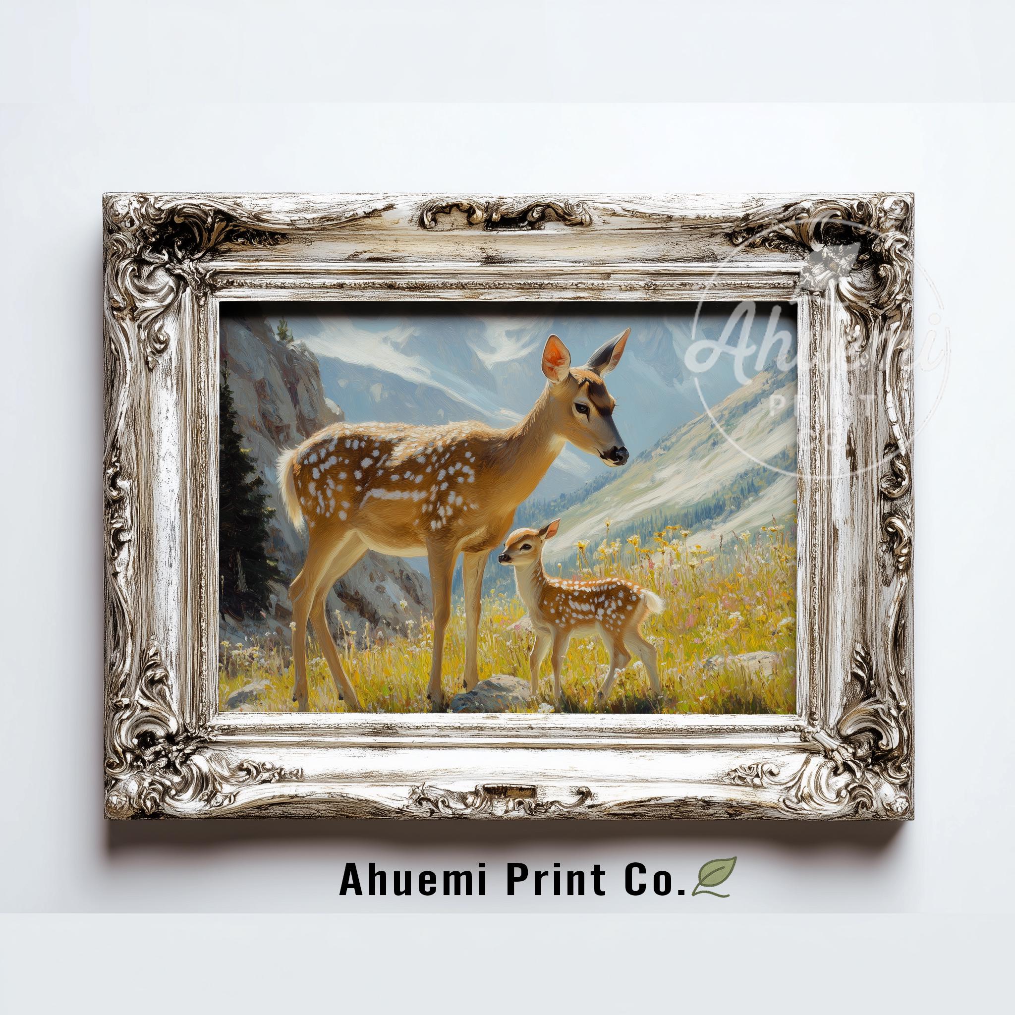 Immerse yourself in the charm with this rustic painting of a gentle mule deer doe and her playful fawn. An instantly downloadable print, it's perfect for elevating your decor with budget-friendly charm. This gives you the flexibility to customize the size, frame, and material according to your personal taste and space, ensuring a perfect fit for your walls.