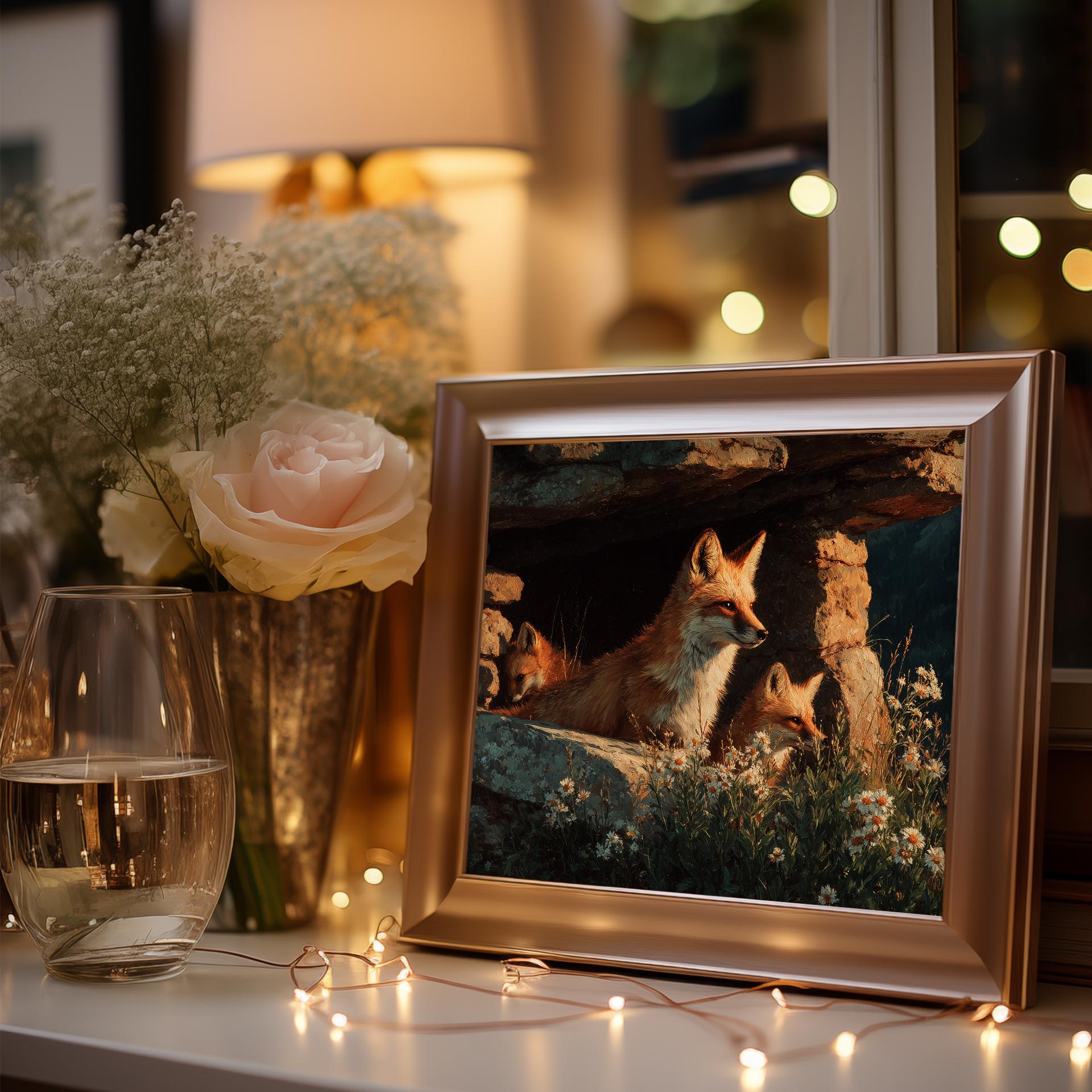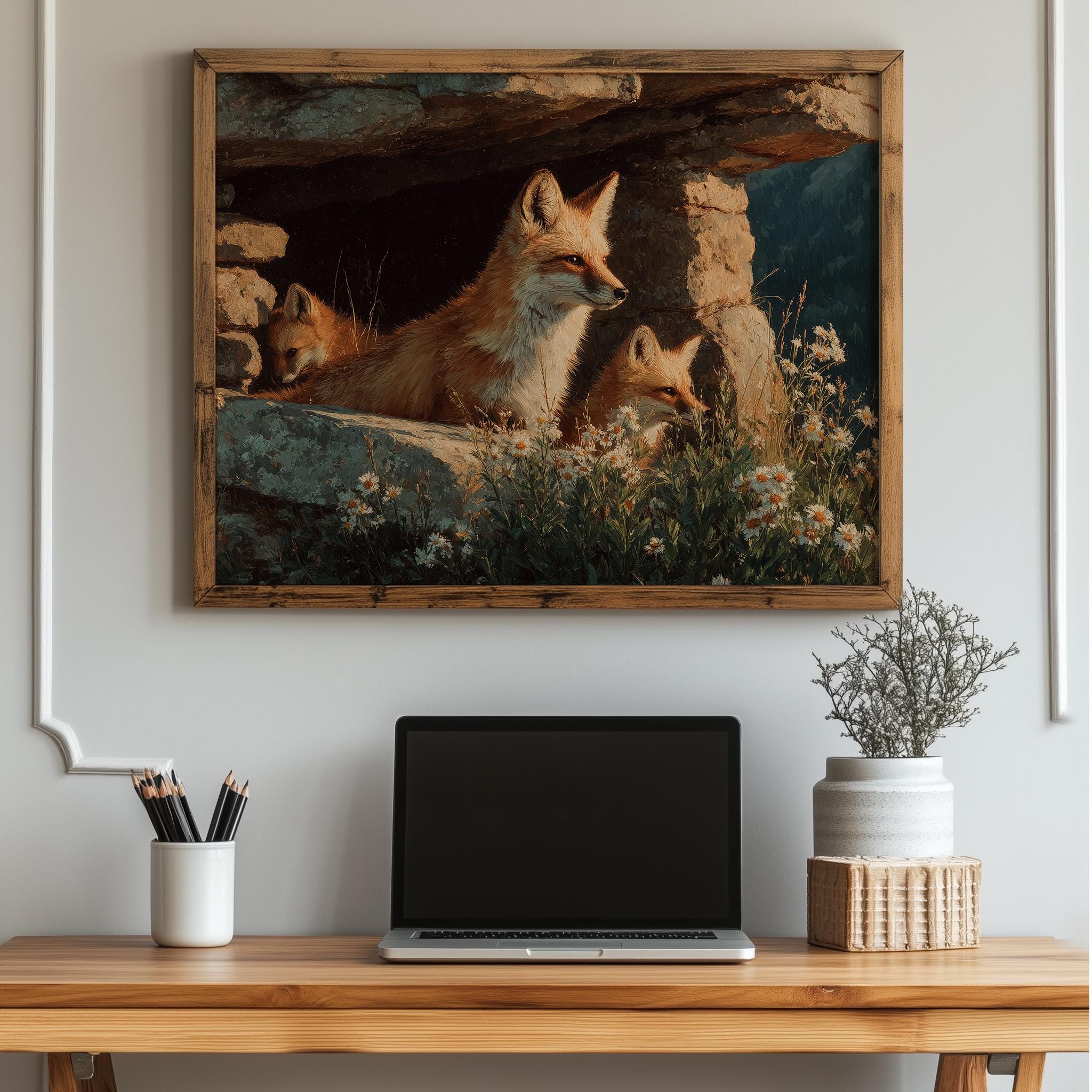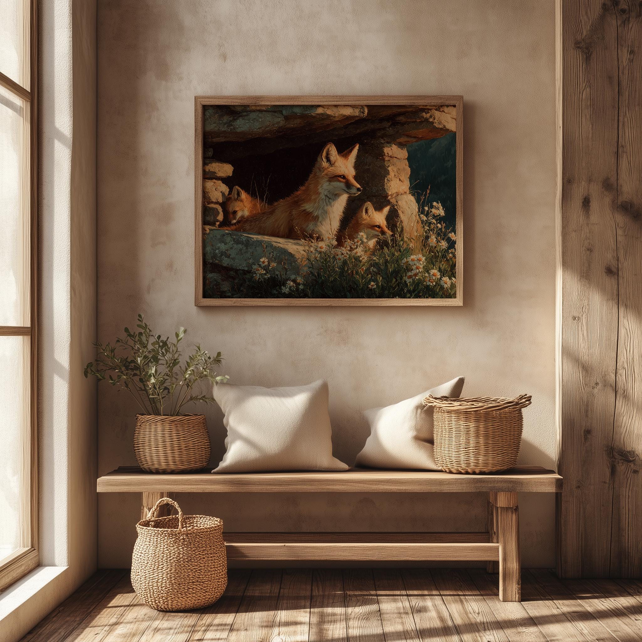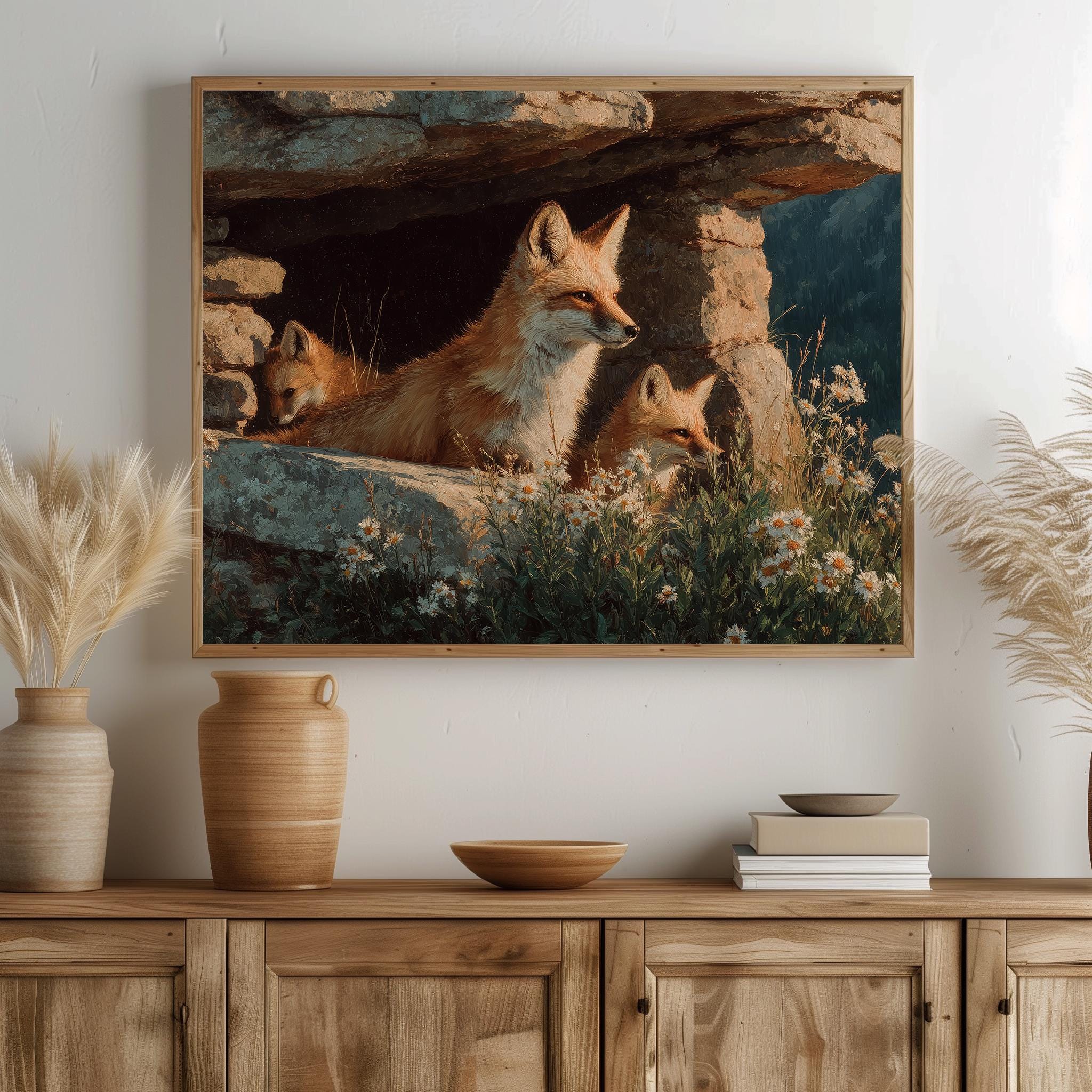 Immerse yourself in the charm with this rustic painting of a family of red foxes in a serene woodland setting. An instantly downloadable print, it's perfect for elevating your decor with budget-friendly charm. This gives you the flexibility to customize the size, frame, and material according to your personal taste and space, ensuring a perfect fit for your walls.
