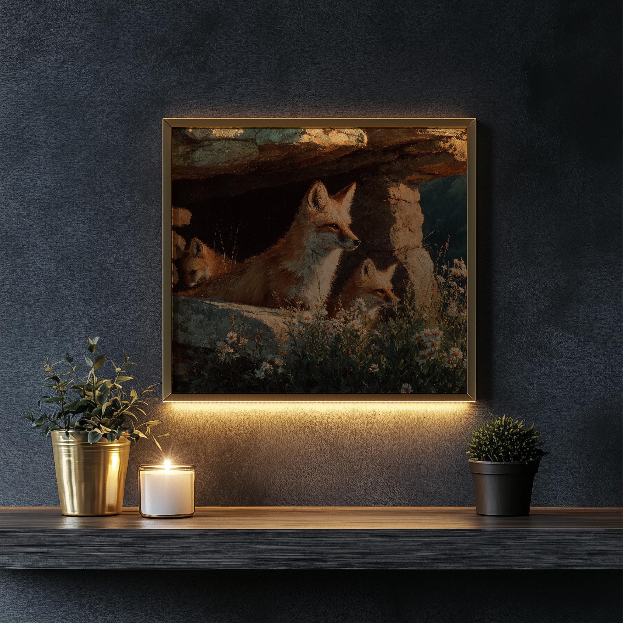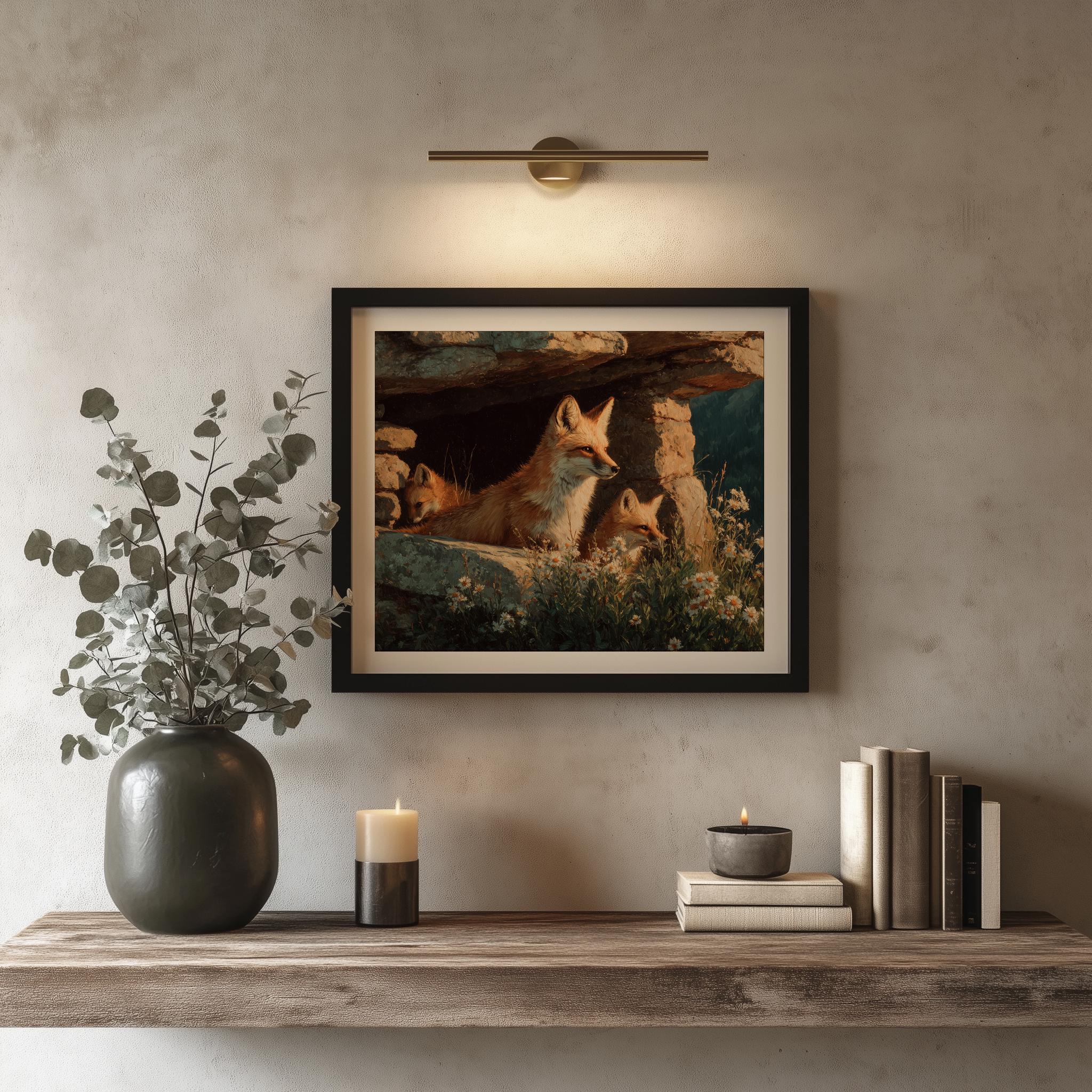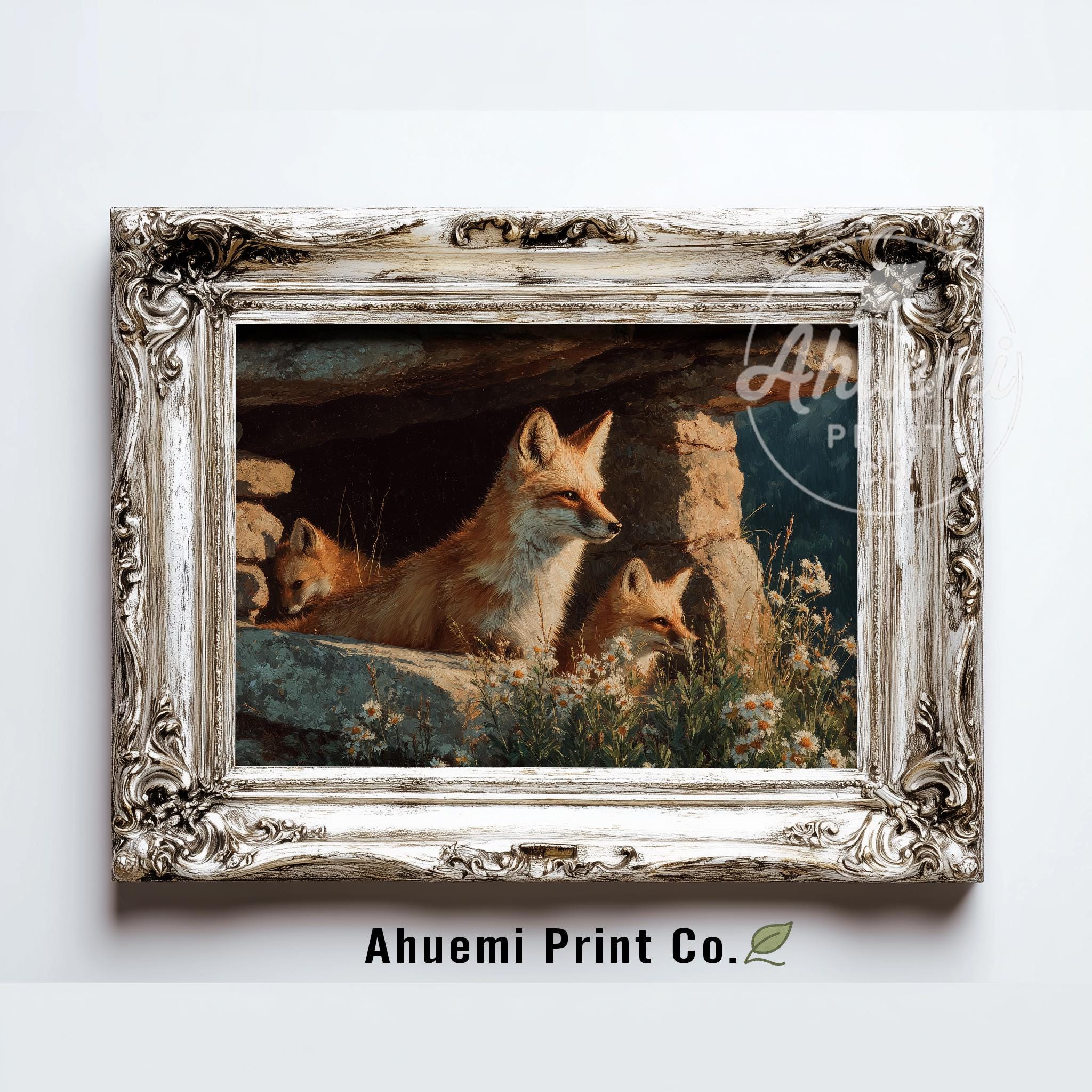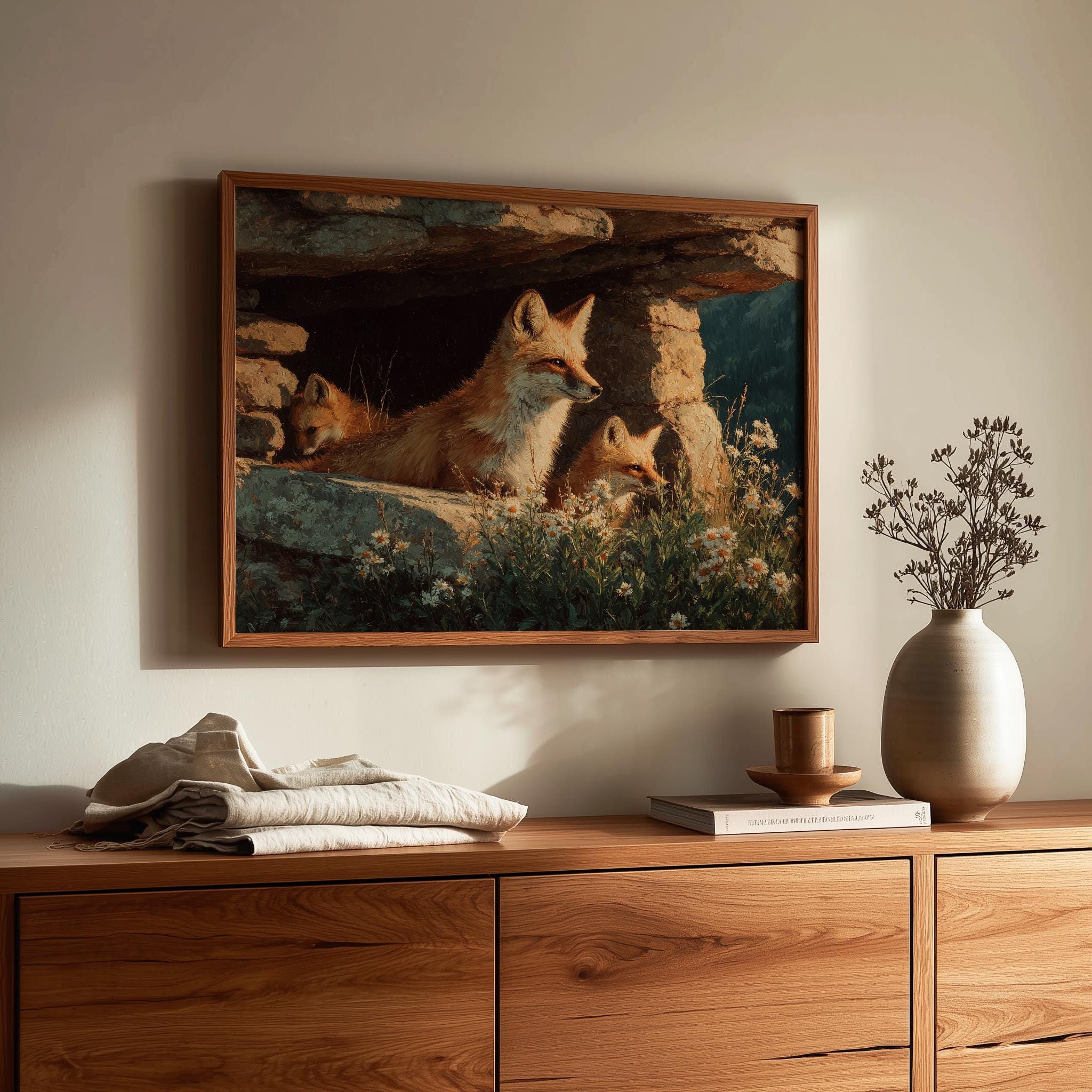 Immerse yourself in the charm with this rustic painting of a family of red foxes in a serene woodland setting. An instantly downloadable print, it's perfect for elevating your decor with budget-friendly charm. This gives you the flexibility to customize the size, frame, and material according to your personal taste and space, ensuring a perfect fit for your walls.