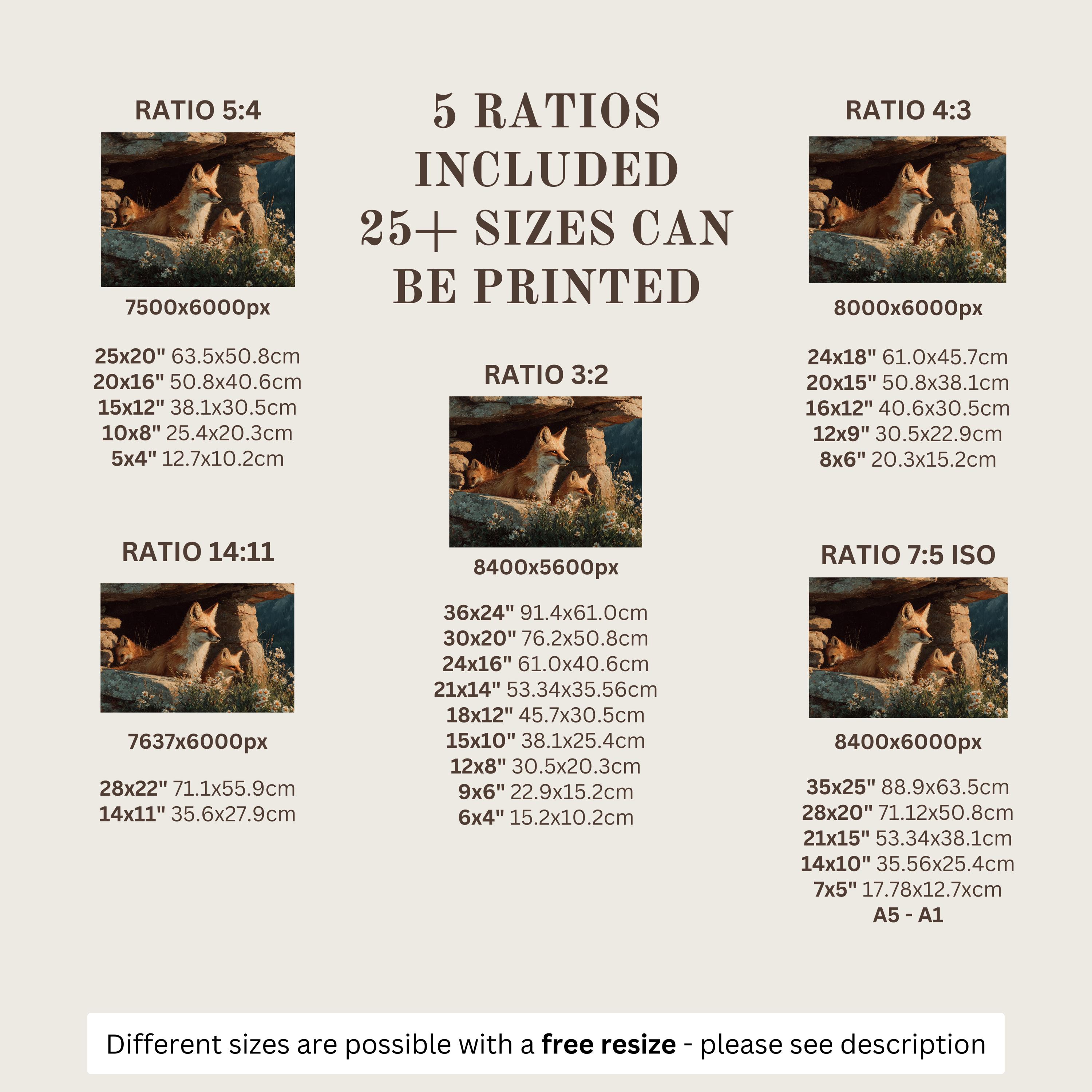 Each artwork includes 5 aspect ratios with 25+ print sizes. Most standard frames are covered. One custom resize per purchase available—message before ordering.