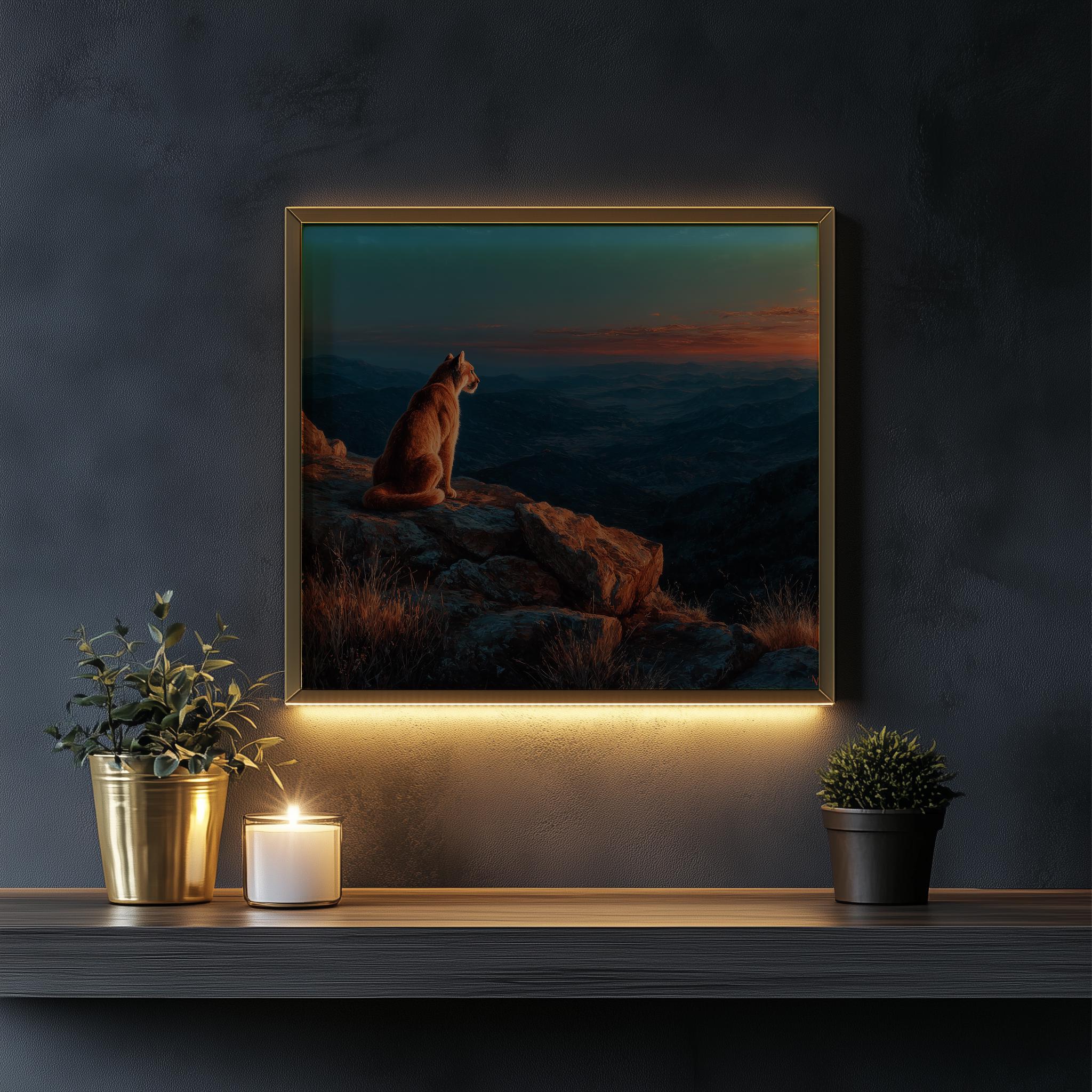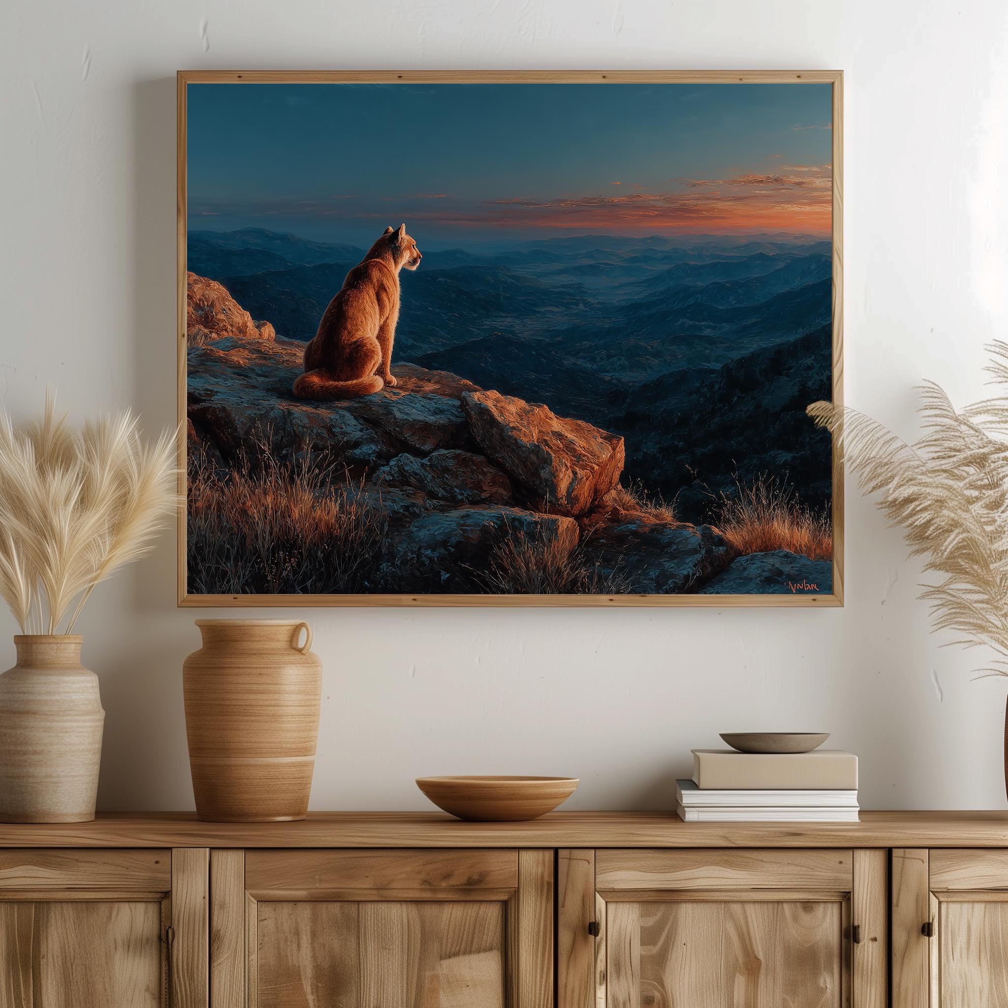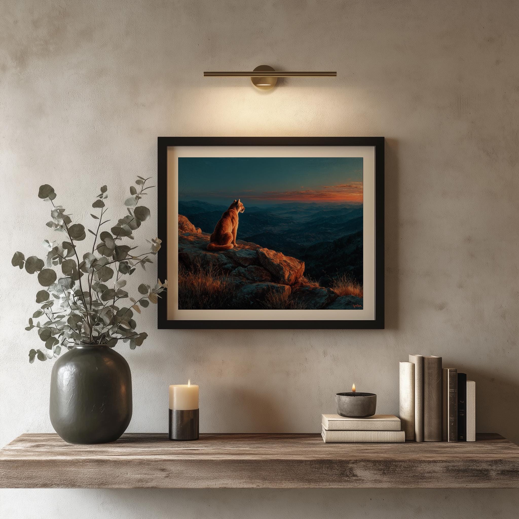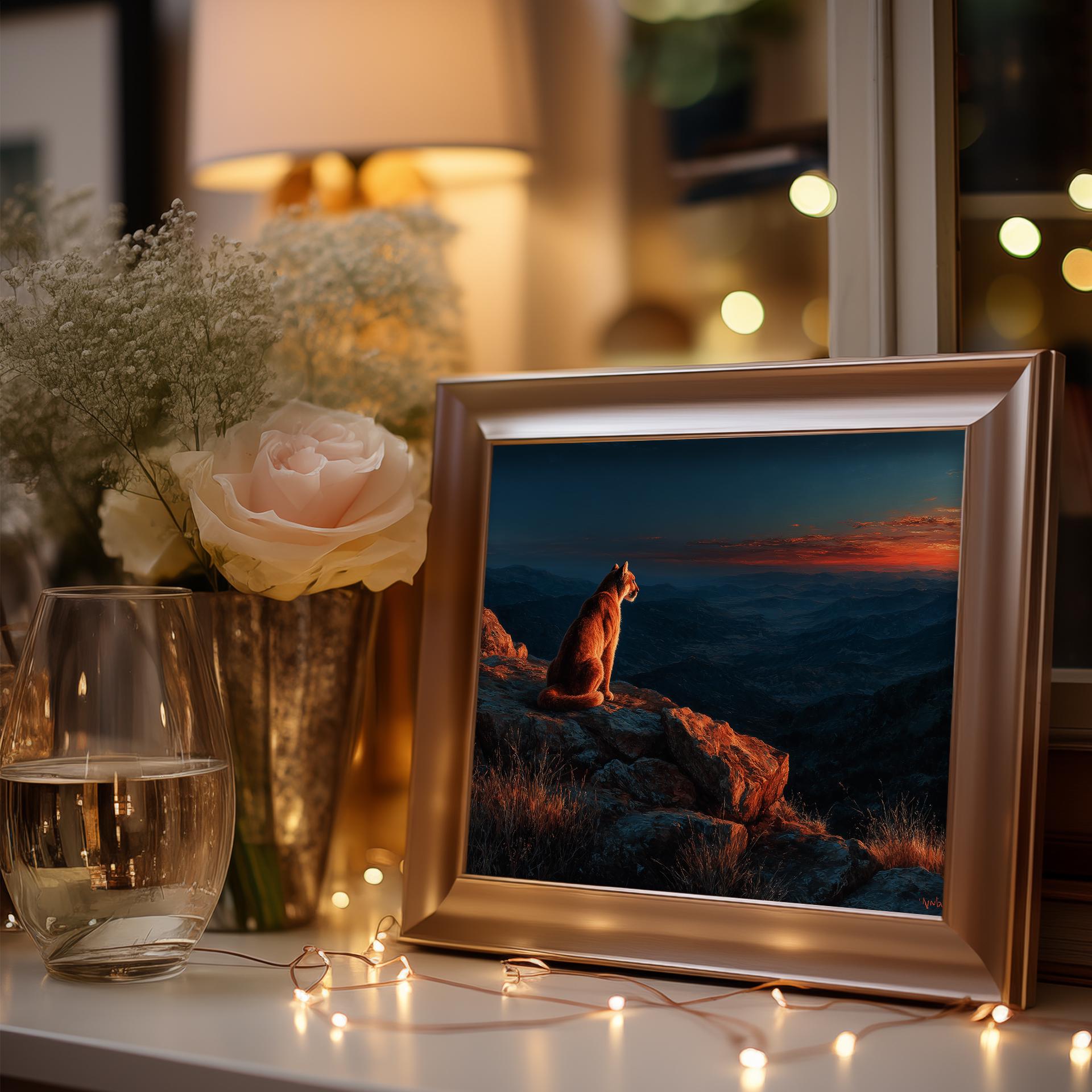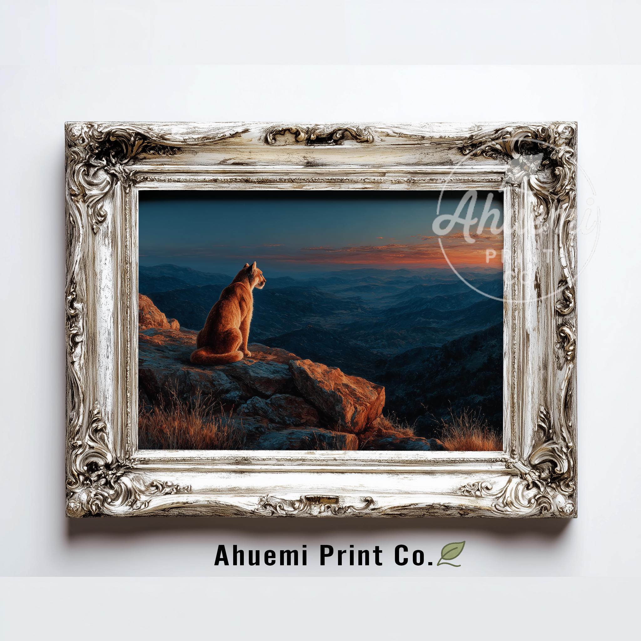 Immerse yourself in the charm with this rustic painting of a majestic mountain lion perched on a granite outcrop. An instantly downloadable print, it's perfect for elevating your decor with budget-friendly charm. This gives you the flexibility to customize the size, frame, and material according to your personal taste and space, ensuring a perfect fit for your walls.