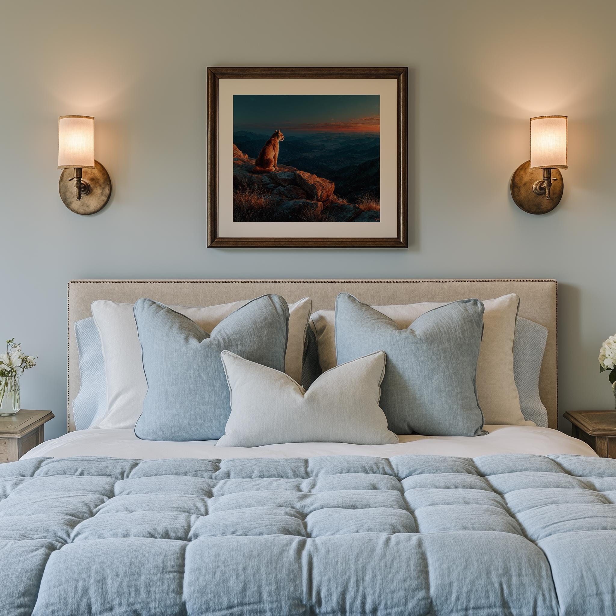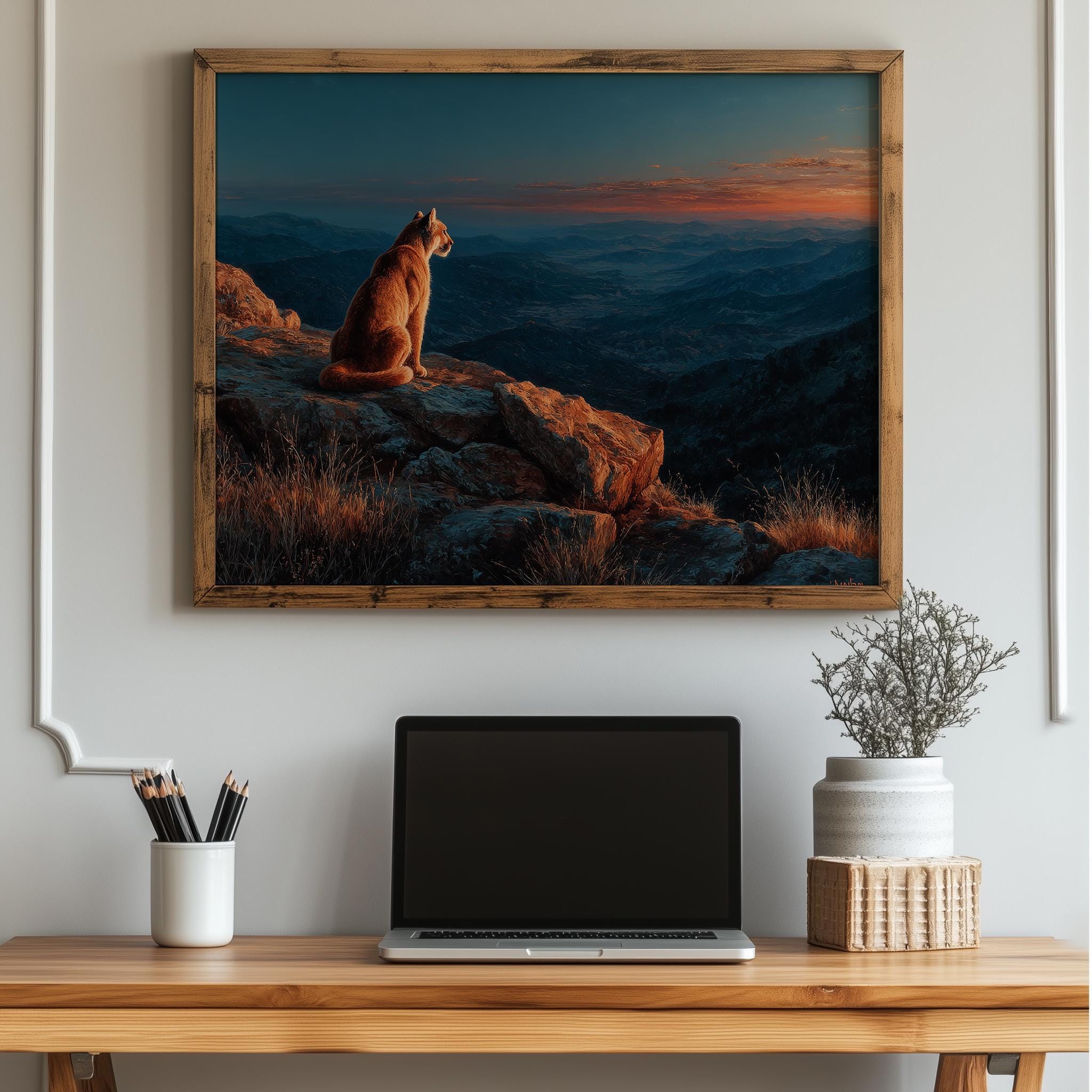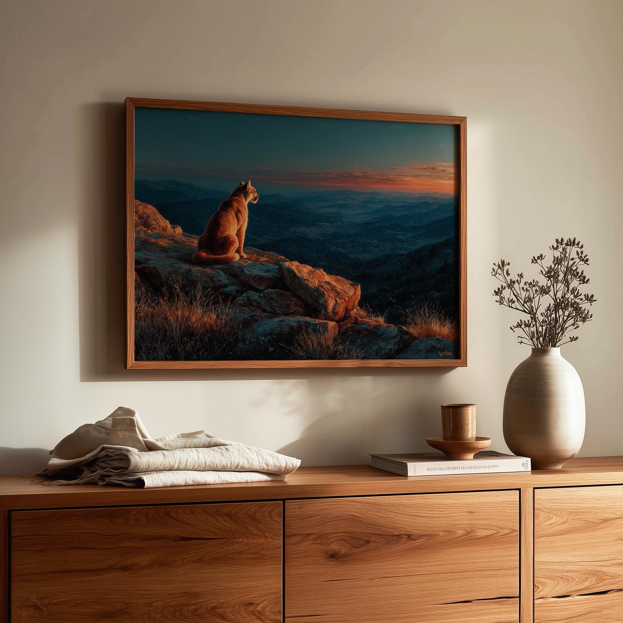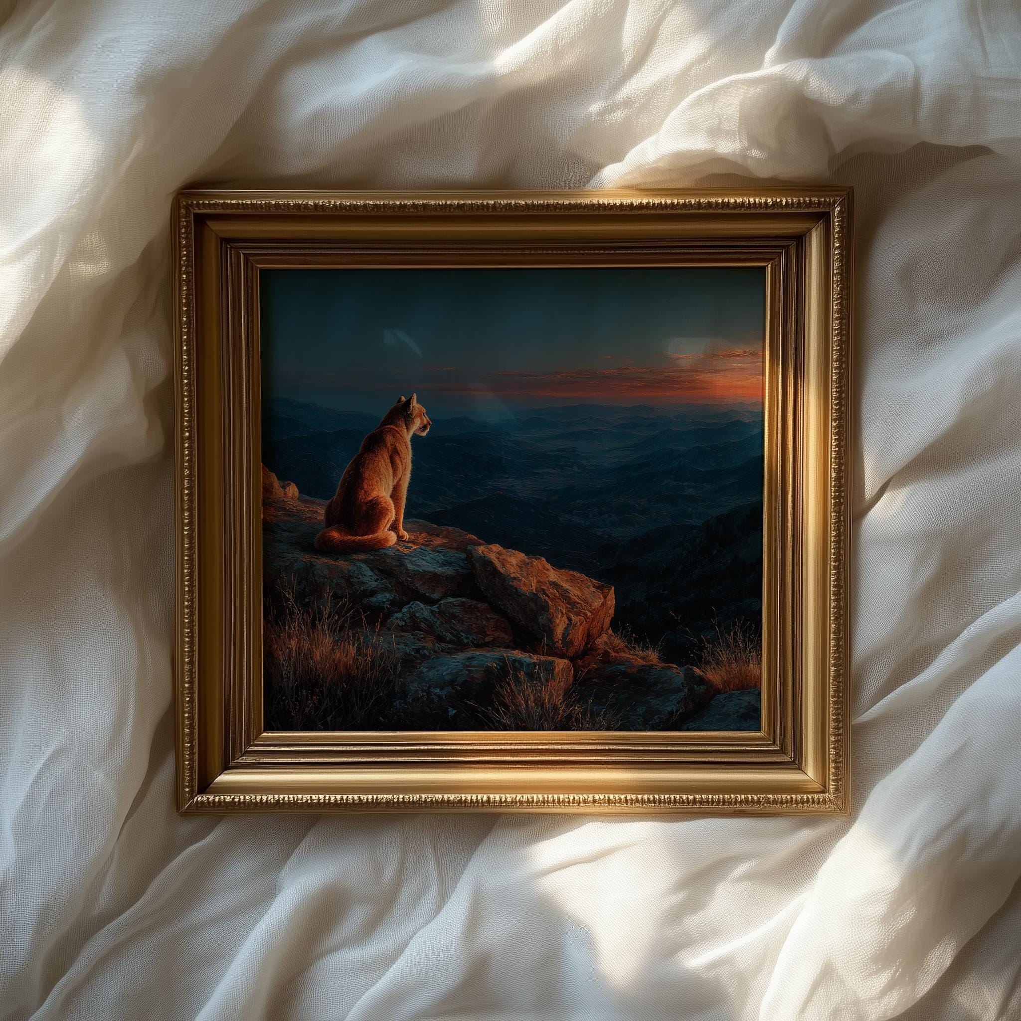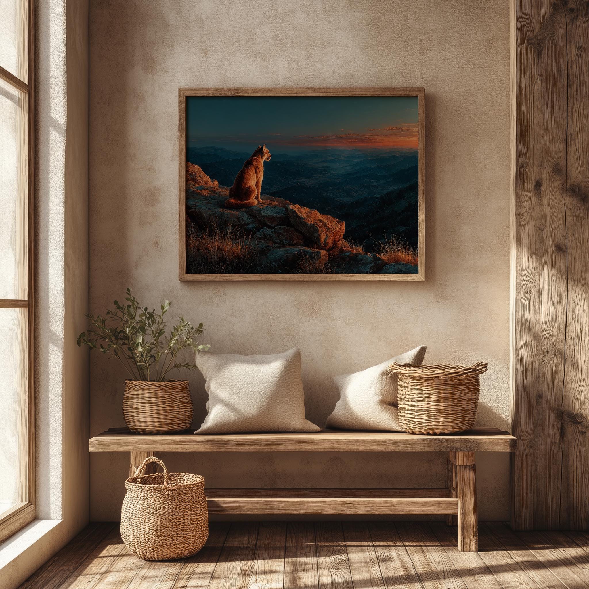 Immerse yourself in the charm with this rustic painting of a majestic mountain lion perched on a granite outcrop. An instantly downloadable print, it's perfect for elevating your decor with budget-friendly charm. This gives you the flexibility to customize the size, frame, and material according to your personal taste and space, ensuring a perfect fit for your walls.