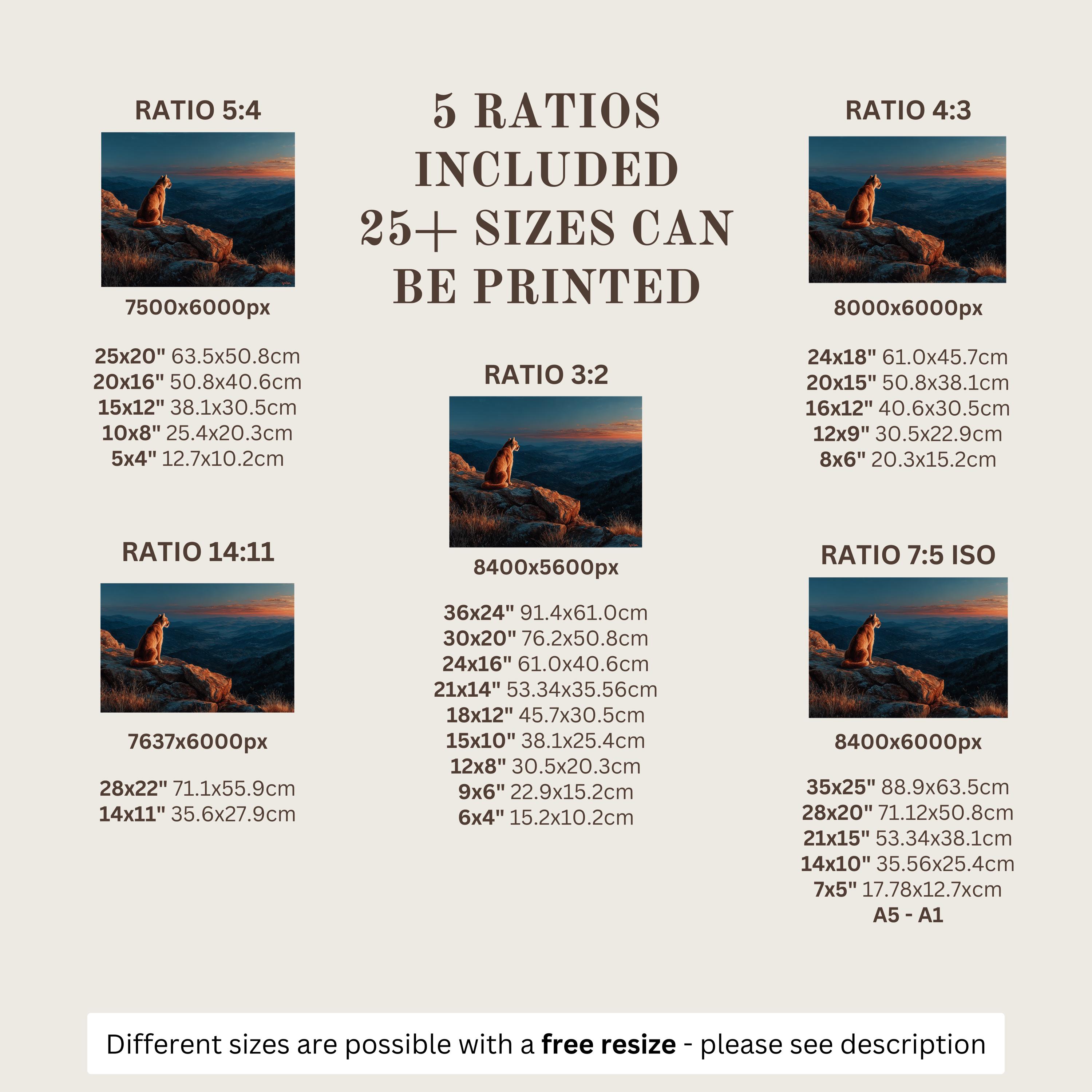 Each artwork includes 5 aspect ratios with 25+ print sizes. Most standard frames are covered. One custom resize per purchase available—message before ordering.