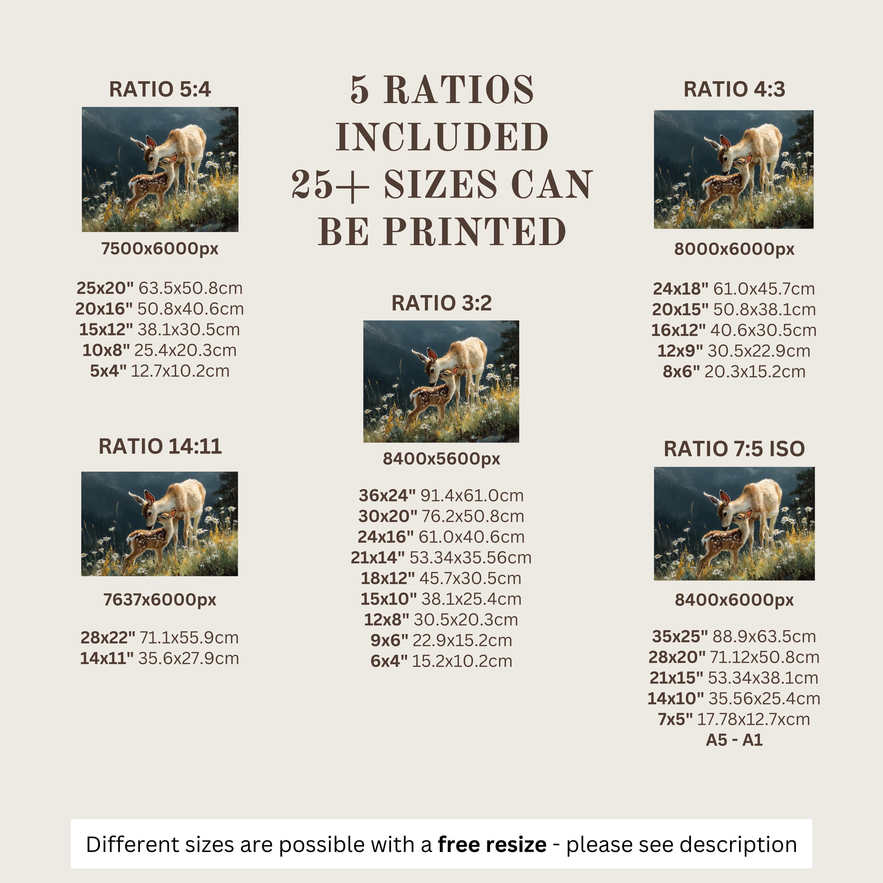 Each artwork includes 5 aspect ratios with 25+ print sizes. Most standard frames are covered. One custom resize per purchase available—message before ordering.