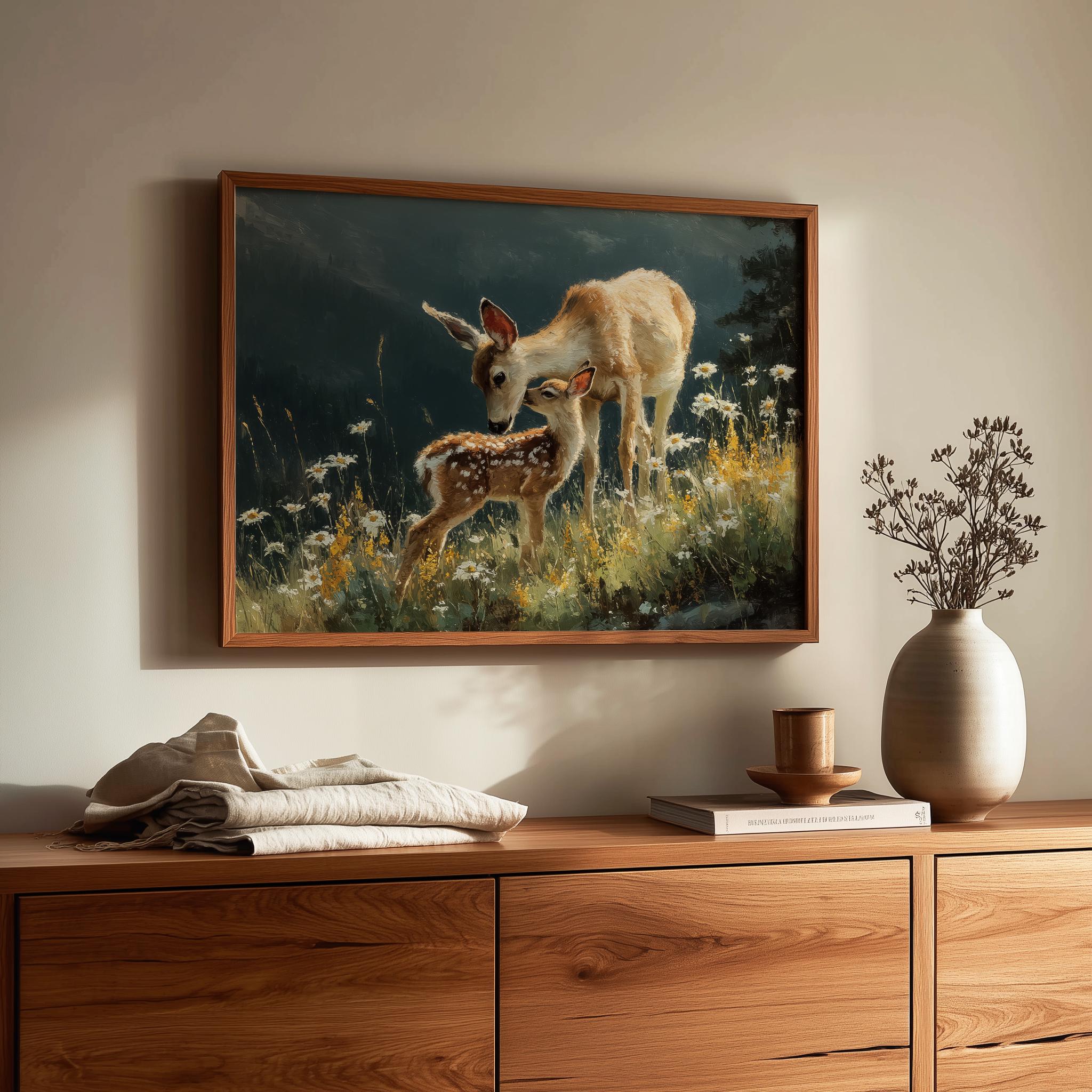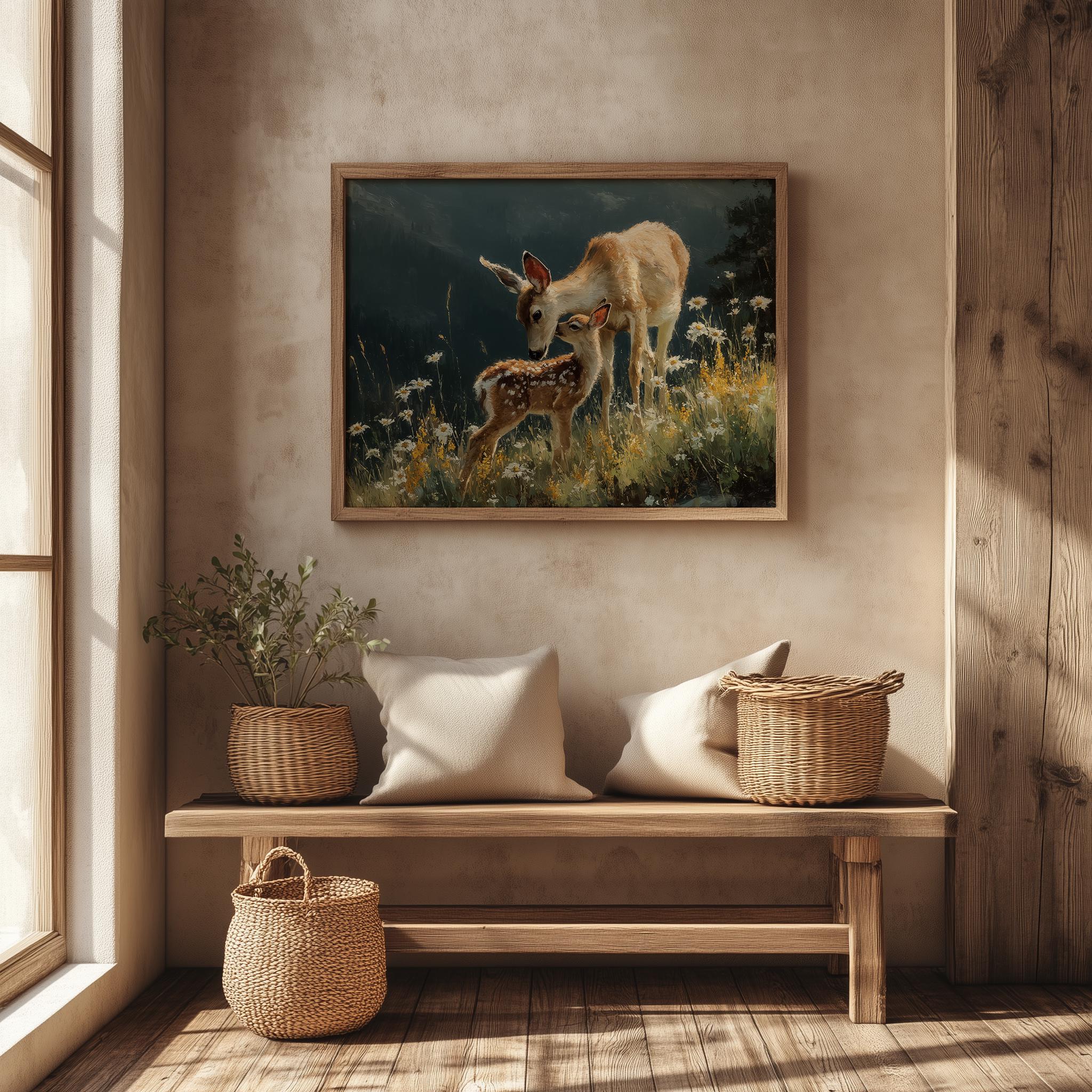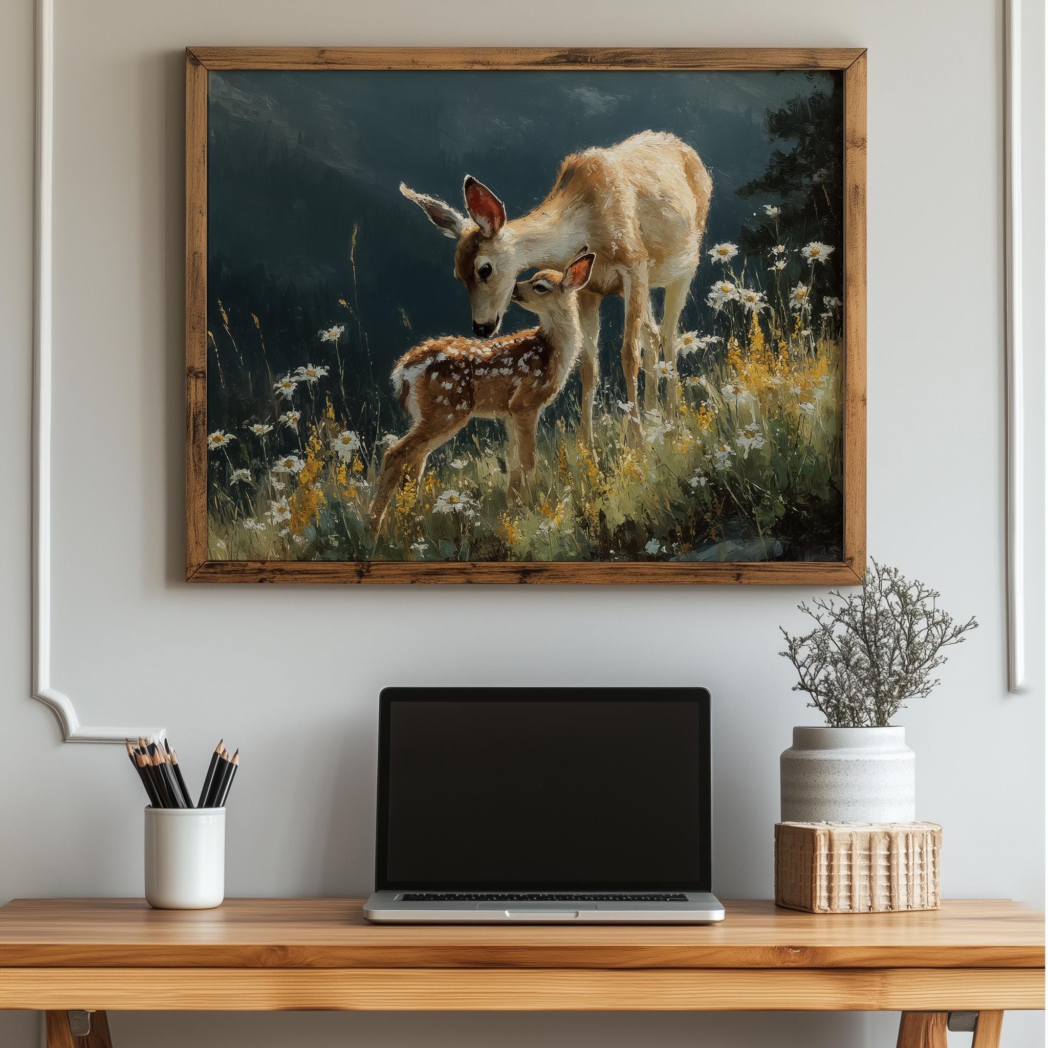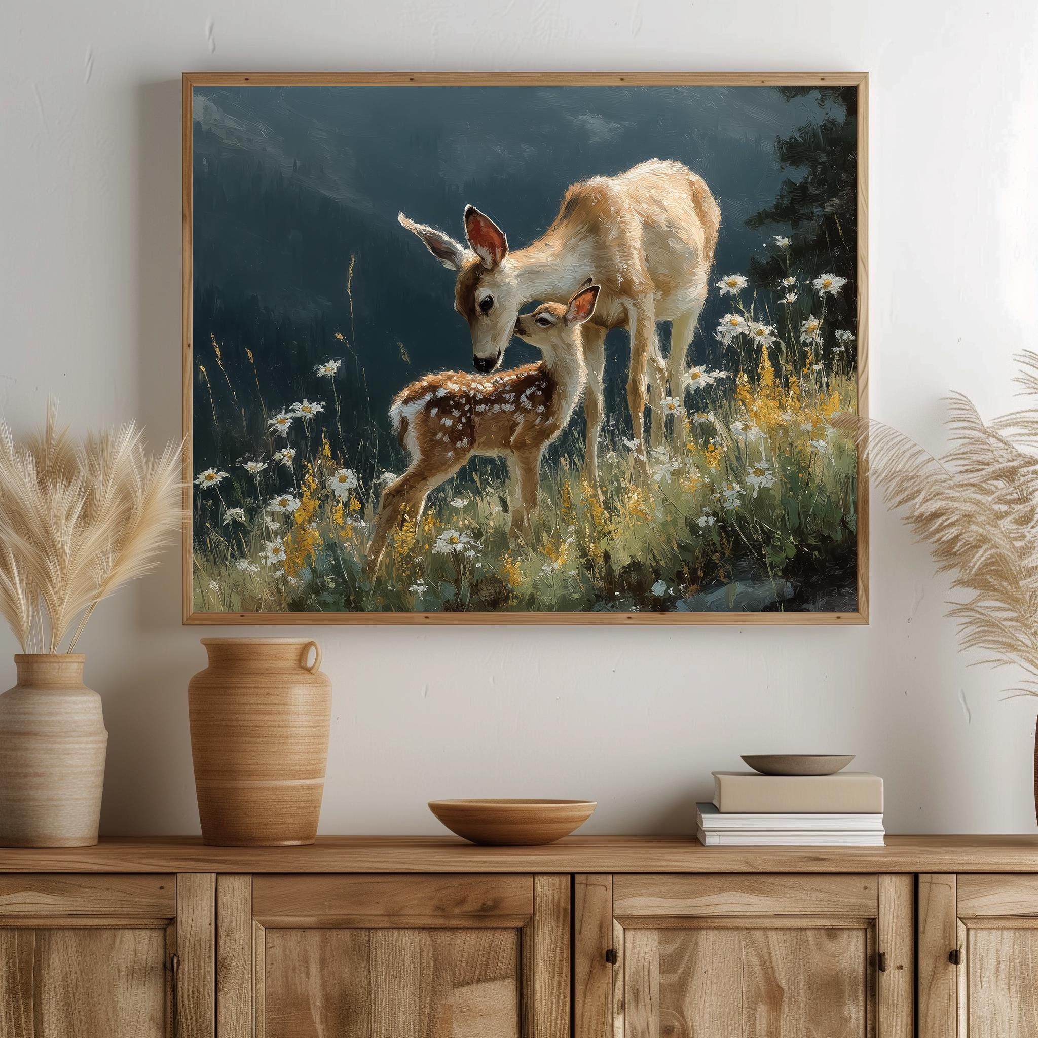 Immerse yourself in the charm with this rustic painting of a mule deer and fawn gracefully wandering through a sunlit meadow. An instantly downloadable print, it's perfect for elevating your decor with budget-friendly charm. This gives you the flexibility to customize the size, frame, and material according to your personal taste and space, ensuring a perfect fit for your walls.