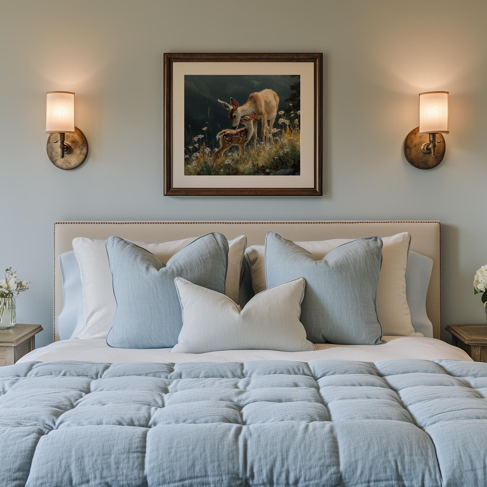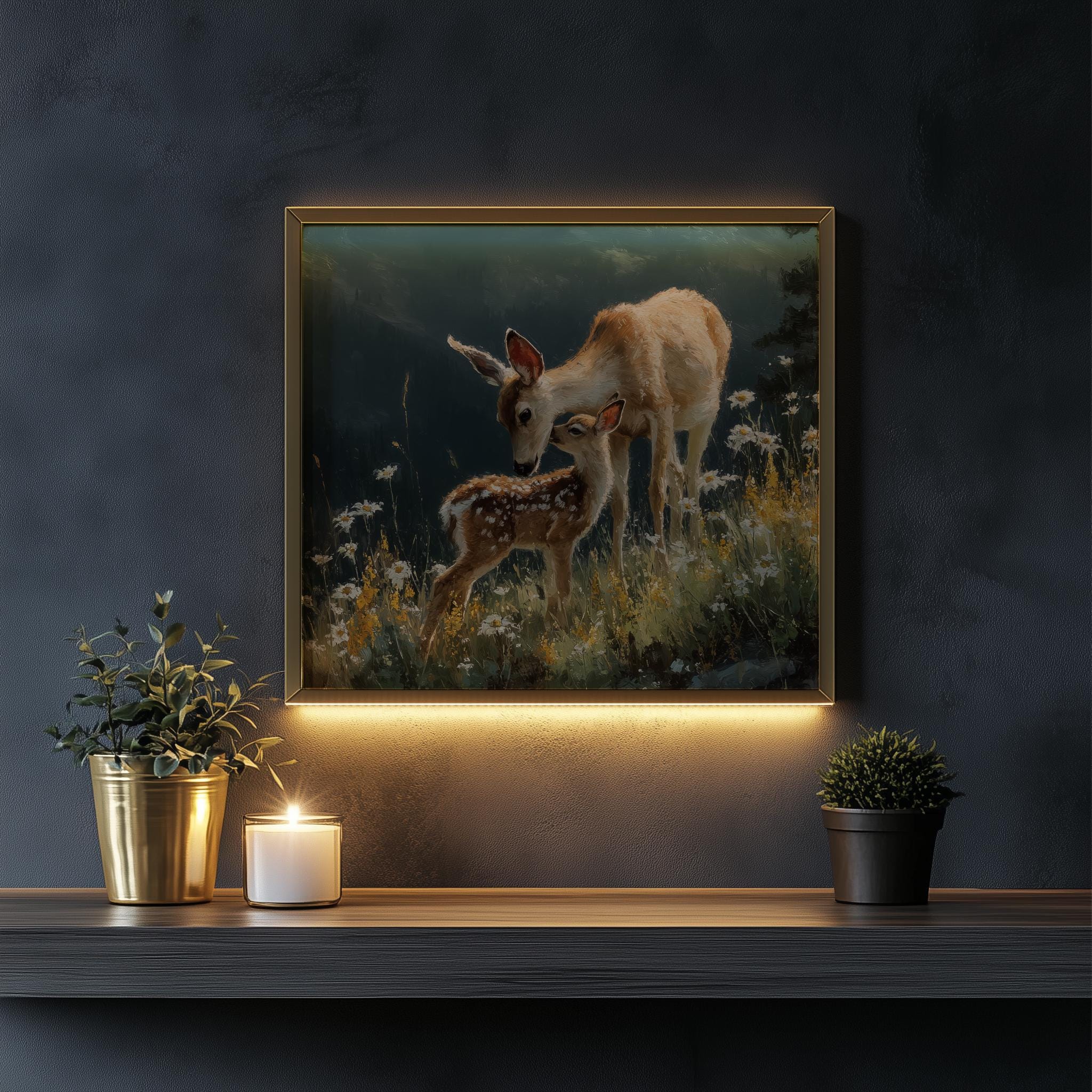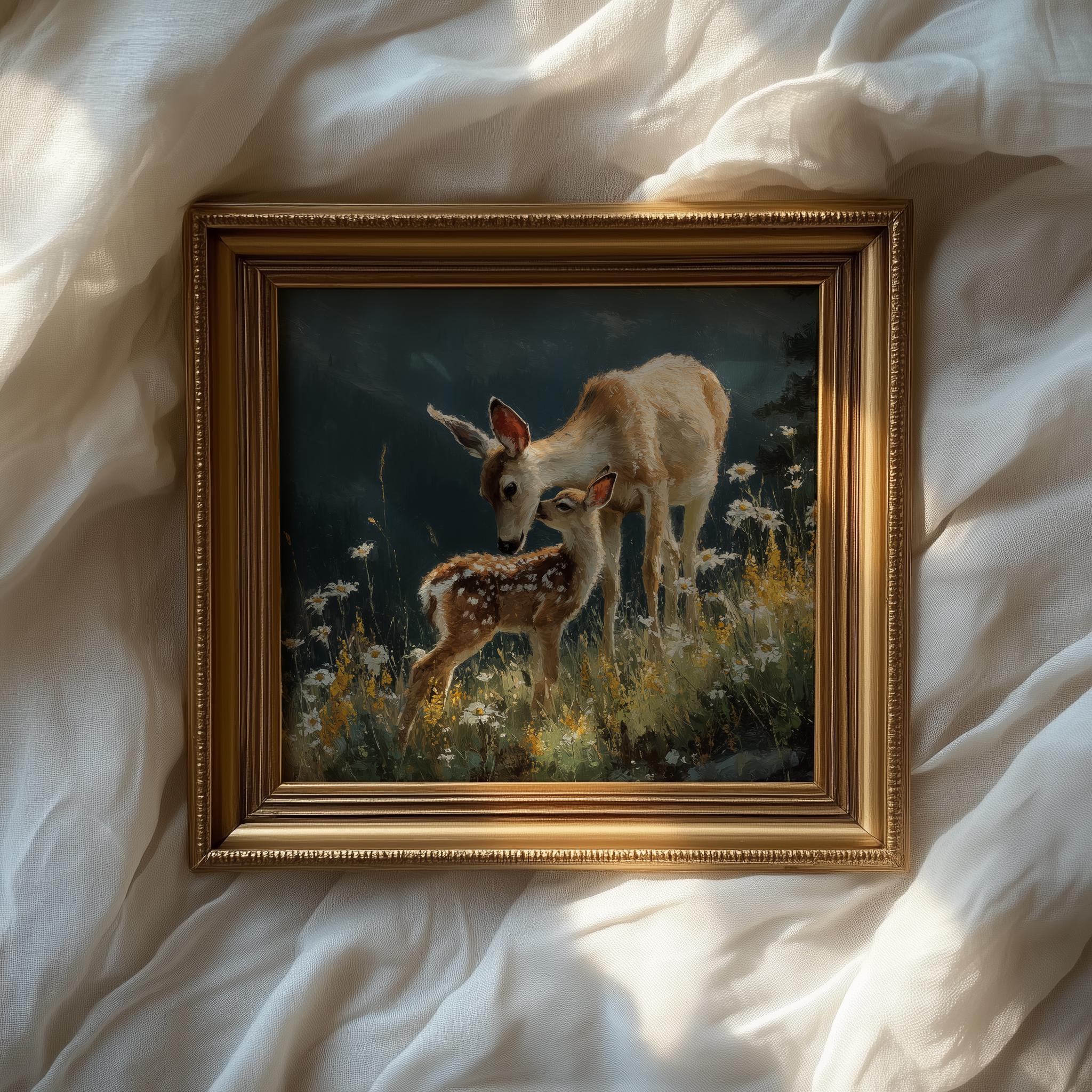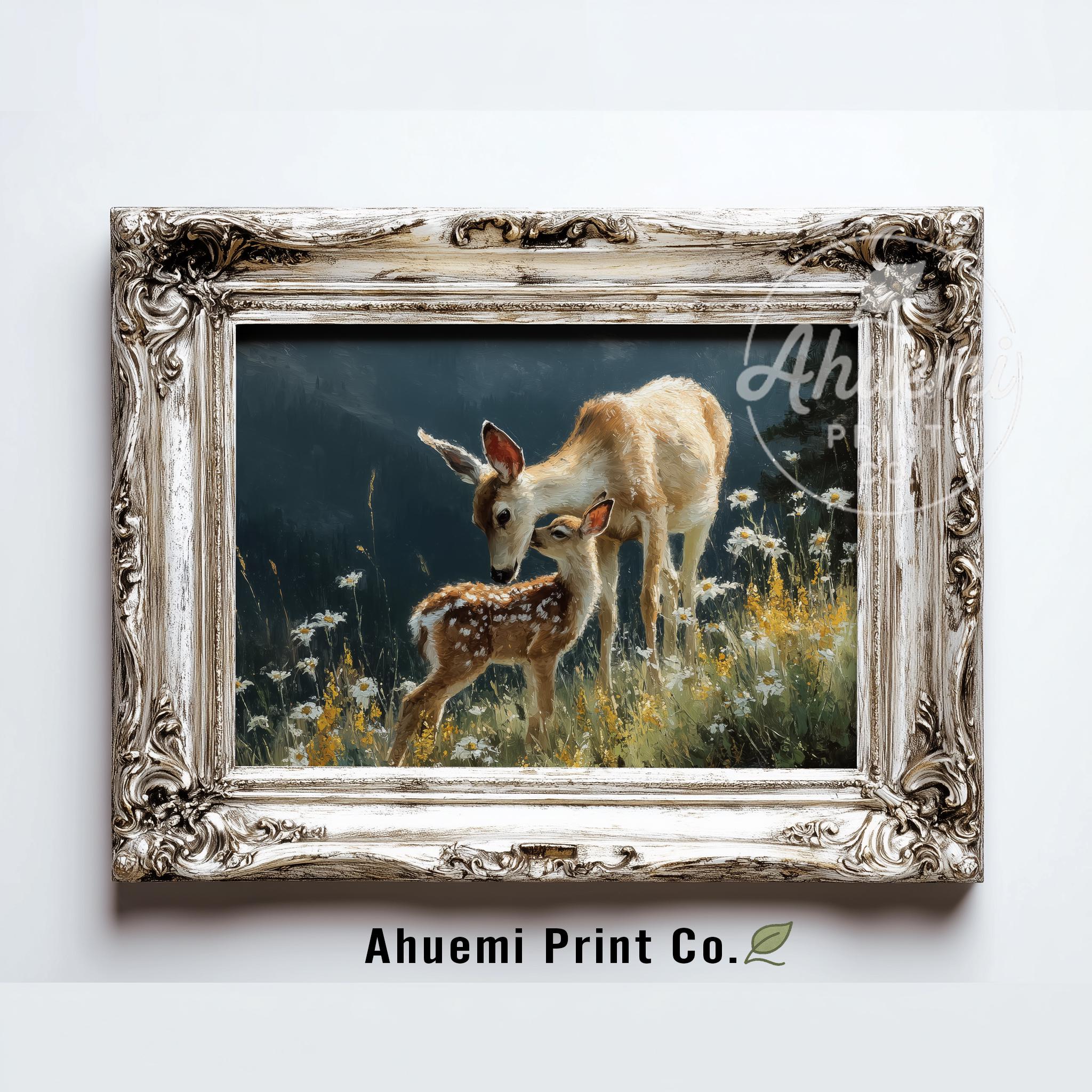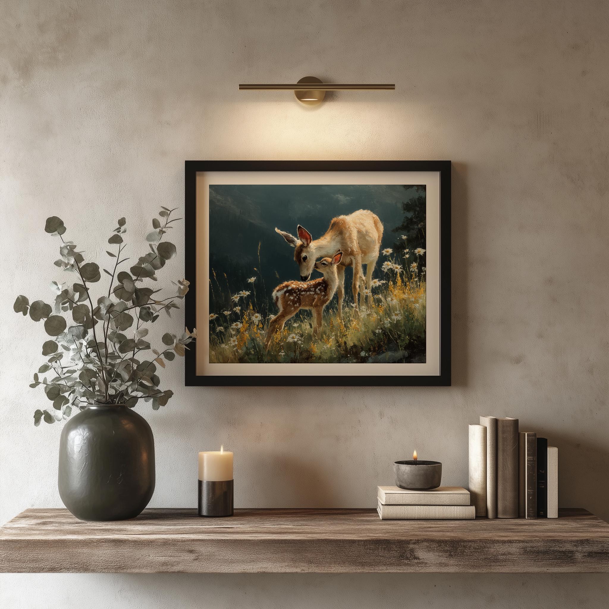 Immerse yourself in the charm with this rustic painting of a mule deer and fawn gracefully wandering through a sunlit meadow. An instantly downloadable print, it's perfect for elevating your decor with budget-friendly charm. This gives you the flexibility to customize the size, frame, and material according to your personal taste and space, ensuring a perfect fit for your walls.