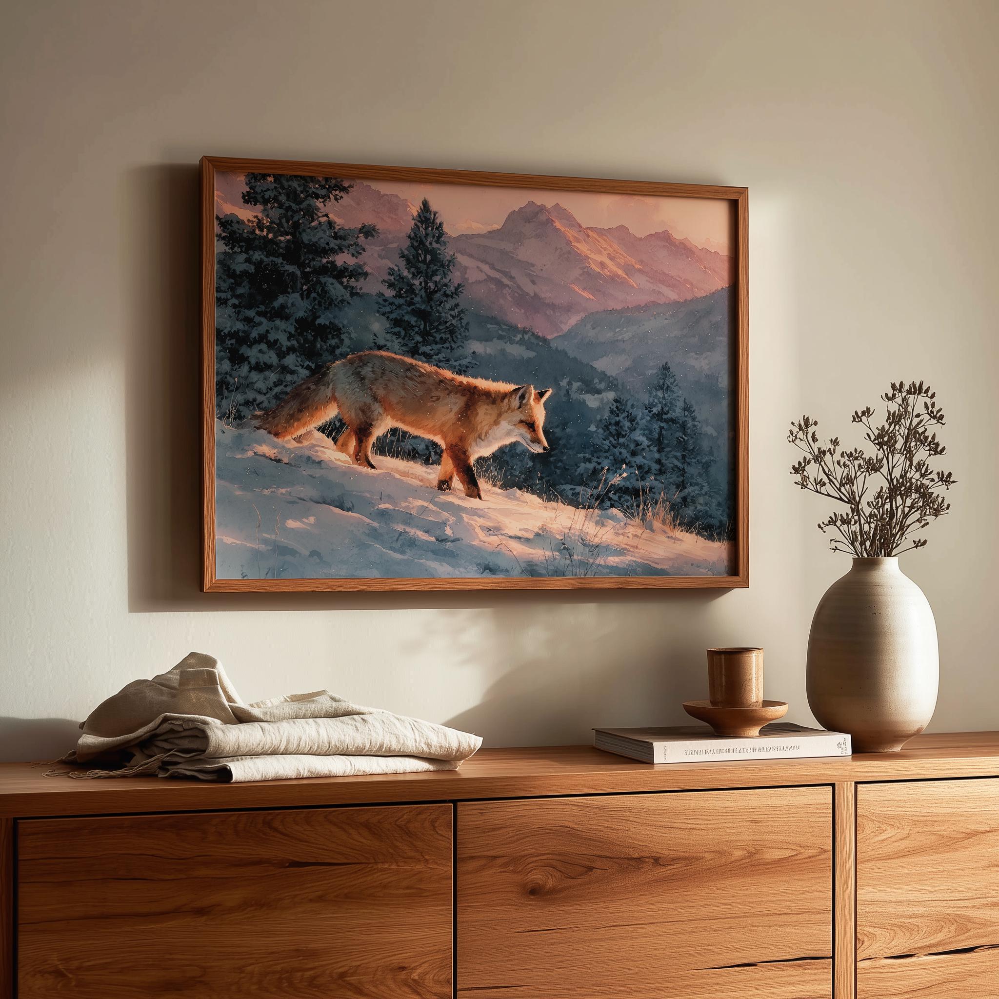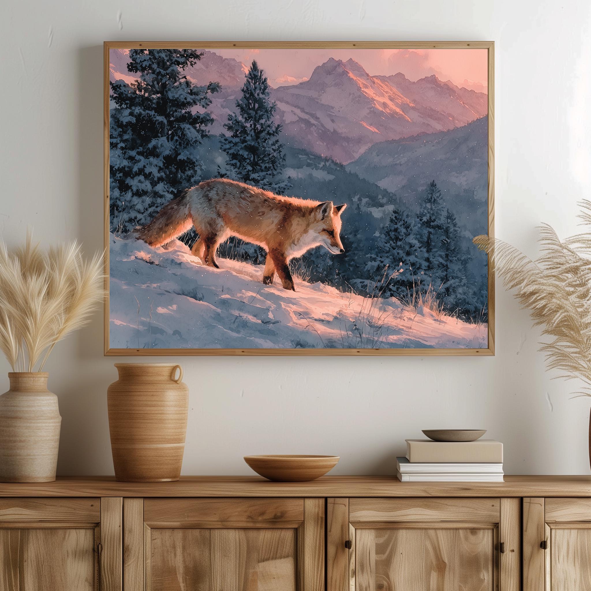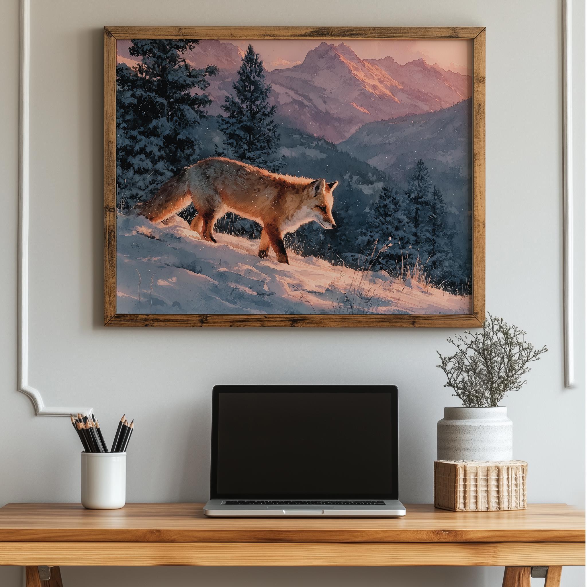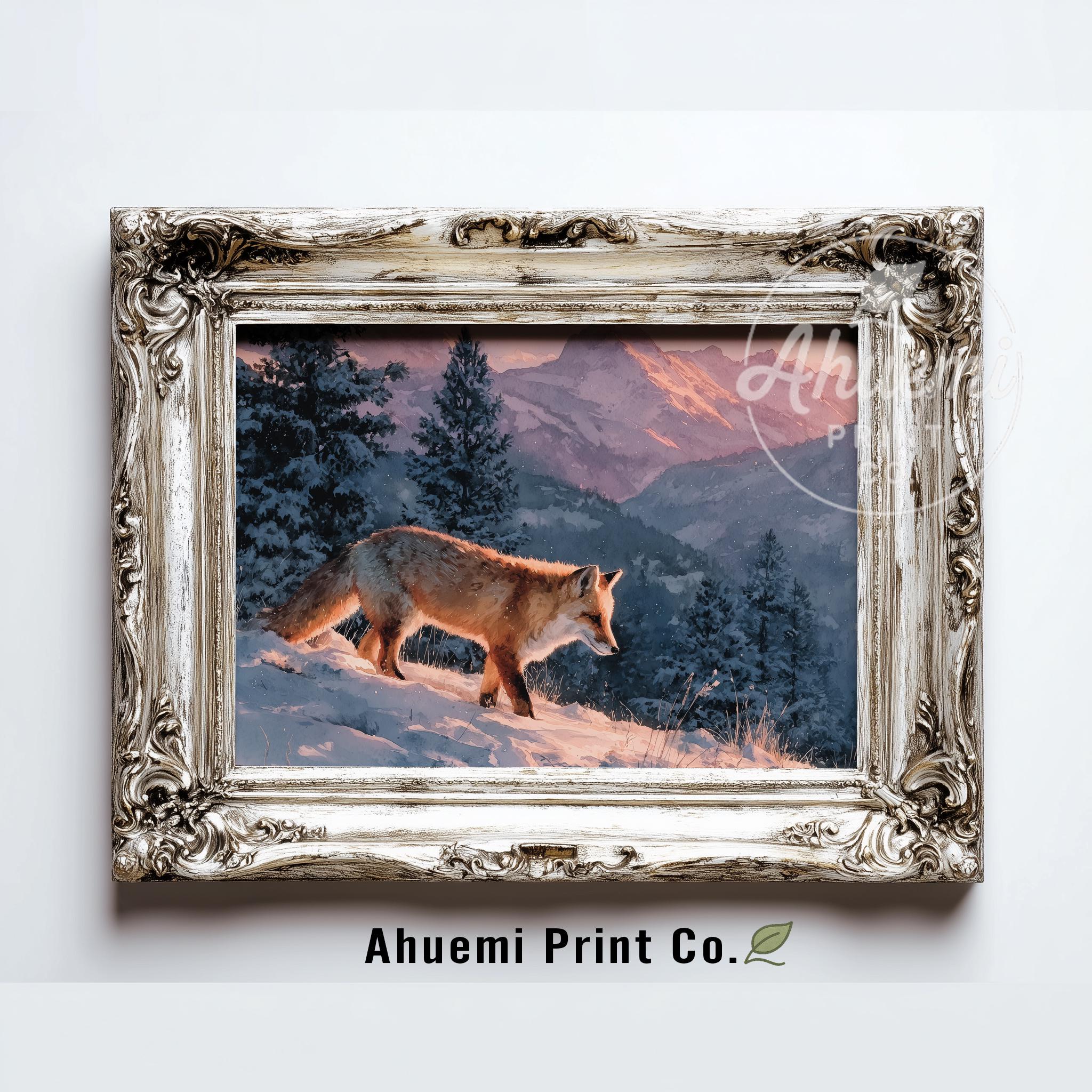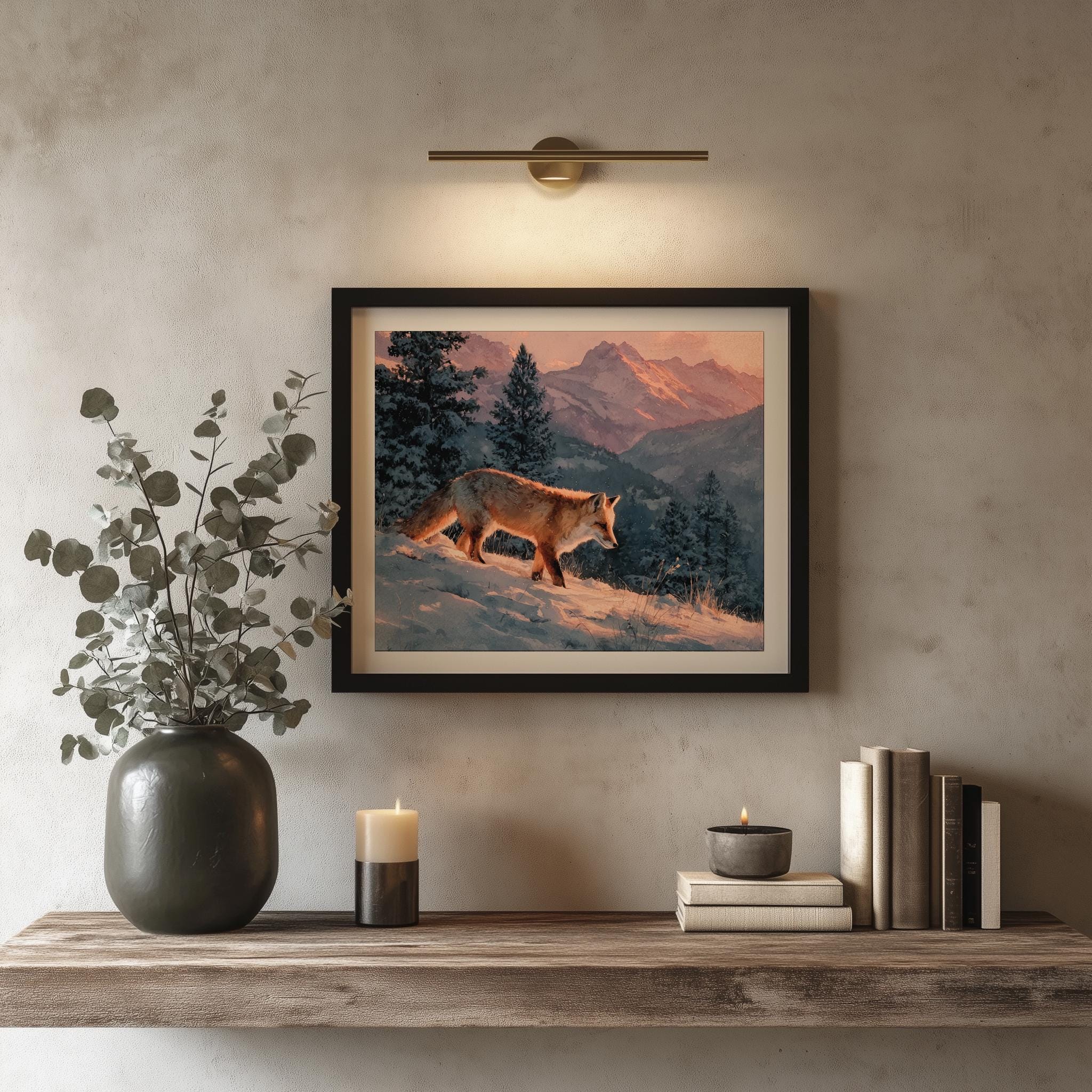 Immerse yourself in the charm with this rustic painting of a moody winter fox in a serene snowy landscape. An instantly downloadable print, it's perfect for elevating your decor with budget-friendly charm. This gives you the flexibility to customize the size, frame, and material according to your personal taste and space, ensuring a perfect fit for your walls.