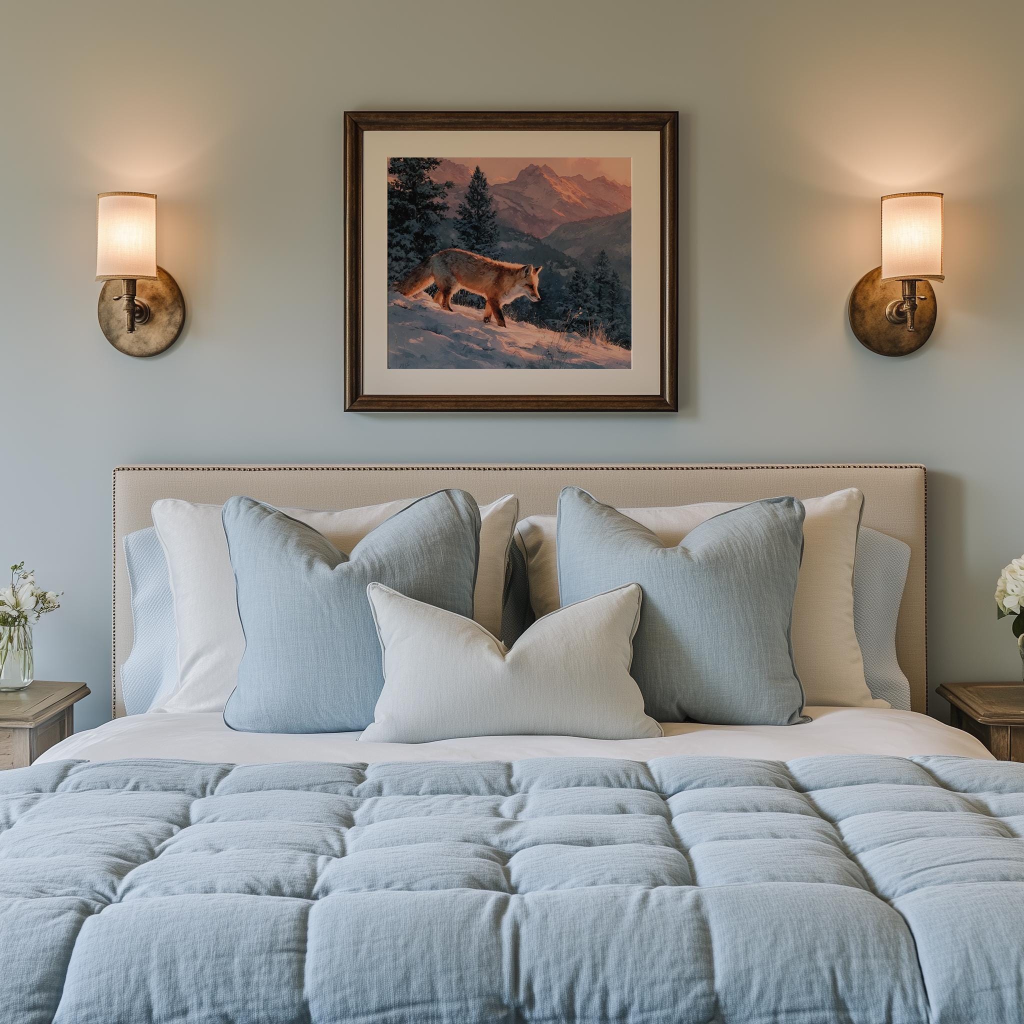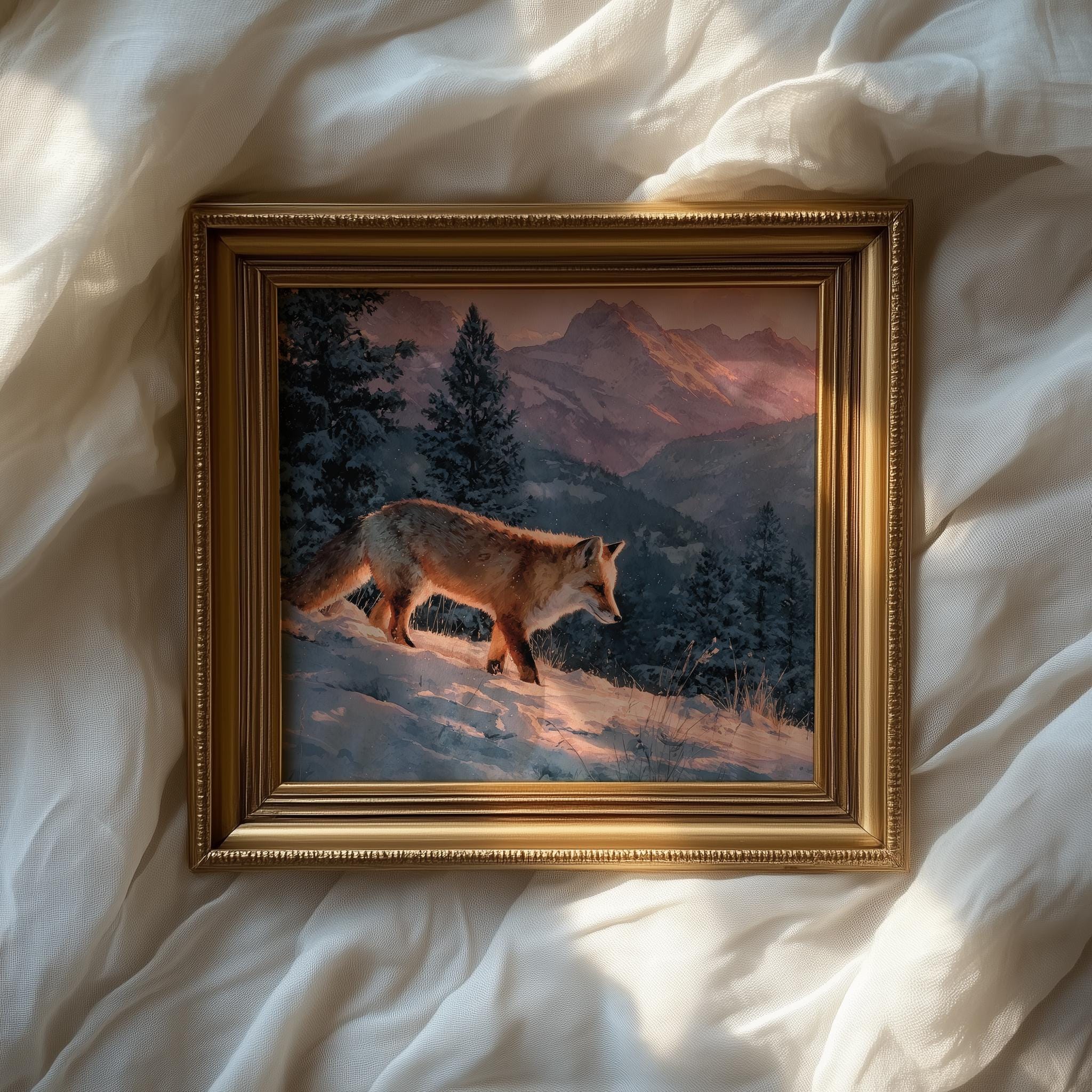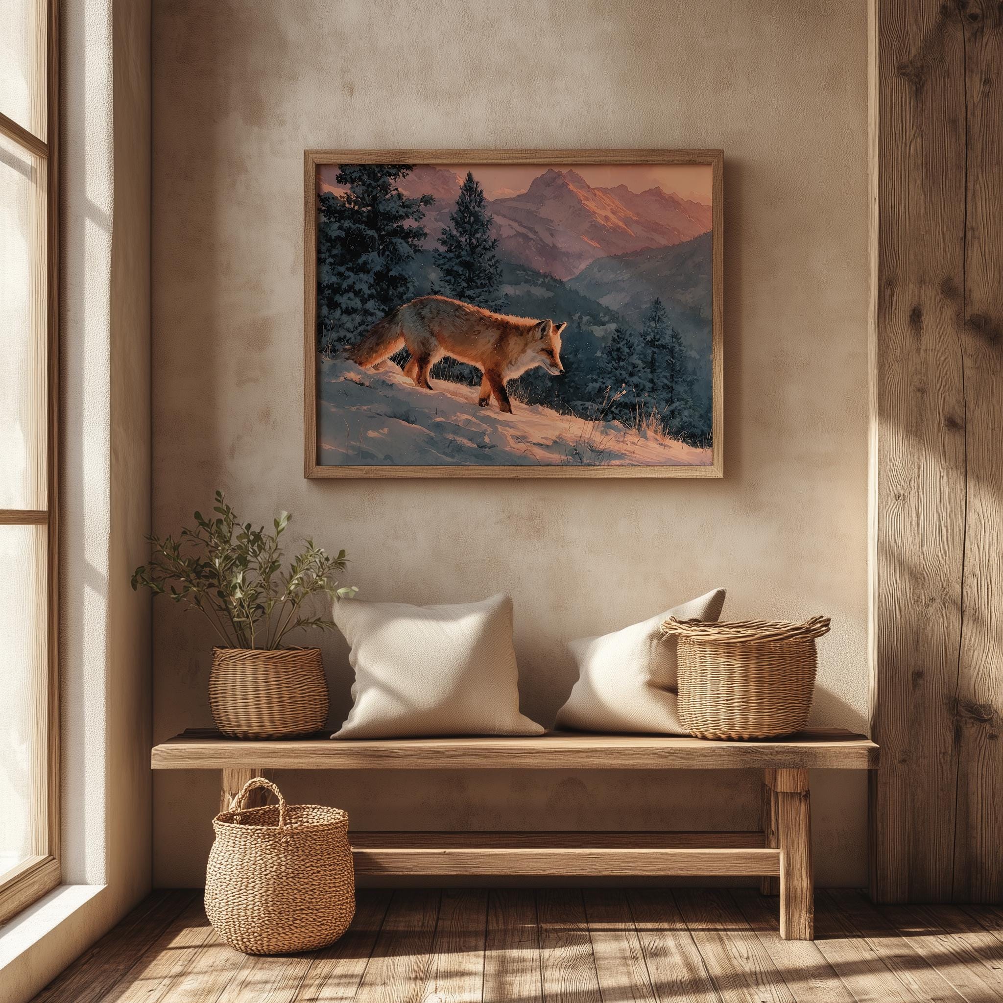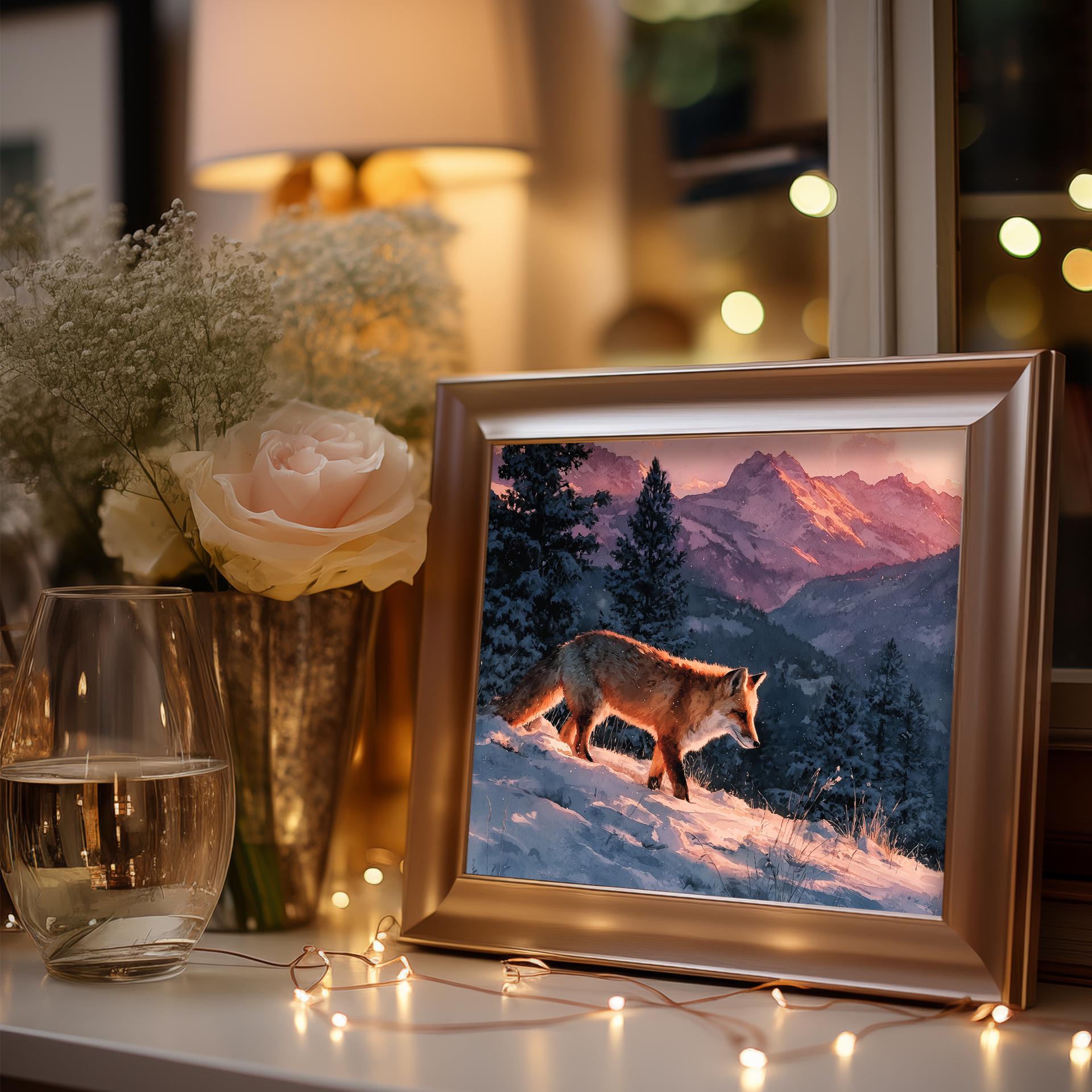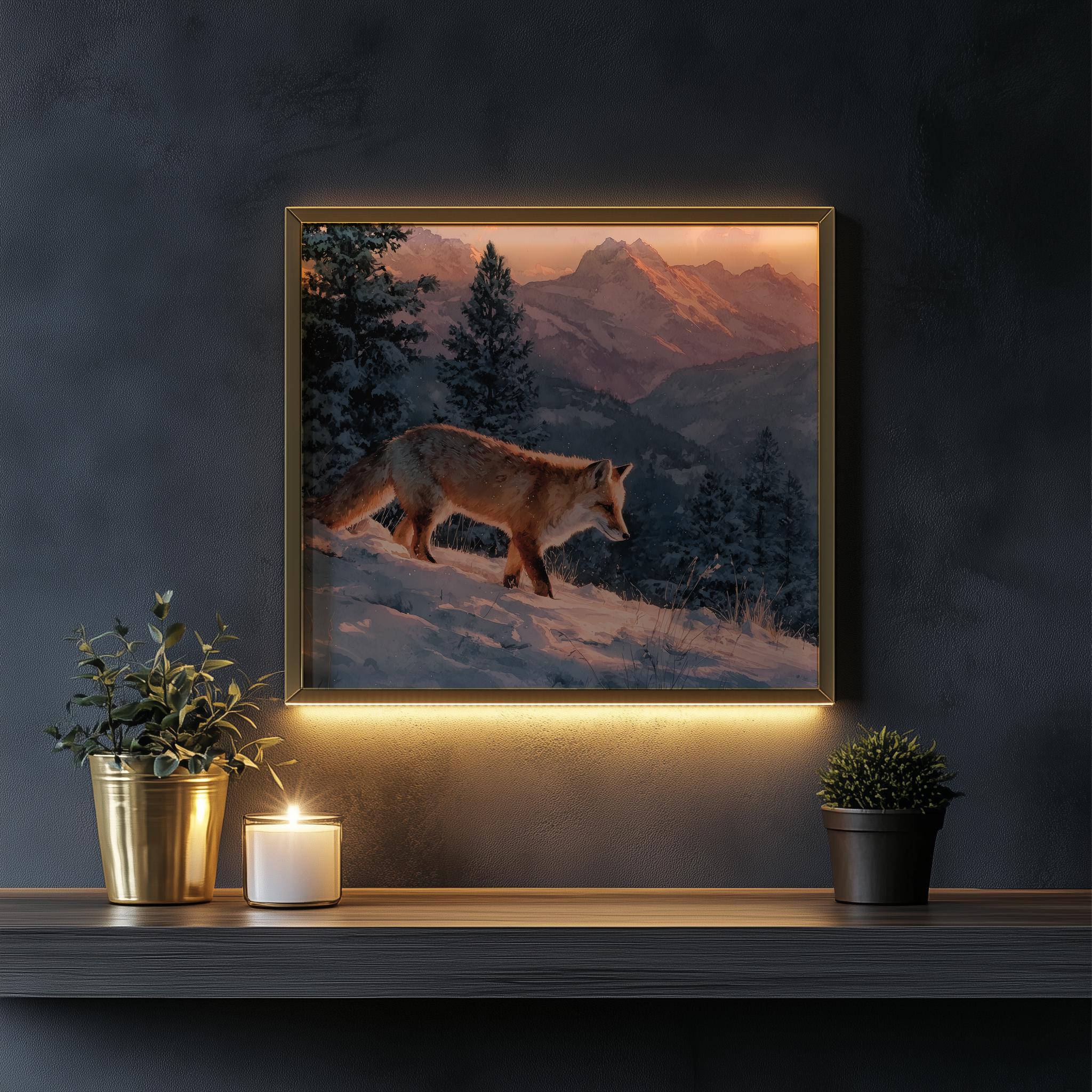 Immerse yourself in the charm with this rustic painting of a moody winter fox in a serene snowy landscape. An instantly downloadable print, it's perfect for elevating your decor with budget-friendly charm. This gives you the flexibility to customize the size, frame, and material according to your personal taste and space, ensuring a perfect fit for your walls.