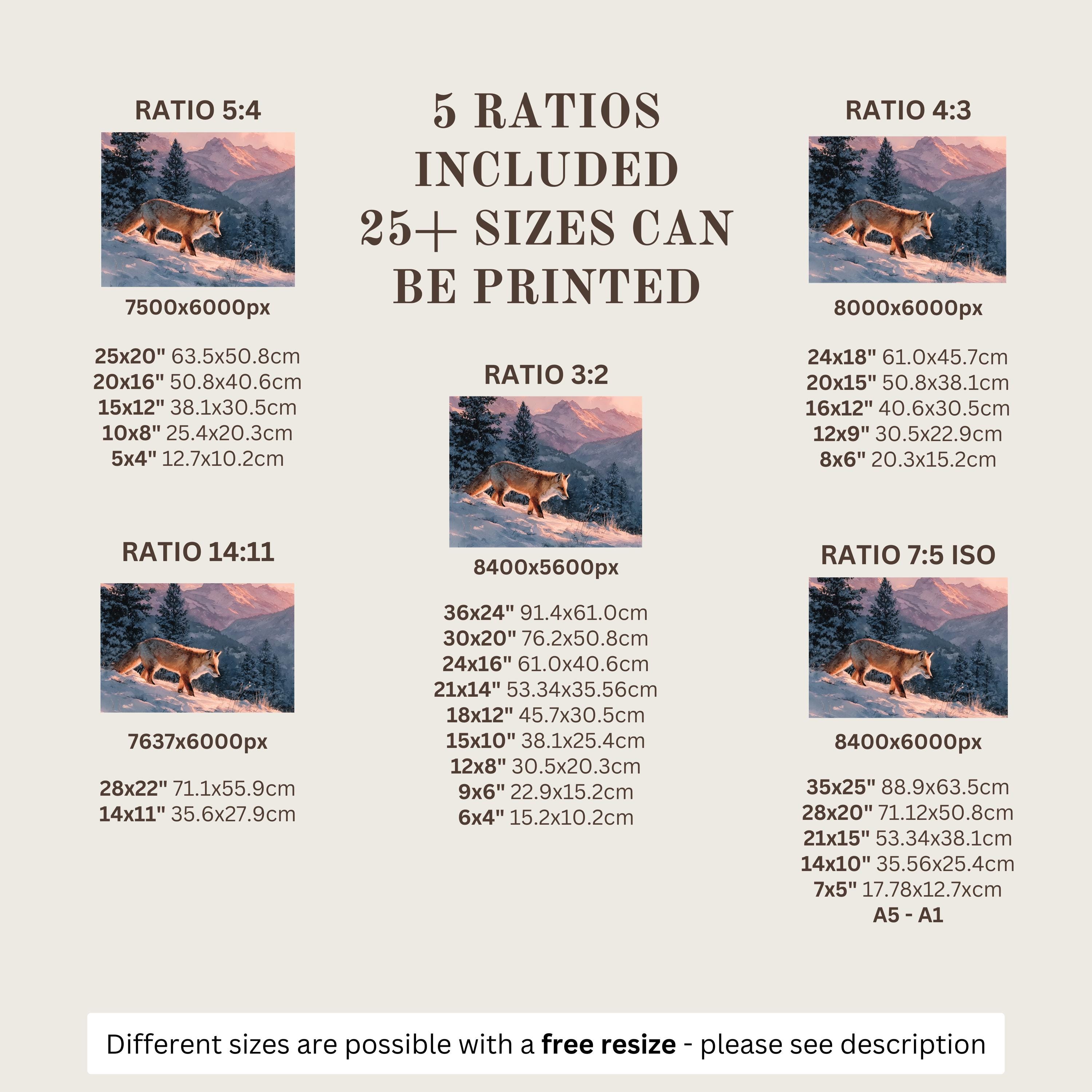 Each artwork includes 5 aspect ratios with 25+ print sizes. Most standard frames are covered. One custom resize per purchase available—message before ordering.
