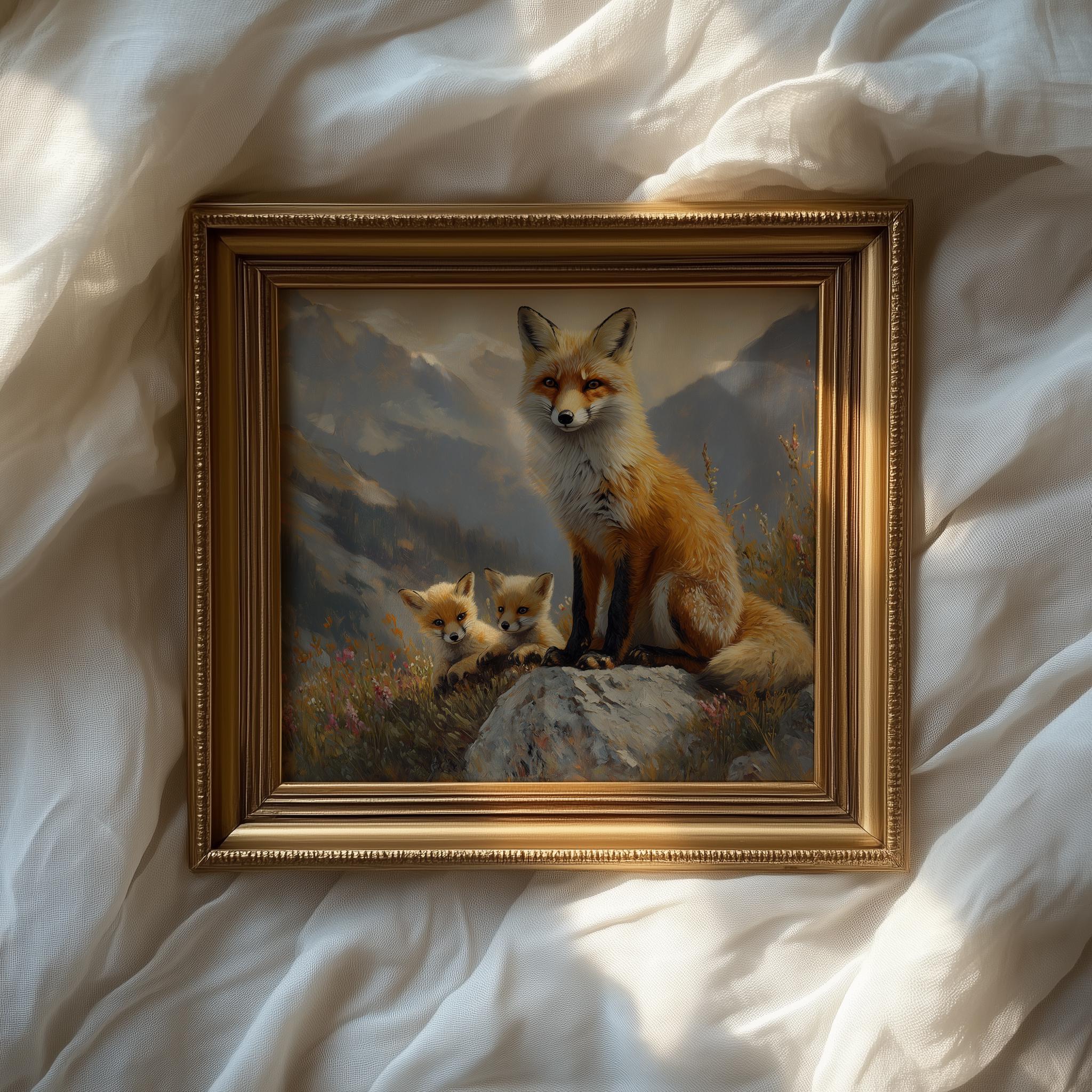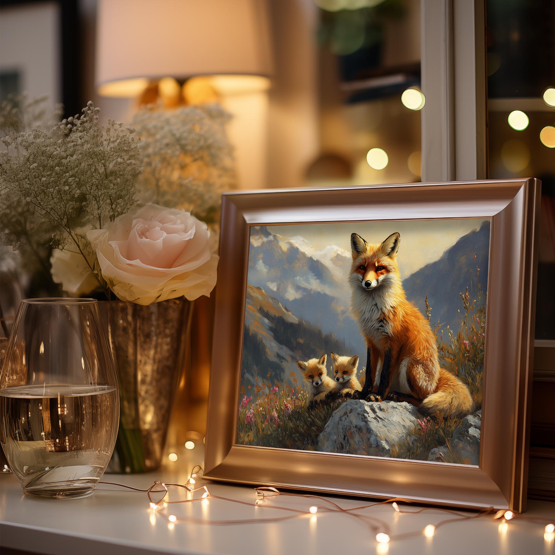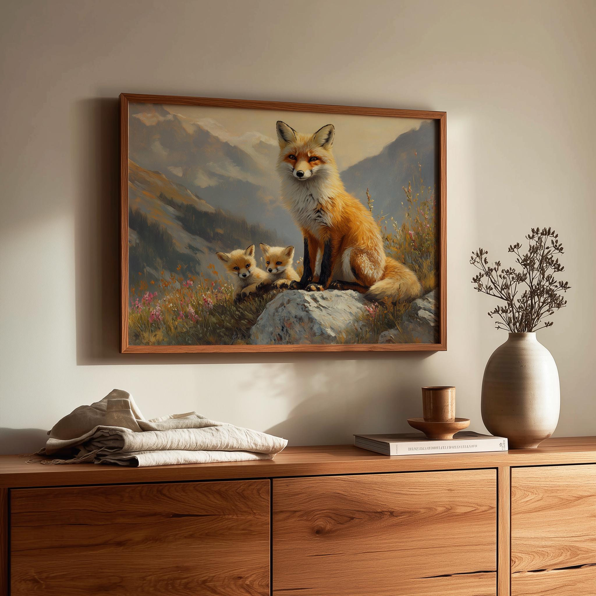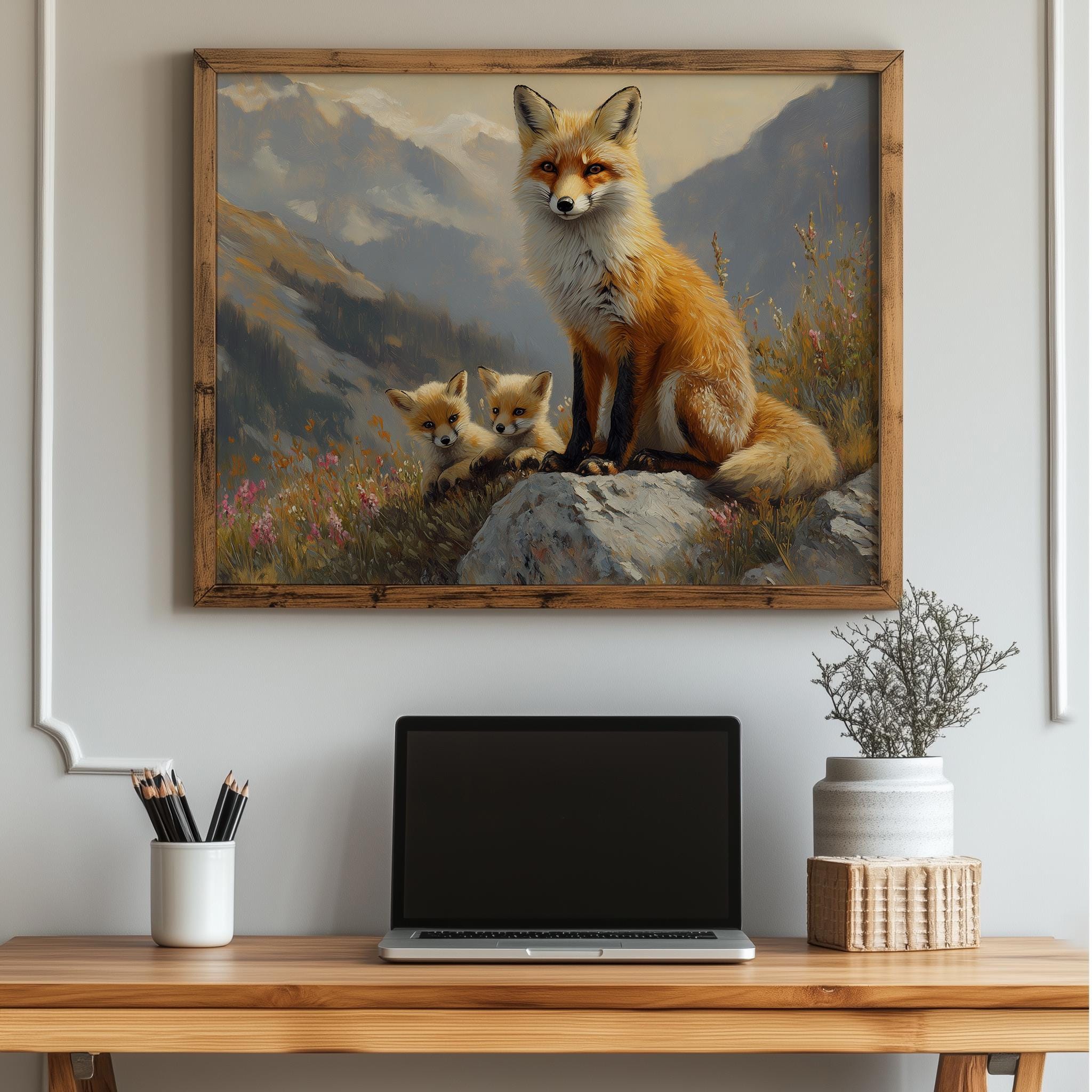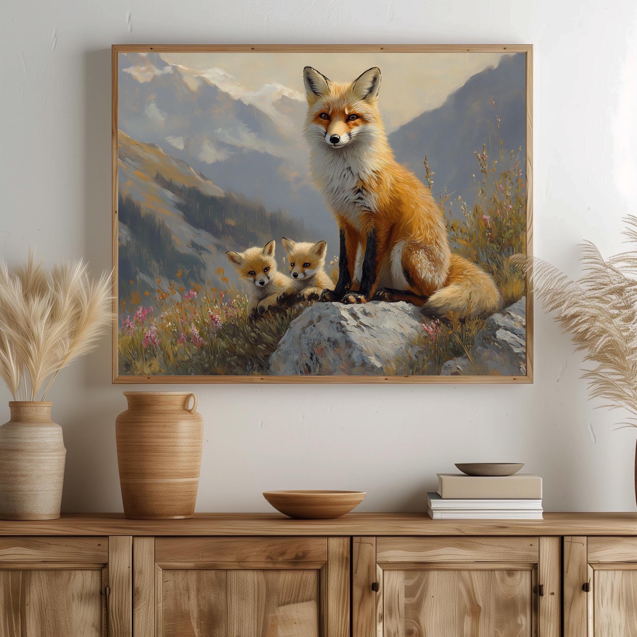 Immerse yourself in the charm with this rustic painting of a Sierra Nevada red fox family nestled in a serene forest landscape. An instantly downloadable print, it's perfect for elevating your decor with budget-friendly charm. This gives you the flexibility to customize the size, frame, and material according to your personal taste and space, ensuring a perfect fit for your walls.