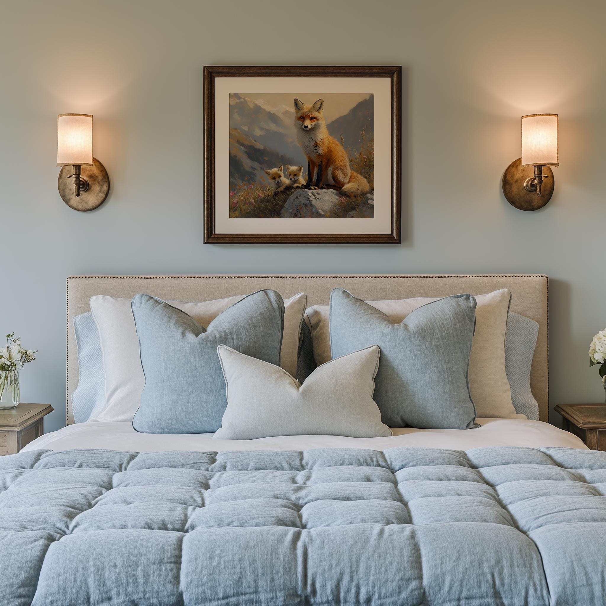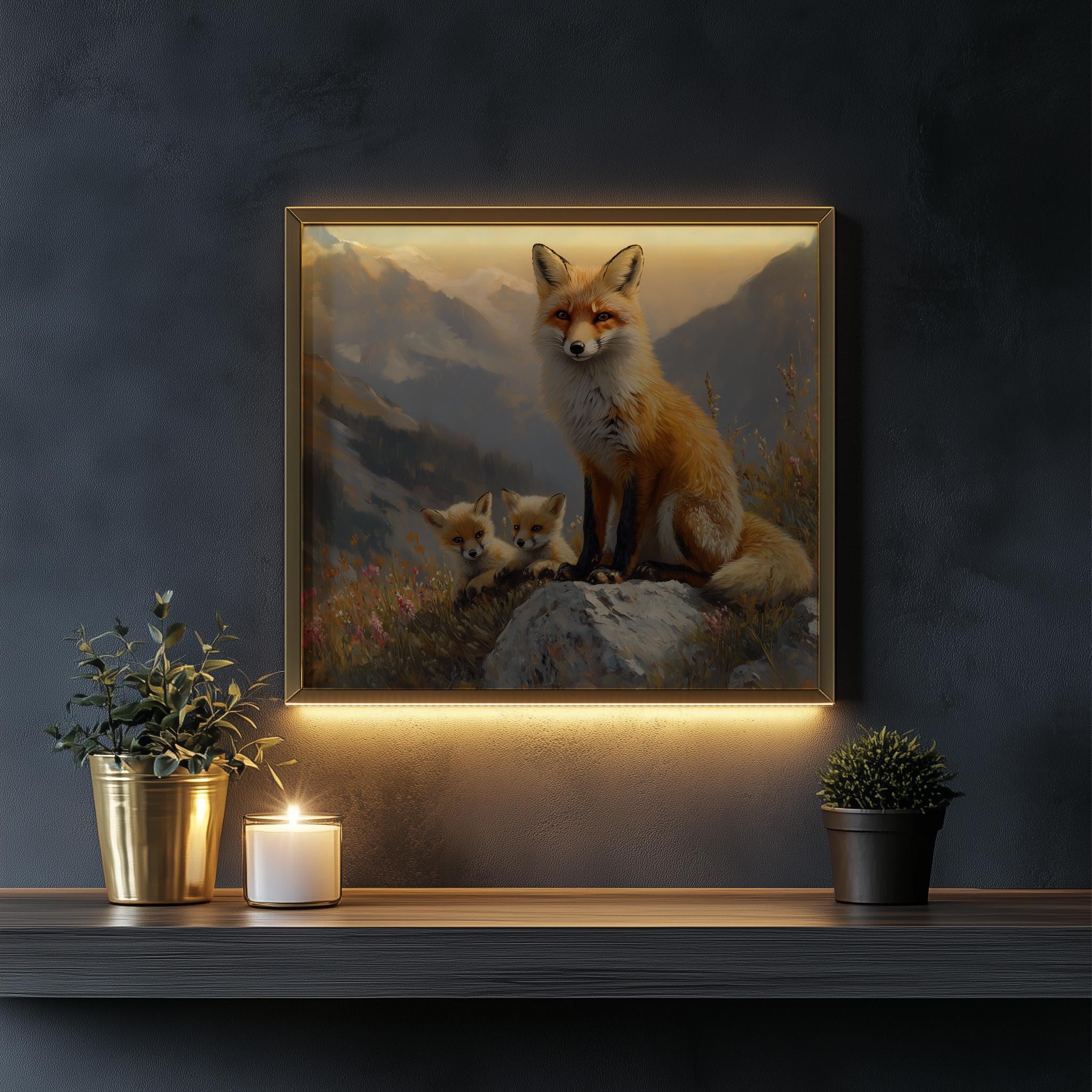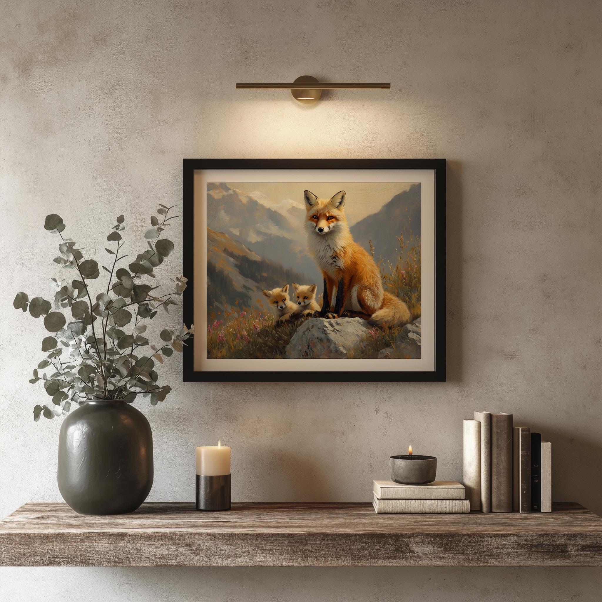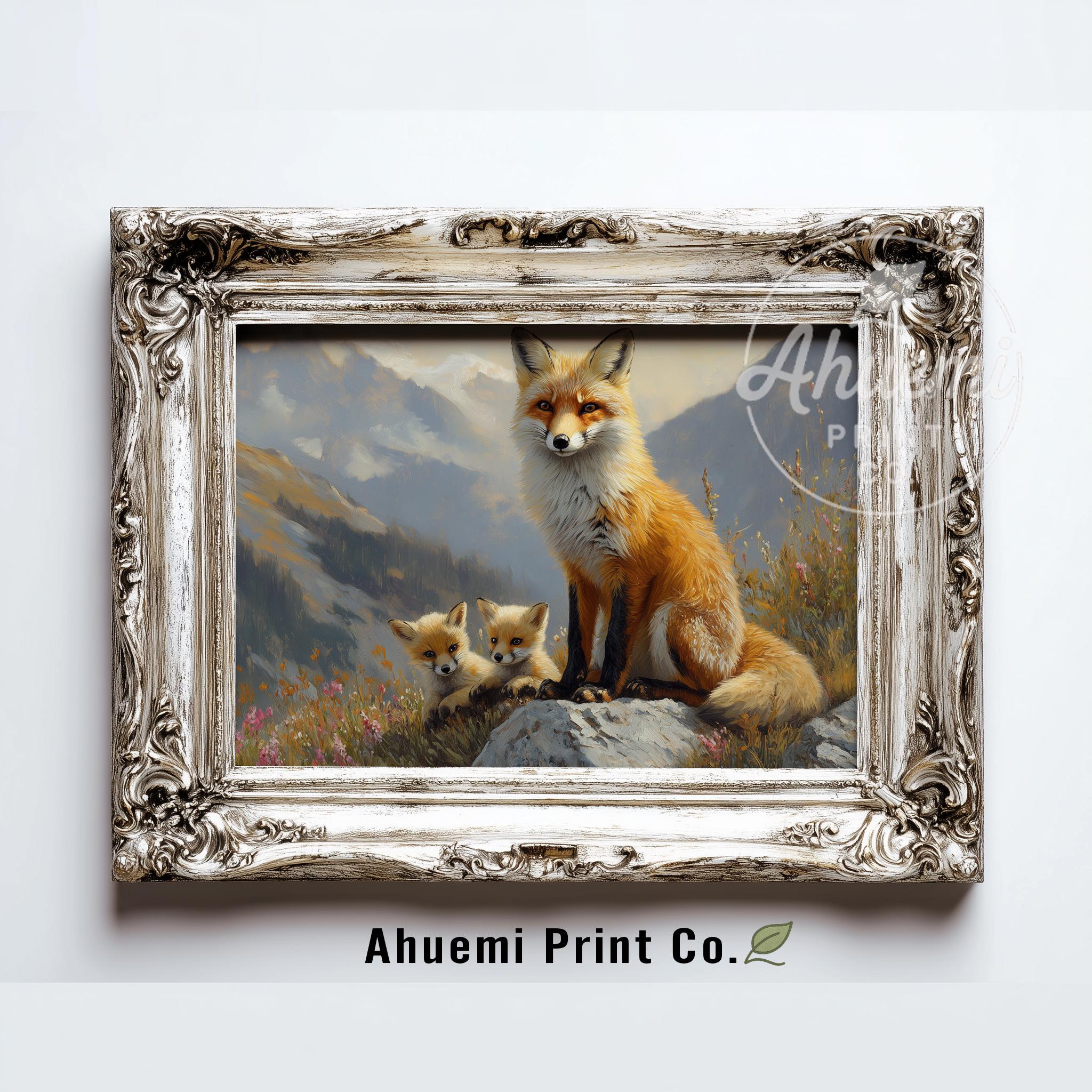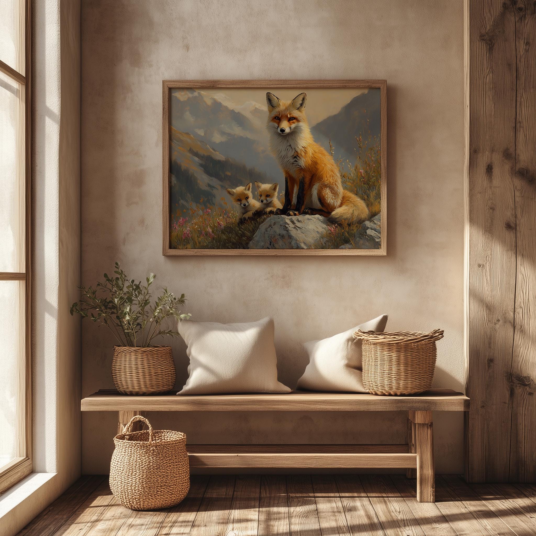 Immerse yourself in the charm with this rustic painting of a Sierra Nevada red fox family nestled in a serene forest landscape. An instantly downloadable print, it's perfect for elevating your decor with budget-friendly charm. This gives you the flexibility to customize the size, frame, and material according to your personal taste and space, ensuring a perfect fit for your walls.