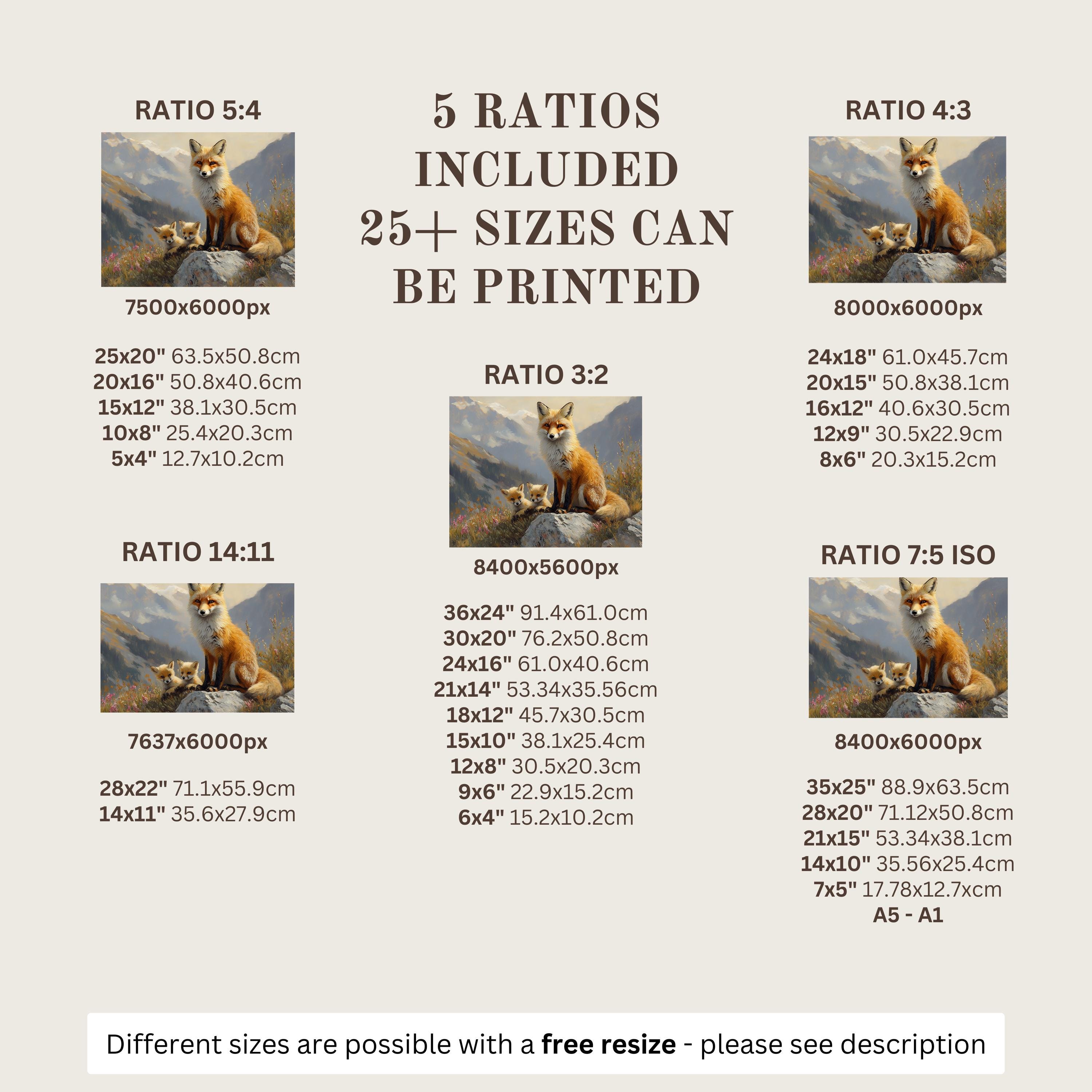 Each artwork includes 5 aspect ratios with 25+ print sizes. Most standard frames are covered. One custom resize per purchase available—message before ordering.