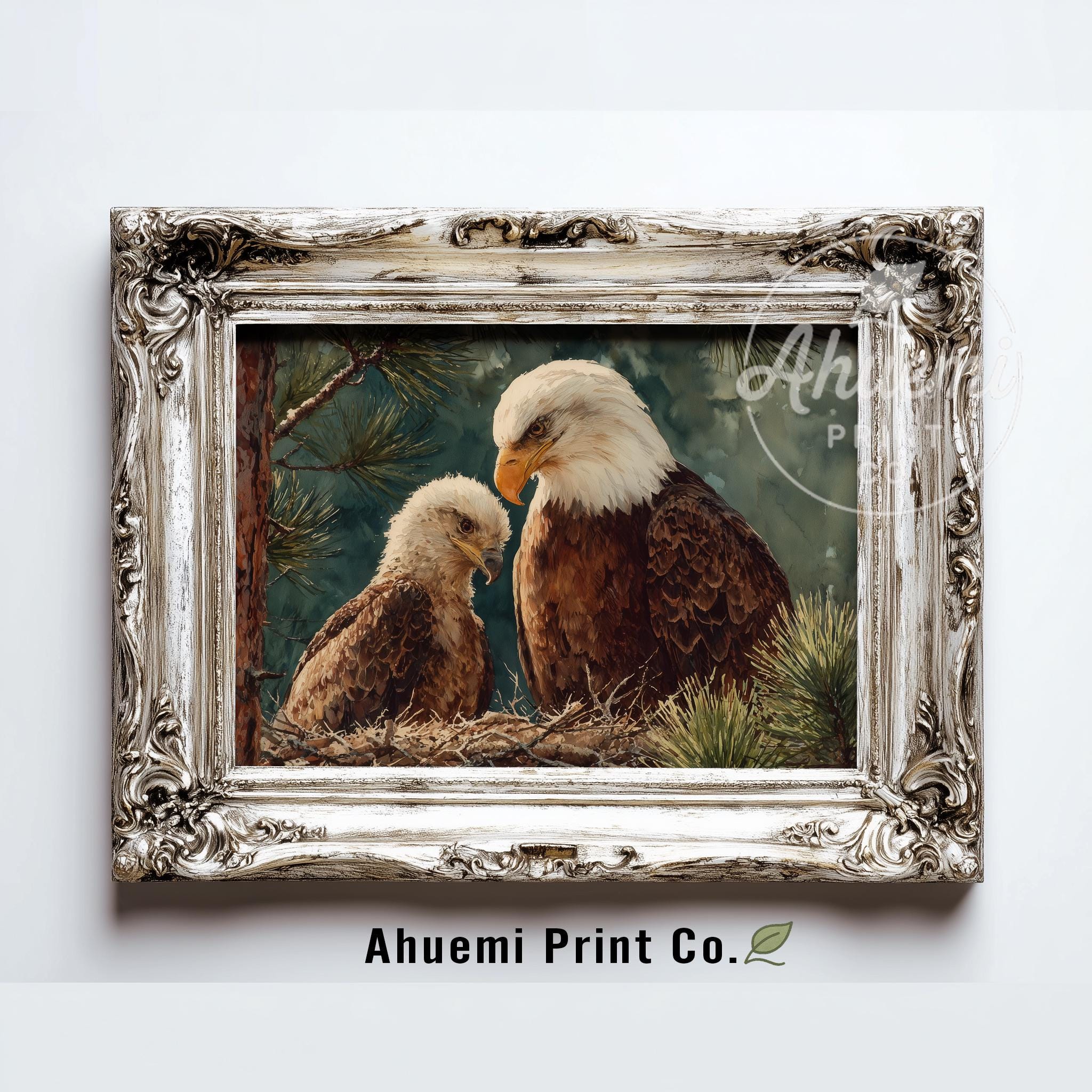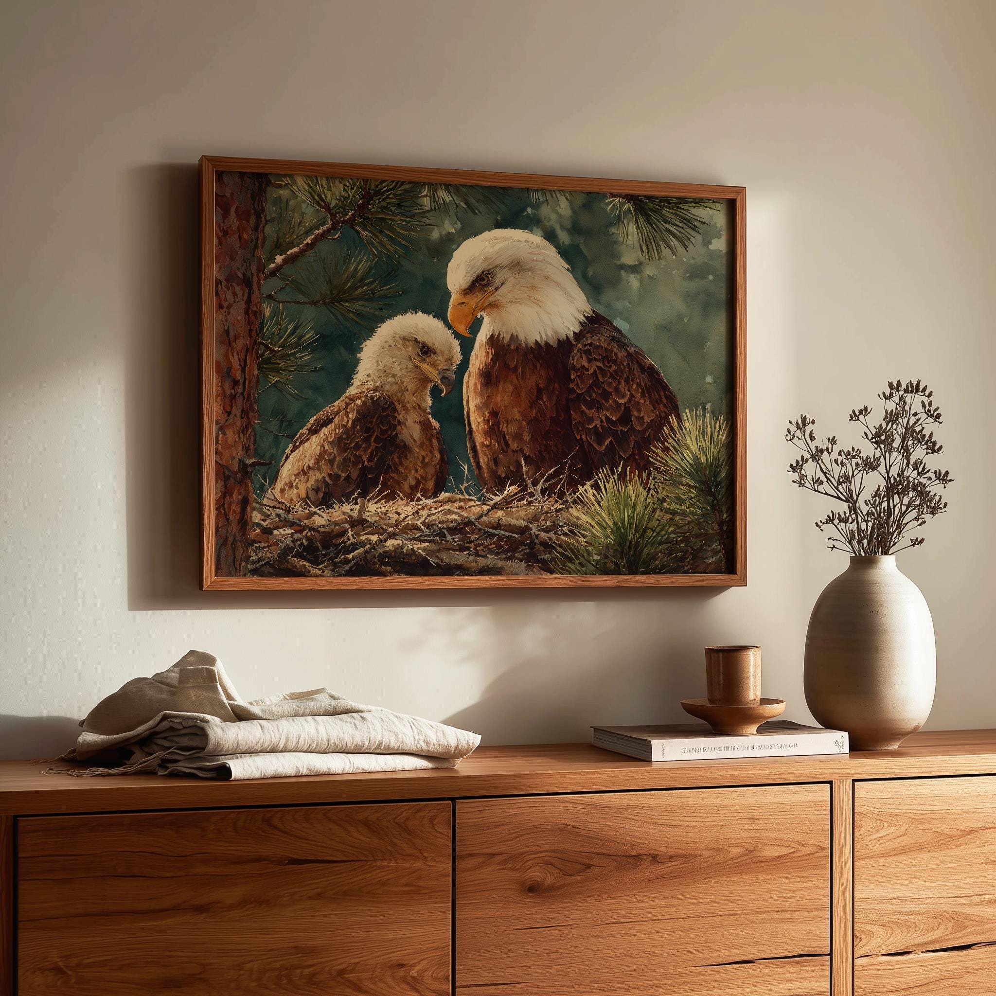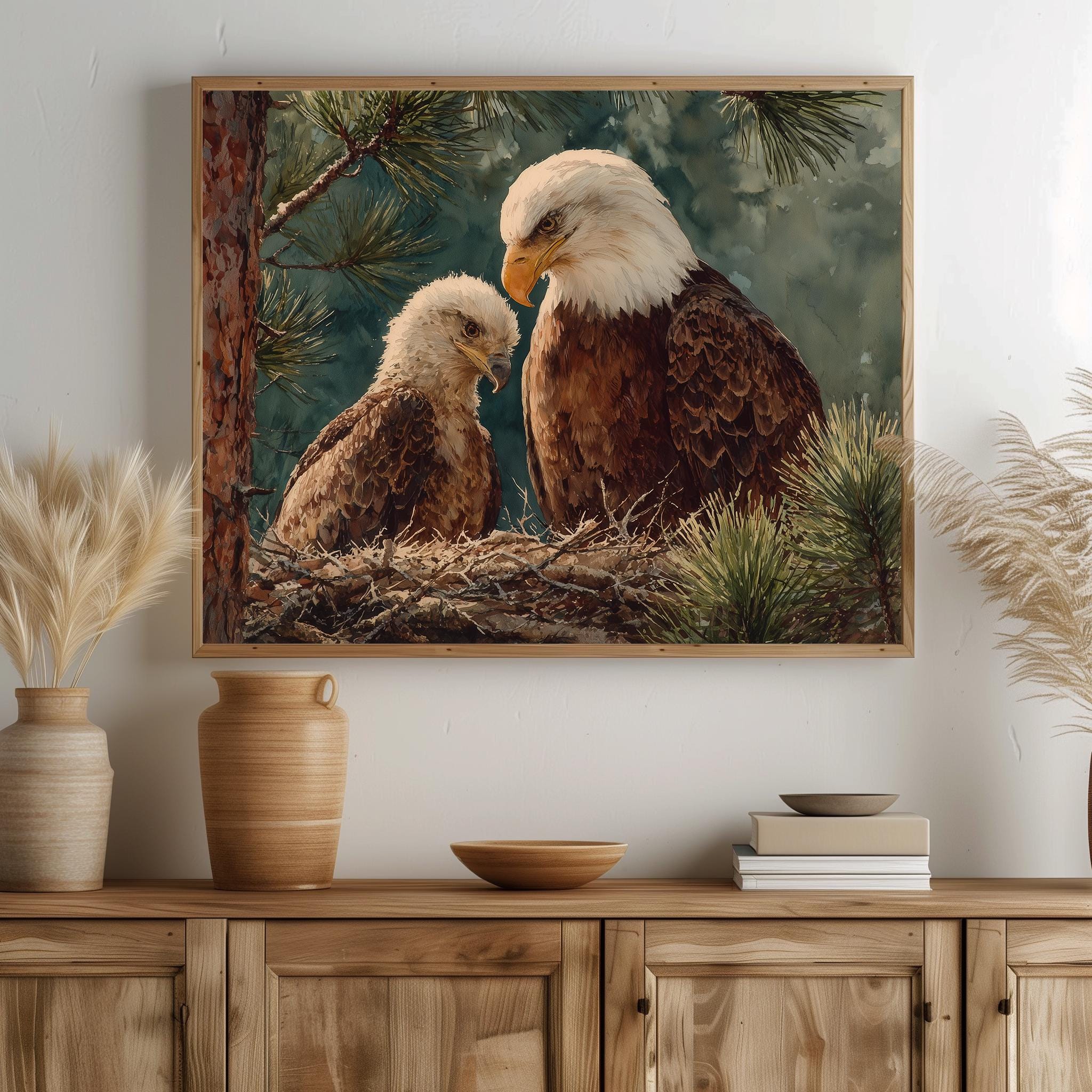 Immerse yourself in the charm with this rustic painting of a bald eagle's nest nestled in a serene forest setting. An instantly downloadable print, it's perfect for elevating your decor with budget-friendly charm. This gives you the flexibility to customize the size, frame, and material according to your personal taste and space, ensuring a perfect fit for your walls.