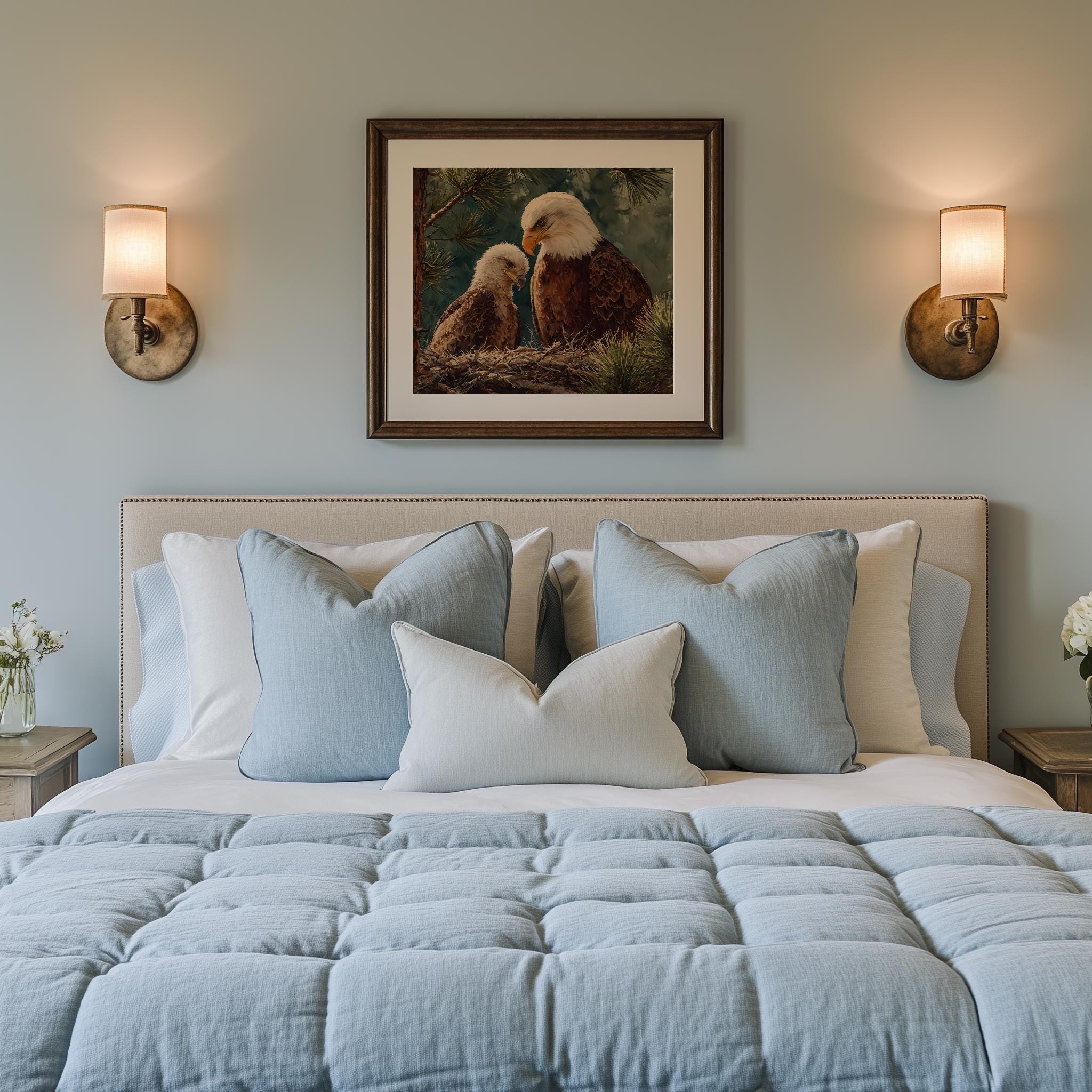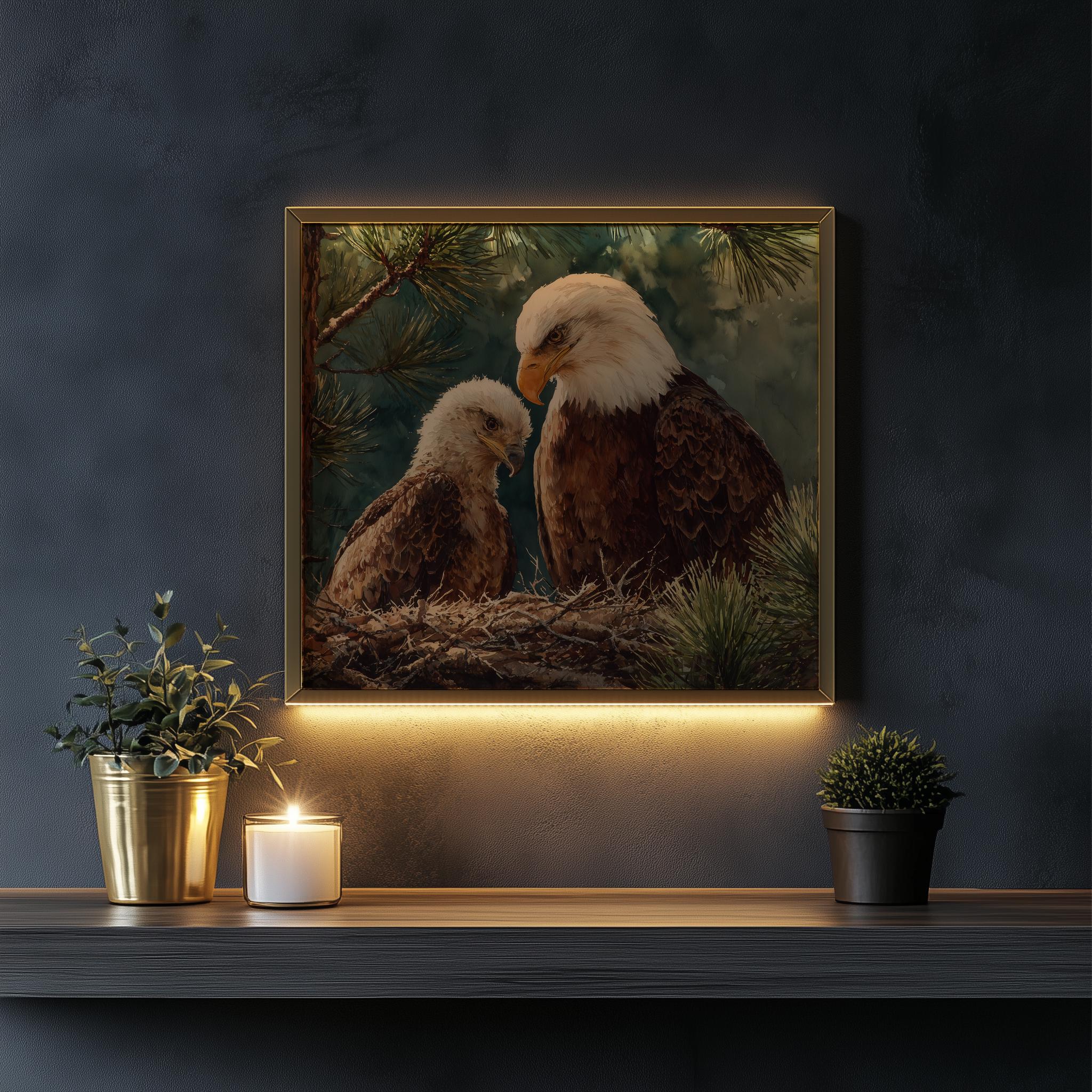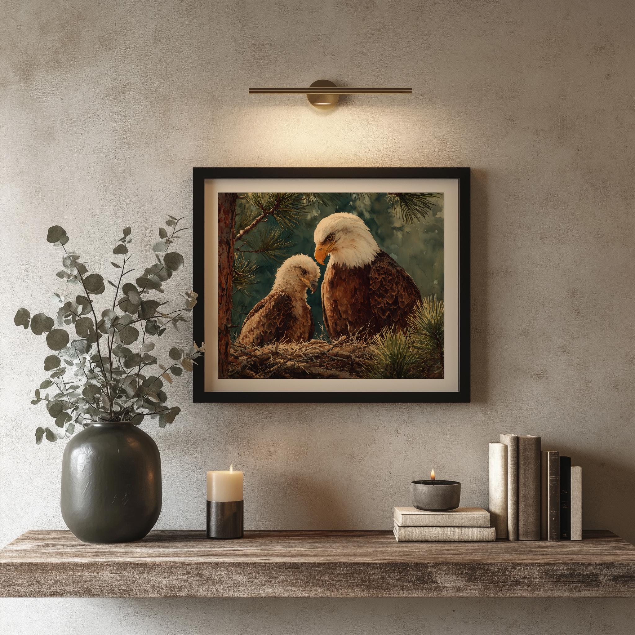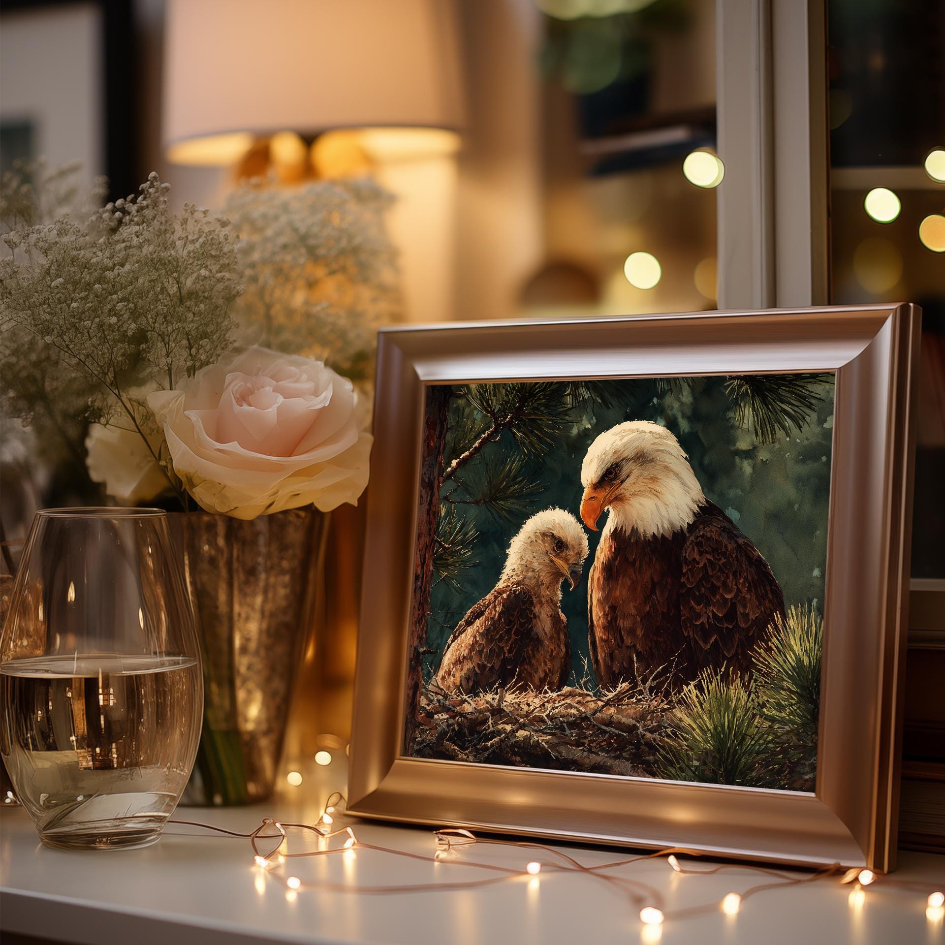 Immerse yourself in the charm with this rustic painting of a bald eagle's nest nestled in a serene forest setting. An instantly downloadable print, it's perfect for elevating your decor with budget-friendly charm. This gives you the flexibility to customize the size, frame, and material according to your personal taste and space, ensuring a perfect fit for your walls.