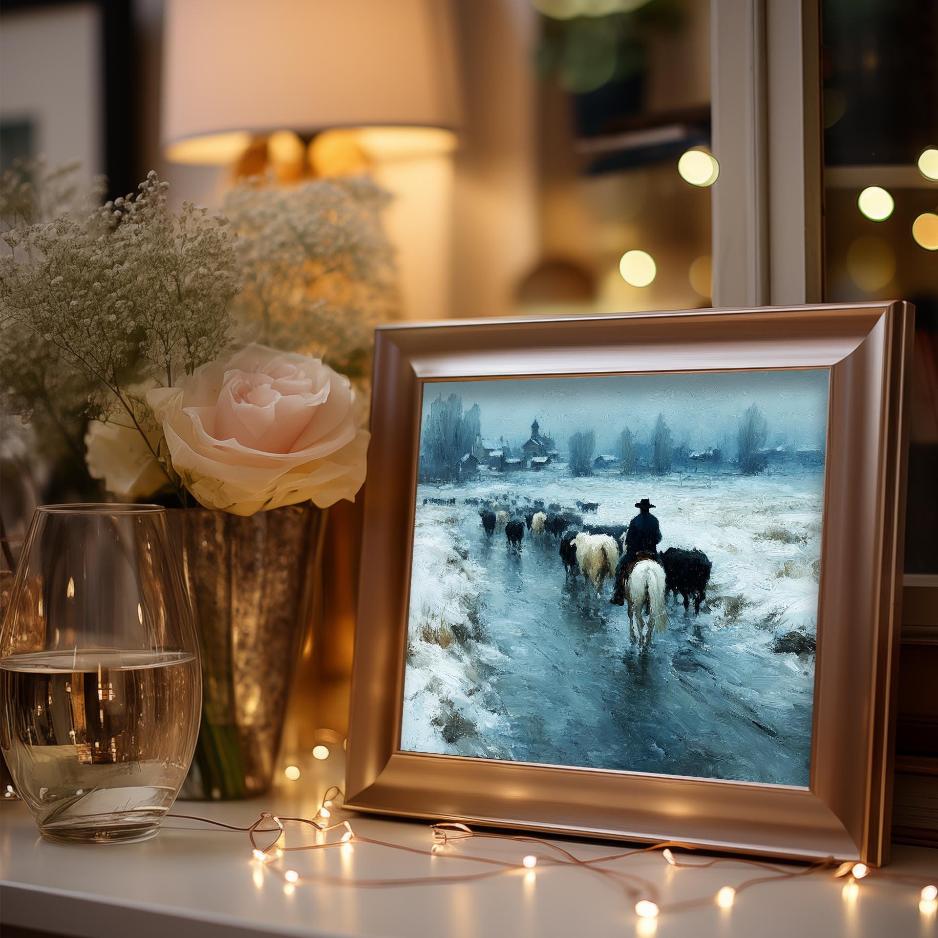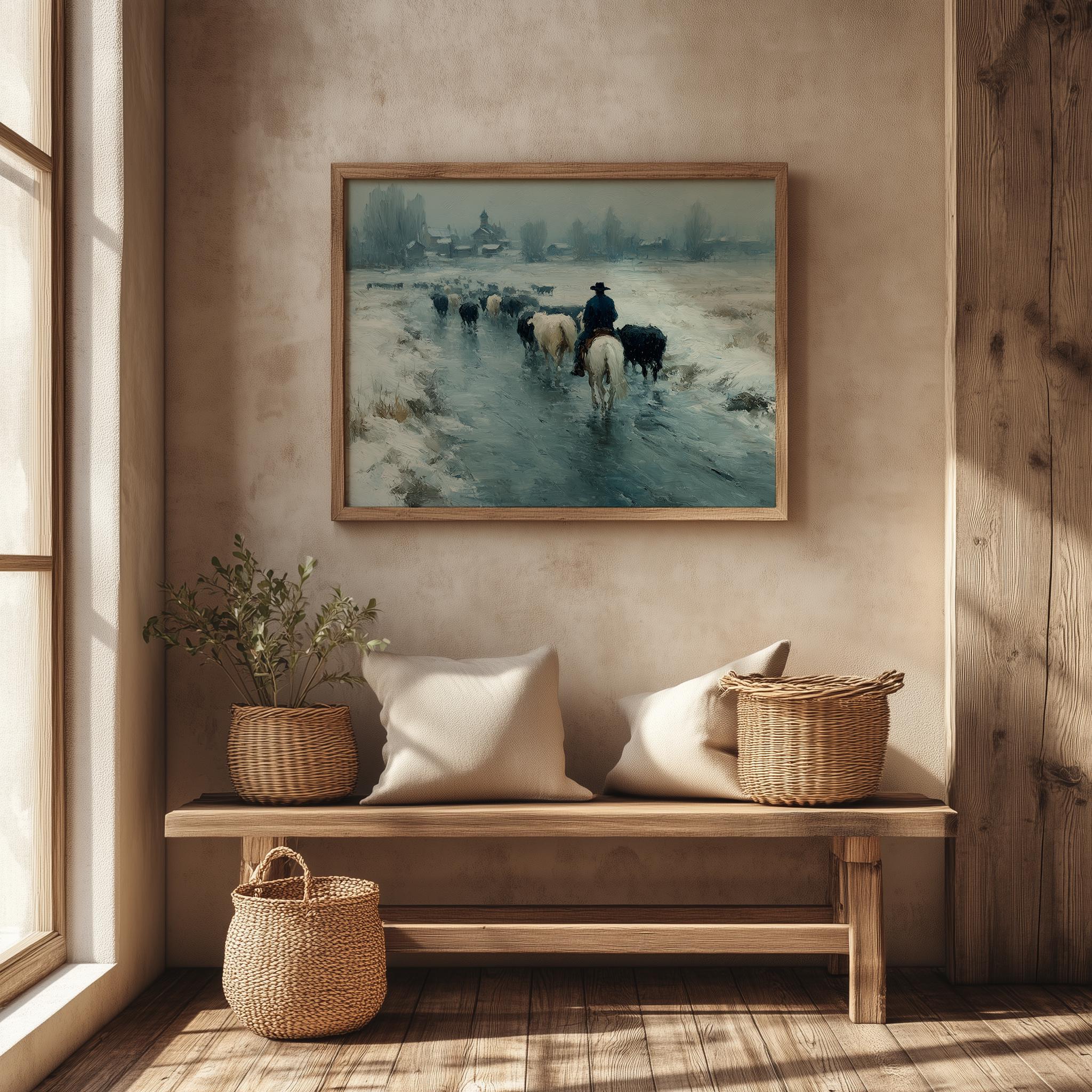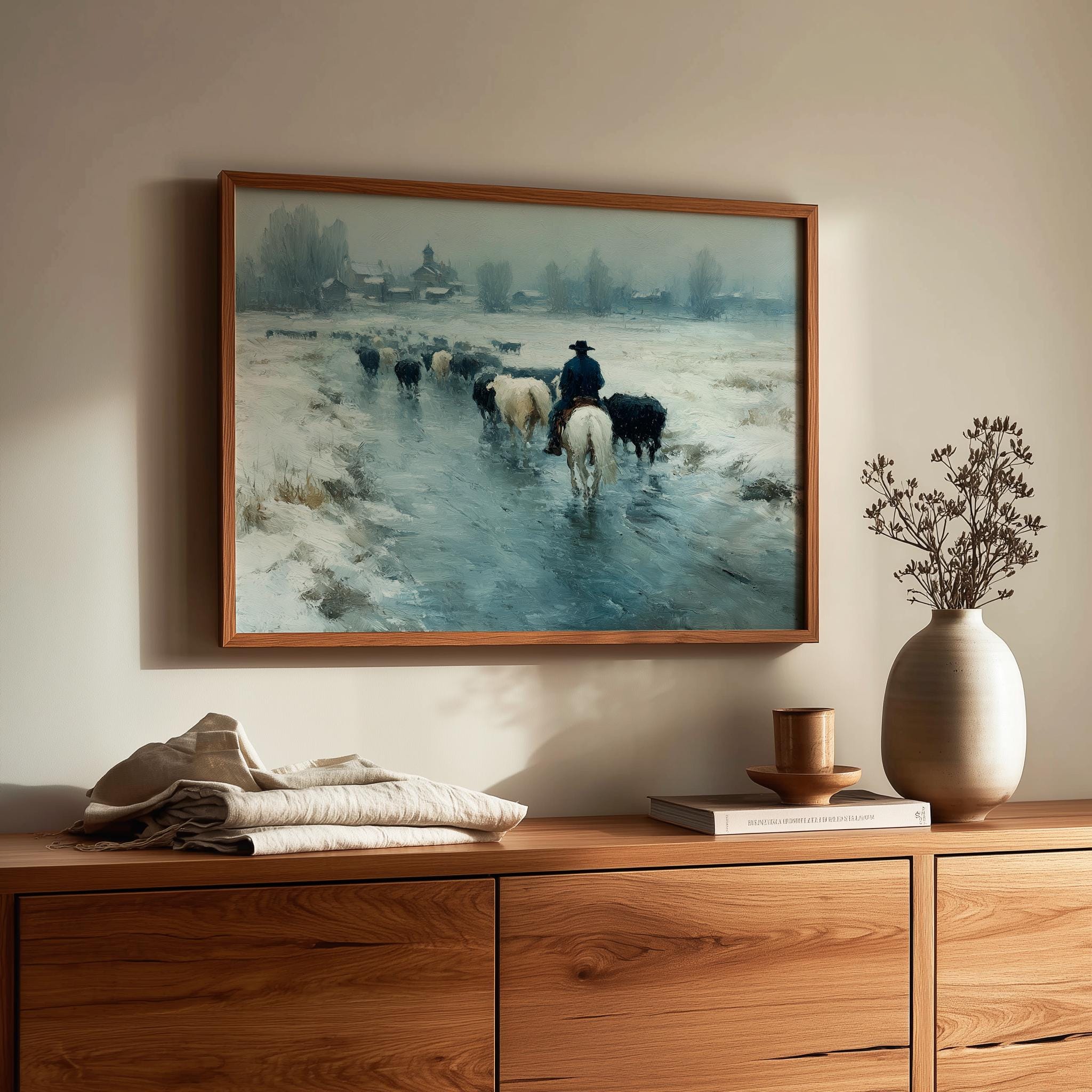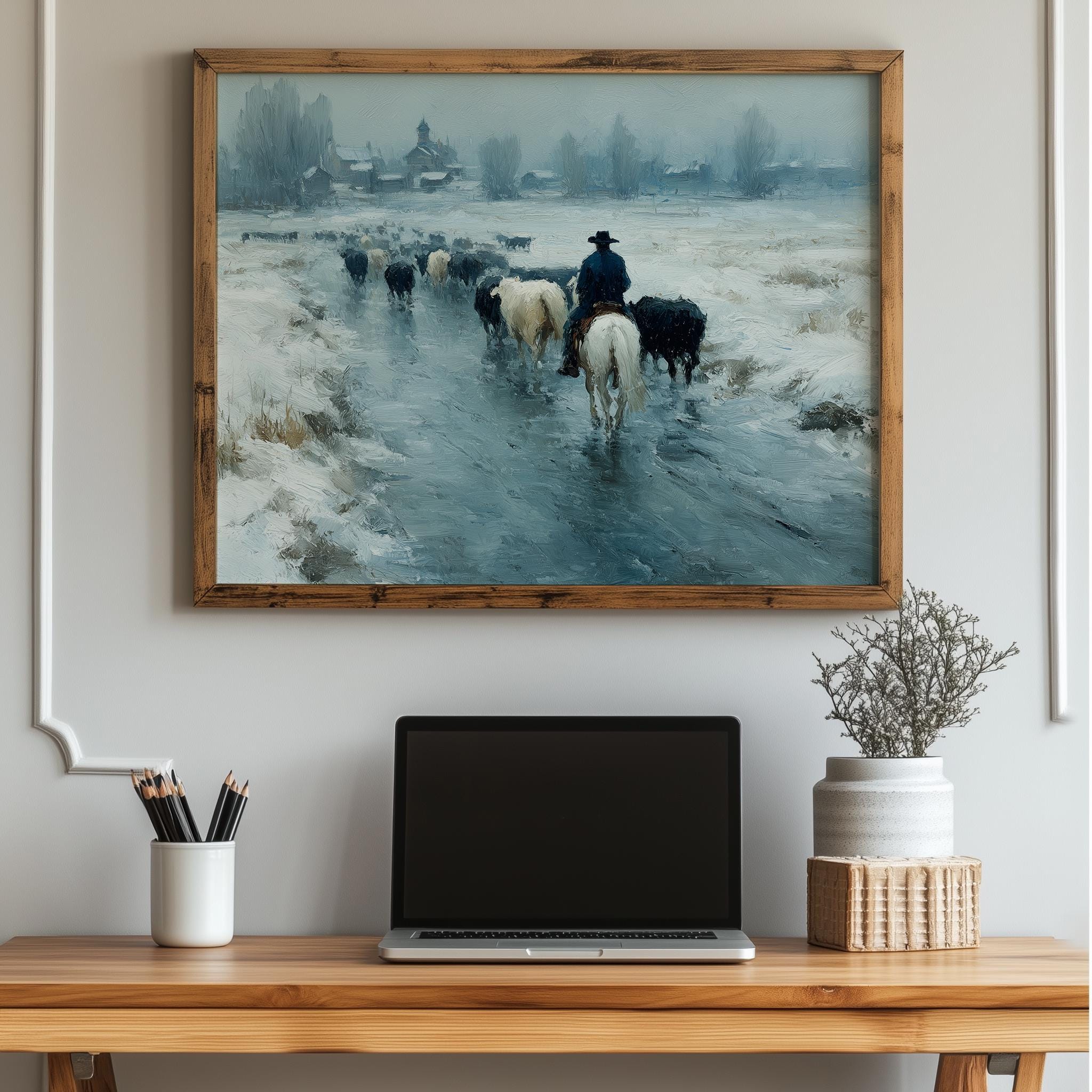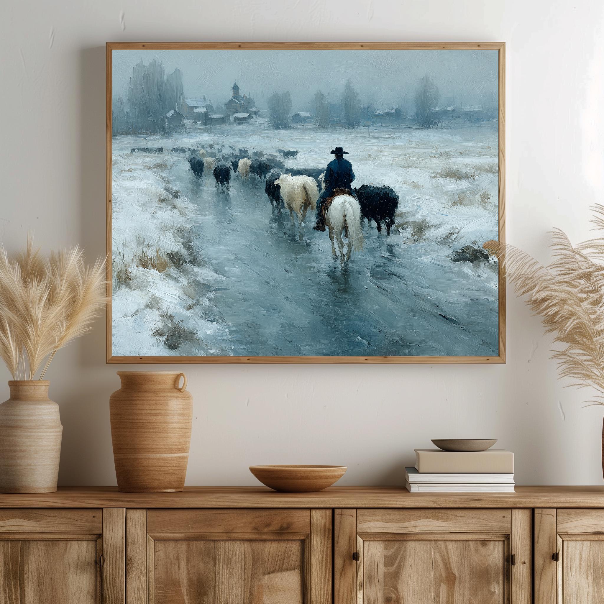 Immerse yourself in the charm with this rustic painting of a cowboy and cattle in a serene winter landscape. An instantly downloadable print, it's perfect for elevating your decor with budget-friendly charm. This gives you the flexibility to customize the size, frame, and material according to your personal taste and space, ensuring a perfect fit for your walls.