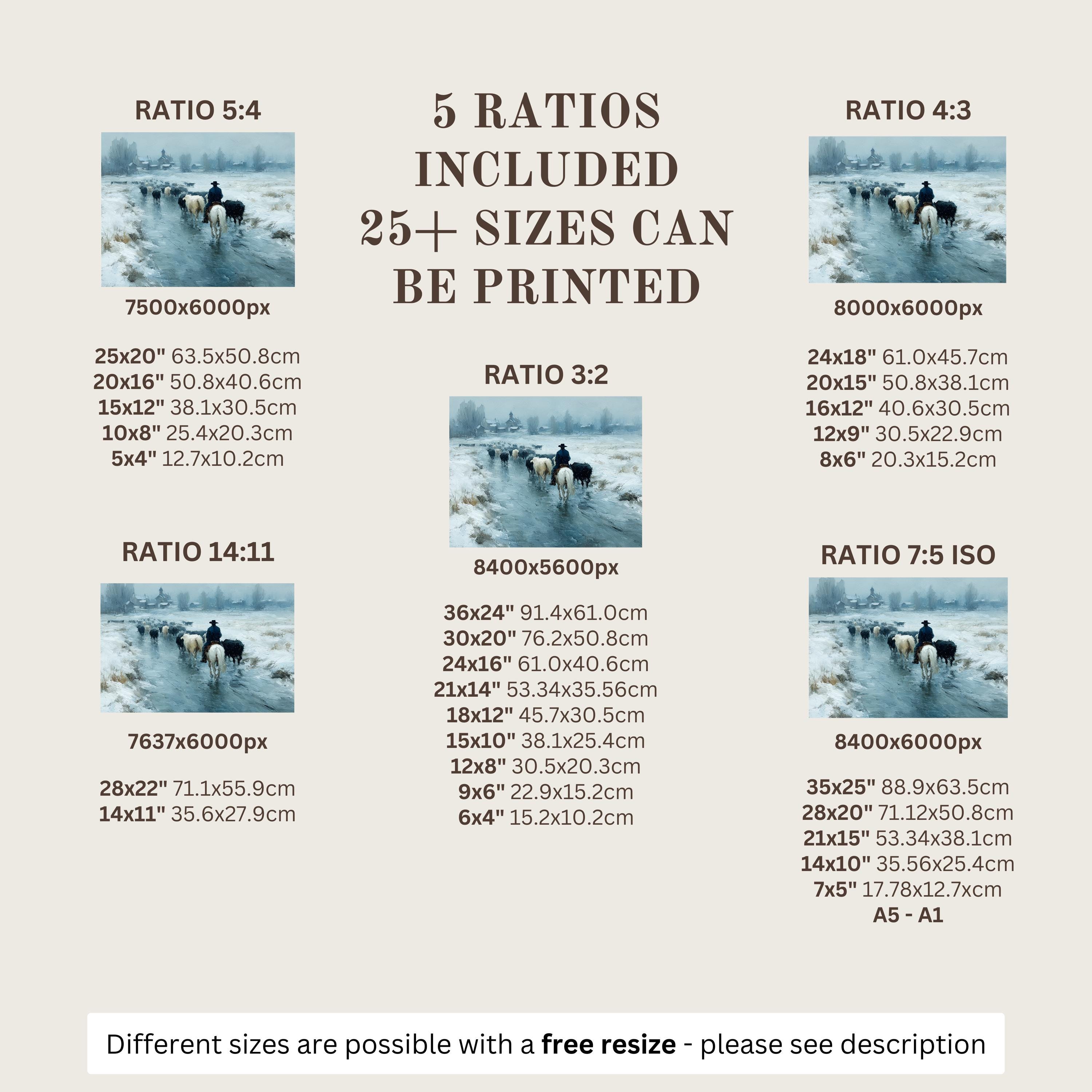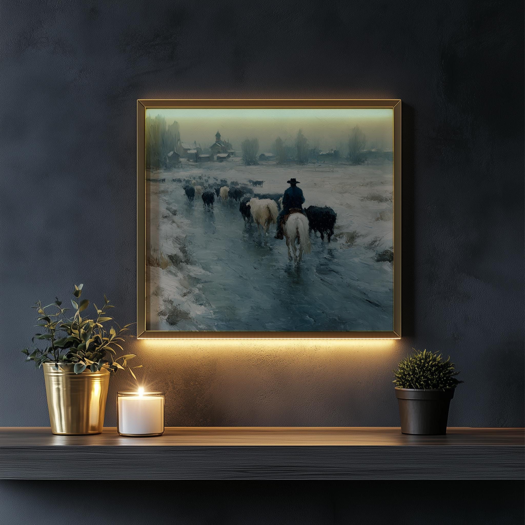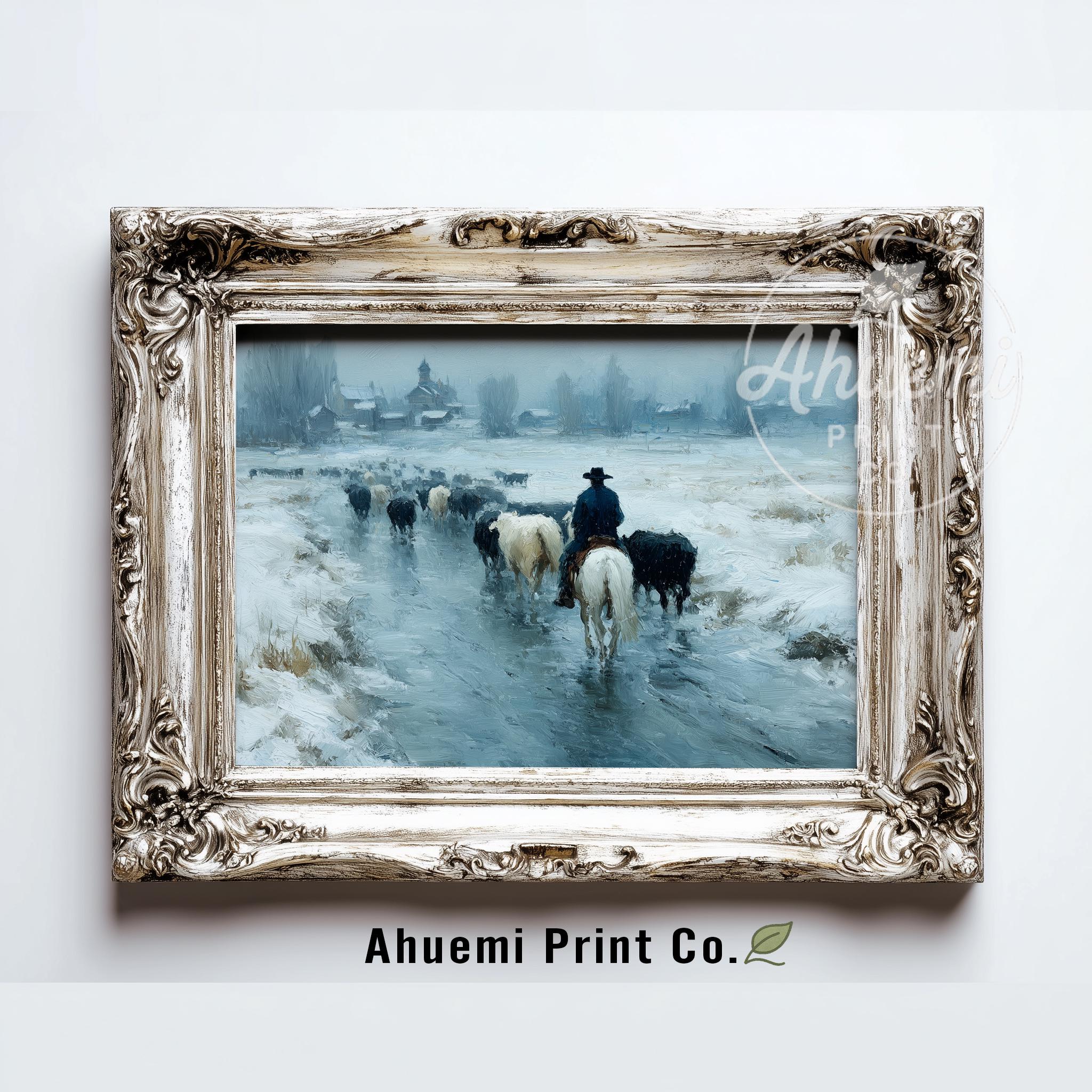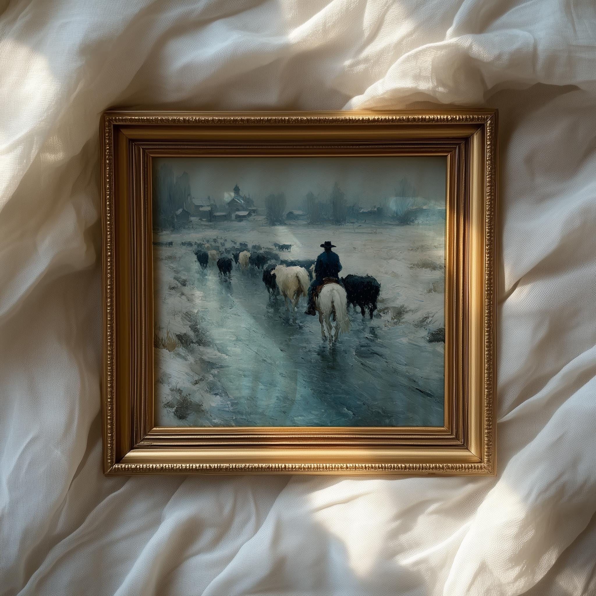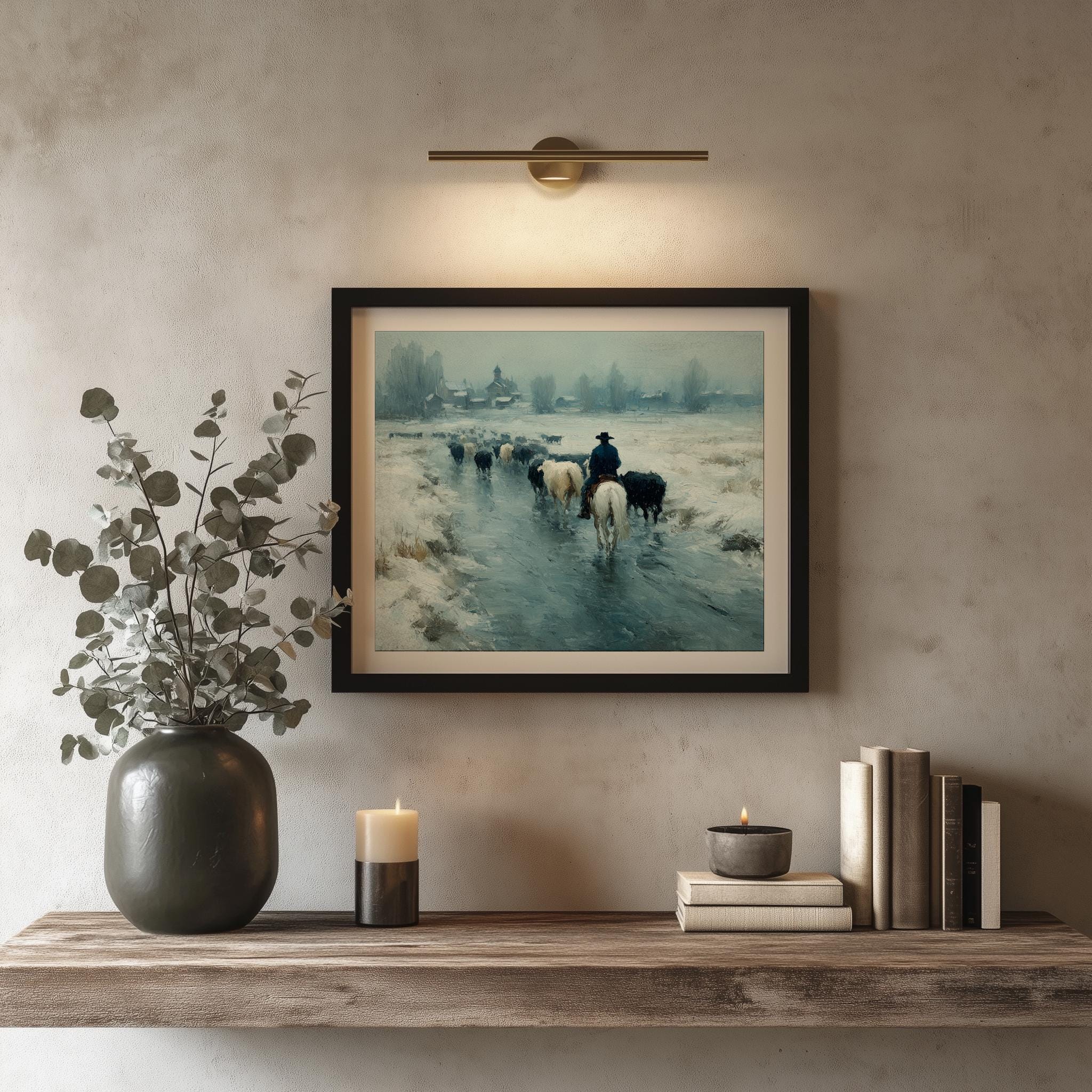 Immerse yourself in the charm with this rustic painting of a cowboy and cattle in a serene winter landscape. An instantly downloadable print, it's perfect for elevating your decor with budget-friendly charm. This gives you the flexibility to customize the size, frame, and material according to your personal taste and space, ensuring a perfect fit for your walls.