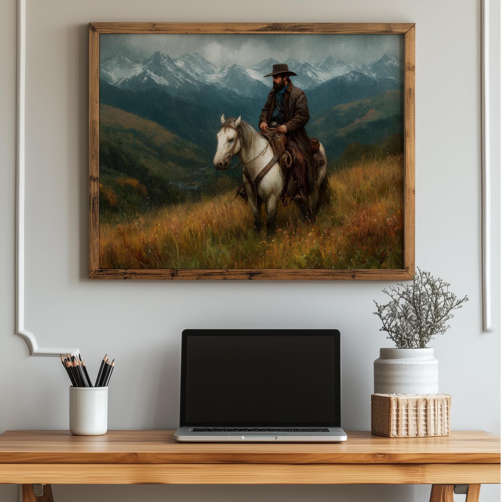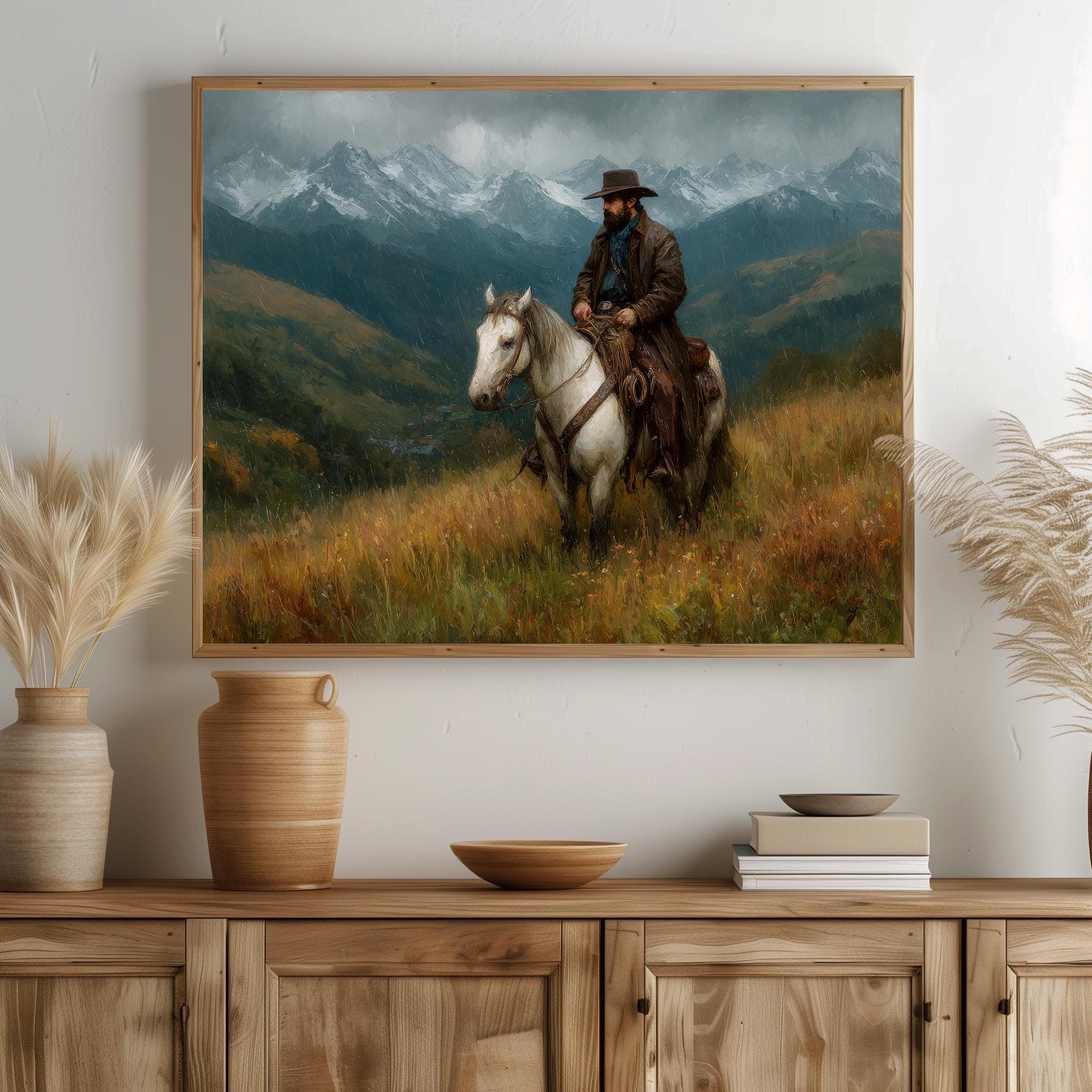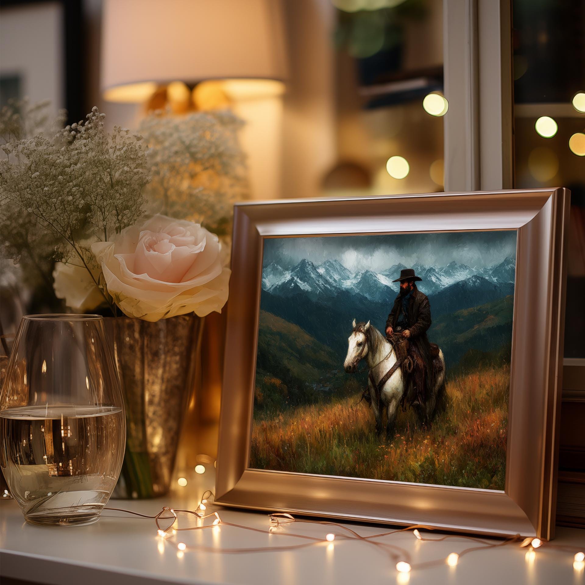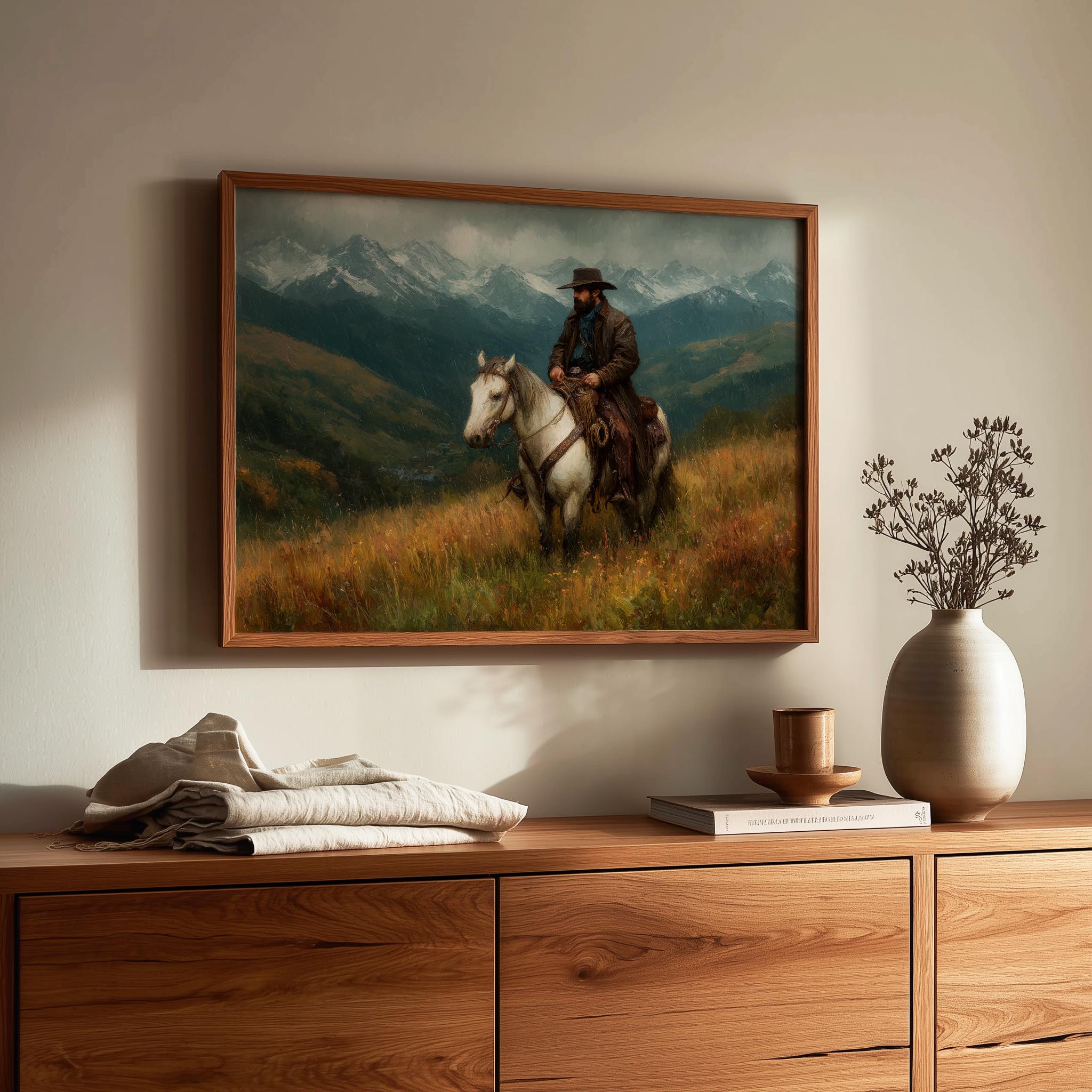 Immerse yourself in the charm with this rustic painting of a lone cowboy riding a majestic white horse through a serene autumn landscape. An instantly downloadable print, it's perfect for elevating your decor with budget-friendly charm. This gives you the flexibility to customize the size, frame, and material according to your personal taste and space, ensuring a perfect fit for your walls.