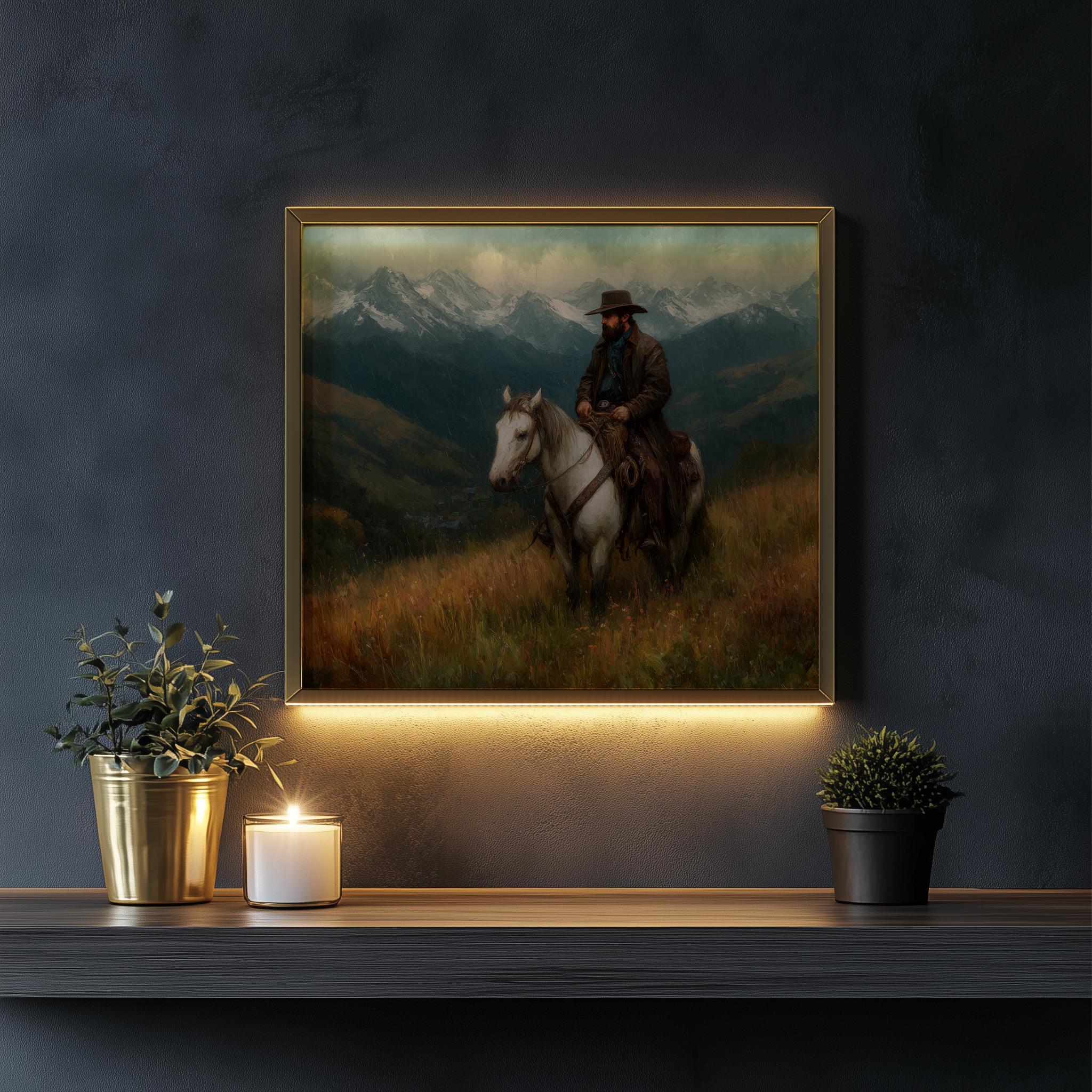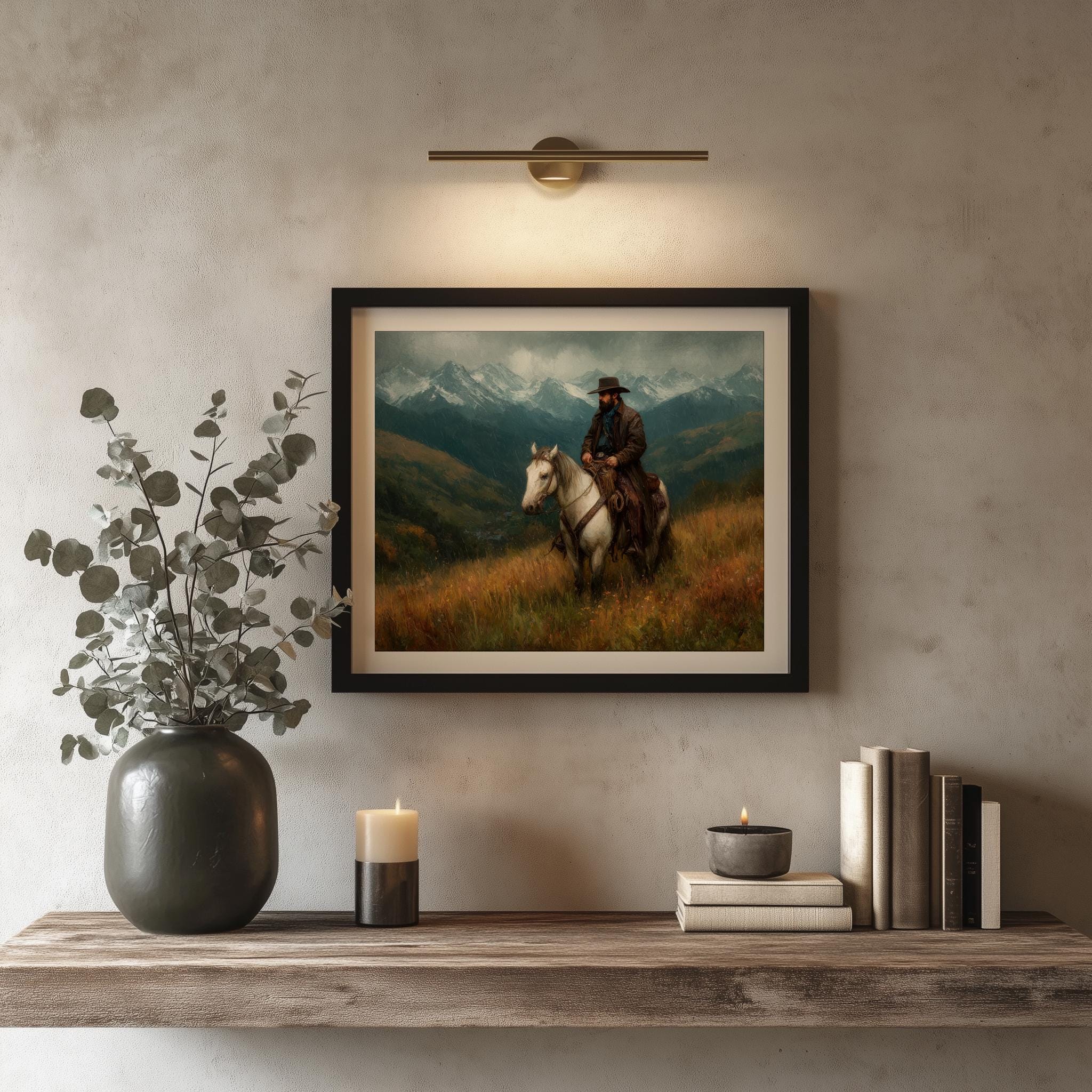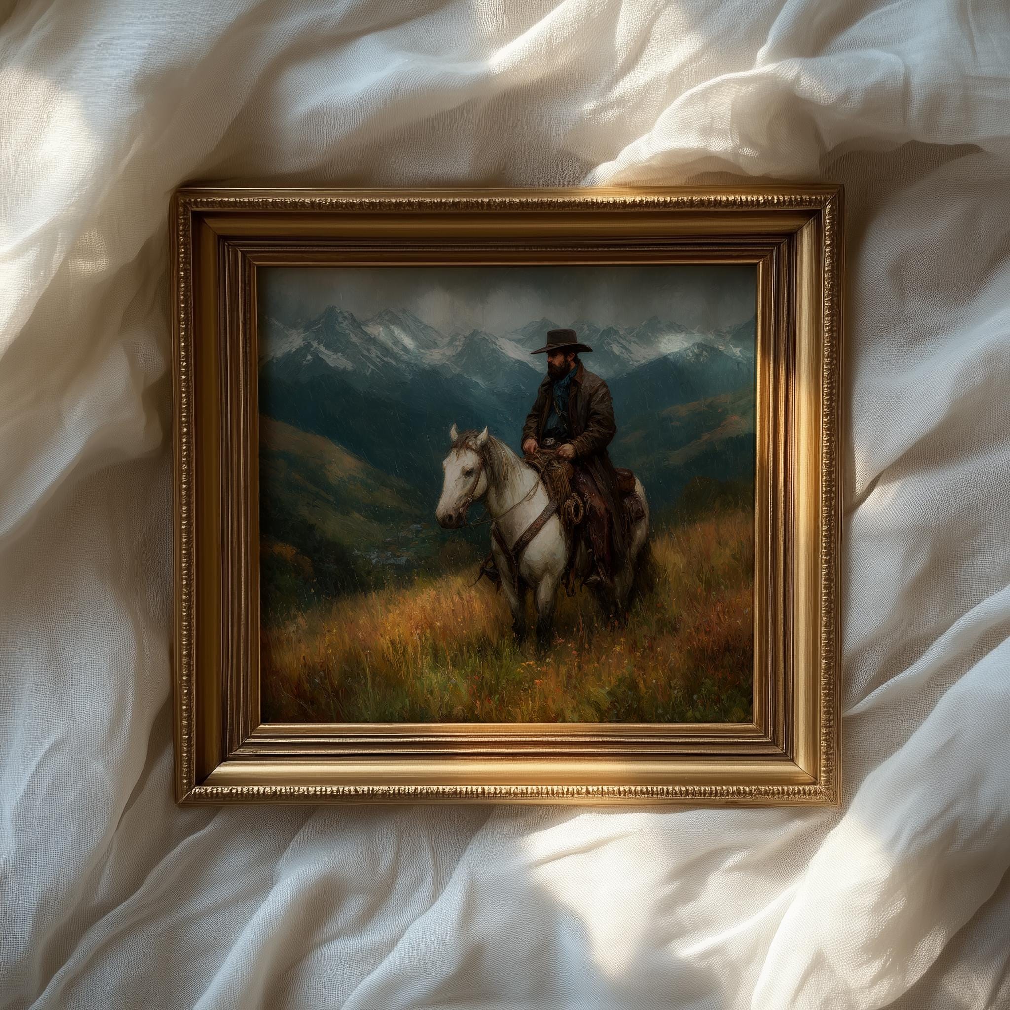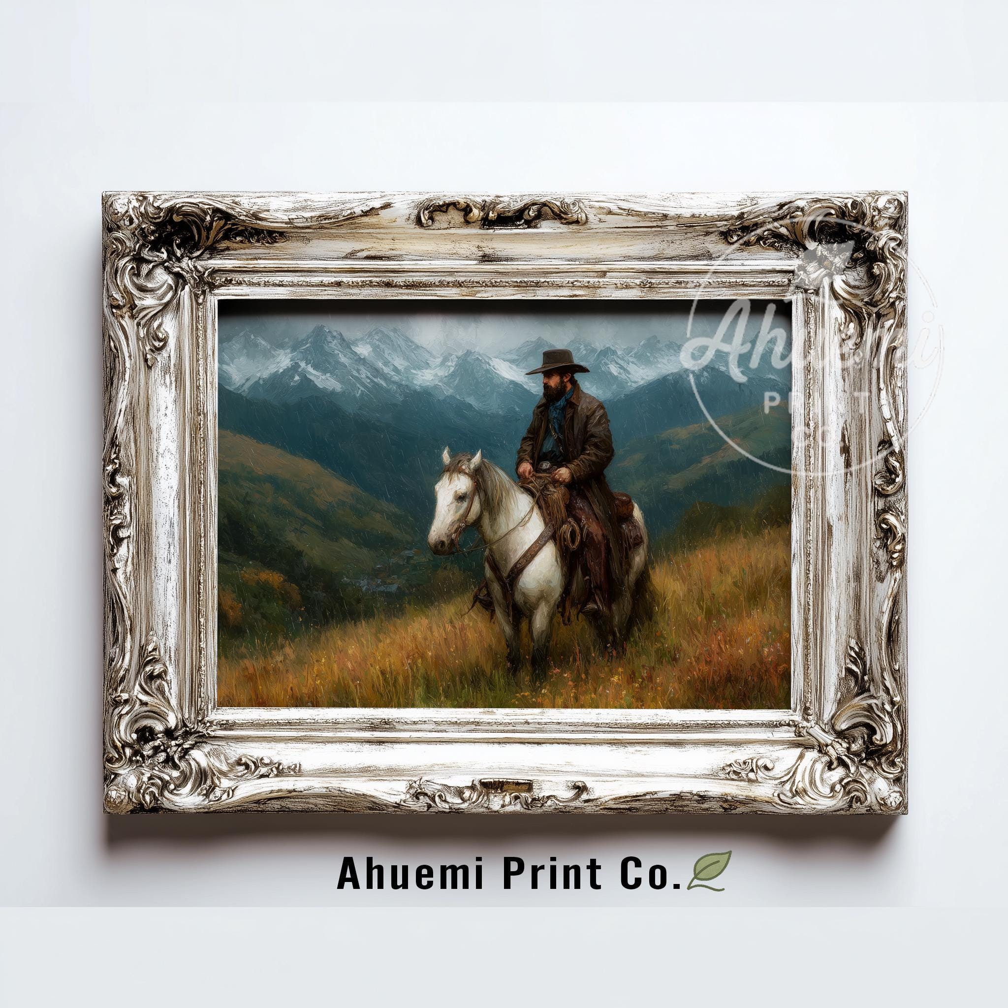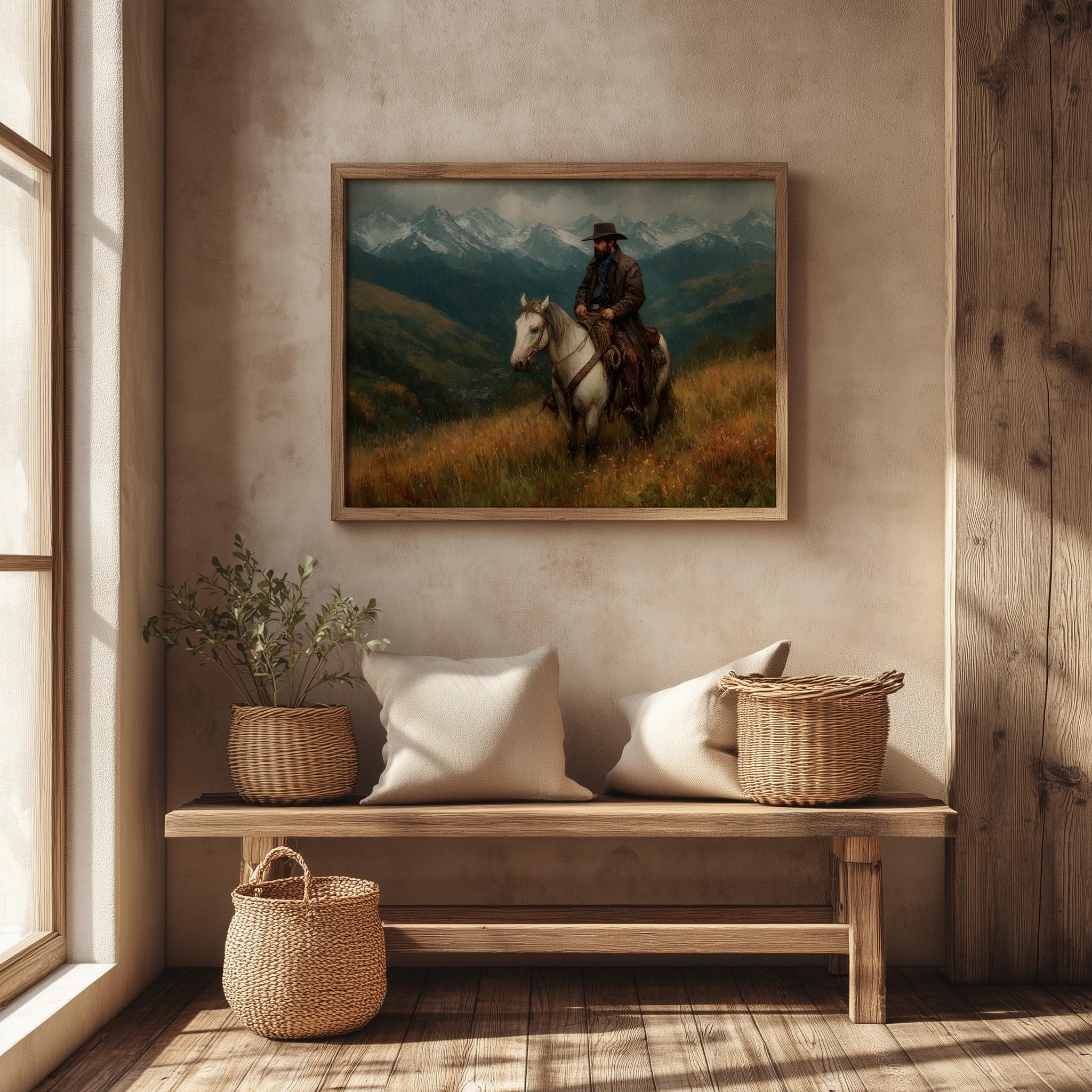 Immerse yourself in the charm with this rustic painting of a lone cowboy riding a majestic white horse through a serene autumn landscape. An instantly downloadable print, it's perfect for elevating your decor with budget-friendly charm. This gives you the flexibility to customize the size, frame, and material according to your personal taste and space, ensuring a perfect fit for your walls.