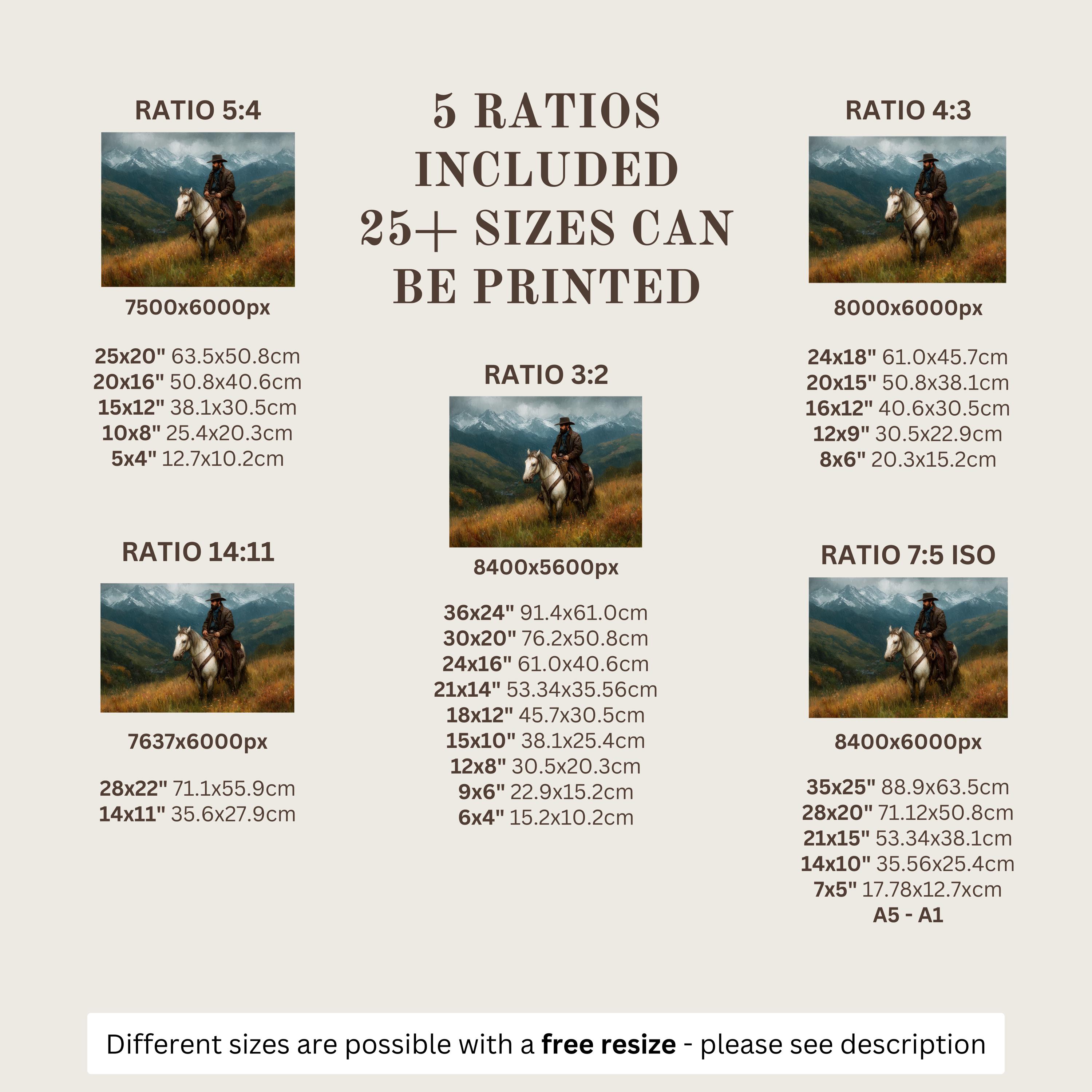 Each artwork includes 5 aspect ratios with 25+ print sizes. Most standard frames are covered. One custom resize per purchase available—message before ordering.