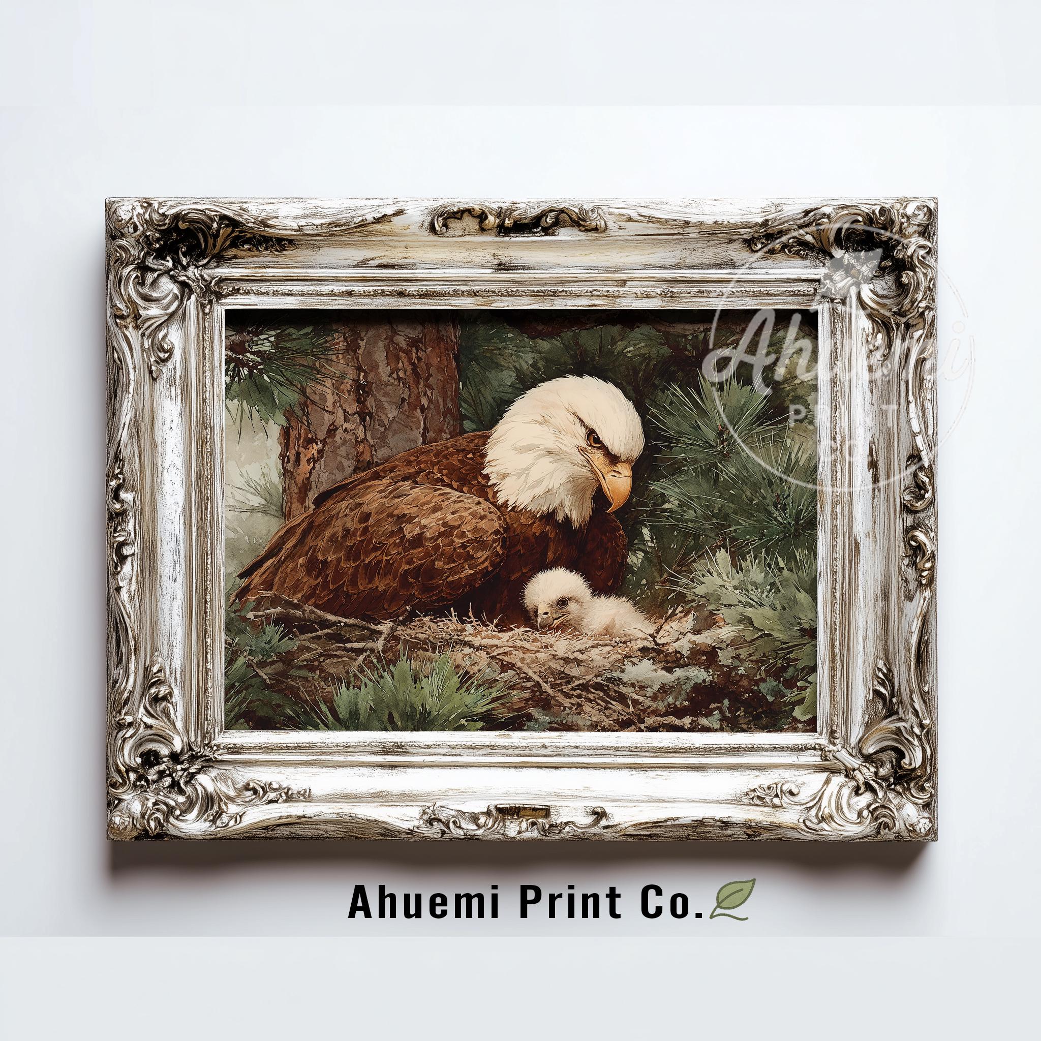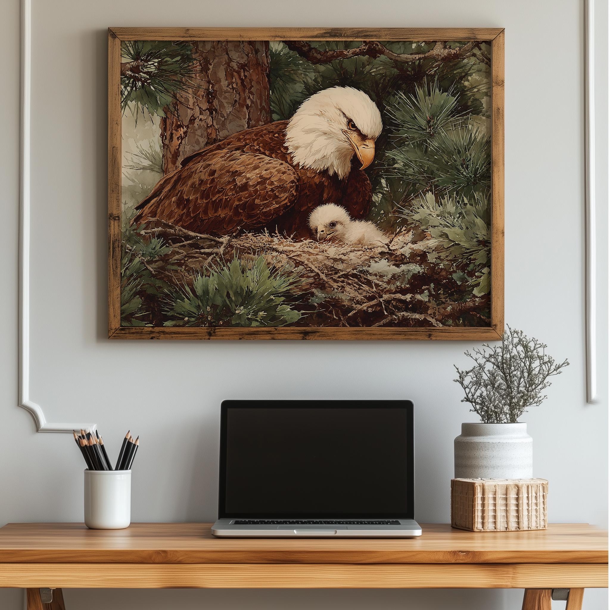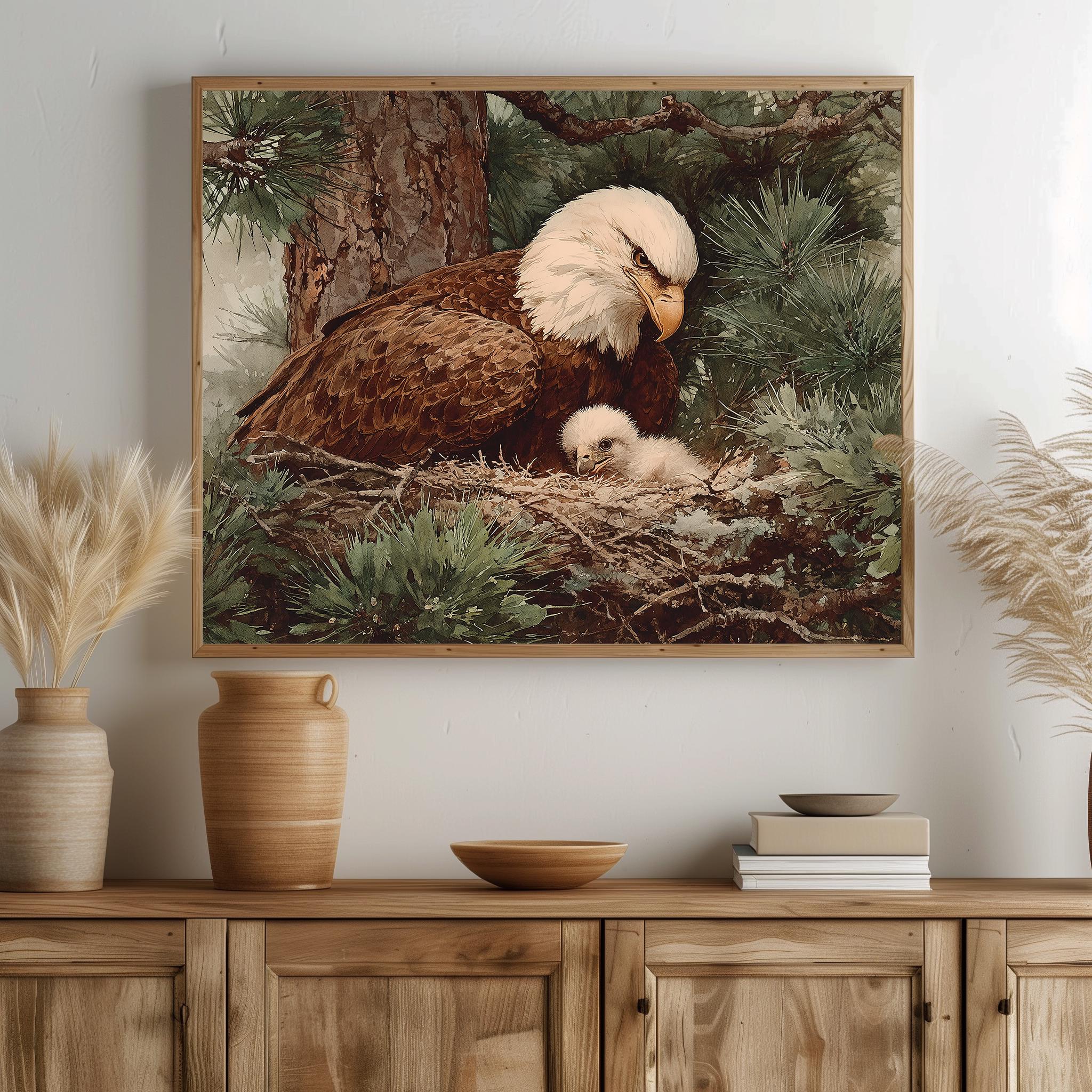 Immerse yourself in the charm with this rustic painting of a majestic bald eagle feeding its eaglet. An instantly downloadable print, it's perfect for elevating your decor with budget-friendly charm. This gives you the flexibility to customize the size, frame, and material according to your personal taste and space, ensuring a perfect fit for your walls.