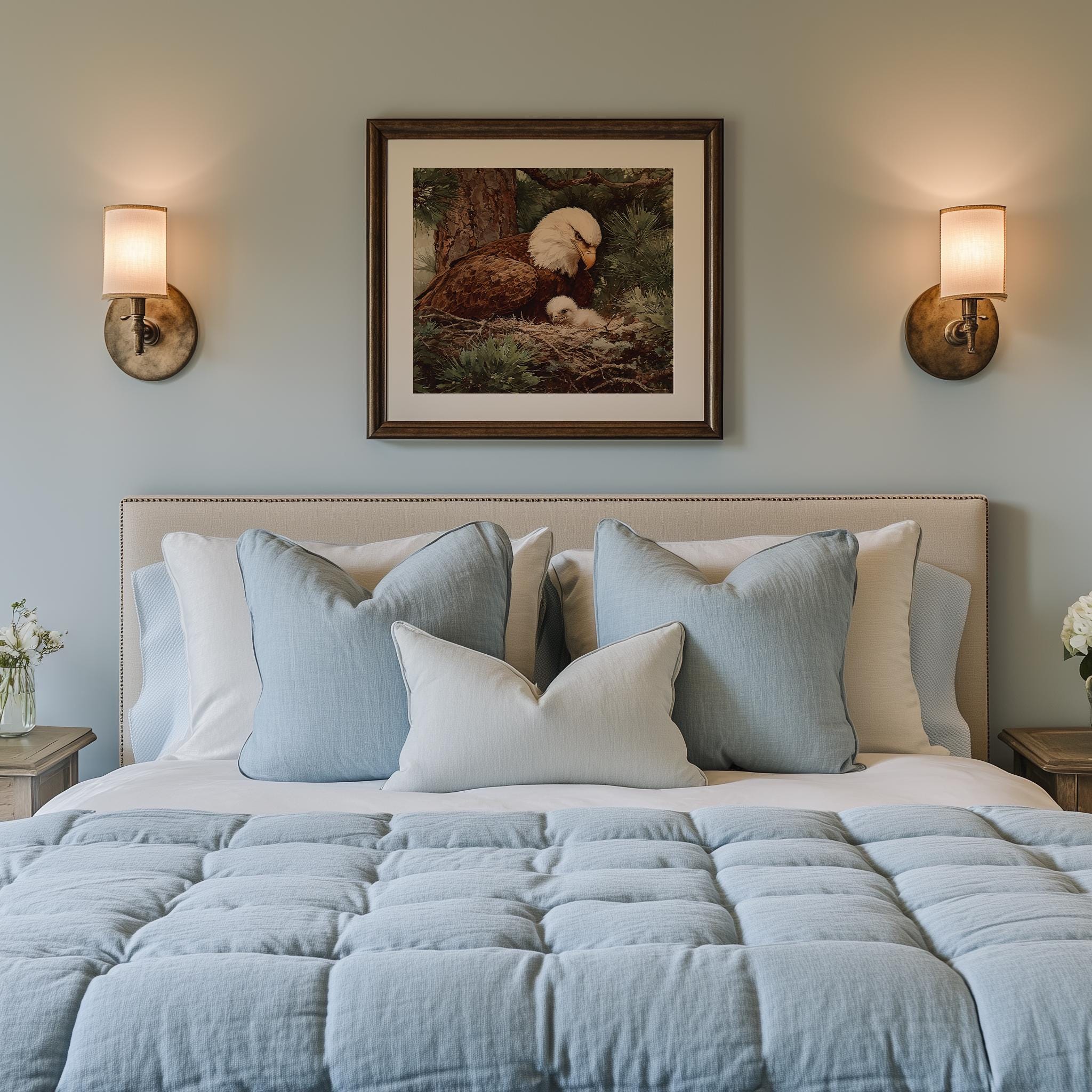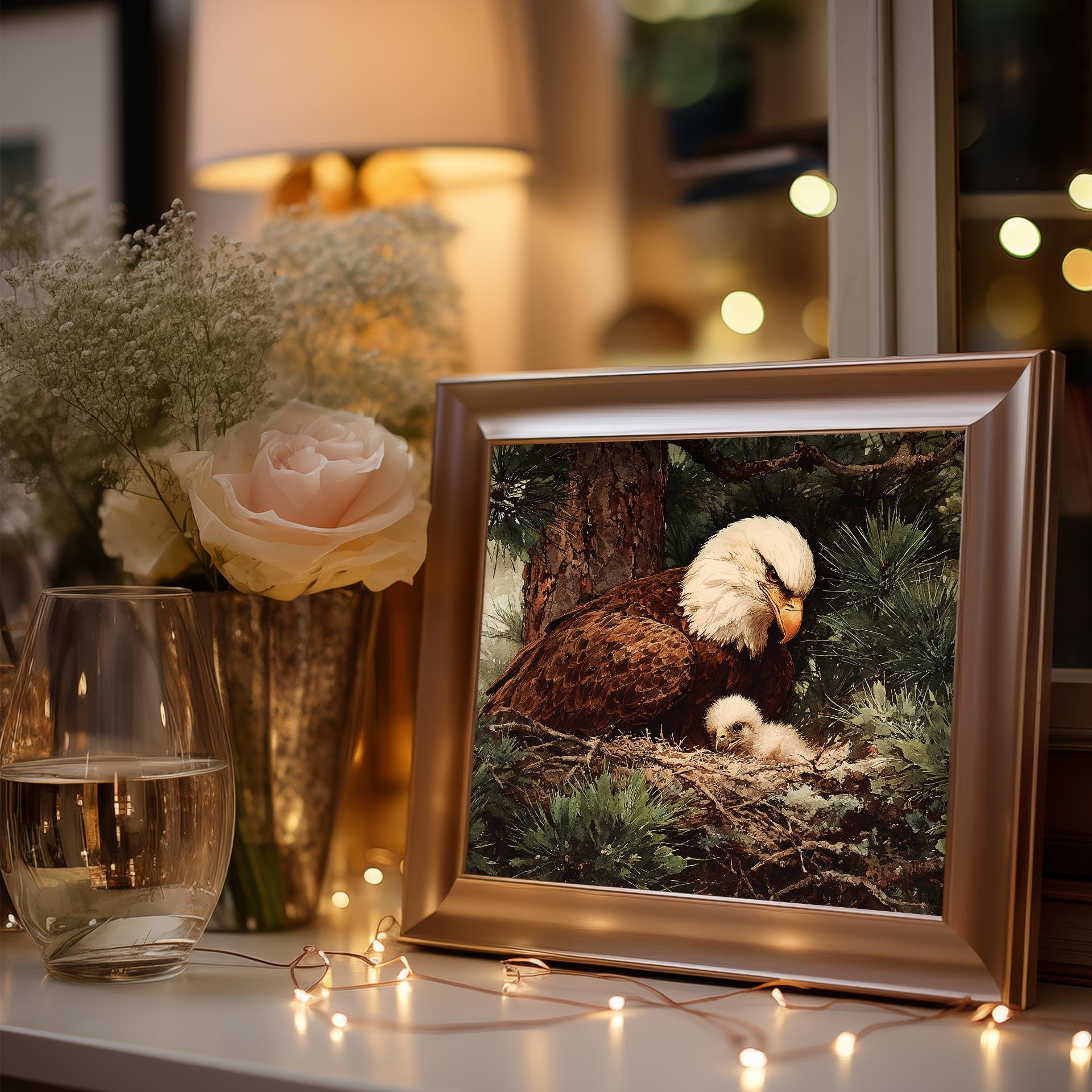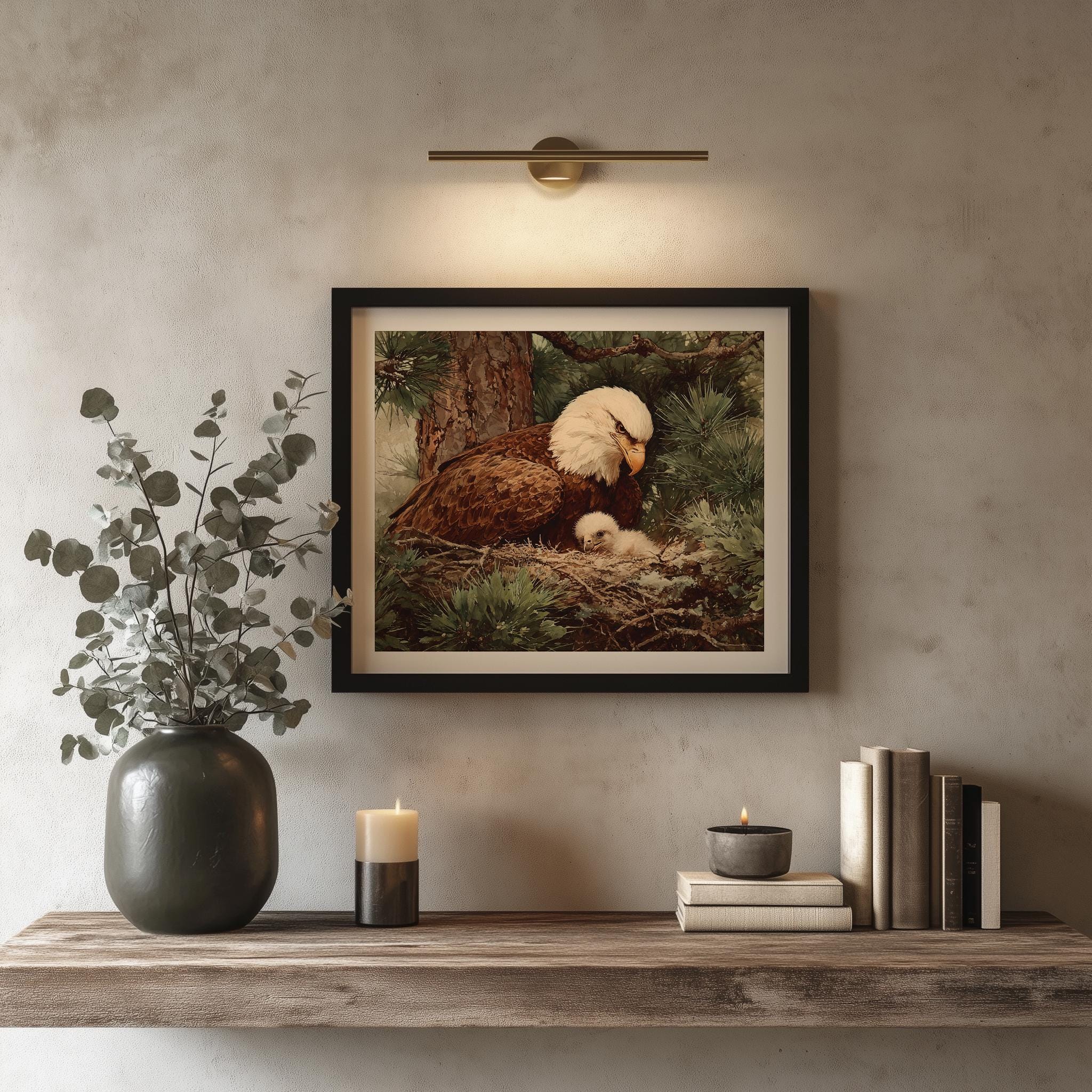 Immerse yourself in the charm with this rustic painting of a majestic bald eagle feeding its eaglet. An instantly downloadable print, it's perfect for elevating your decor with budget-friendly charm. This gives you the flexibility to customize the size, frame, and material according to your personal taste and space, ensuring a perfect fit for your walls.