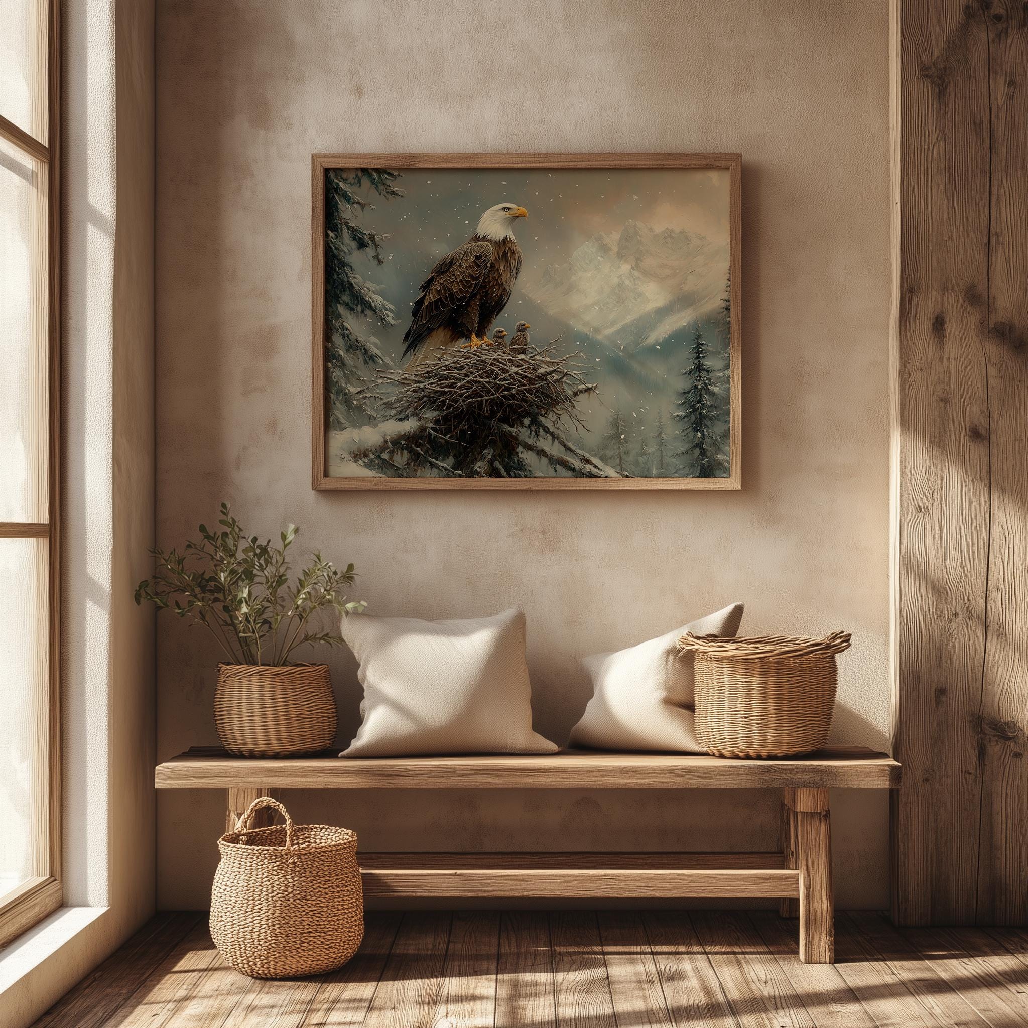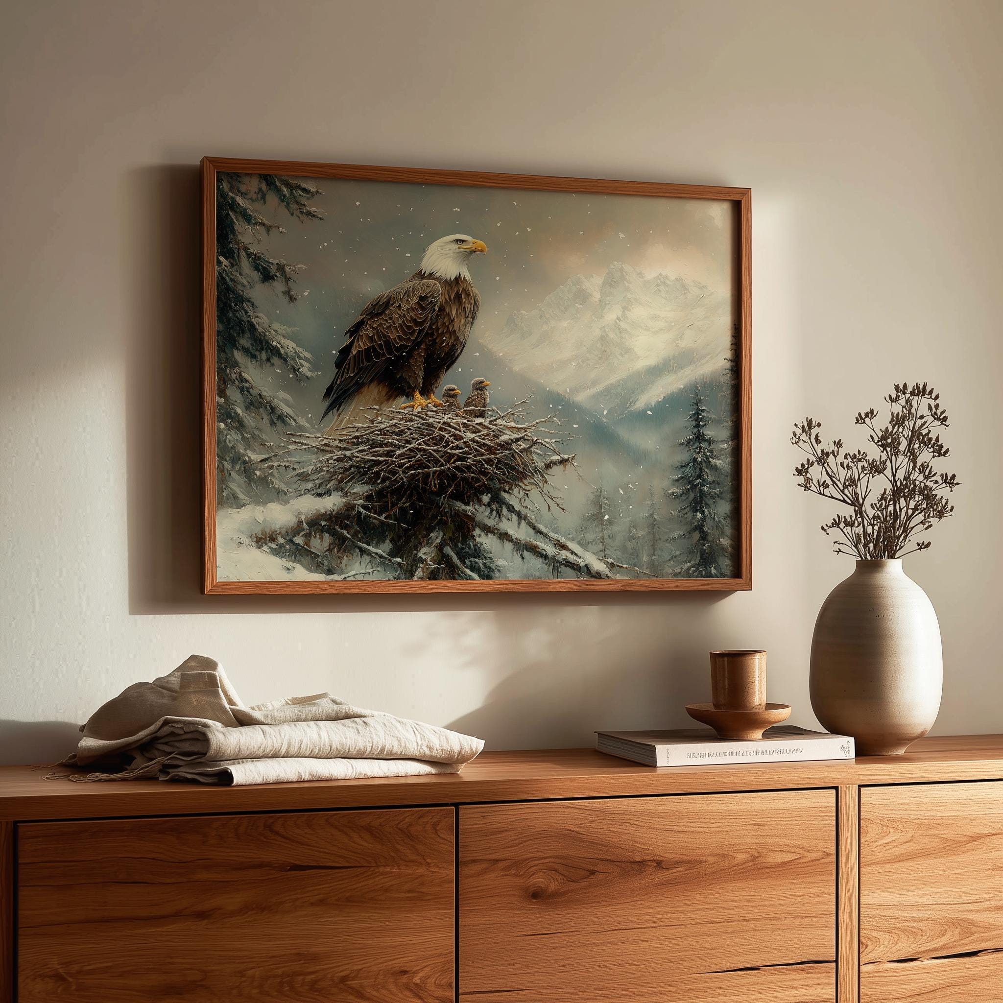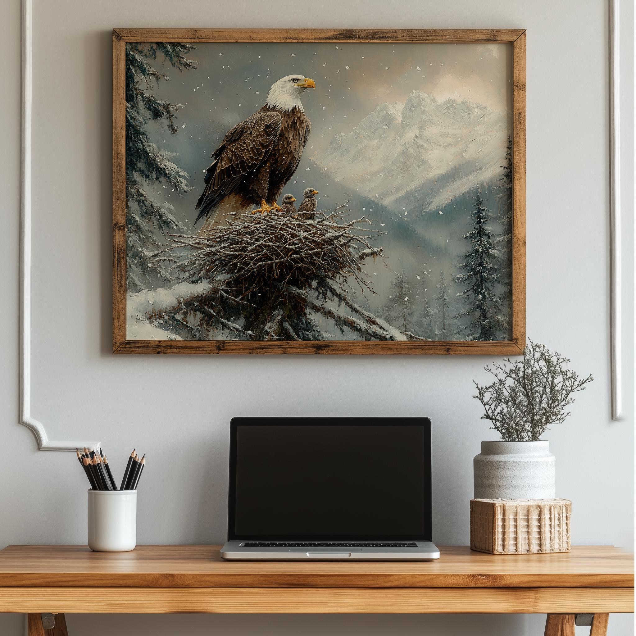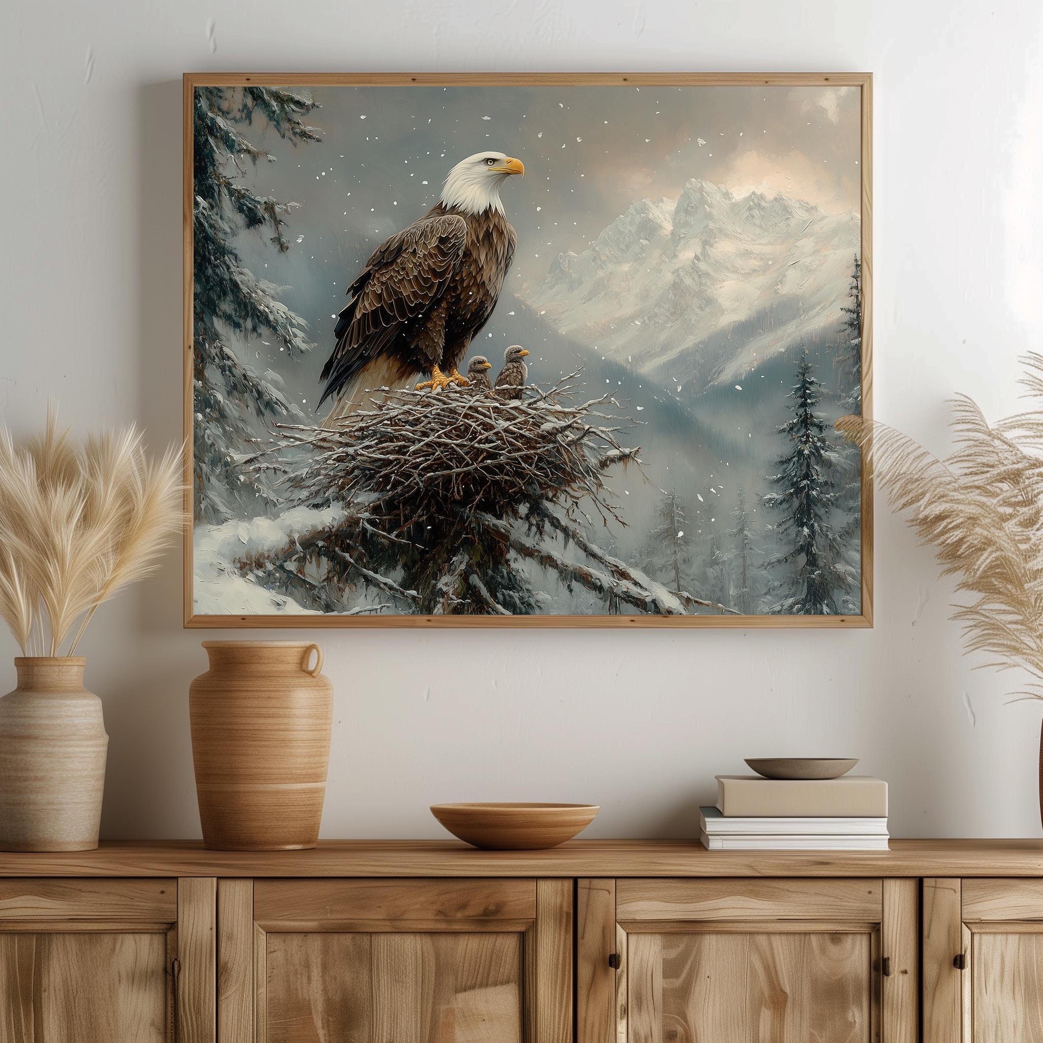 Immerse yourself in the charm with this rustic painting of a bald eagle perched majestically in a snowy landscape. An instantly downloadable print, it's perfect for elevating your decor with budget-friendly charm. This gives you the flexibility to customize the size, frame, and material according to your personal taste and space, ensuring a perfect fit for your walls.