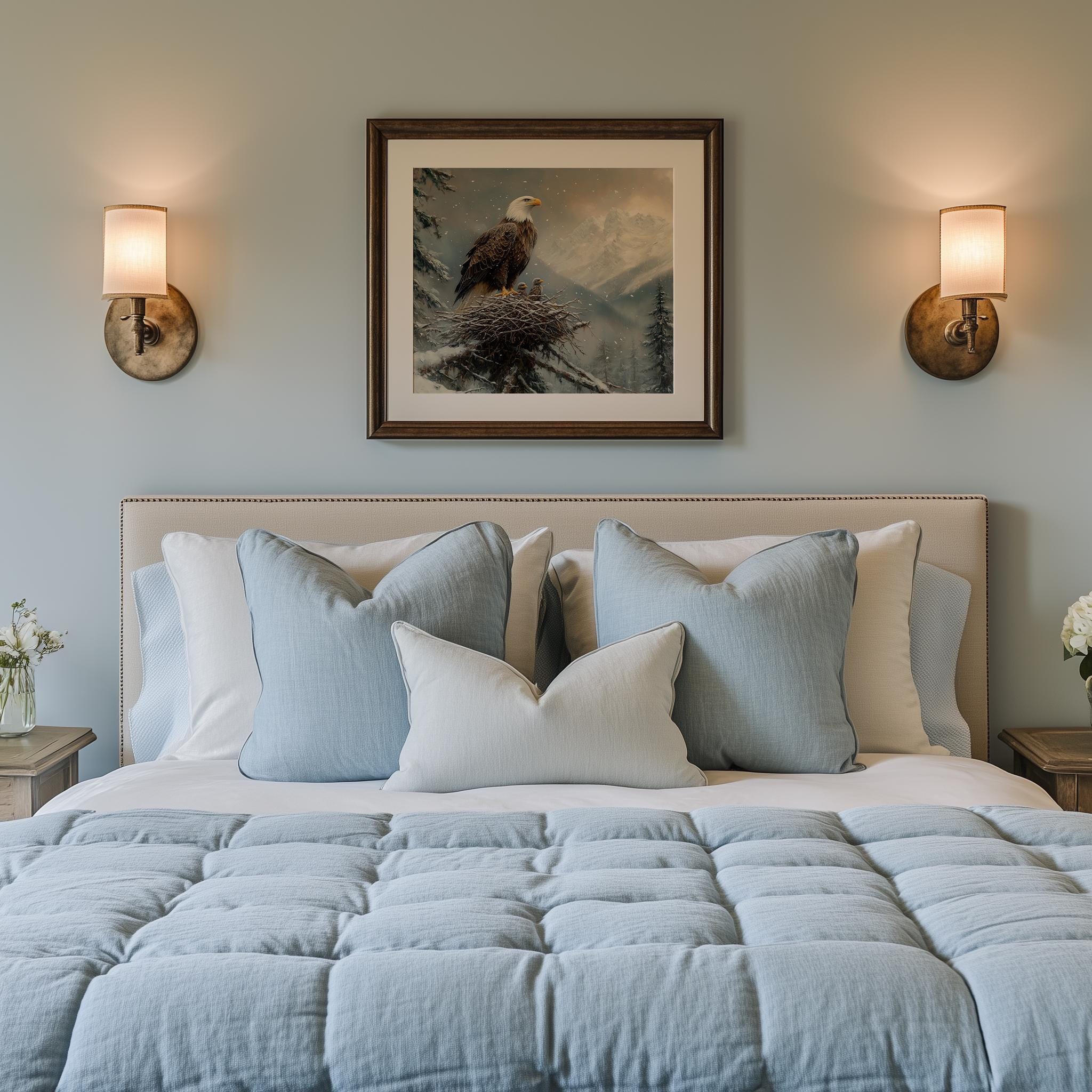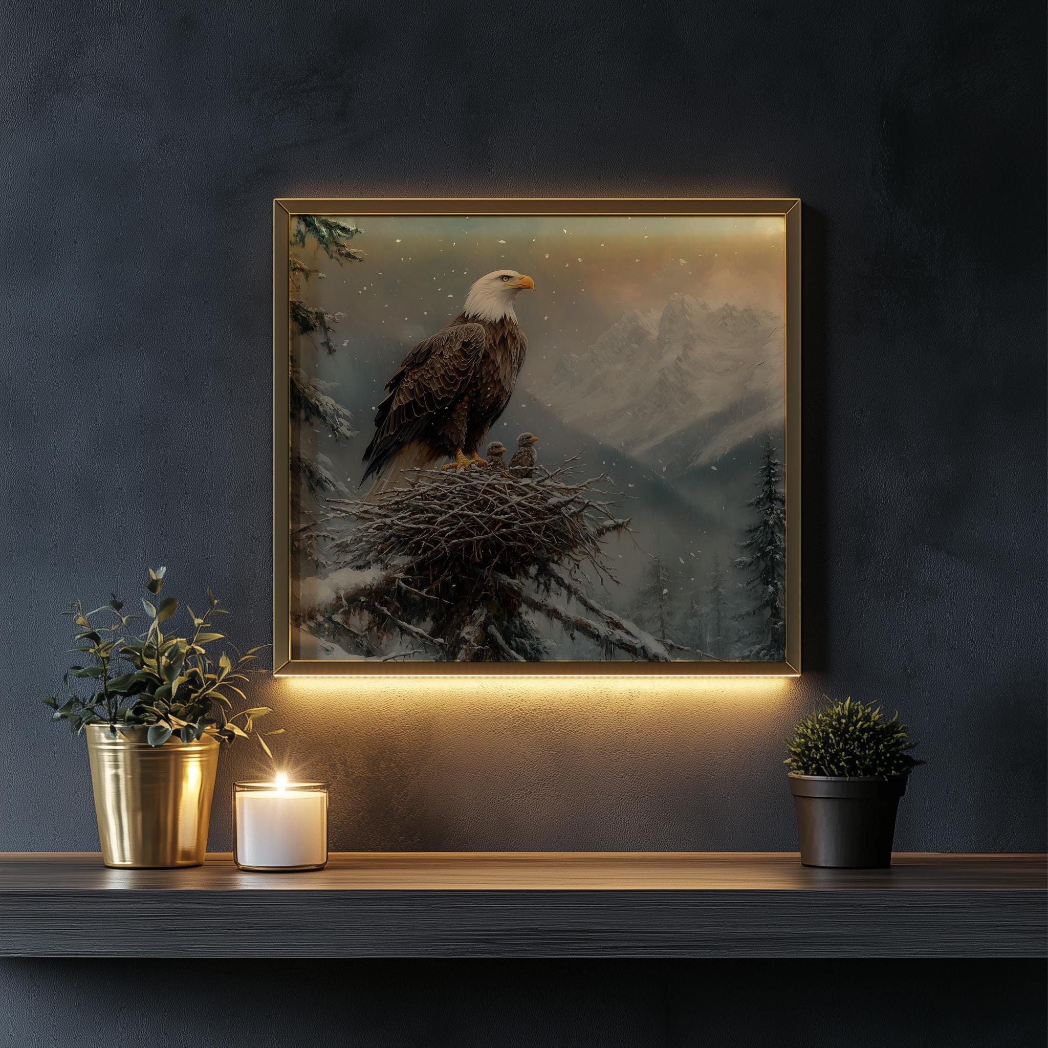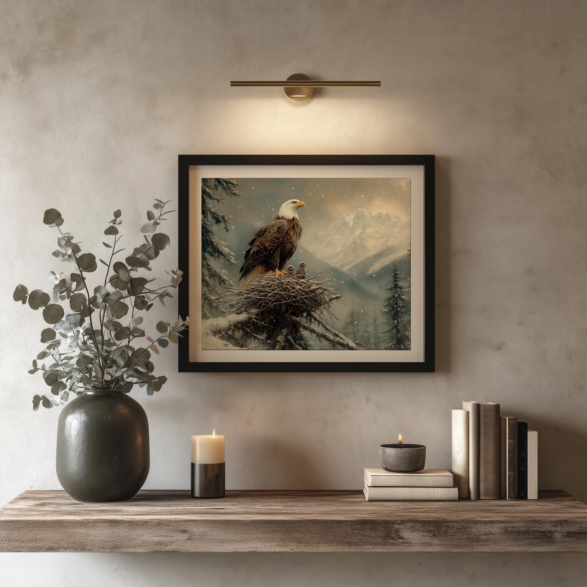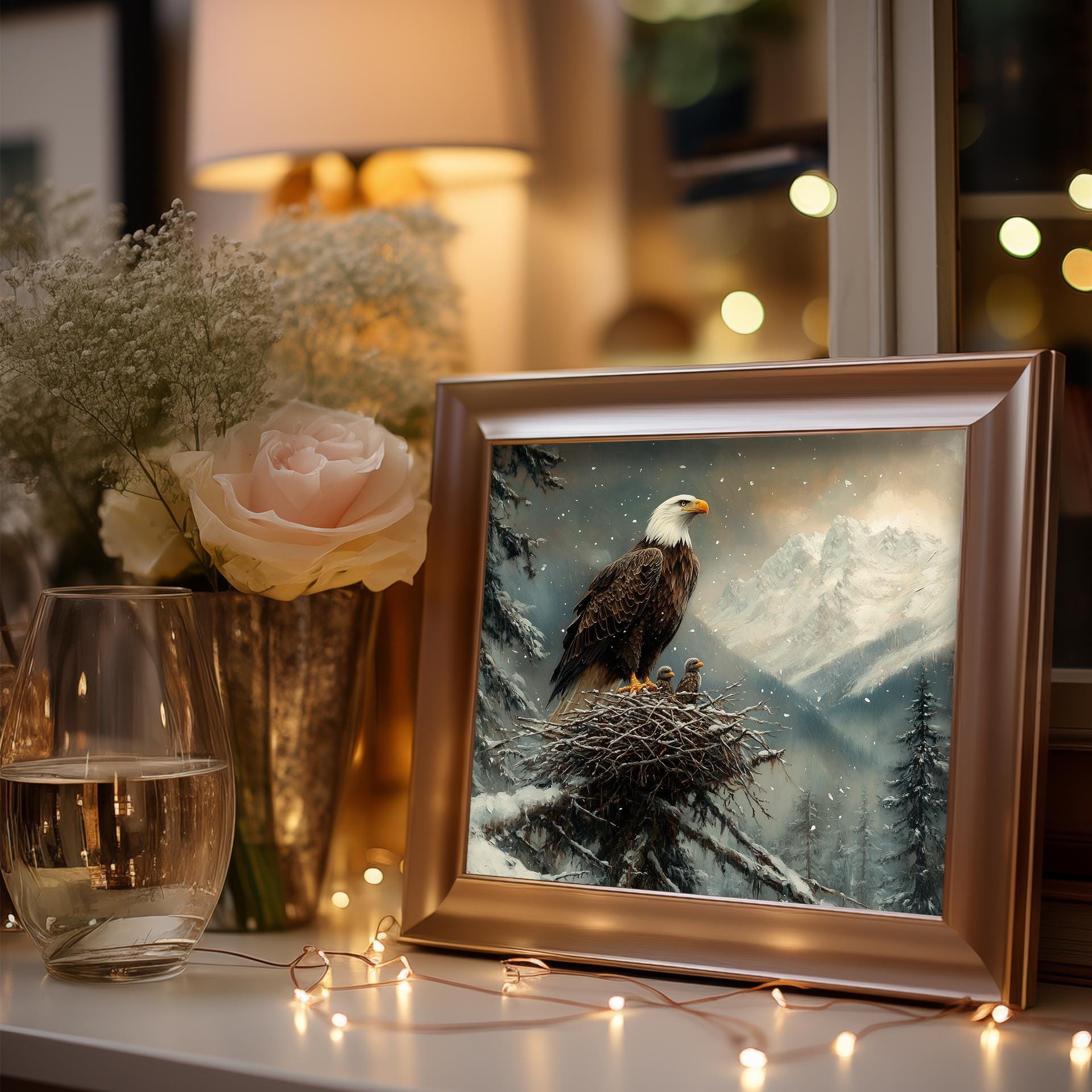 Immerse yourself in the charm with this rustic painting of a bald eagle perched majestically in a snowy landscape. An instantly downloadable print, it's perfect for elevating your decor with budget-friendly charm. This gives you the flexibility to customize the size, frame, and material according to your personal taste and space, ensuring a perfect fit for your walls.